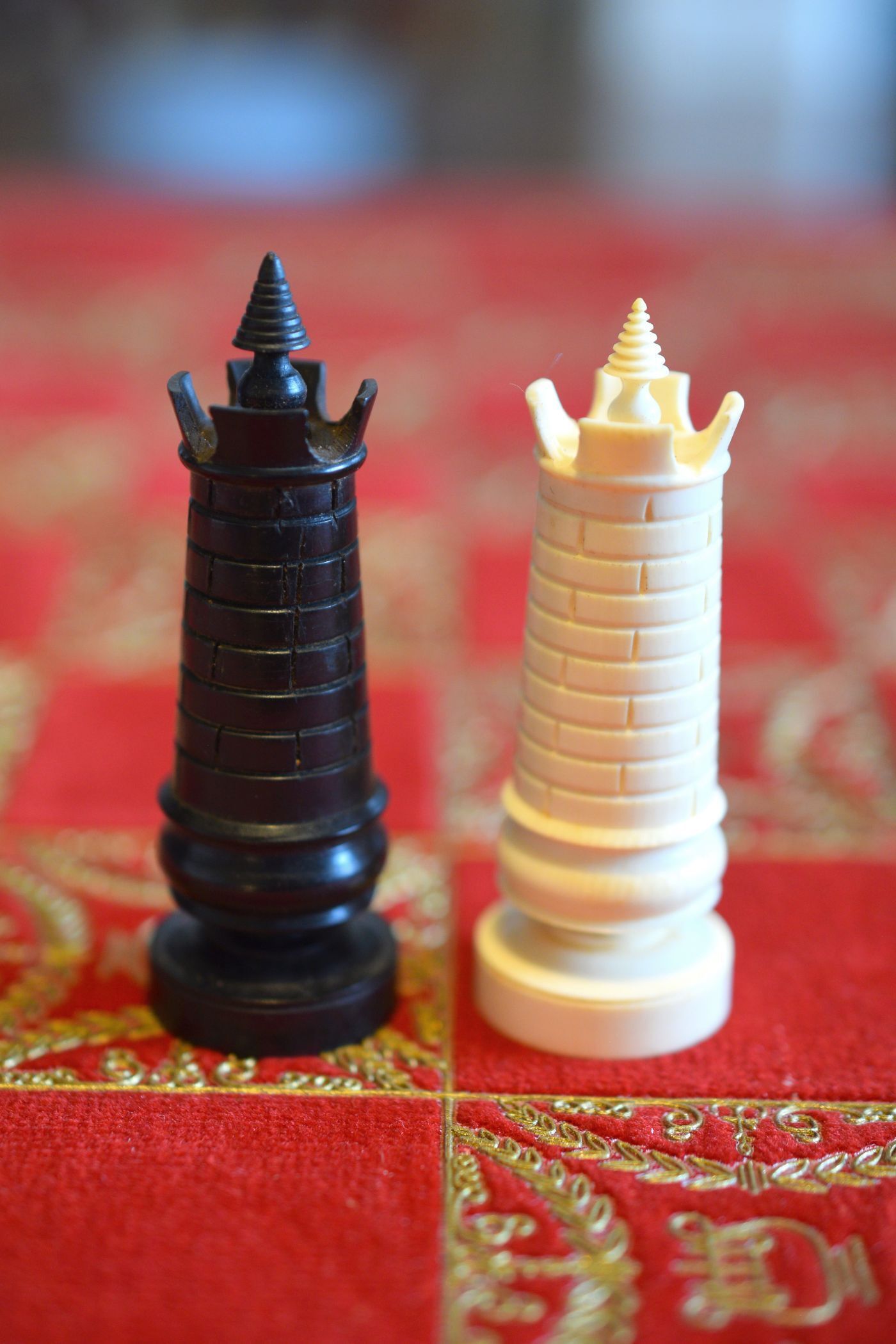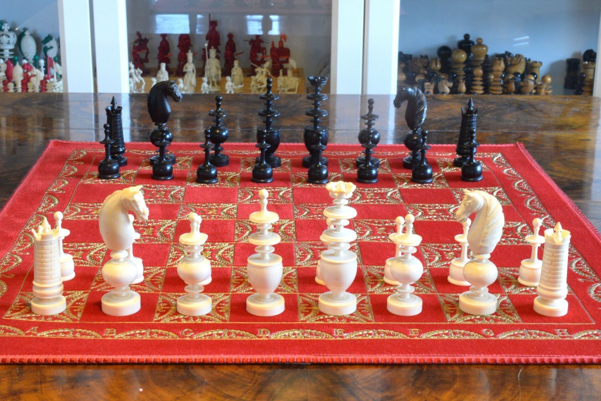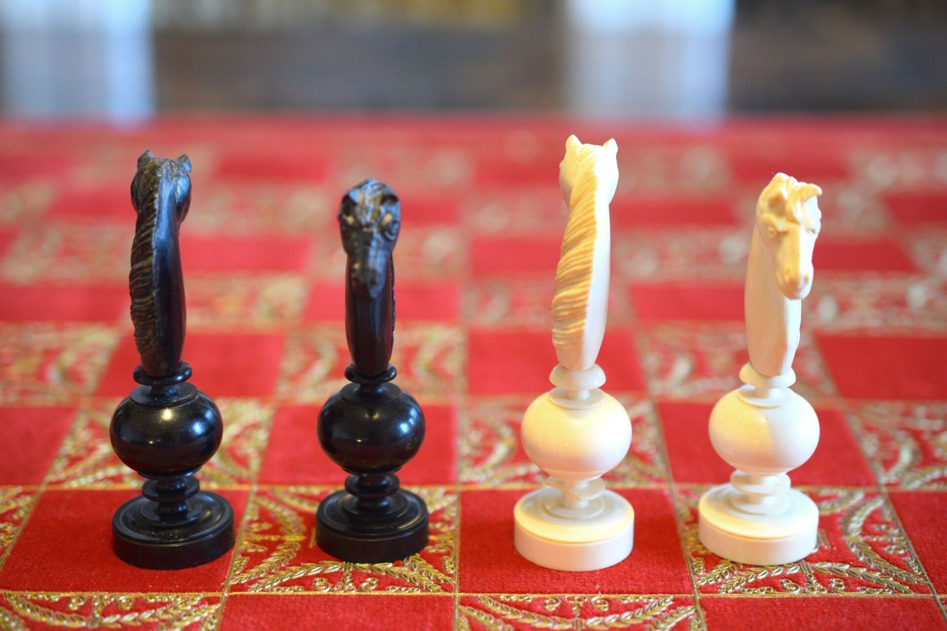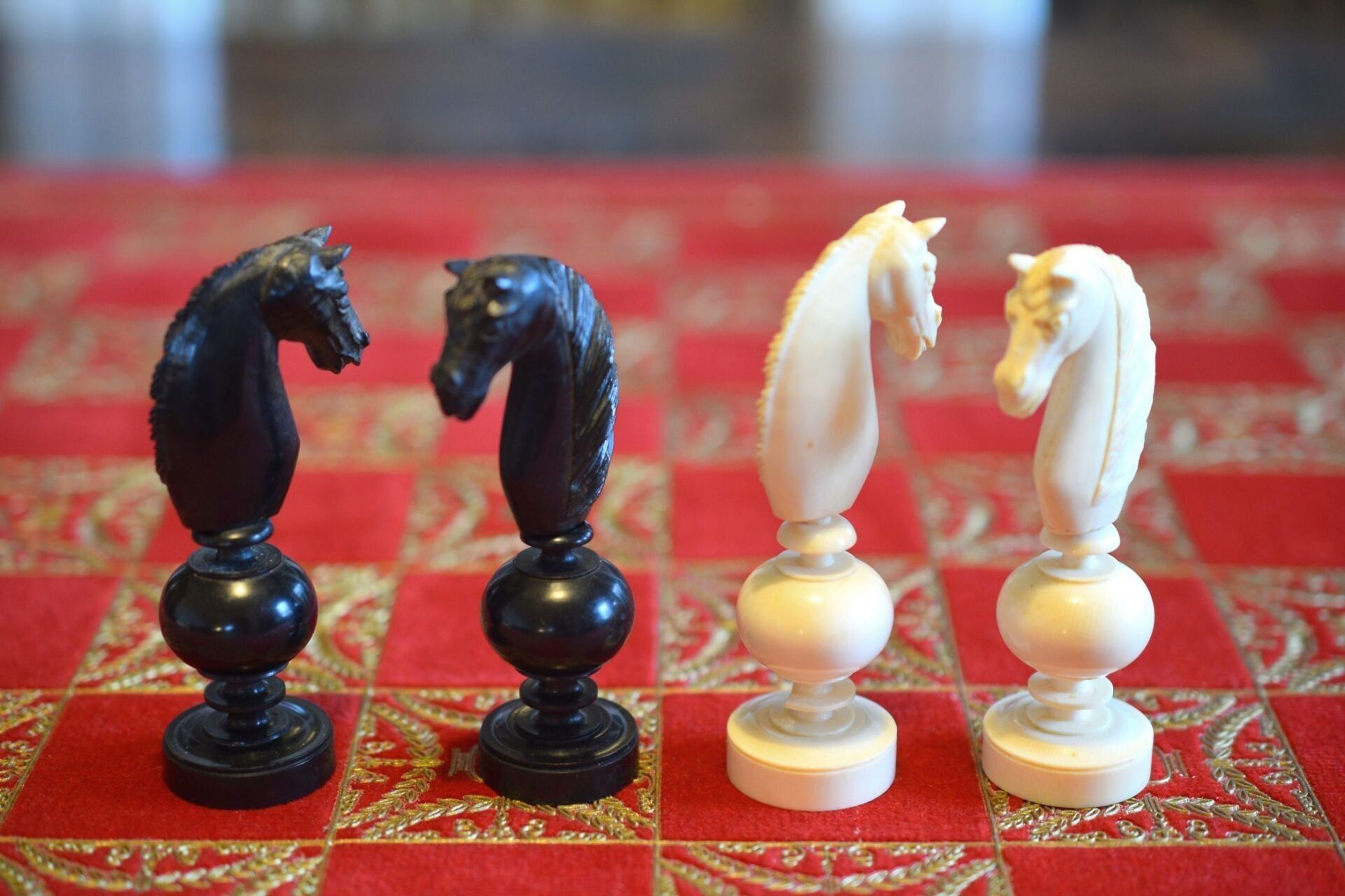 A chess set in the Régence style with a king size of 8.9 cm. The white pieces are turned from ivory, the black pieces from ebony. Judging by the exquisite carving style, the set was probably made in Dieppe, France. While Régence sets were made in France as early as the 18th century, their style evolved over time. The style of the rooks with a spindle finial on top as well as the very detailed carving of the knights' heads are typical for later sets, which makes me believe that this set dates to mid-19th century.