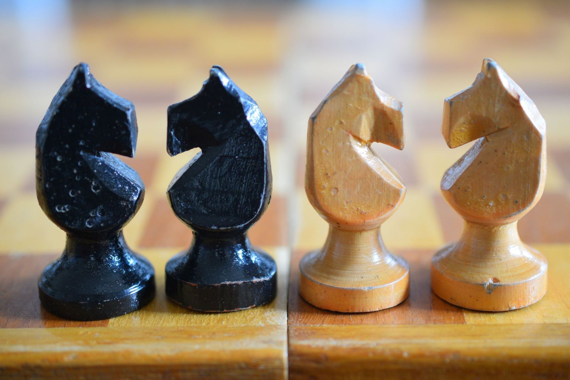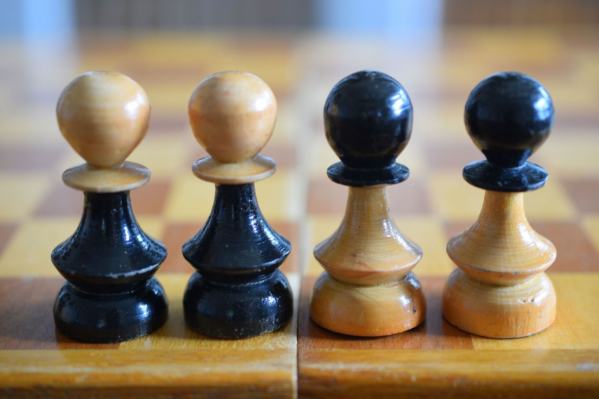 The kings with a ball finial instead of crosses, the queens with a small spike finial. Rooks as tapering towers in a manner very typical for Romanian sets. Knights as simple carved horse heads. What is unusual about this set are the bishops. They have - very typically - their heads in the opposite colour, as is known also from Austrian coffee house sets or other Romanian sets. However, usually only the head is in the opposite colour, while in this set not only the spherical heads, but also the collars below are coloured.