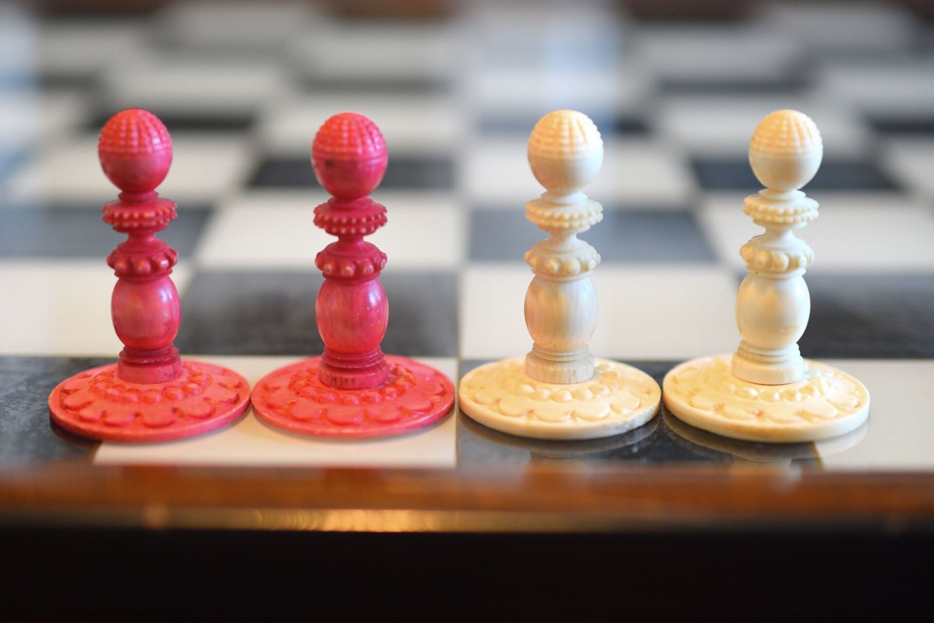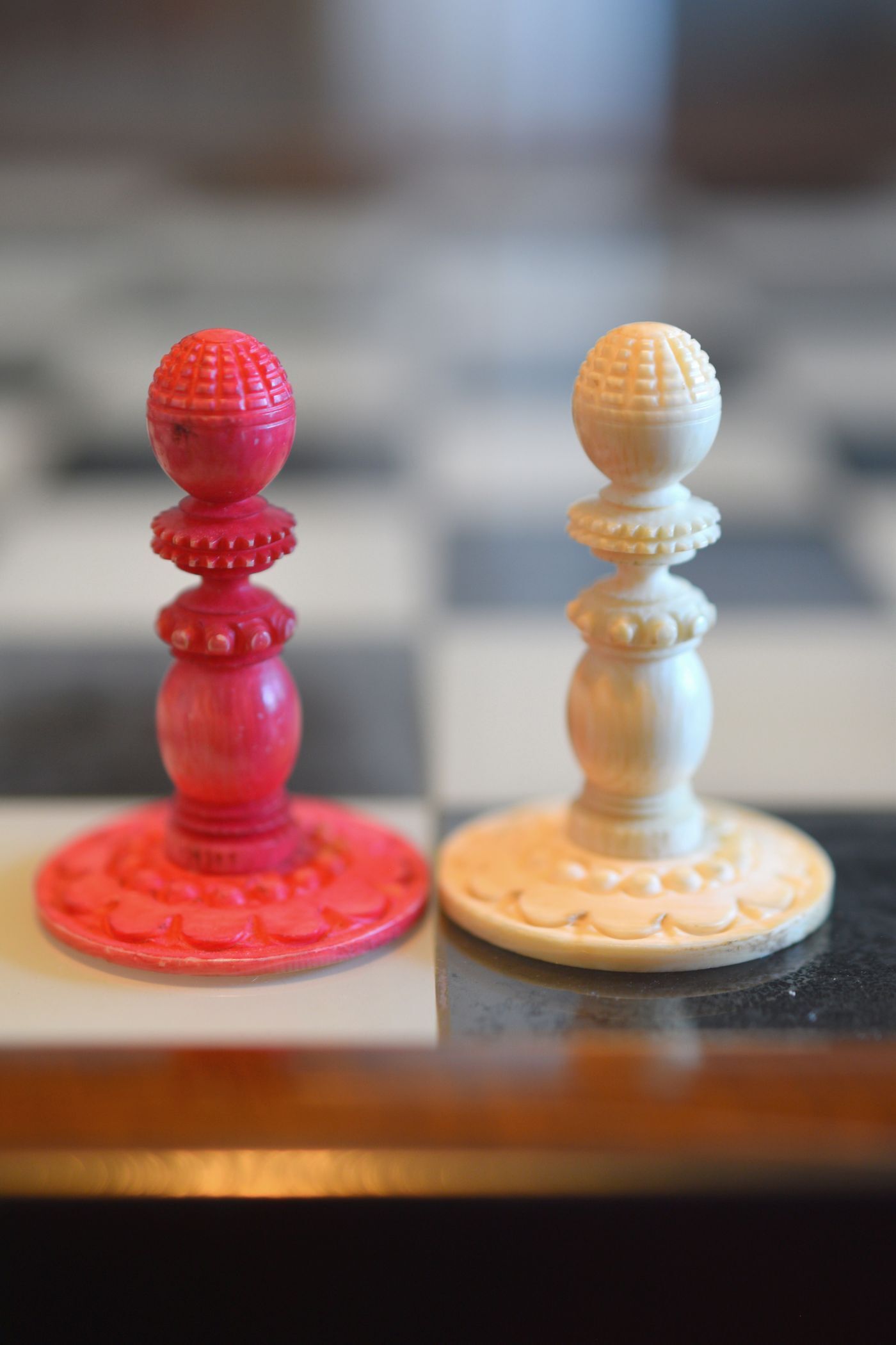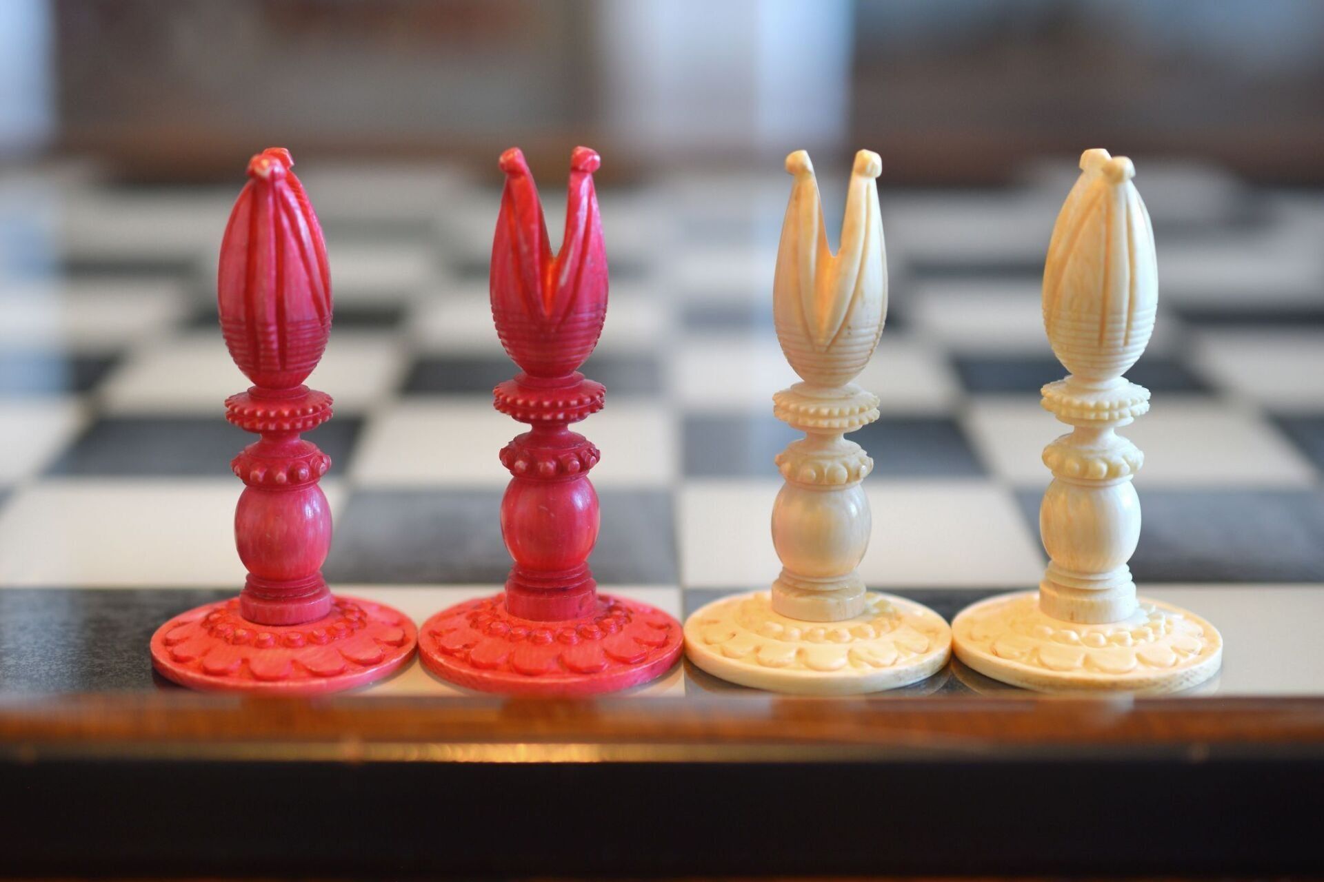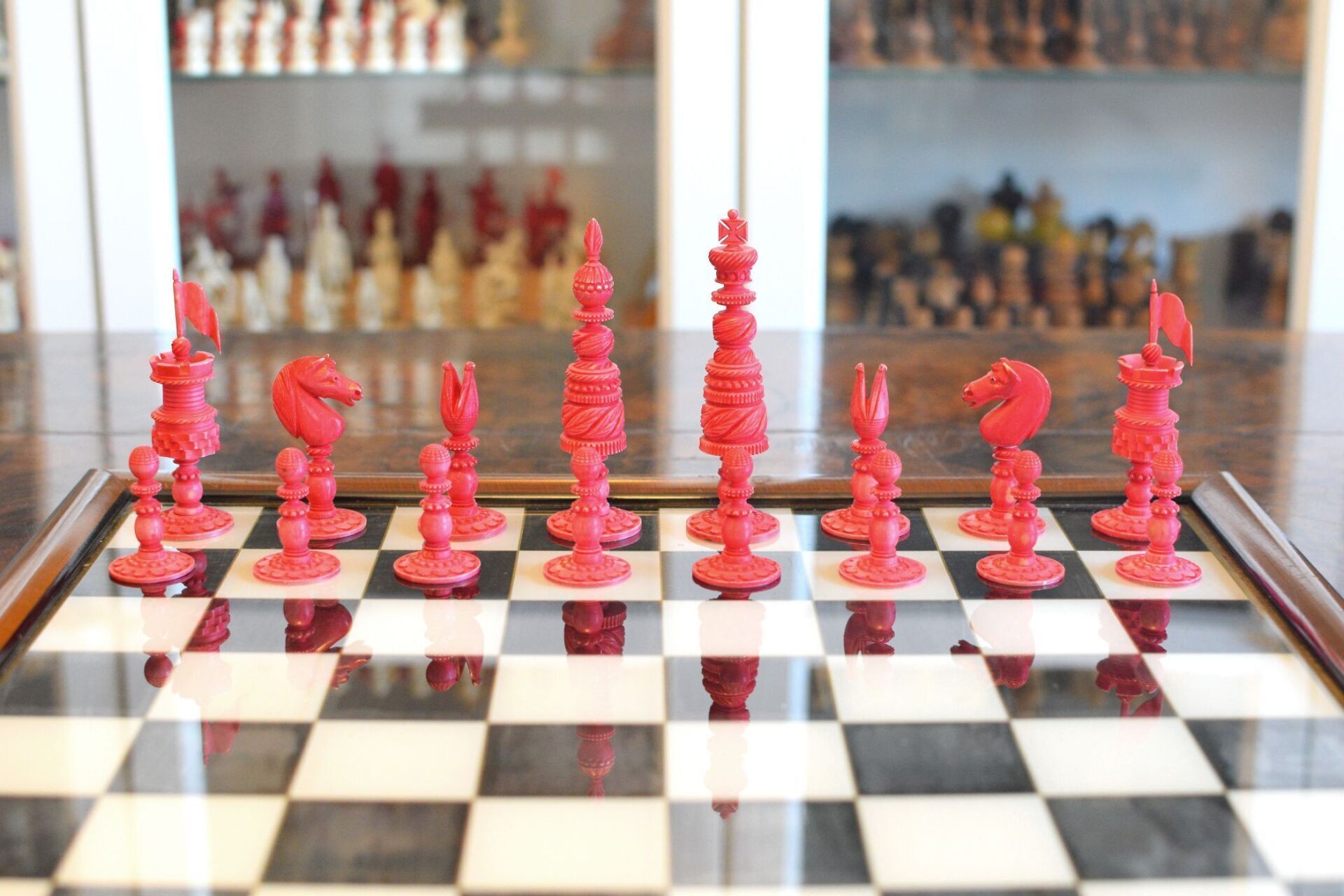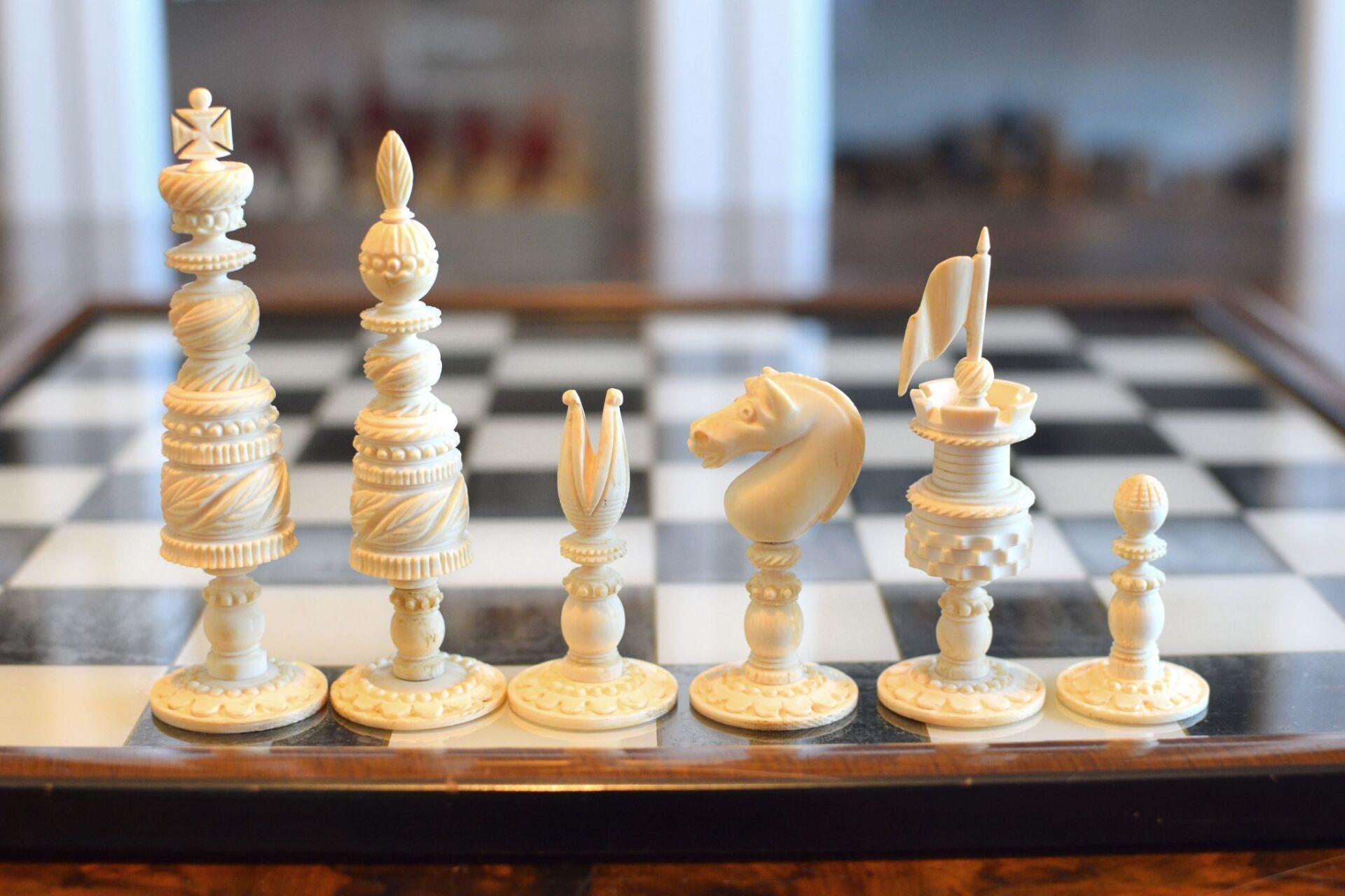 It seems that the maker of these fantastic chessmen tried to demonstrate the potential of his ornamental lathe to the fullest. Ornamental turning goes back to the Renaissance, but mechanical ornamental lathes as the one most likely used for this chess set were developed in the late 18th century. Among the most famous makers of such lathes was John Jacob Holtzapffel (1768-1835), an Alsatian mechanic, who moved from Strasbourg to London in 1784. Ten years later, he set up his lathe-making business, which was first operated from premises in 118 Long Acre (1794-1811) before moving to 10 Cockspur Street (1812 to 1820) and to 64 Charing Cross (1821 to 1901). From 1795 to 1803, he produced and sold 385 lathes, including his first rose engine lathe in 1797. John's son, Charles Holtzapffel (1806–1847), joined the firm in 1827 and continued to run the business after his father's death. He set about writing a treatise published in several volumes entitled "Turning and Mechanical Manipulation", eventually running to some 2,750 pages. Volume 1, "Materials, Their Differences, Choice, and Preparation; Various Modes of Working Them, Generally Without Cutting Tools," was published in 1843. Volume 2, "The Principles of Construction, Action and Application of Cutting Tools Used by Hand; And Also of Machines Derived from the Hand Tools," was published in 1846. Vol. 3, "Abrasives and Miscellaneous Processes, which Cannot be Accomplished with Cutting Tools," remained uncompleted when Charles died at age 41. It was published after his death by his son, John Jacob Holtzapffel (1836–1897), who completed Vol. 4, "The Principles and Practice of Hand or Simple Turning," which was published in 1879 (he also made the 750 woodcut illustrations that it contains) and Vol. 5, "The Principles and Practice of Ornamental or Complex Turning," which was published in 1884, both of which are today also referred to as the "bible" of ornamental turning.