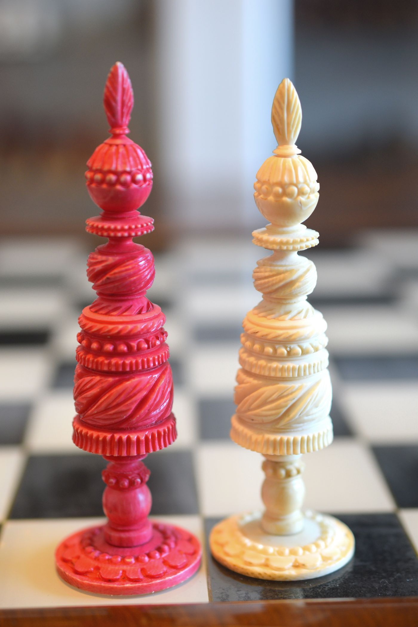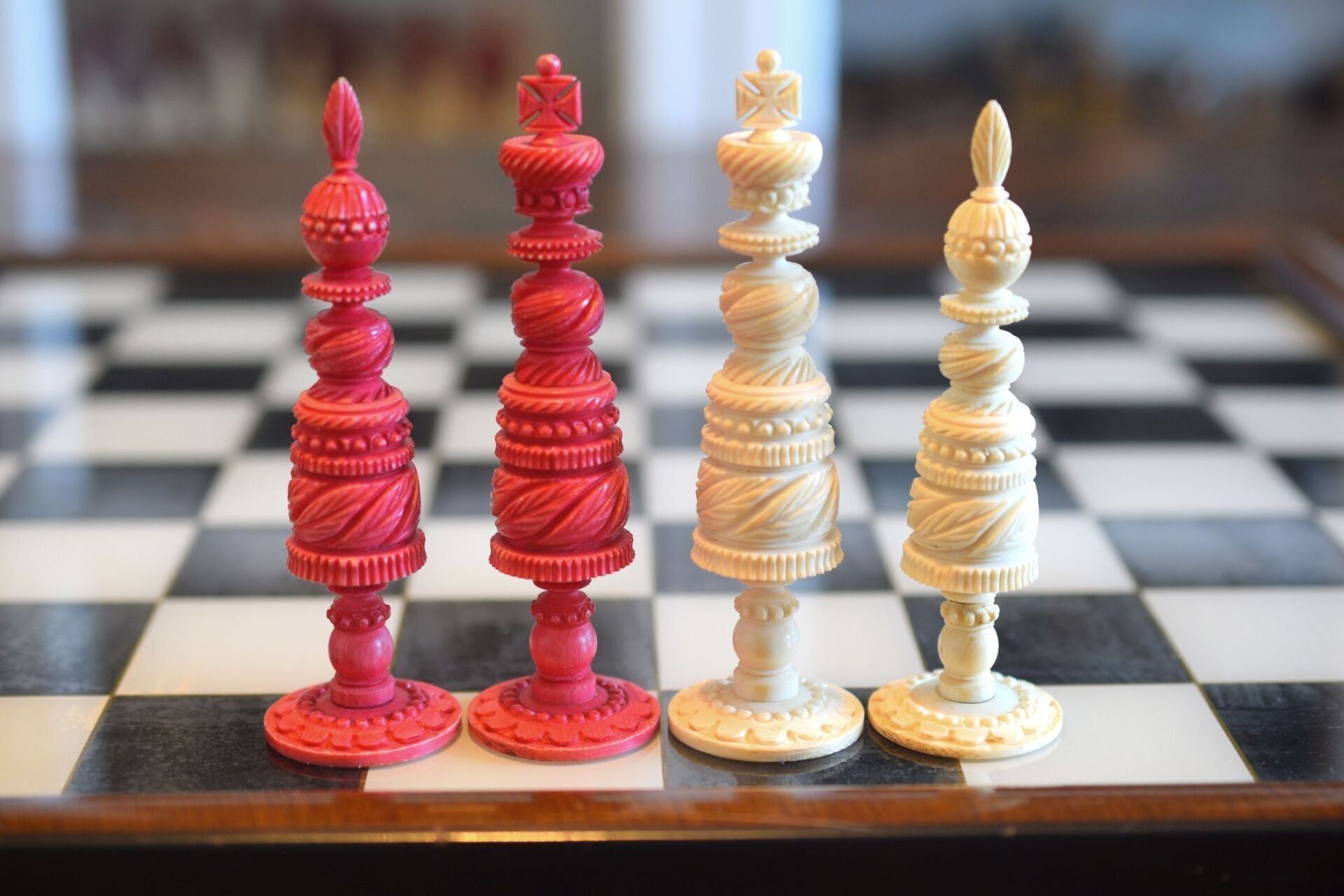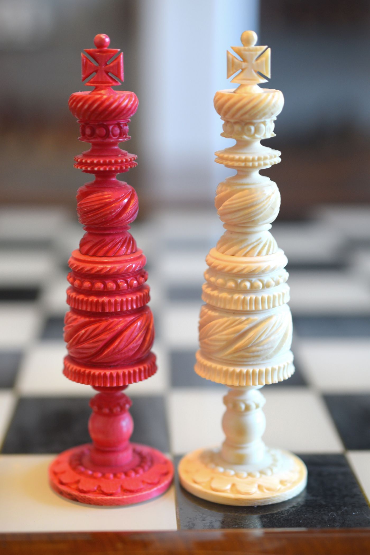 Mid-19th century English ivory chess set with Barleycorn pattern, which apparently was turned with an ornamental lathe. One side natural, the other side stained red. The Kings have beautiful crowns with a cross pattée finial, the Queens with a feather finial. King size is 10.8 cm (4.35"). The rooks as small turrets on a pedestal and with large flags on top. The fine carving of the knights reminds of the style of the workshop of George Merrifield. The bishops with deep mitre cuts. The pawns with ball finials on baluster stems. All pieces on ornamented circular bases.