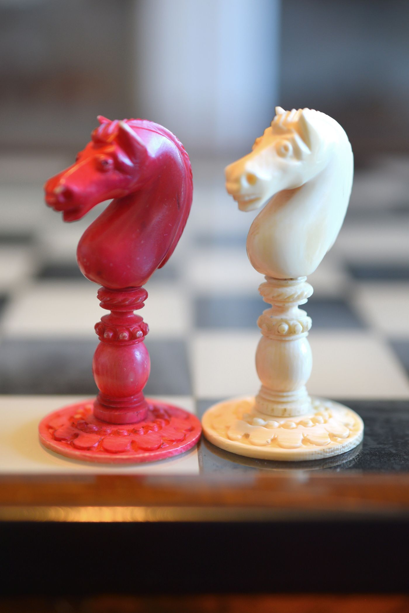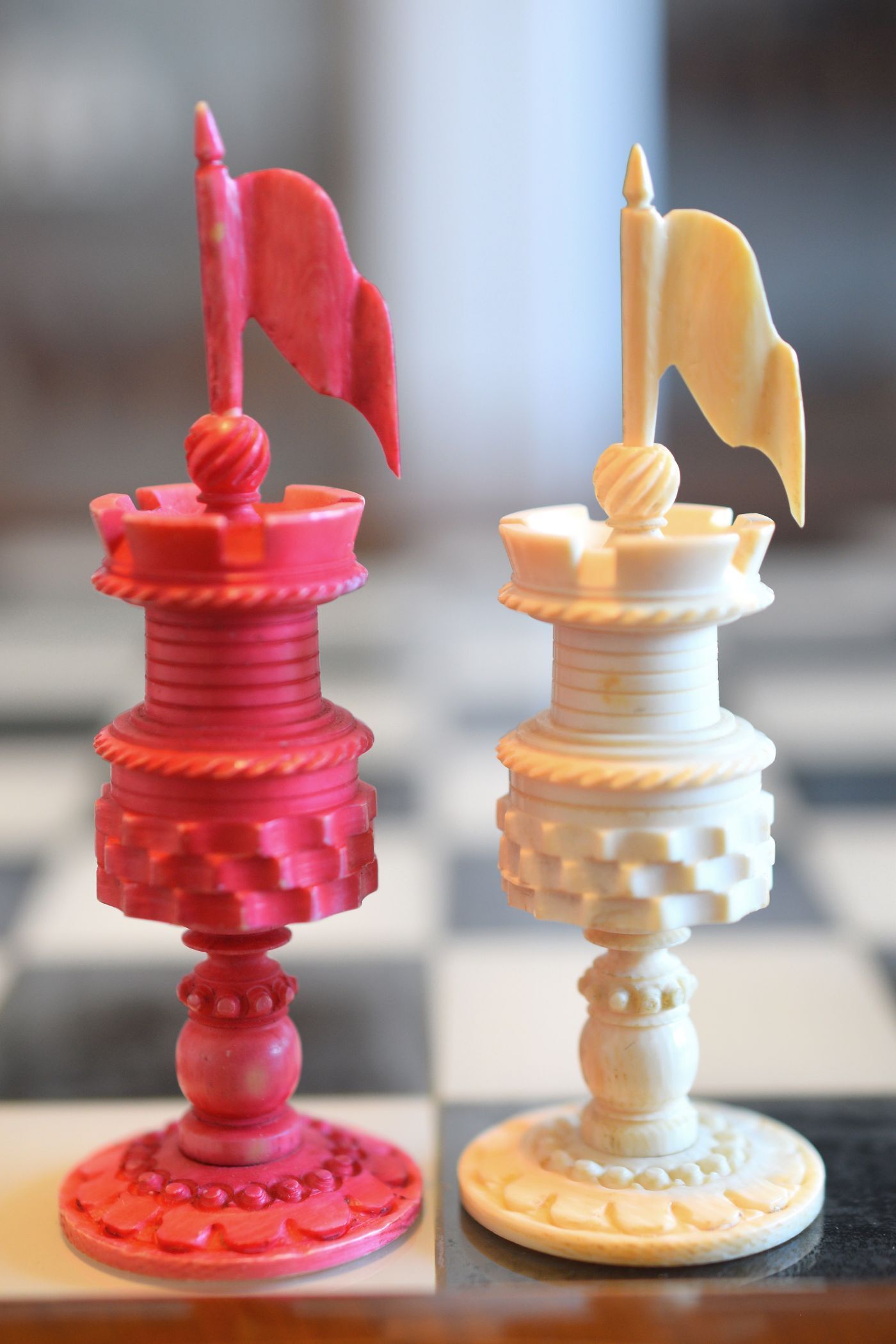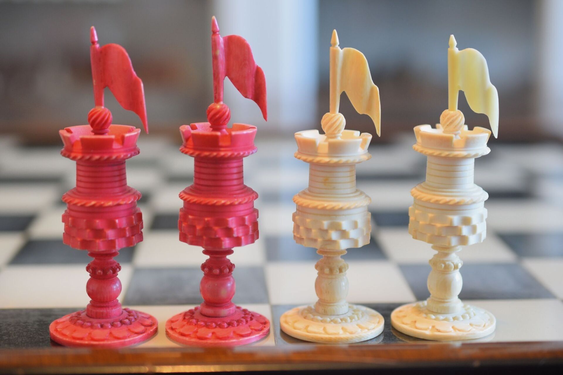 Mid-19th century English ivory chess set with Barleycorn pattern, which apparently was turned with an ornamental lathe. One side natural, the other side stained red. The Kings have beautiful crowns with a cross pattée finial, the Queens with a feather finial. King size is 10.8 cm (4.35"). The rooks as small turrets on a pedestal and with large flags on top. The fine carving of the knights reminds of the style of the workshop of George Merrifield. The bishops with deep mitre cuts. The pawns with ball finials on baluster stems. All pieces on ornamented circular bases.