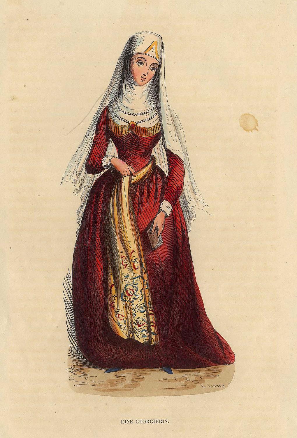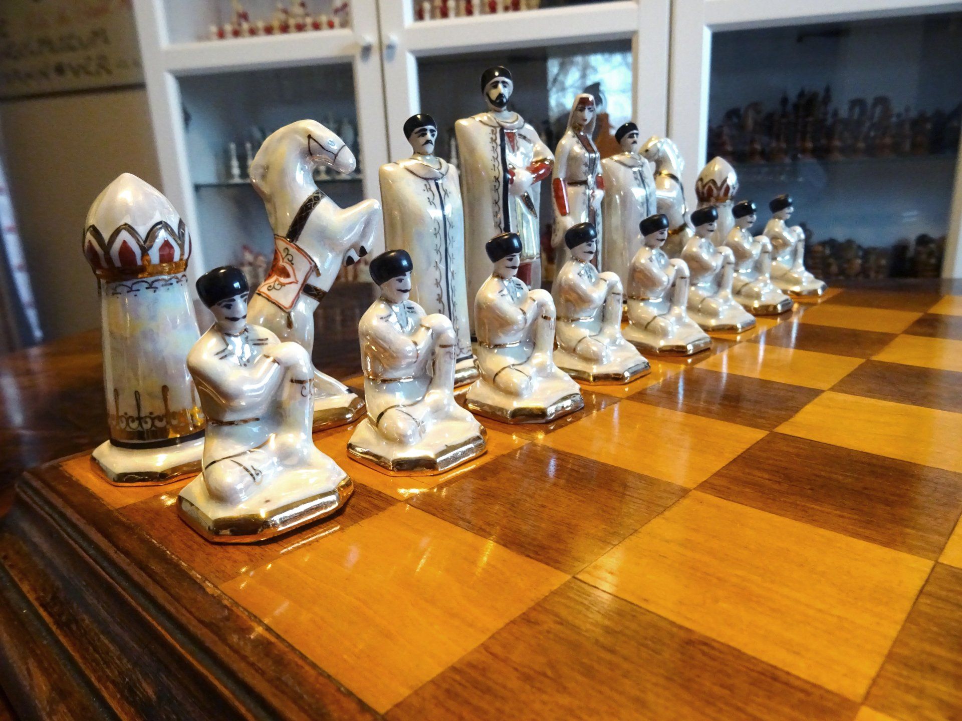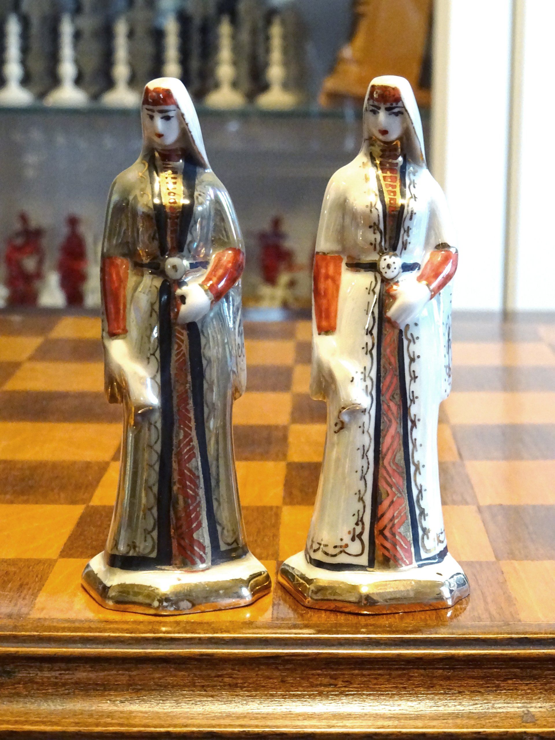 The figural chessmen are shown in traditional Georgian or Caucasian dress. The kings are dressed in a "chokha", a name derived from the Persian language. Before the Persian invasion, these wollen coats were referred to as "talavari". In Russia this type of coat is named "cherkeska". It is a typical and very traditional type of garment and a Georgian symbol of pride, worn until today on many formal occasions. The chokha comes in four different types and forms part of the typical cossack uniform. A typical feature of the chokha are the cartridge holders on both sides of the chest called "masri". In former times these were used to hold paper cartridges for muskets, but with the advent of modern weapons these were replaced with ornamental bullets or cartridges calles "masrebi" or "gaziri". The uniform of the king is completed with a richly embroidered overcoat called "burka", a hood-like headdress wrapped around the neck called "bashlyk", a traditional hat called "papakha", usually made of wool or fur, and the traditional cossack dagger called "khanjali" worn on a belt. The queen is likewise dressed in the traditional dress of a rich Georgian woman. She is wearing a long dress called "kartuli", with a beautifully decorated belt. The traditional headdress consists, inter alia, of a white veil called "lechaki", a thin bolster, usually made of silk and cottong called "kopi" and a cardboard rim sewed with velvet called "chikhta". The rooks are shown as towers with onion shaped domes, the knights as rearing horses, which may be seen as a reference to the dzhigit horsemen among the cossacks, the bishops dressed as cossacks dressed with a closed burka wearing a bashlyk and a papakha and the pawns as sitting cossacks.
