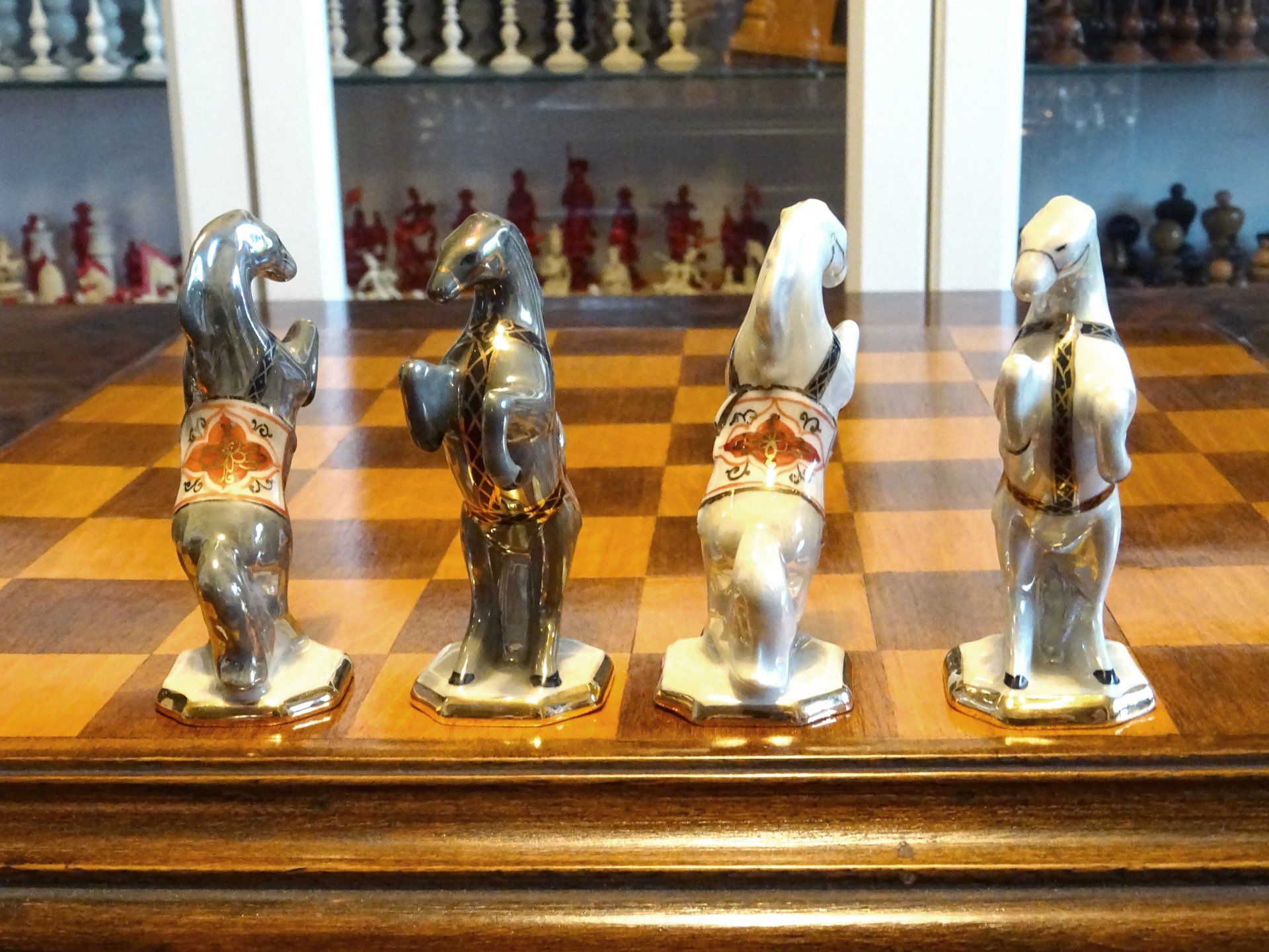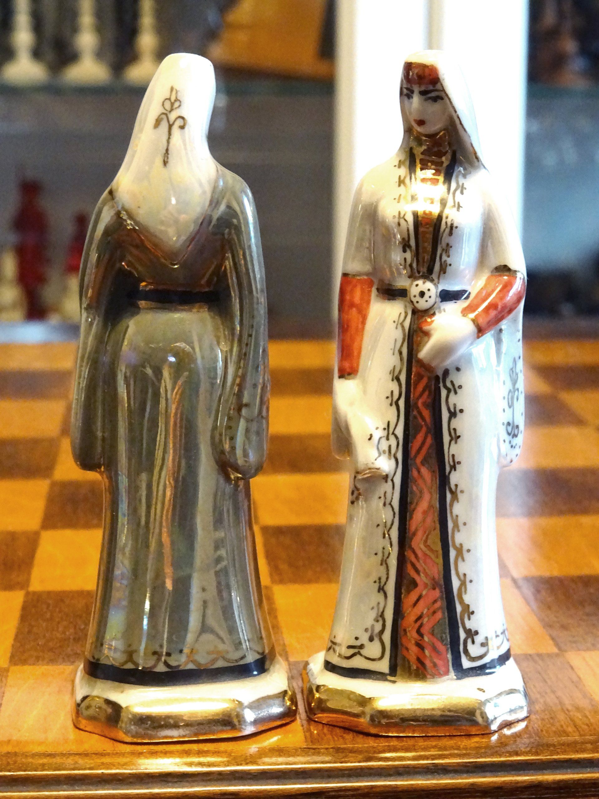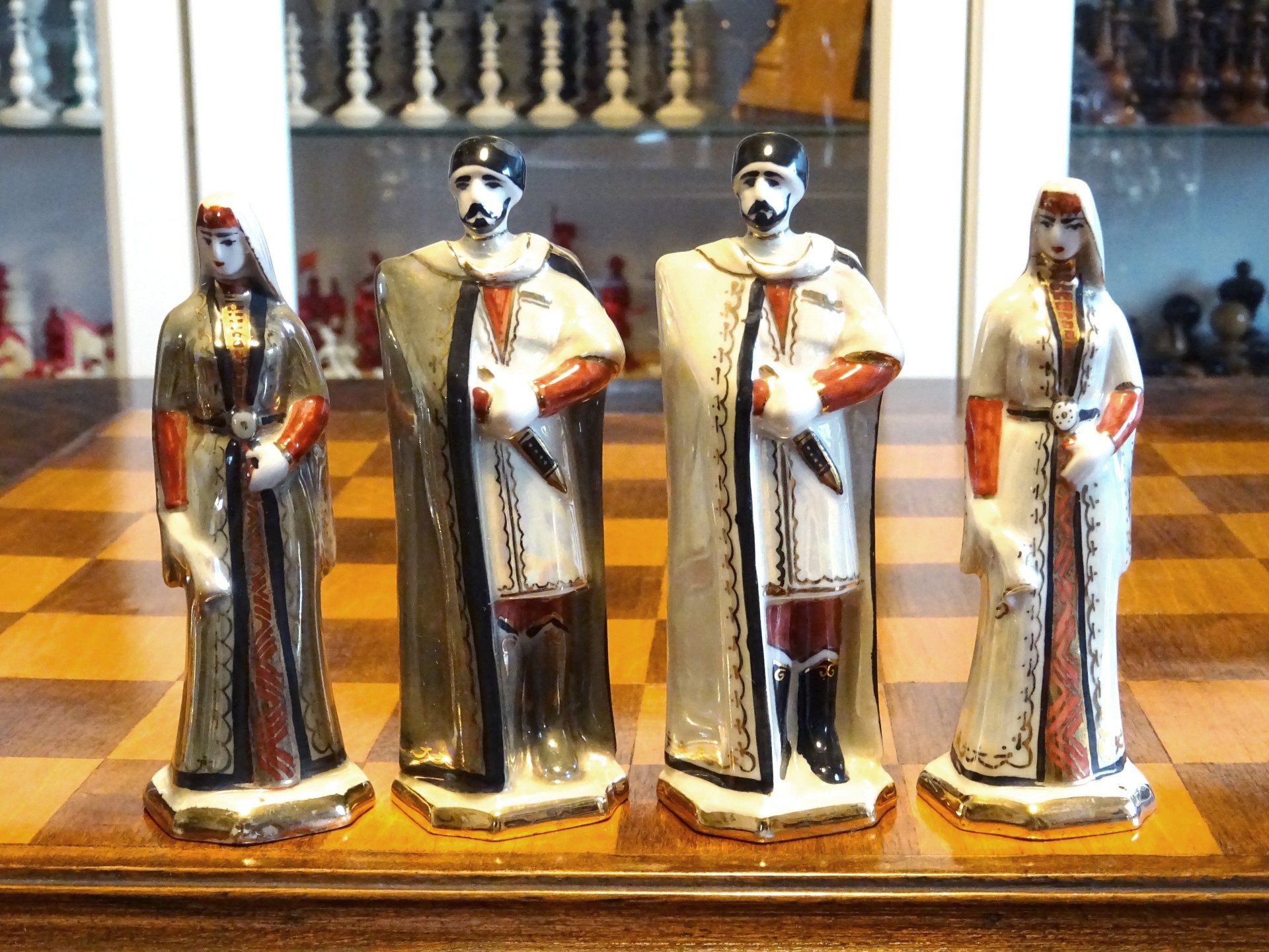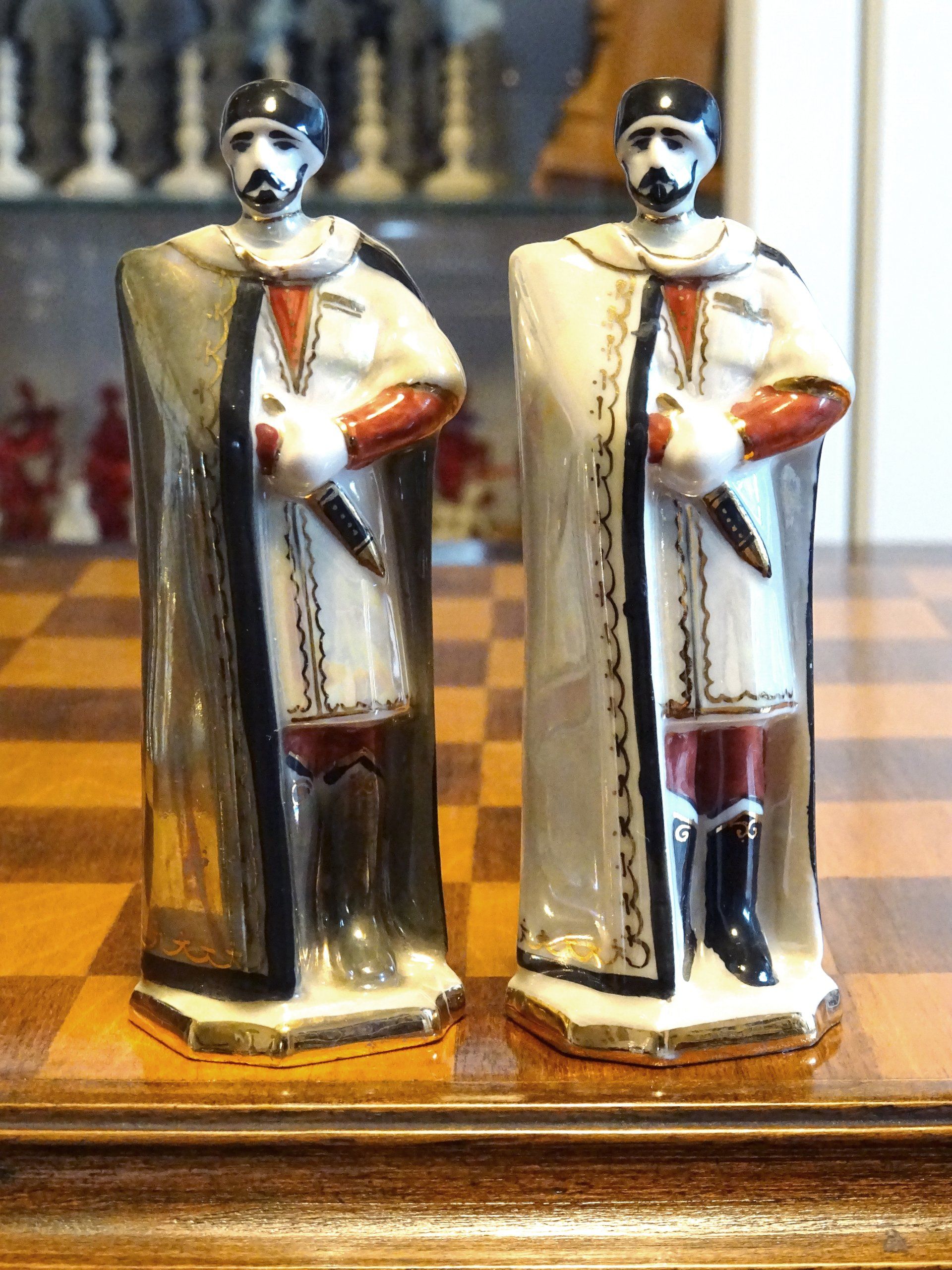 According to Isaak Linder, the design goes back to Georgian porcelain artists from the Zugdidi Porcelain factory in Zugdidi/Georgia (Linder, Schach - Schachfiguren im Wandel der Zeit, p. 83, 122-125). However, the set shown by Linder differs slightly from this set insofar as the bishops are wearing capes over their heads rather than hats and also in the colours, which seem to be much darker in the set attributed by Linder to the Zugdidi porcelain factory. Similar sets were also sold under the brand of the Kislovodsk porcelain factory, located some 200 miles away on the Russian side of the border.