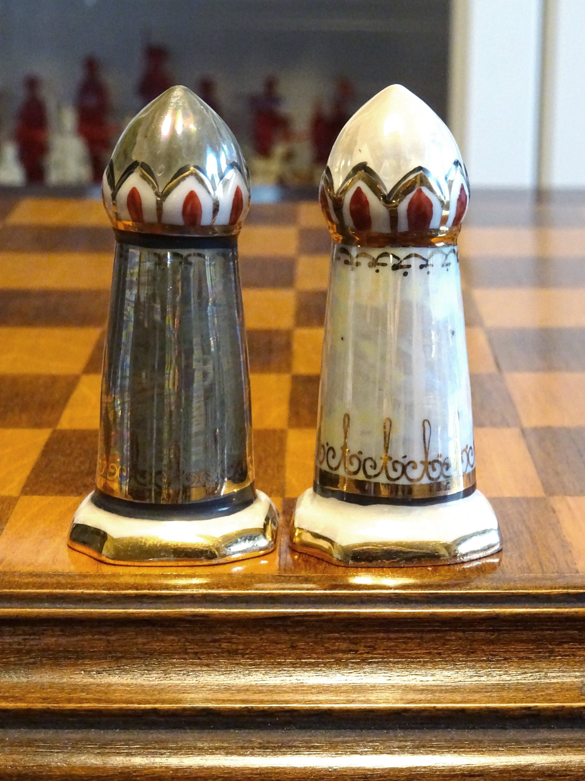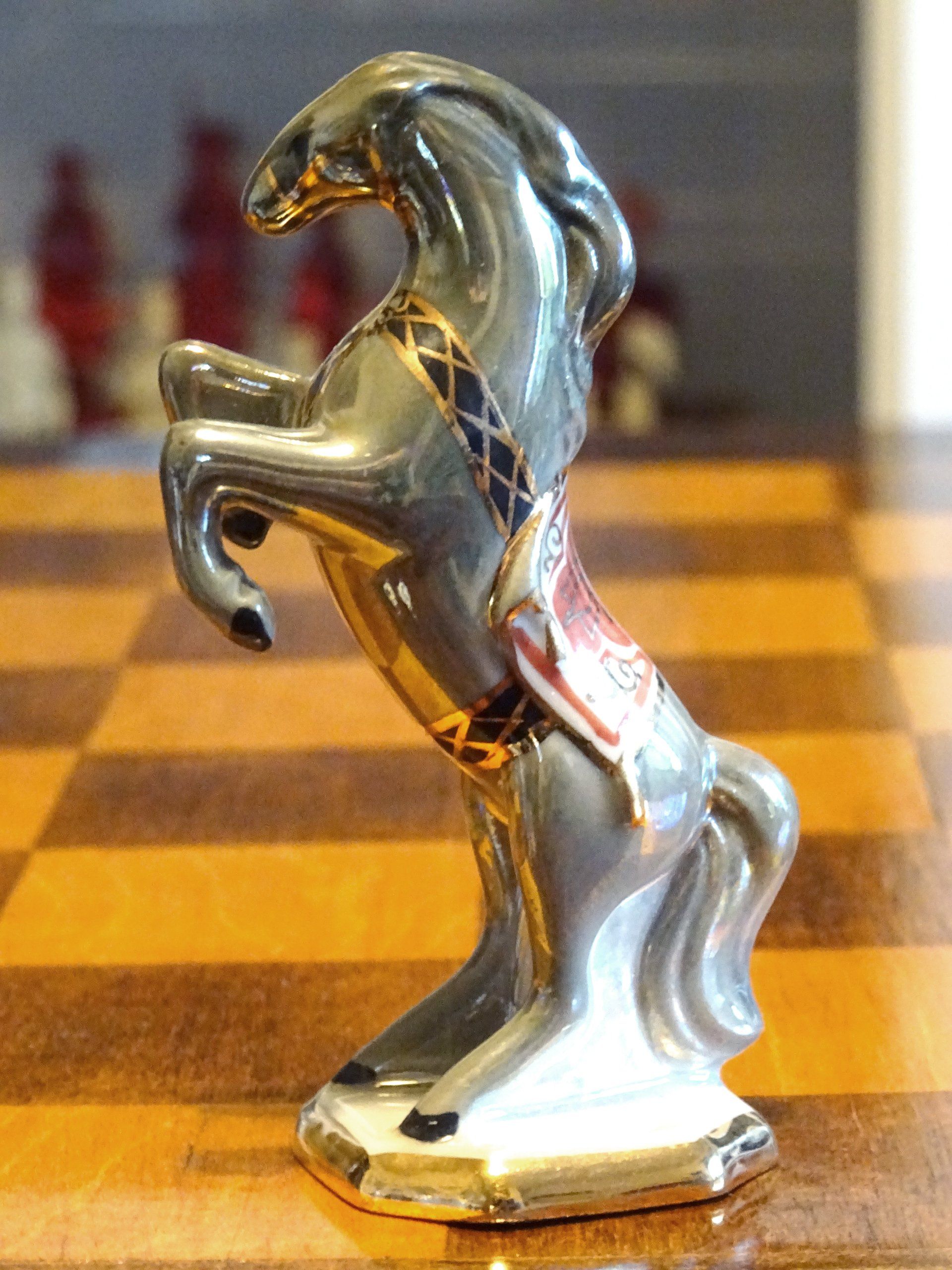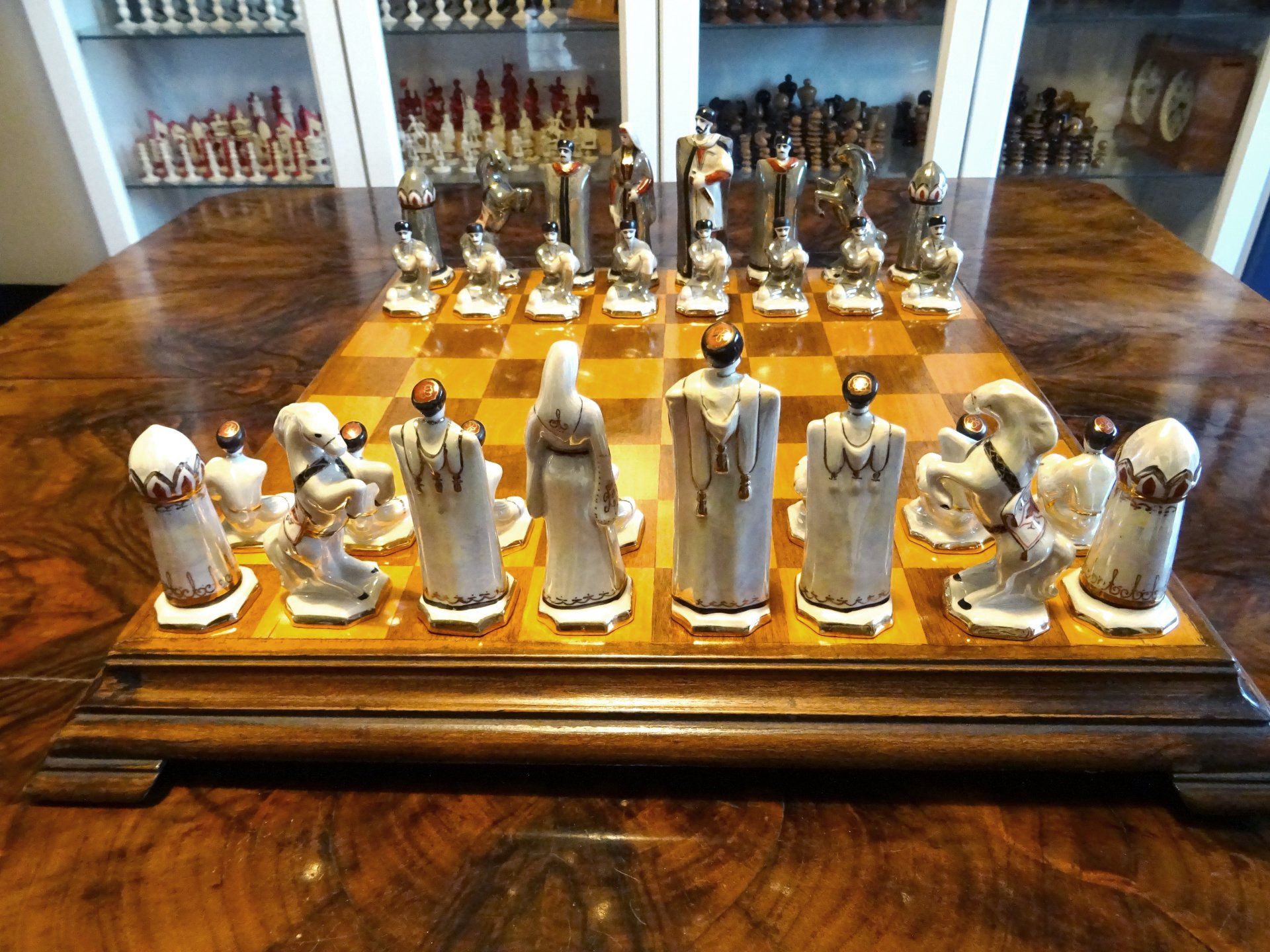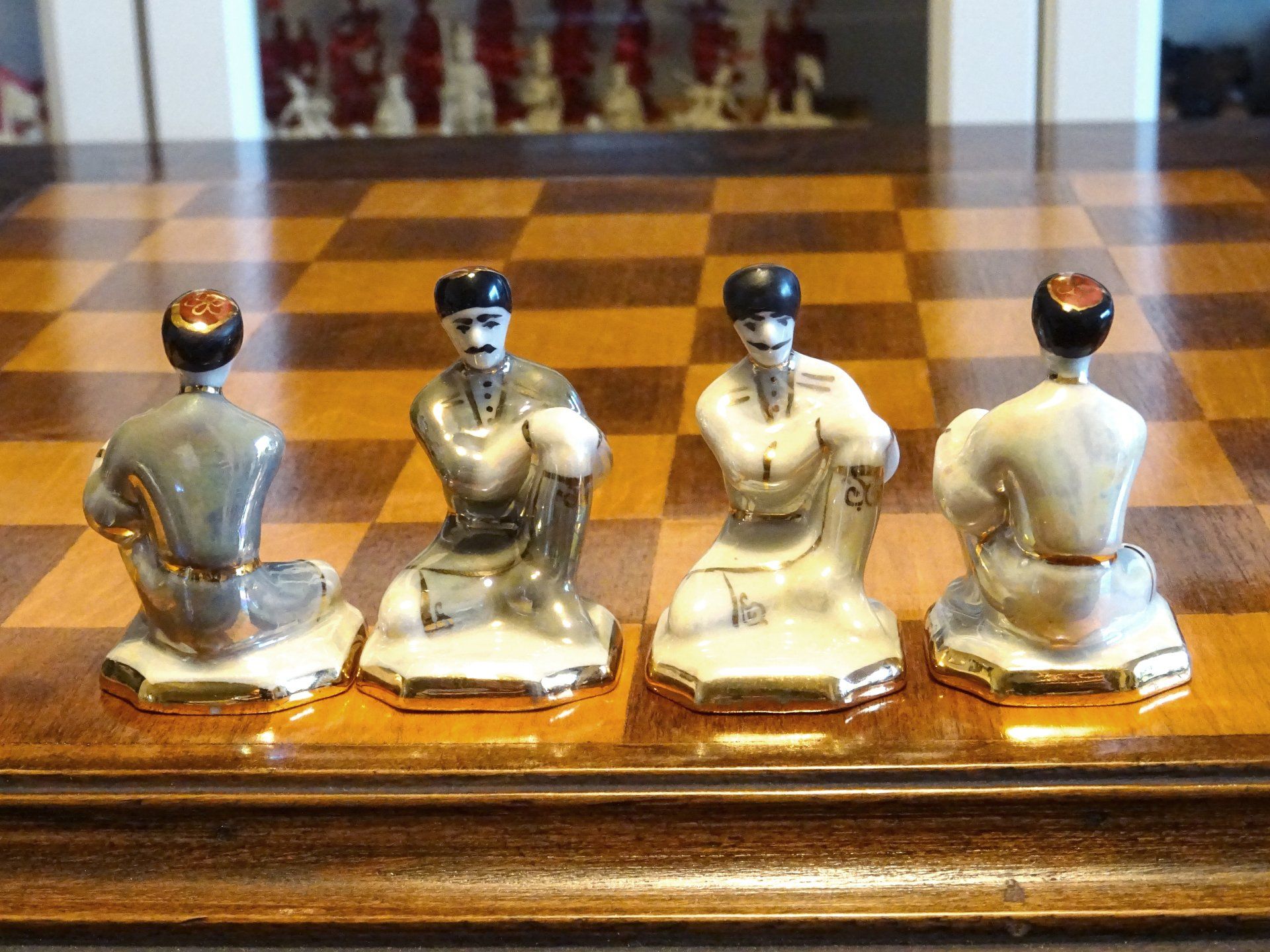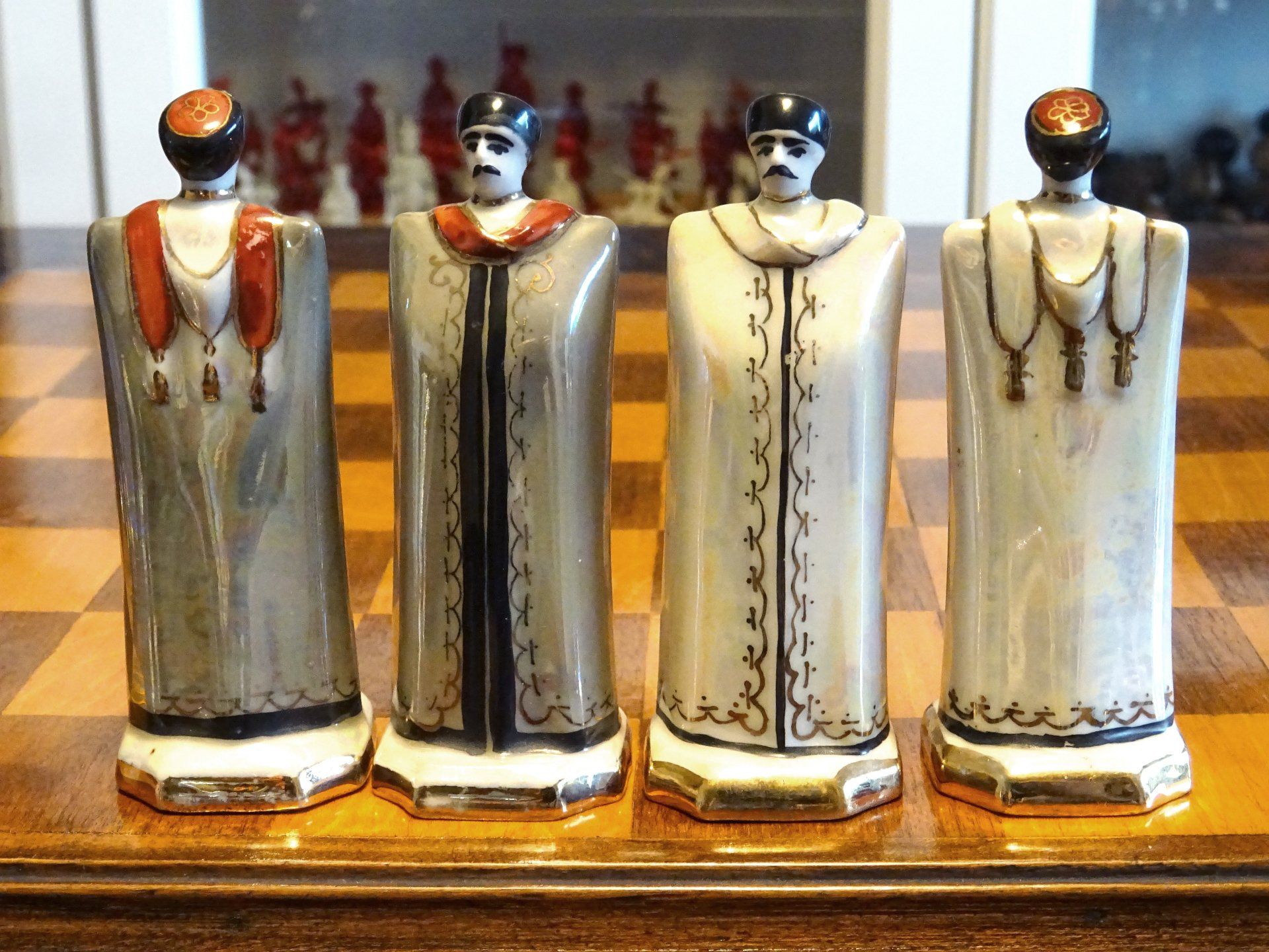 According to Isaak Linder, the design goes back to Georgian porcelain artists from the Zugdidi Porcelain factory in Zugdidi/Georgia (Linder, Schach - Schachfiguren im Wandel der Zeit, p. 83, 122-125). However, the set shown by Linder differs slightly from this set insofar as the bishops are wearing capes over their heads rather than hats and also in the colours, which seem to be much darker in the set attributed by Linder to the Zugdidi porcelain factory. Similar sets were also sold under the brand of the Kislovodsk porcelain factory, located some 200 miles away on the Russian side of the border.