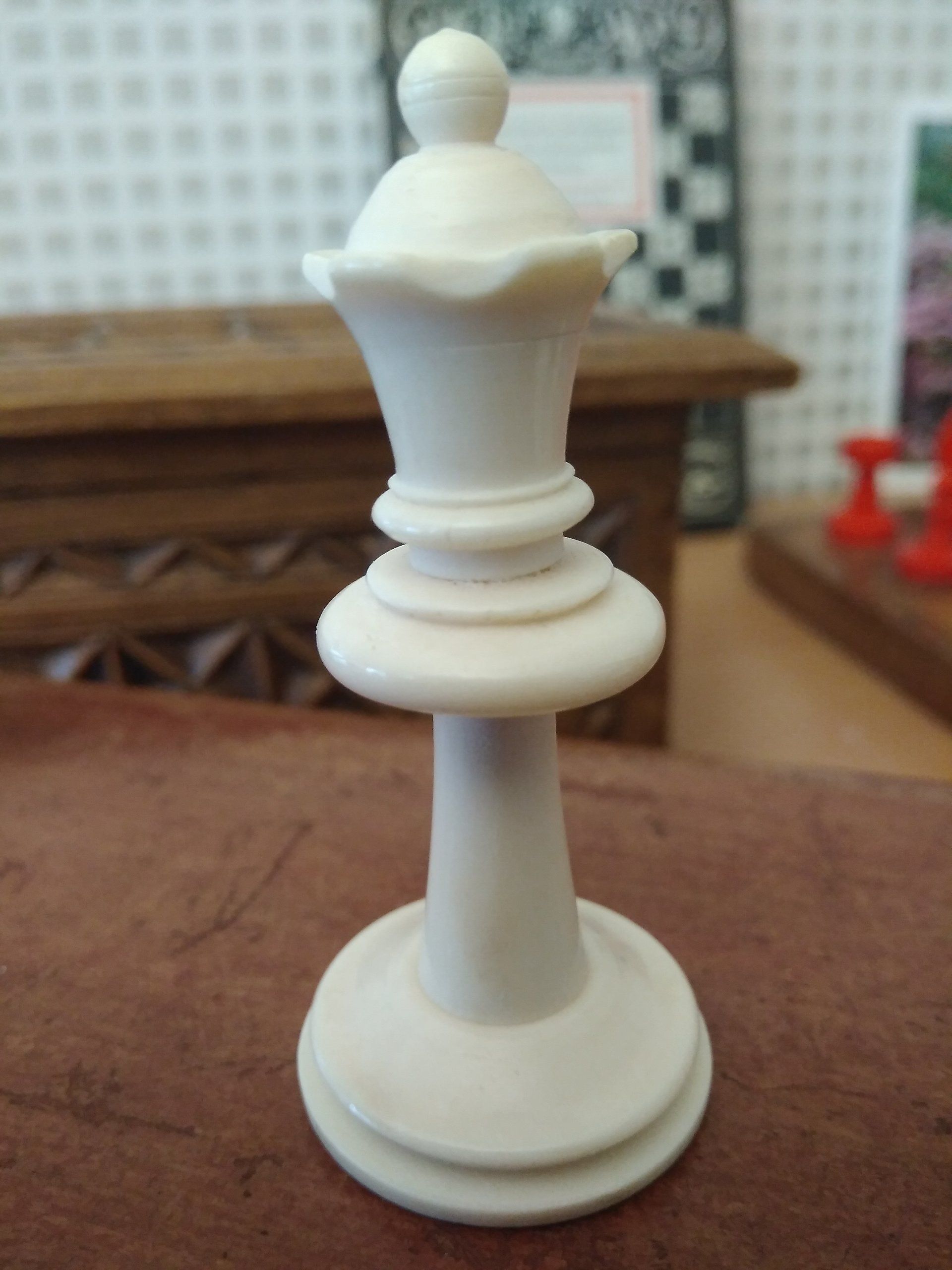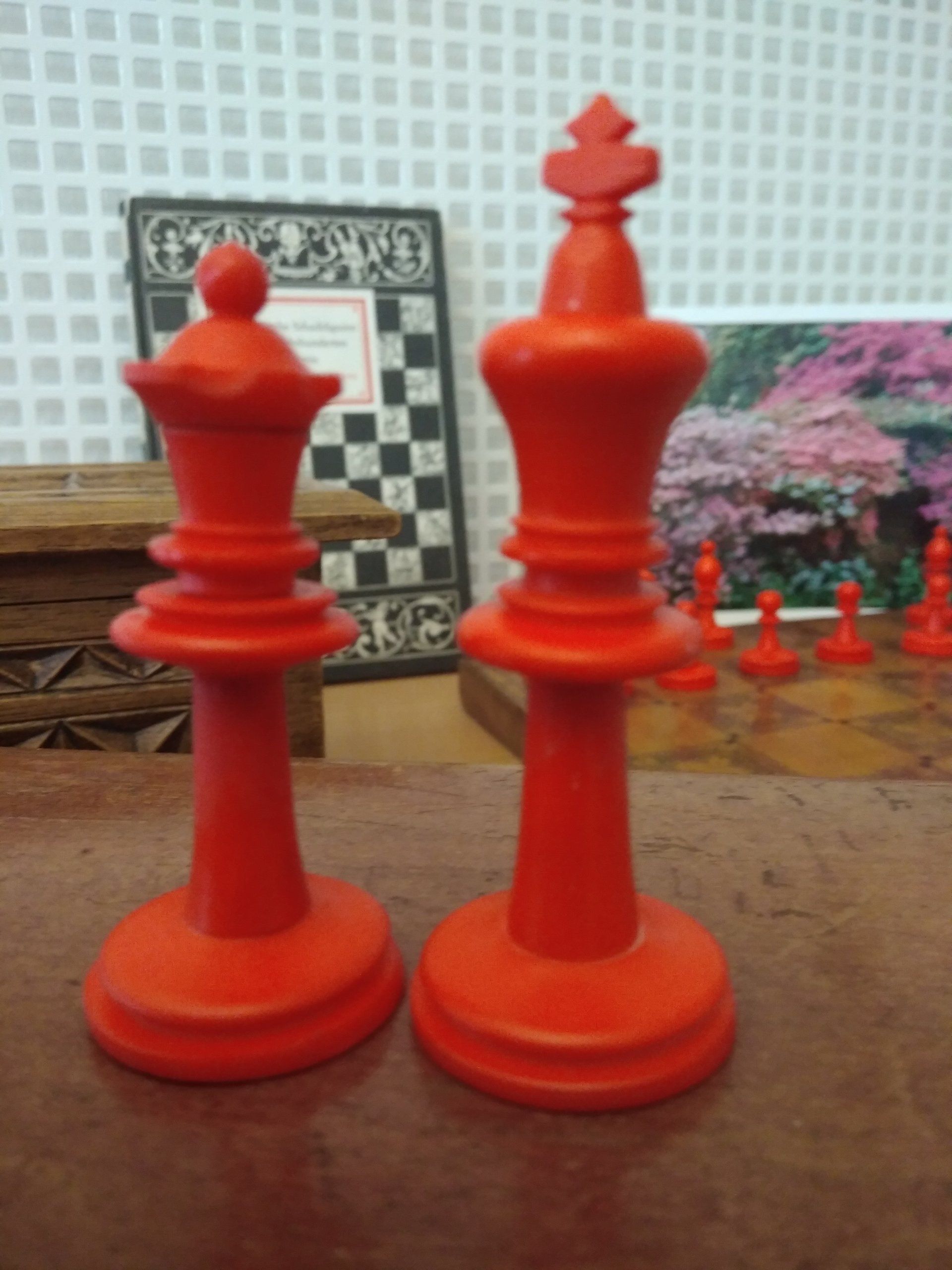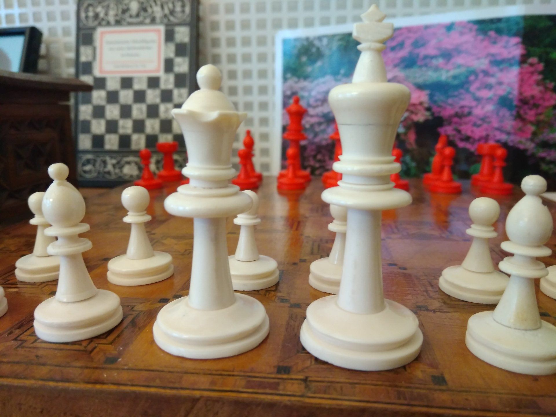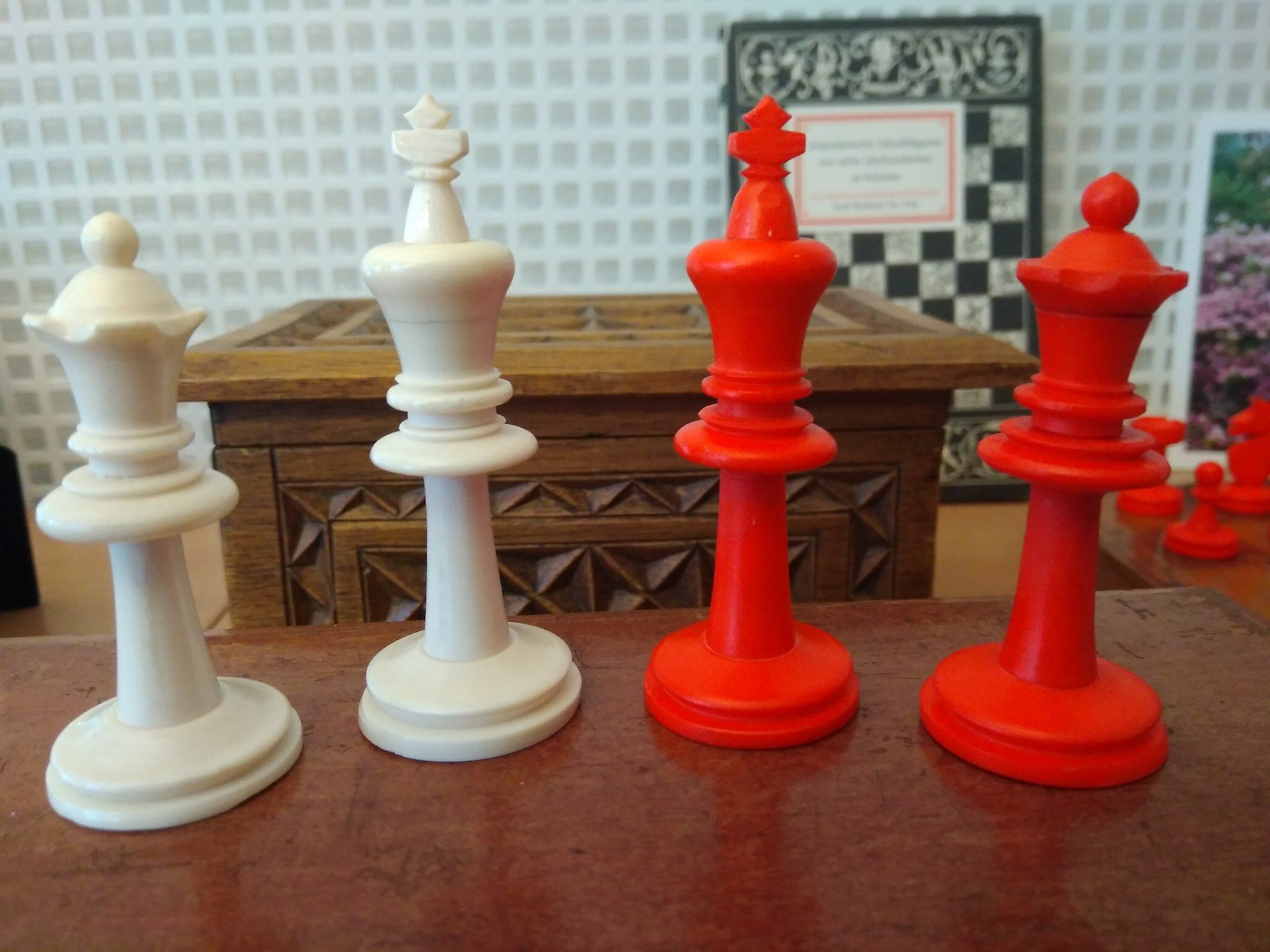 A wonderful Staunton chess set made by K.P.Uhlig in the early 20th century. According to my original Uhlig catalogue of 1913, this set is a no. 133 in size 1, which is a king size of 68 mm. The pieces are made from bone, one side stained in red. The condition of the pieces is almost pristine, especially the white side with almost no stains, as you often see them in bovine bone pieces due to the structure of the bone material.
