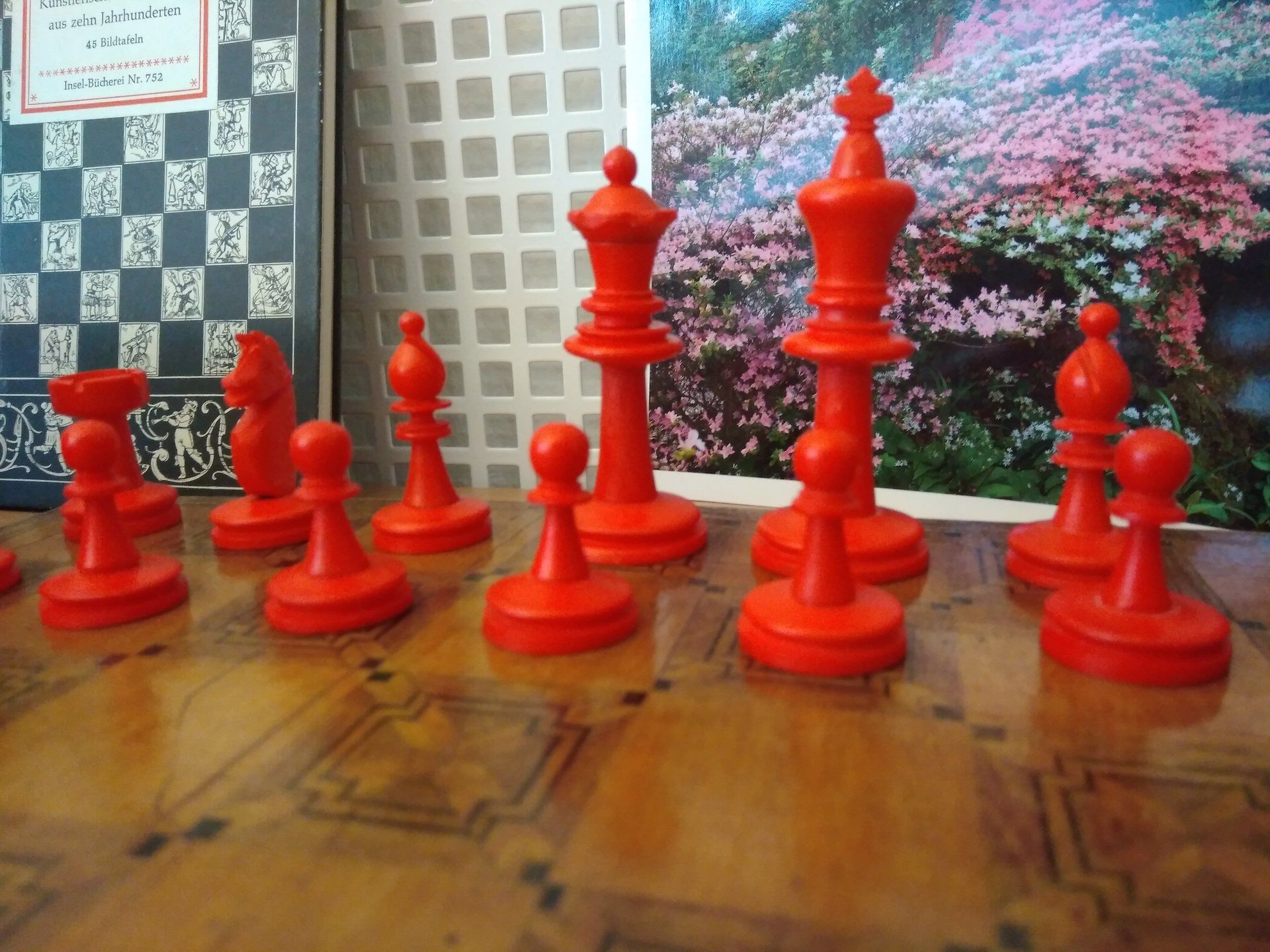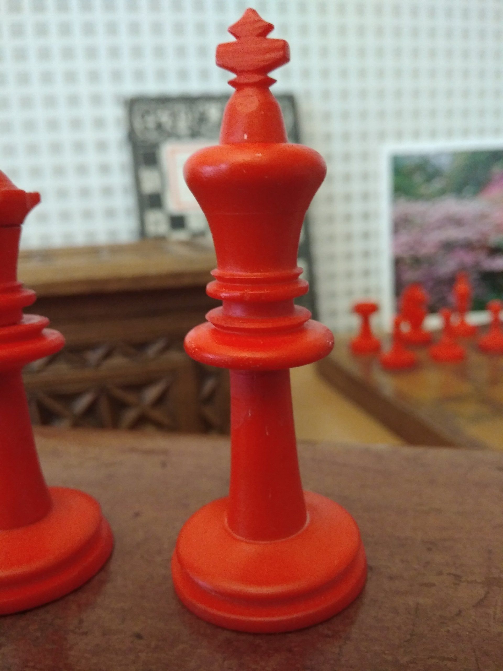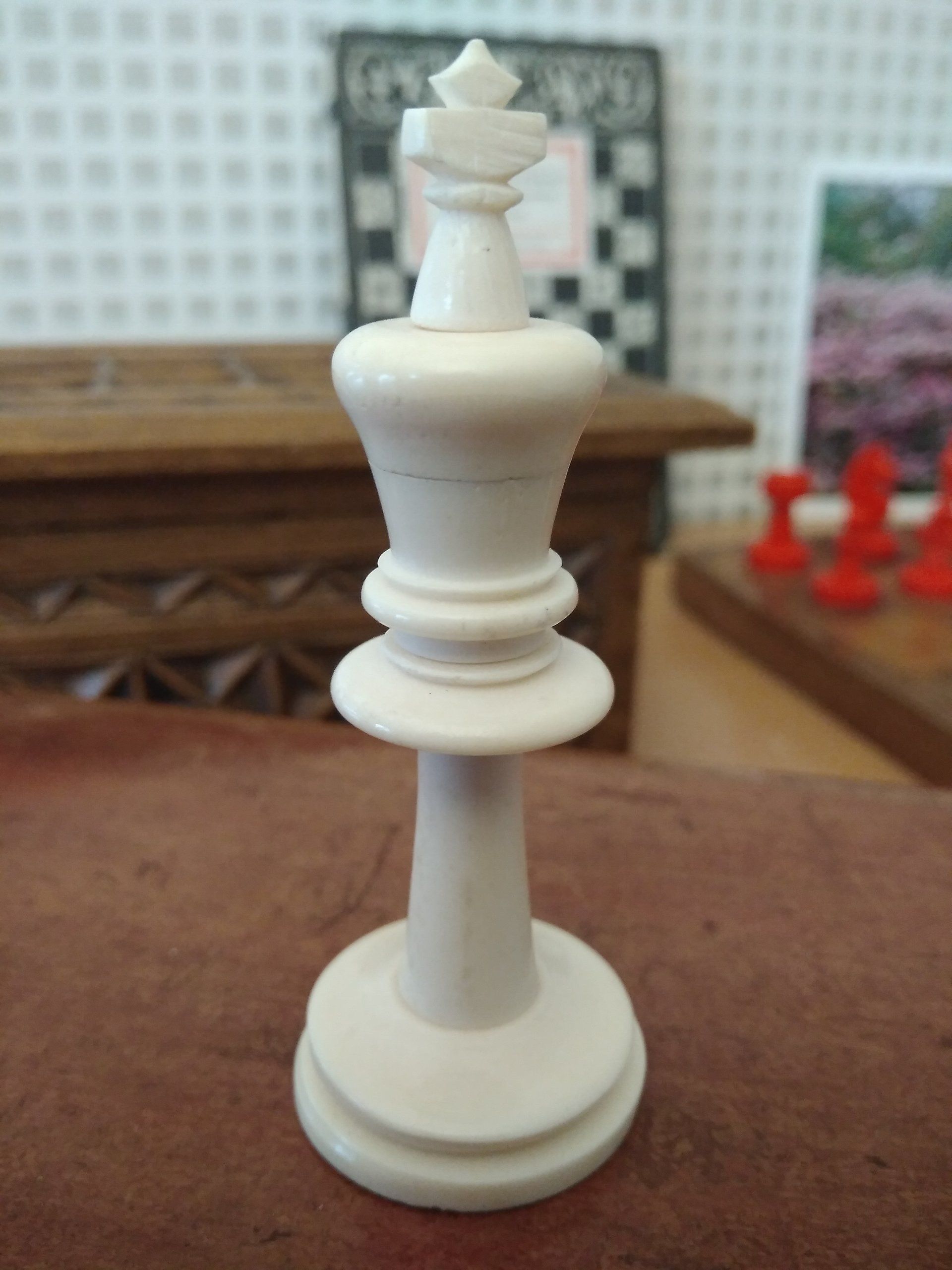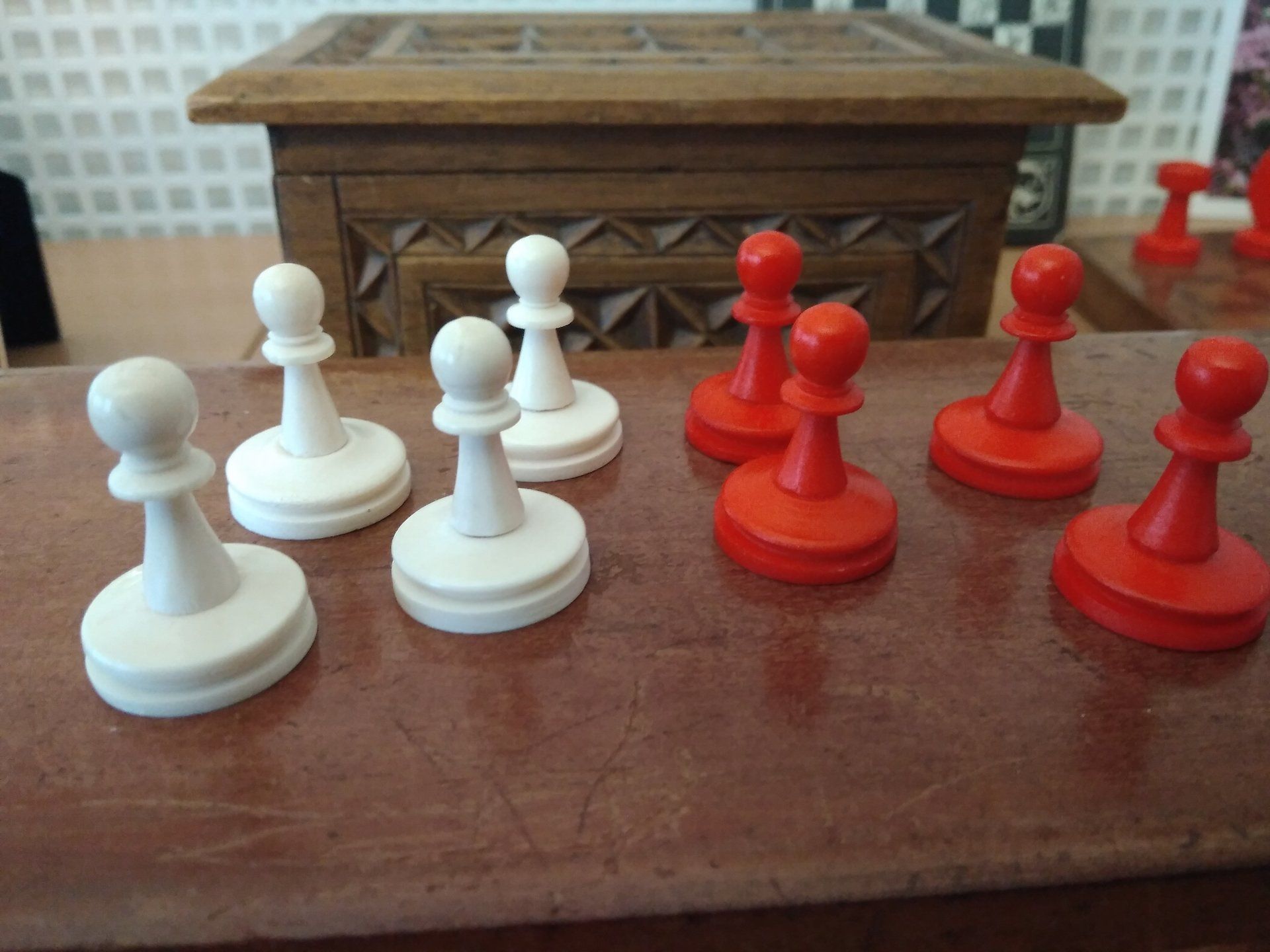 A wonderful Staunton chess set made by K.P.Uhlig in the early 20th century. According to my original Uhlig catalogue of 1913, this set is a no. 133 in size 1, which is a king size of 68 mm. The pieces are made from bone, one side stained in red. The condition of the pieces is almost pristine, especially the white side with almost no stains, as you often see them in bovine bone pieces due to the structure of the bone material.