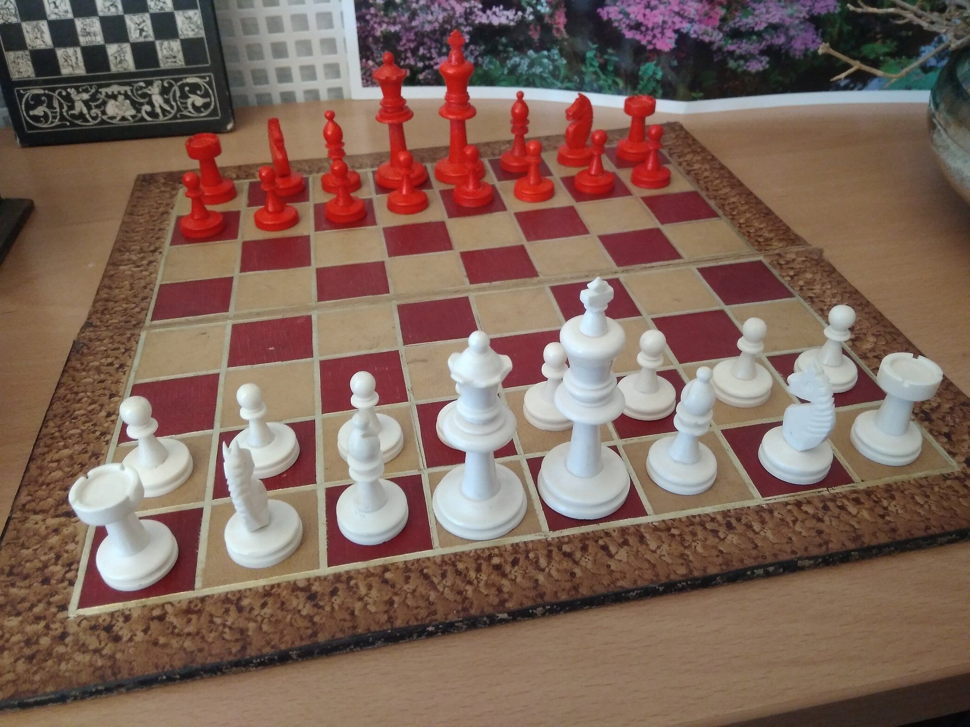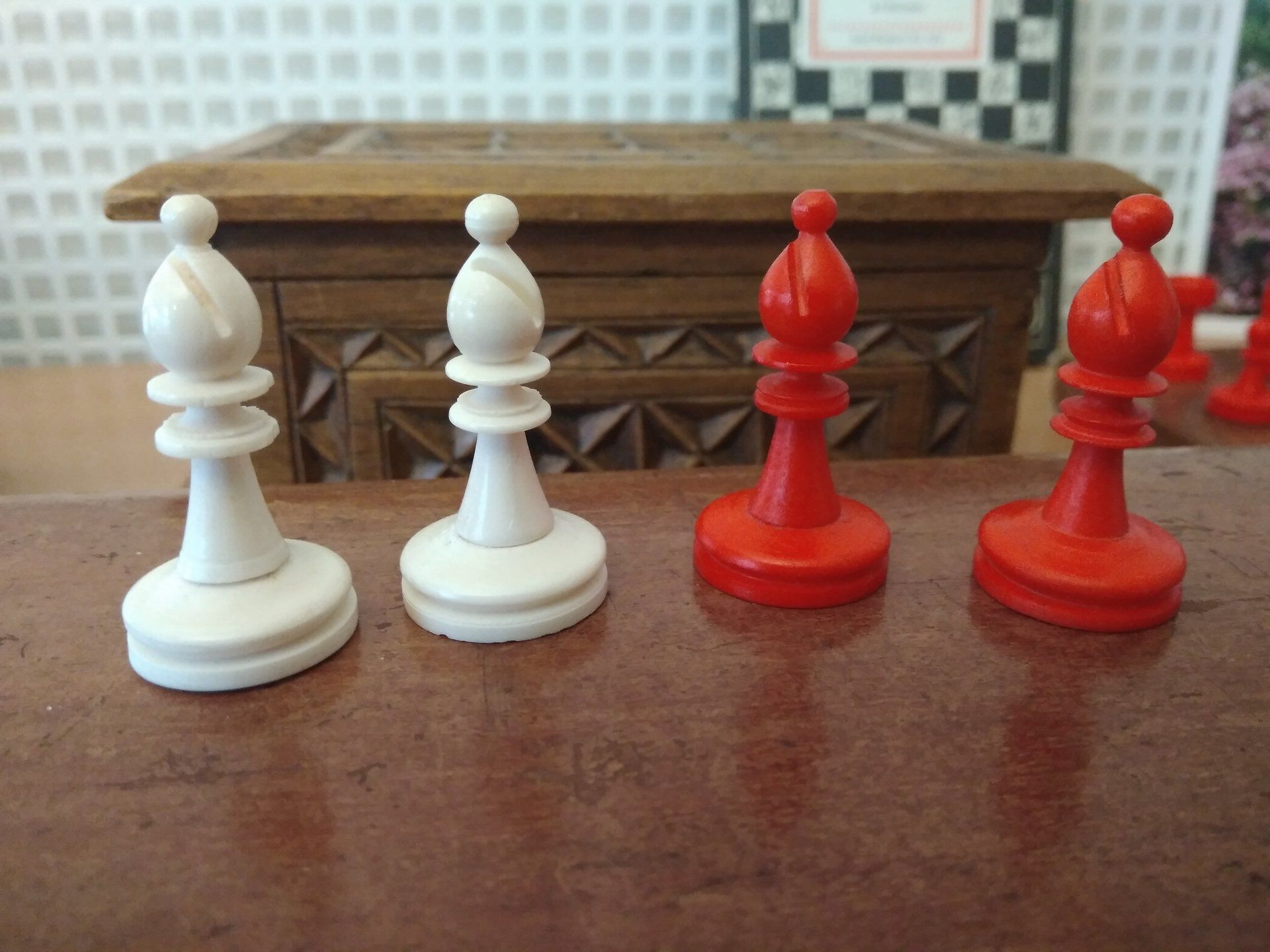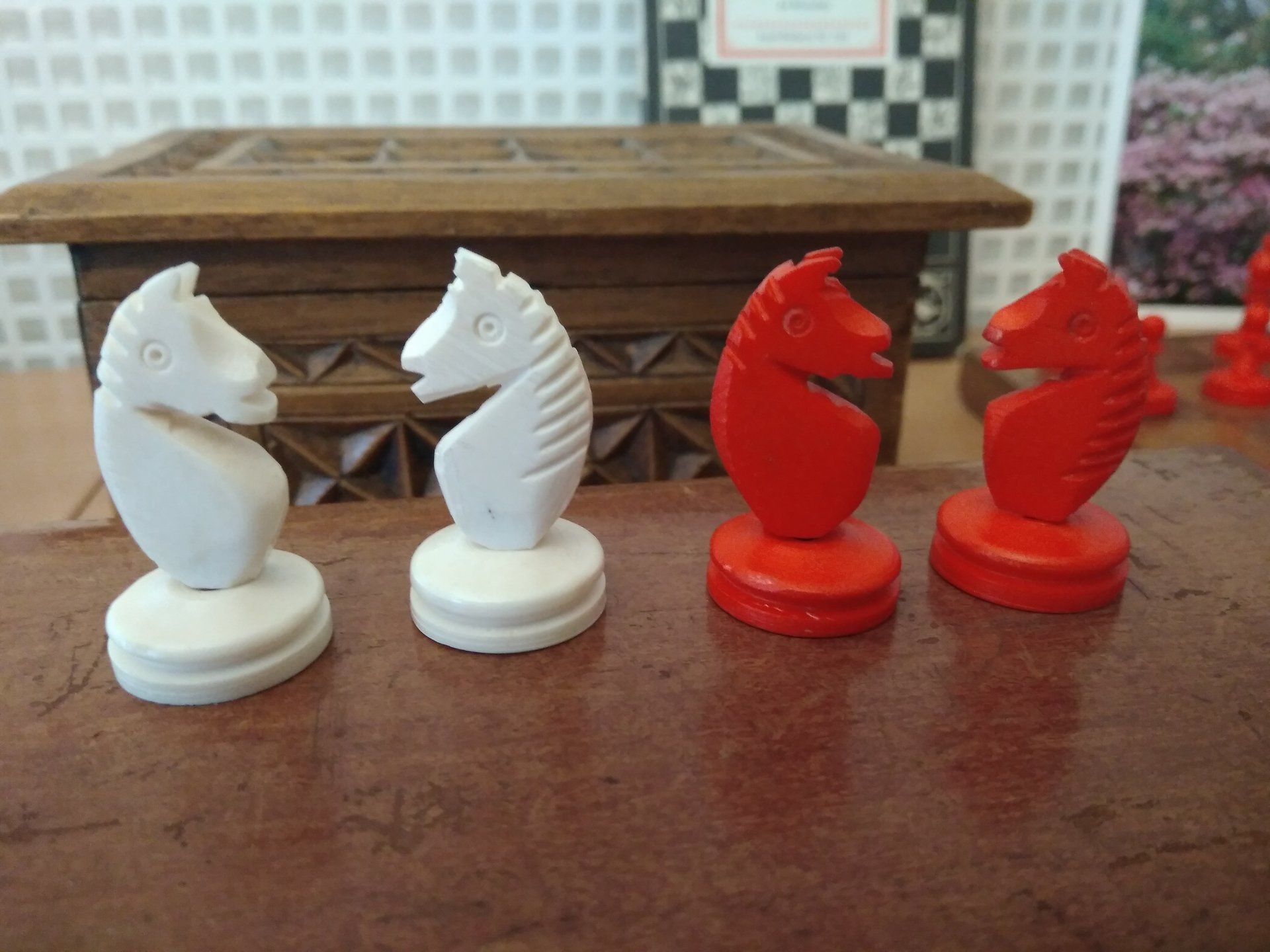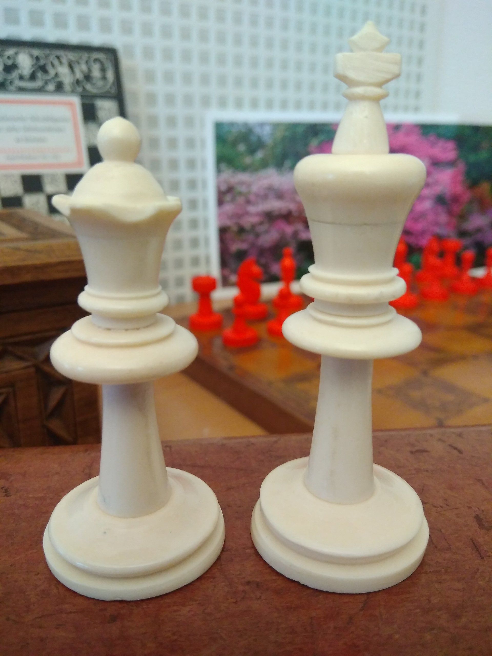 A wonderful Staunton chess set made by K.P.Uhlig in the early 20th century. According to my original Uhlig catalogue of 1913, this set is a no. 133 in size 1, which is a king size of 68 mm. The pieces are made from bone, one side stained in red. The condition of the pieces is almost pristine, especially the white side with almost no stains, as you often see them in bovine bone pieces due to the structure of the bone material.