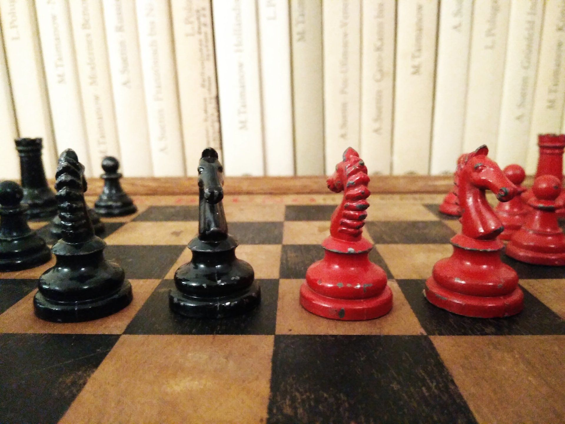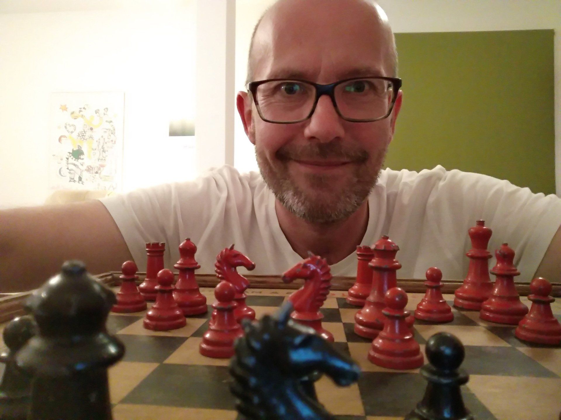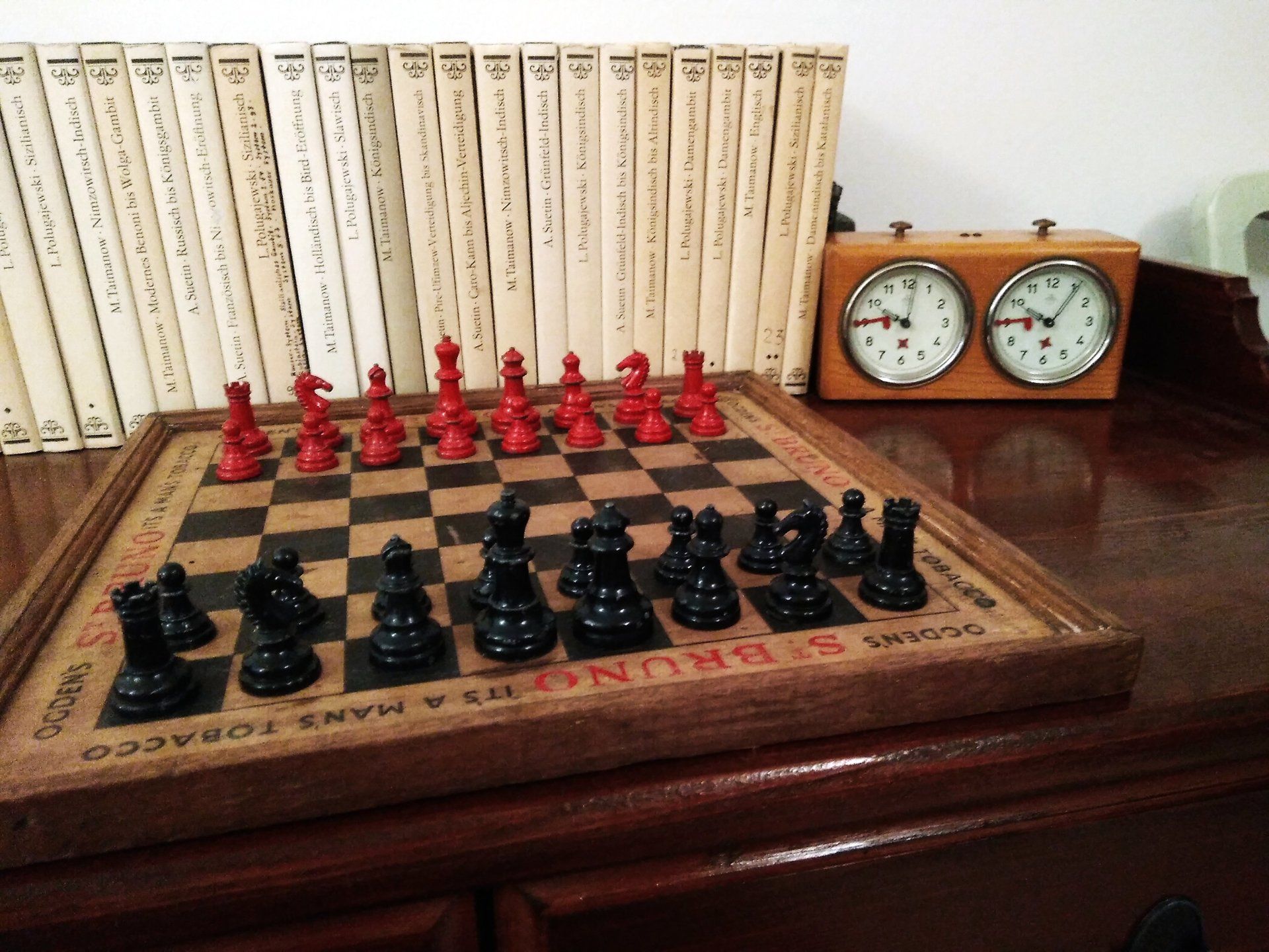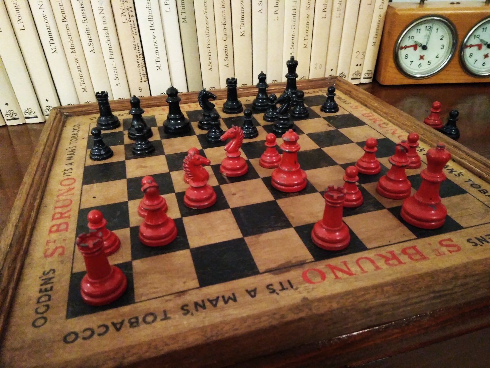 William Britain Lead Chess Set, ca. 1940, on a vintage playing board of the same period with Ogden / St. Bruno advertising imprinted on the rim together with a slightly younger guy setting up the pieces for nice pictures in order to post such pictures on this website for everyone to admire. All three still in a rather good condition, but with signs of wear and tear.