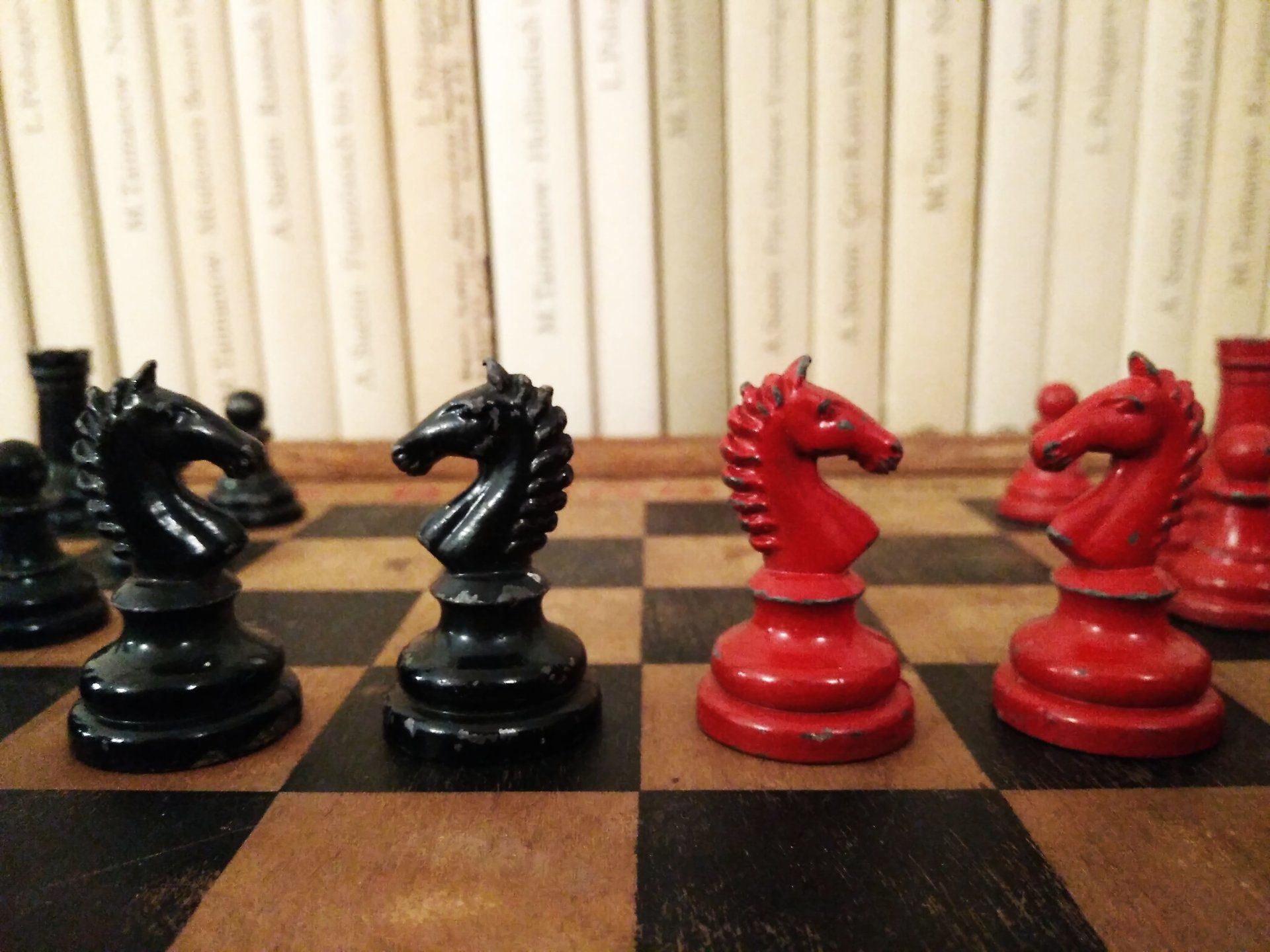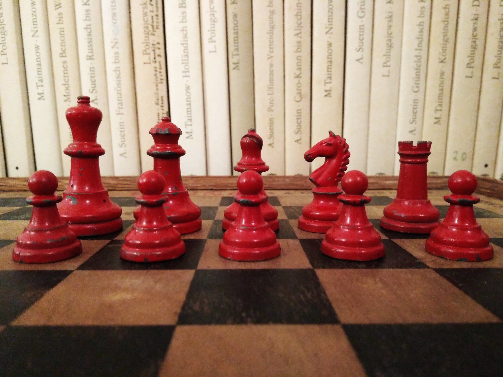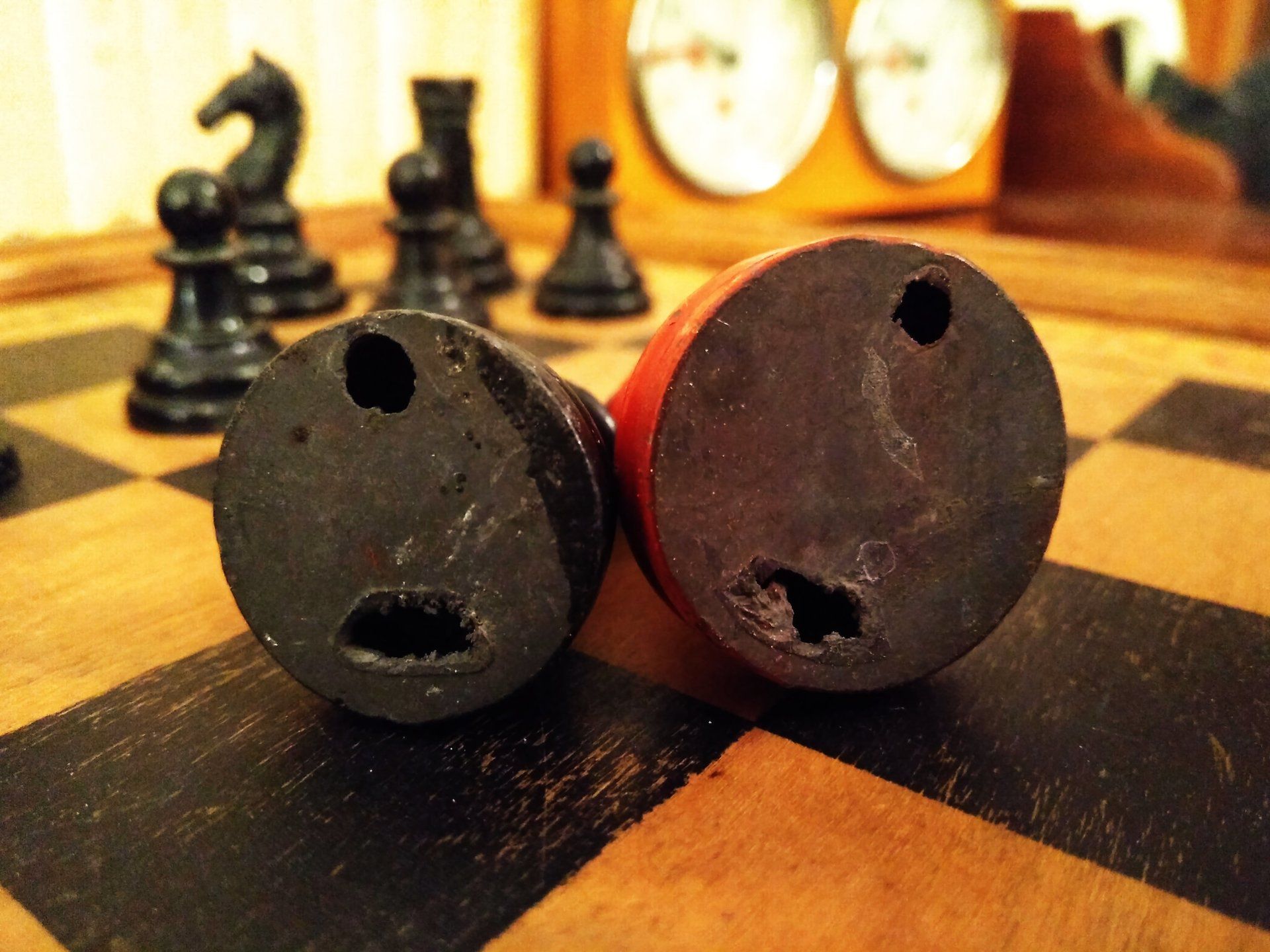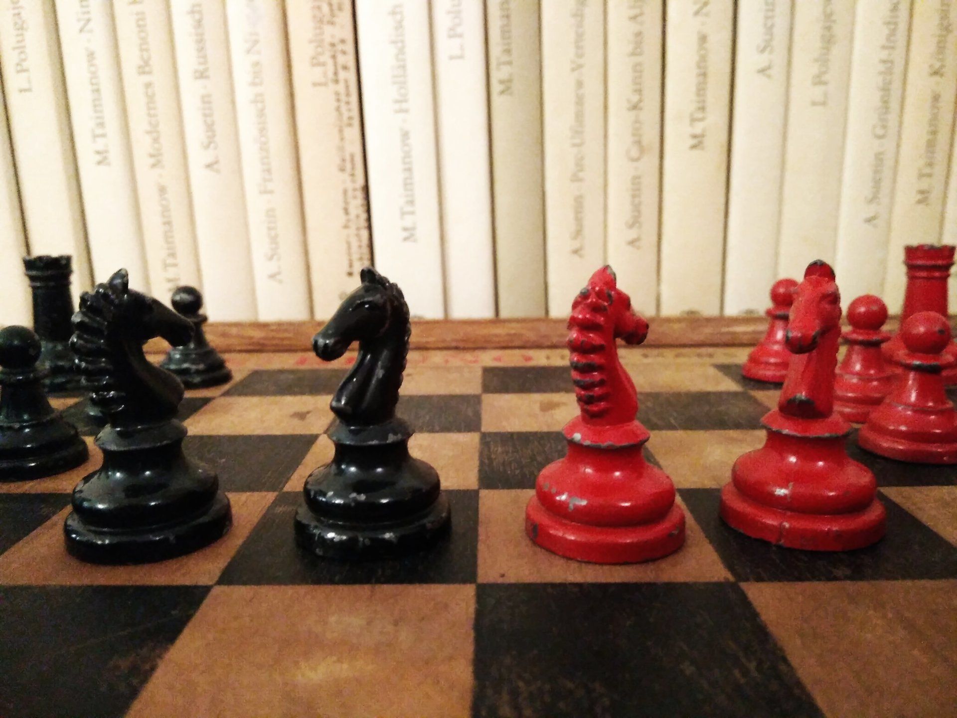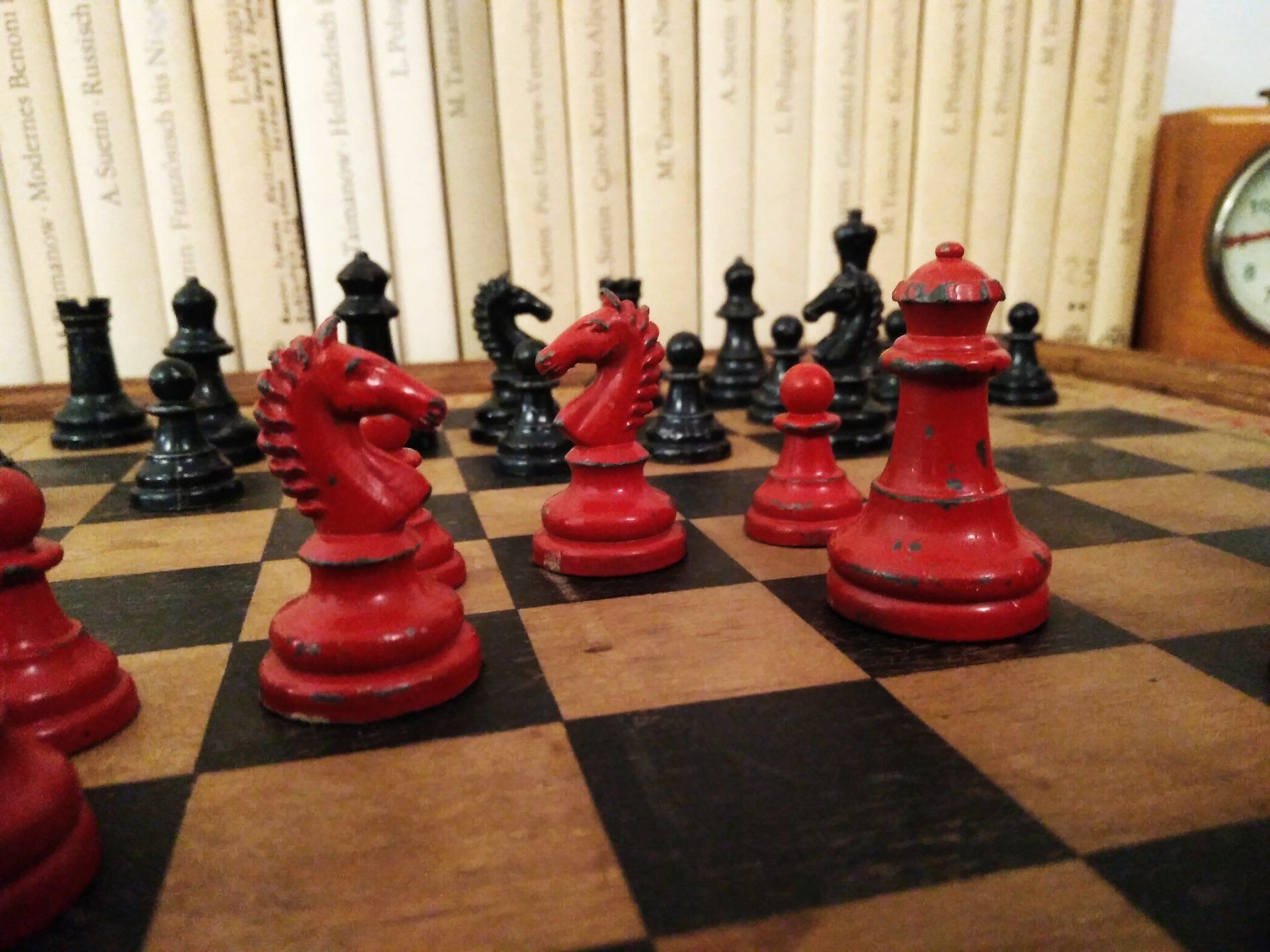 William Britain Lead Chess Set, ca. 1940, on a vintage playing board of the same period with Ogden / St. Bruno advertising imprinted on the rim together with a slightly younger guy setting up the pieces for nice pictures in order to post such pictures on this website for everyone to admire. All three still in a rather good condition, but with signs of wear and tear.