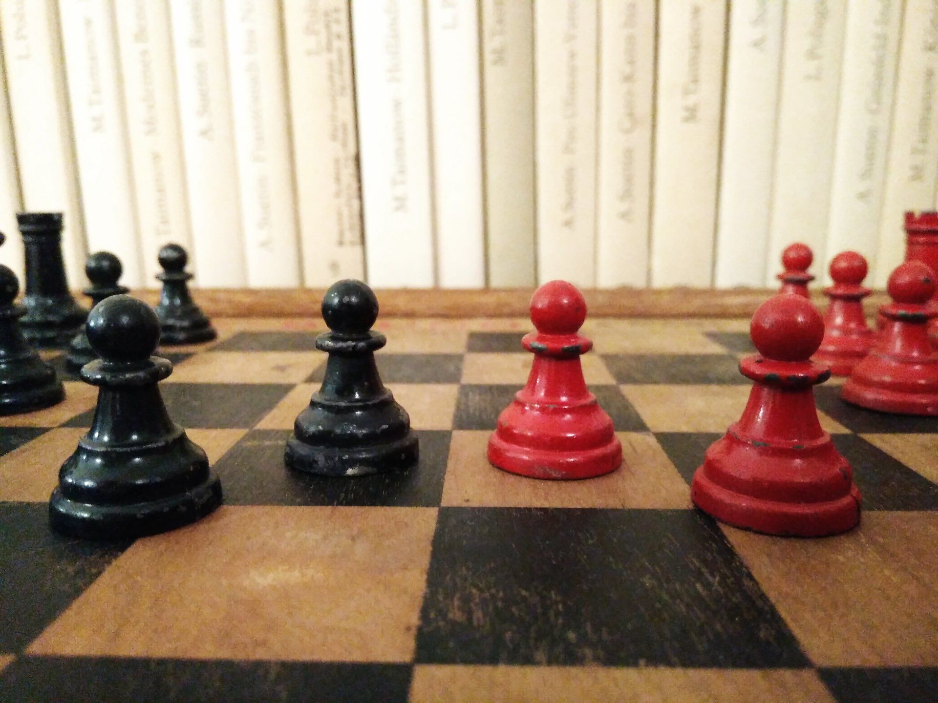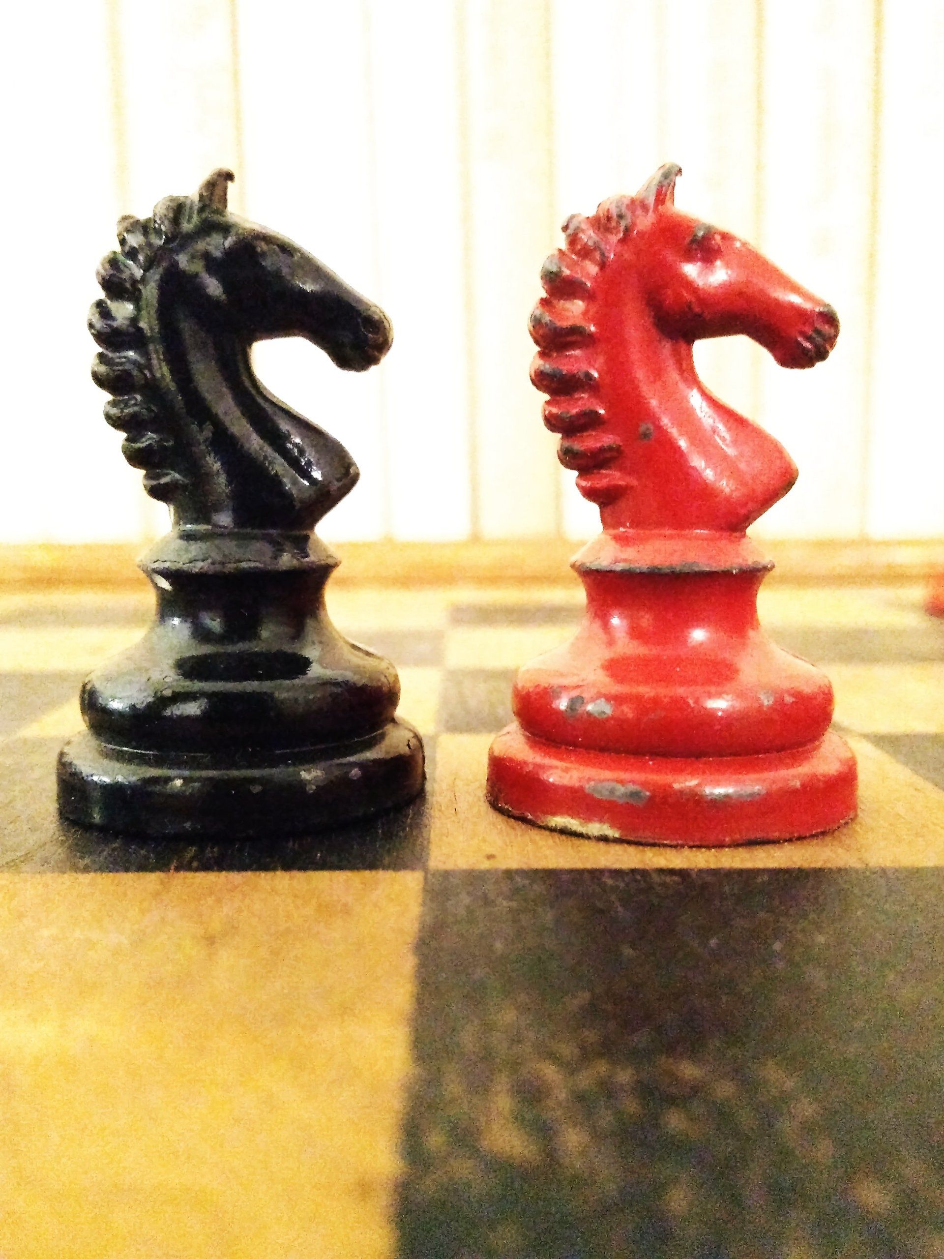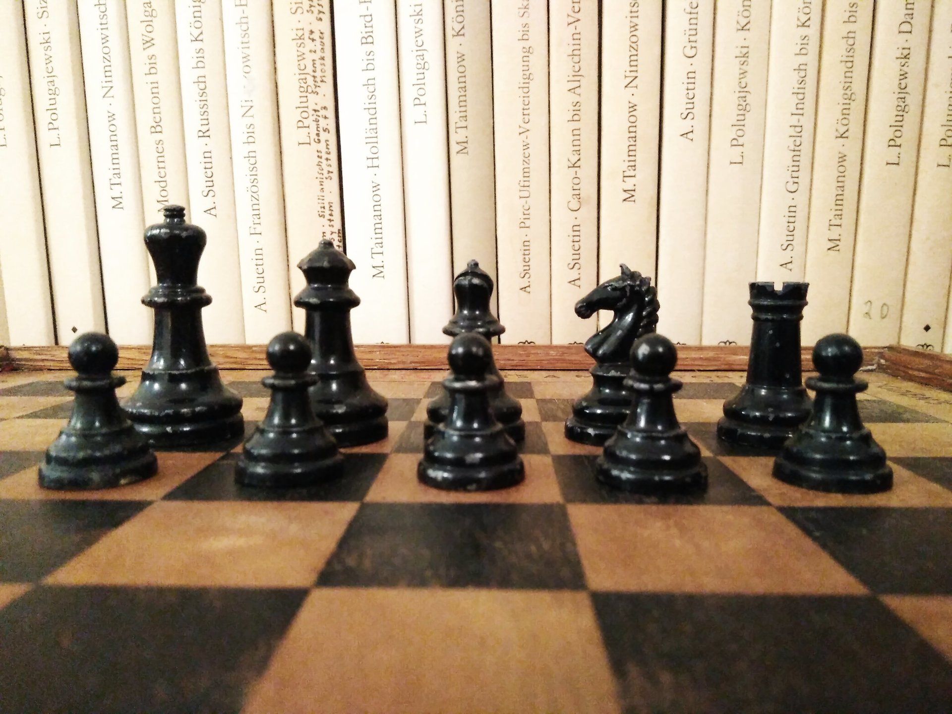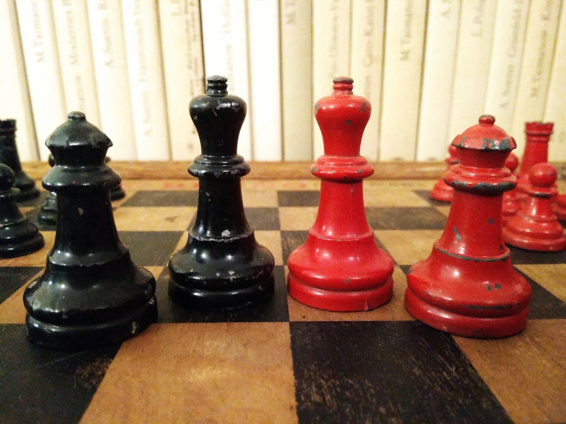 William Britain Lead Chess Set, ca. 1940, on a vintage playing board of the same period with Ogden / St. Bruno advertising imprinted on the rim together with a slightly younger guy setting up the pieces for nice pictures in order to post such pictures on this website for everyone to admire. All three still in a rather good condition, but with signs of wear and tear.