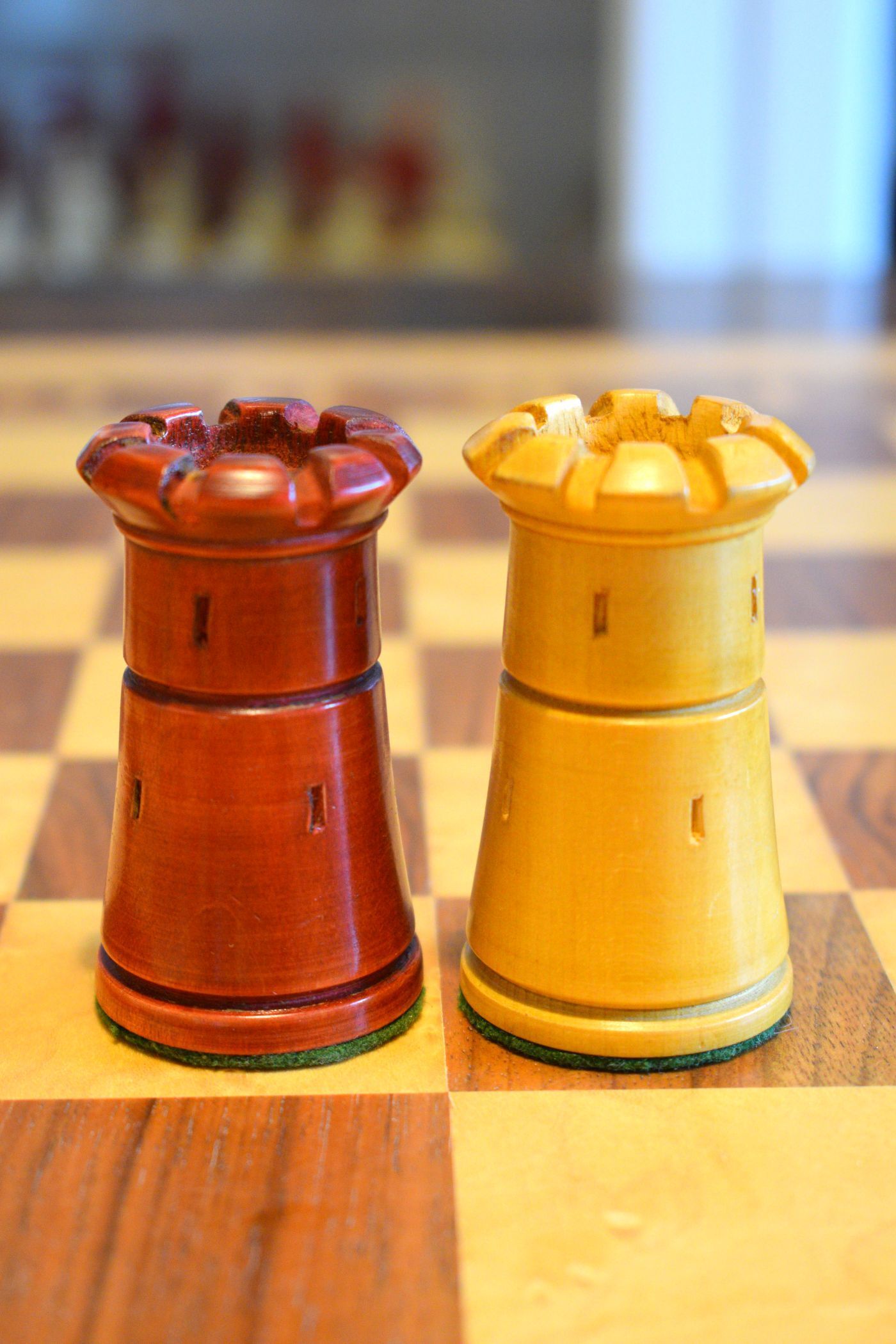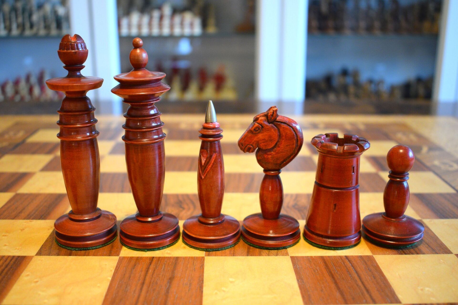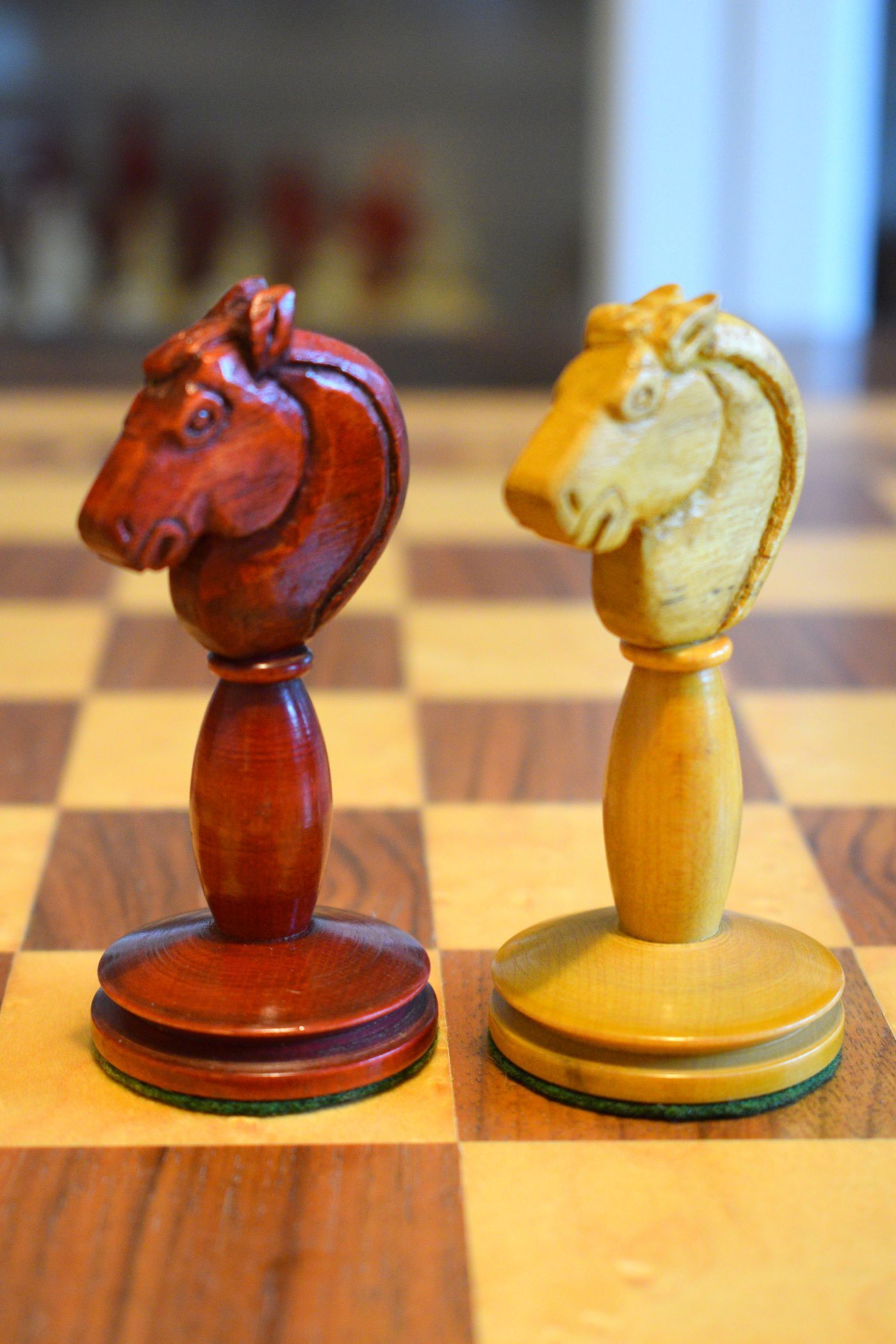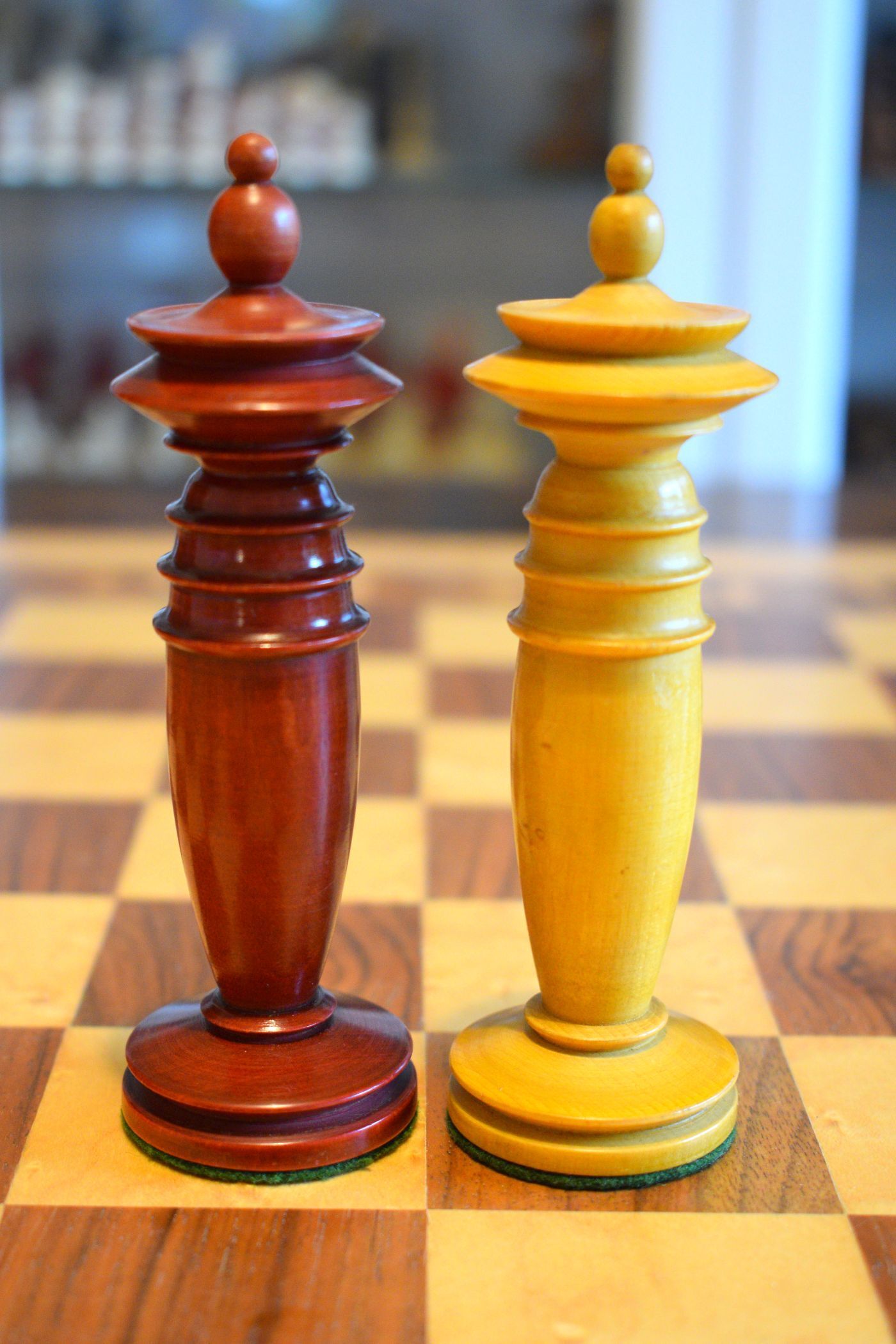 Here is an unusual set, of which I know very little. I associate the style of the kings and queens with some German sets, mainly because of the collars on the pieces and the shape of the crowns. The design of the knights reminds me of Russian-German "début du siècle" art, in particular the aesthetics of the "Blue Rider". The shape of the other pieces reminds me of German art in the 1920's or 1930's again. This could be the period to which this set dates, but it could also be that it was just made later in reminiscence of the style. Anyhow, it is an extremely unusual and special set worthy of being collected and shown. The pieces are made of wood, most likely boxwood. The dark side is varnished with a red-brown lacquer. An eye catcher are the bishops, which have a metal tip that resembles a cartridge. Some kind of arrow shaped ornament is carved into their wood. The king has a cross carved into the ball finial on top of the crown. It has a size 12.4 cm. The pieces are not weighted.
