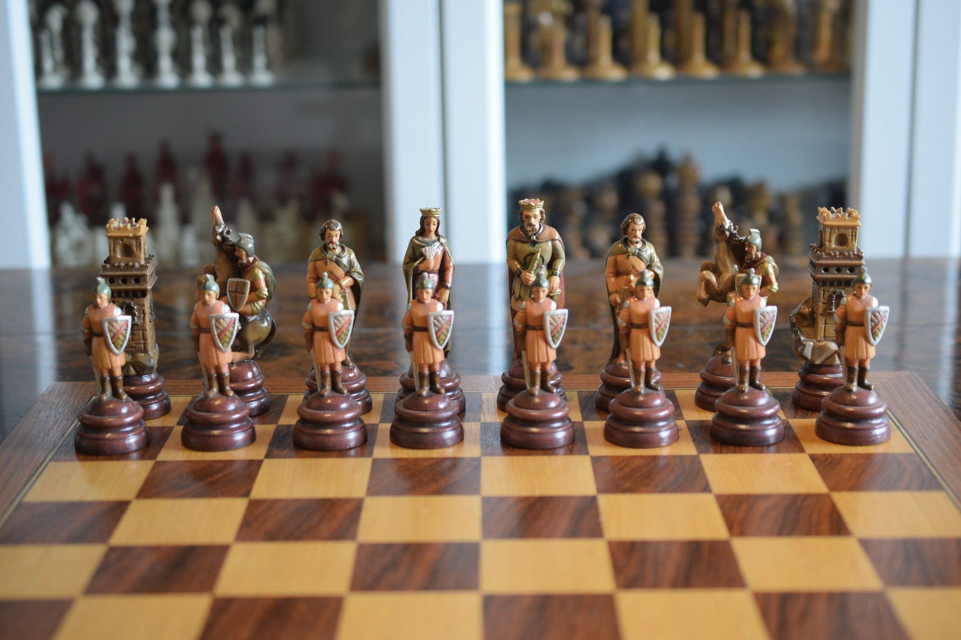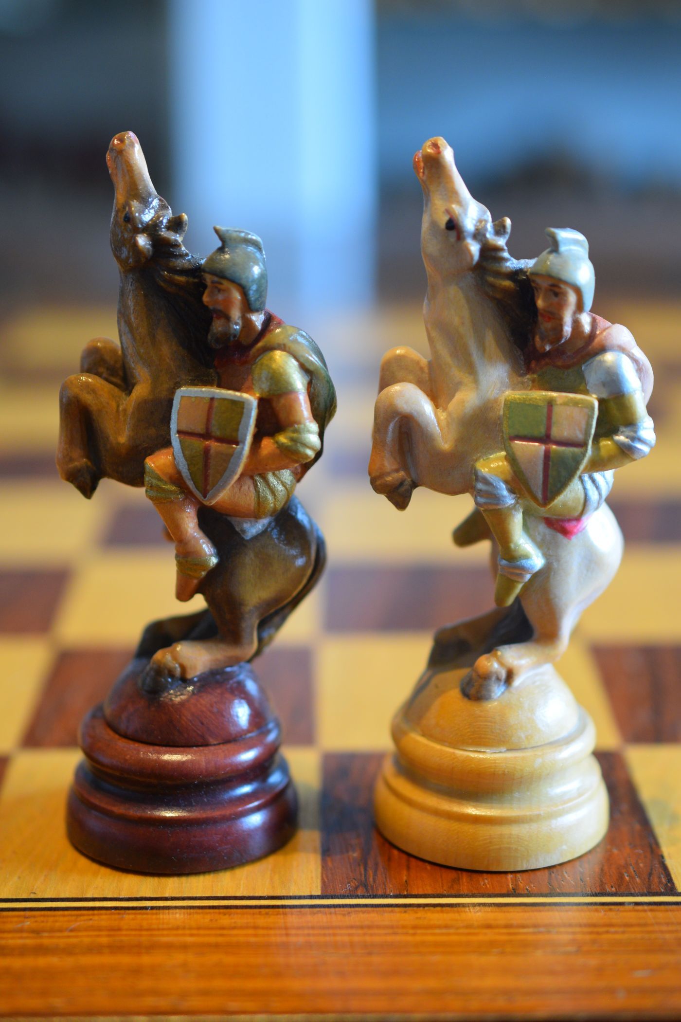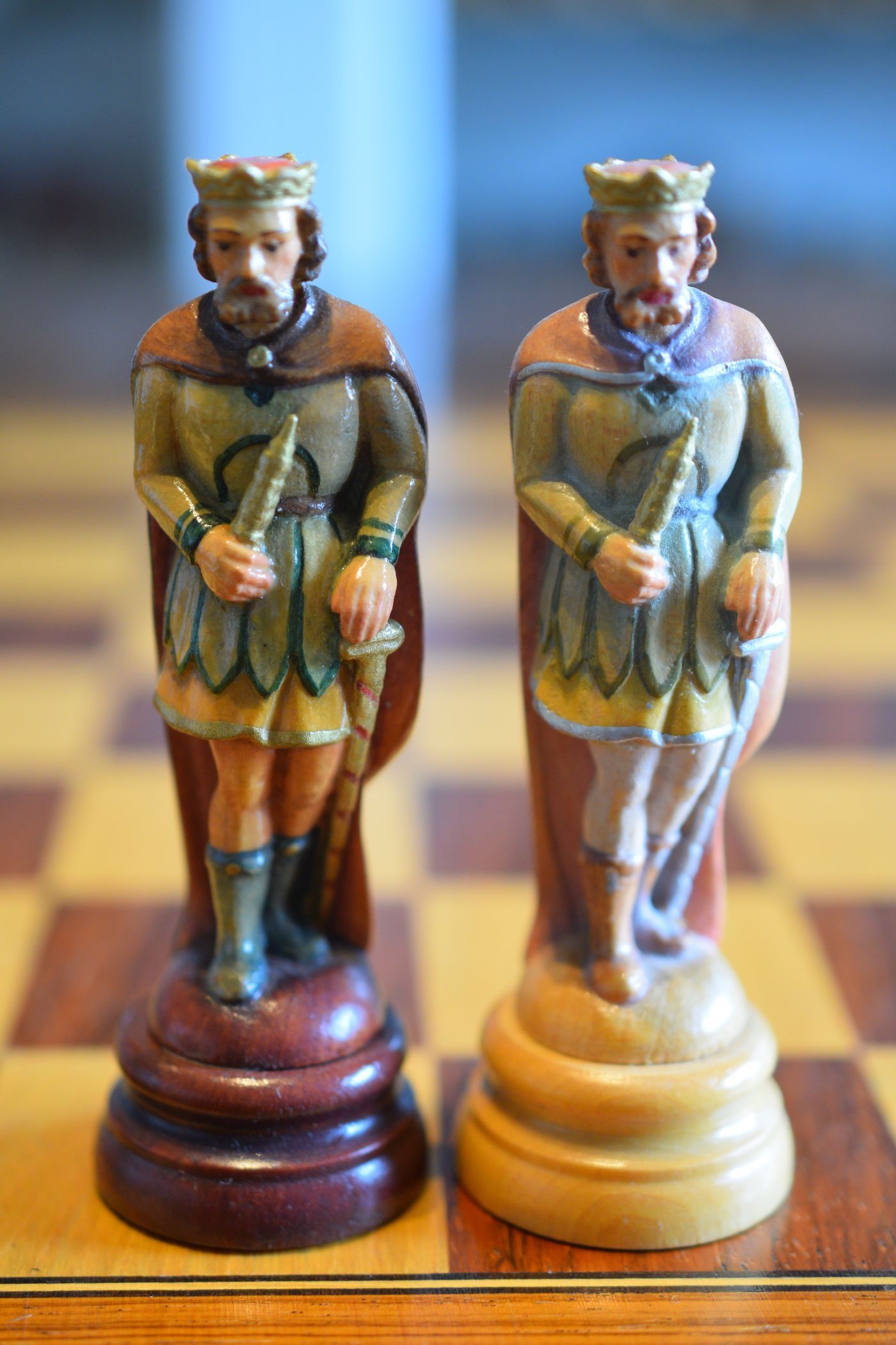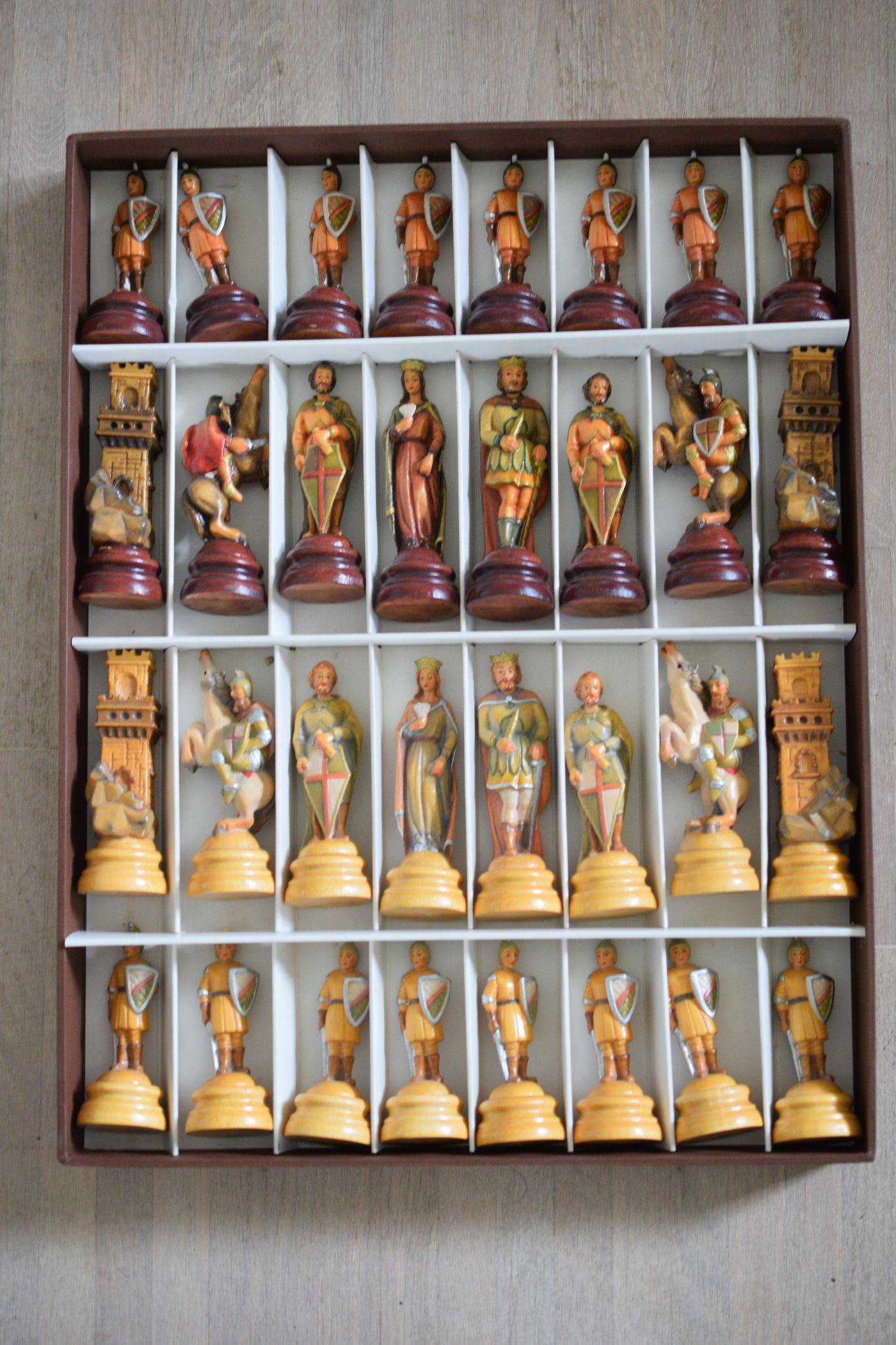 This type is very popular among the carvers of Val Gardena and usually sold under the name "Knight's Chess" (Ritterschach) or "Royal Chess" (Königliches Schach). The set resembles the Montsalvat type made in large numbers by Anton Rifesser (ANRI) from the 1950s onwards. But it differs in many details from the Montsalvat set, so I am convinced it is not an ANRI set. It was very likely made by one of the other families in Val Gardena with a long carving tradition, such as Moroder, Comploj or Demetz. While ANRI and Dolfi sets are fairly common, sets made by other carvers are rather rare. I assume, however, that these sets, like ANRI sets, were also not fully handcarved, but machine carved with a pantograph on the basis of a hand made bronze model. Nevertheless, the carving detail - emphasized by the polychrome painting - is great, which makes this a true gem of a set for any collector.