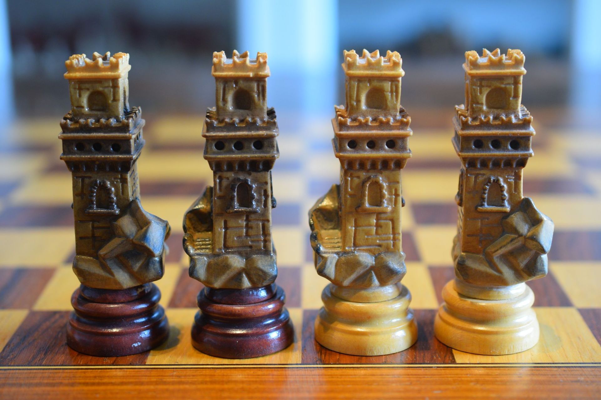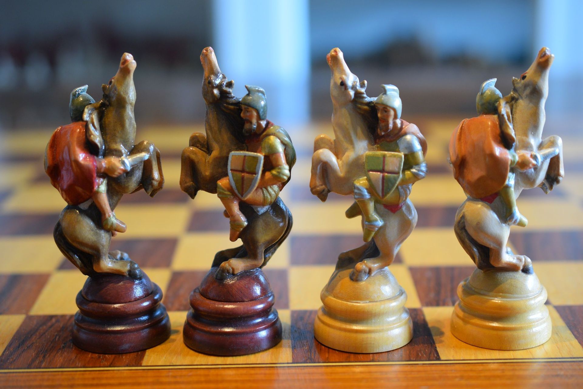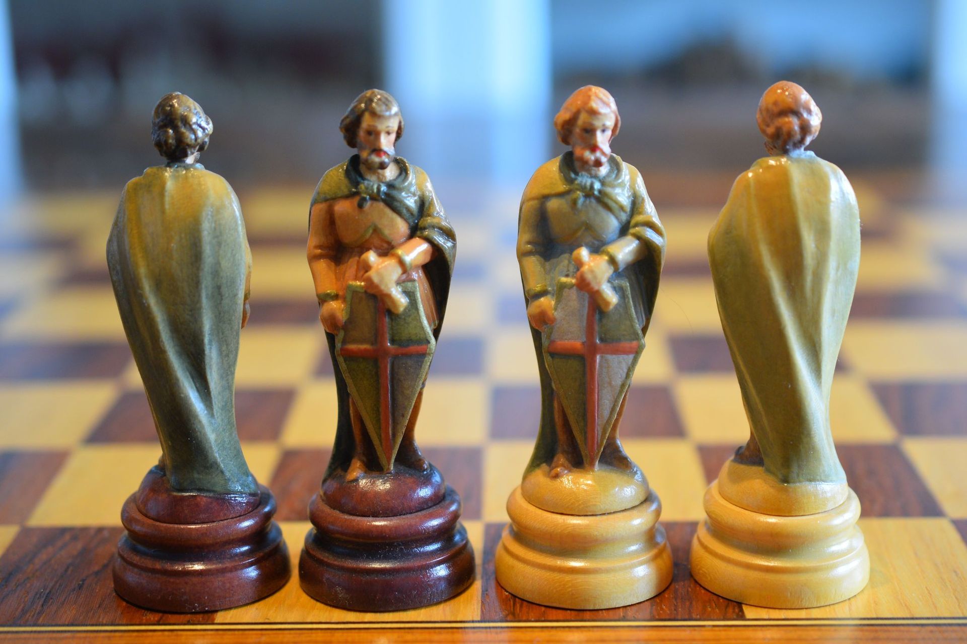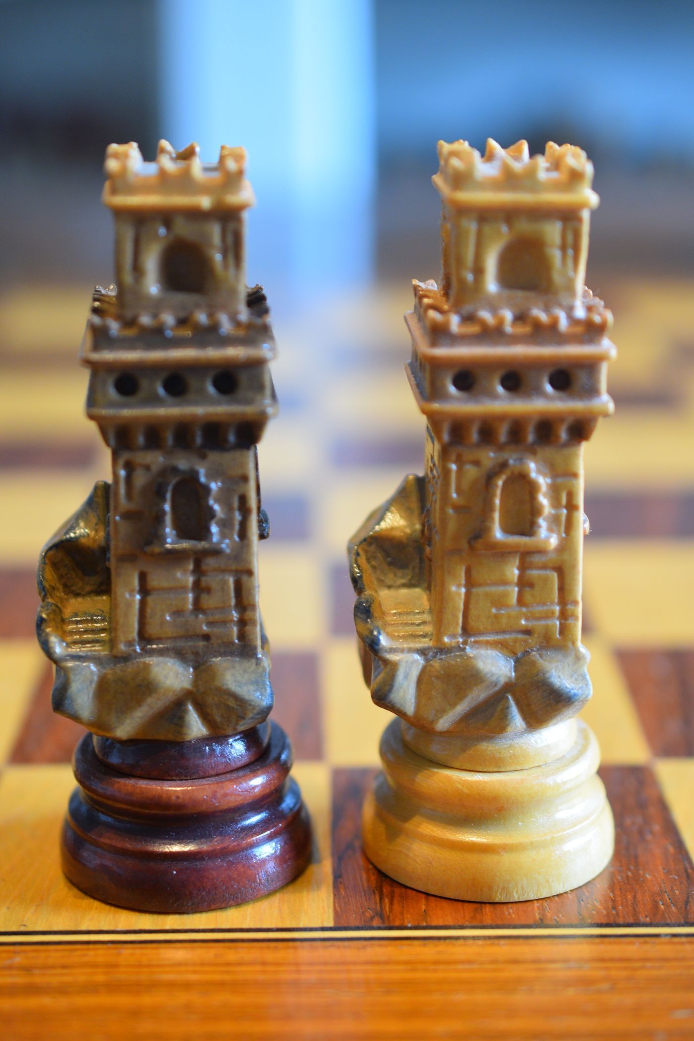 This type is very popular among the carvers of Val Gardena and usually sold under the name "Knight's Chess" (Ritterschach) or "Royal Chess" (Königliches Schach). The set resembles the Montsalvat type made in large numbers by Anton Rifesser (ANRI) from the 1950s onwards. But it differs in many details from the Montsalvat set, so I am convinced it is not an ANRI set. It was very likely made by one of the other families in Val Gardena with a long carving tradition, such as Moroder, Comploj or Demetz. While ANRI and Dolfi sets are fairly common, sets made by other carvers are rather rare. I assume, however, that these sets, like ANRI sets, were also not fully handcarved, but machine carved with a pantograph on the basis of a hand made bronze model. Nevertheless, the carving detail - emphasized by the polychrome painting - is great, which makes this a true gem of a set for any collector.