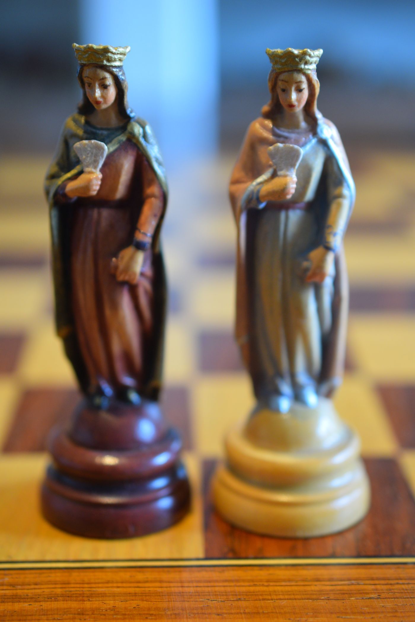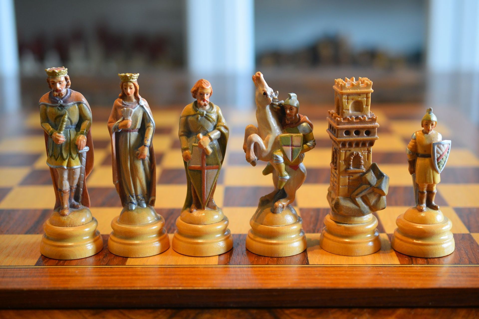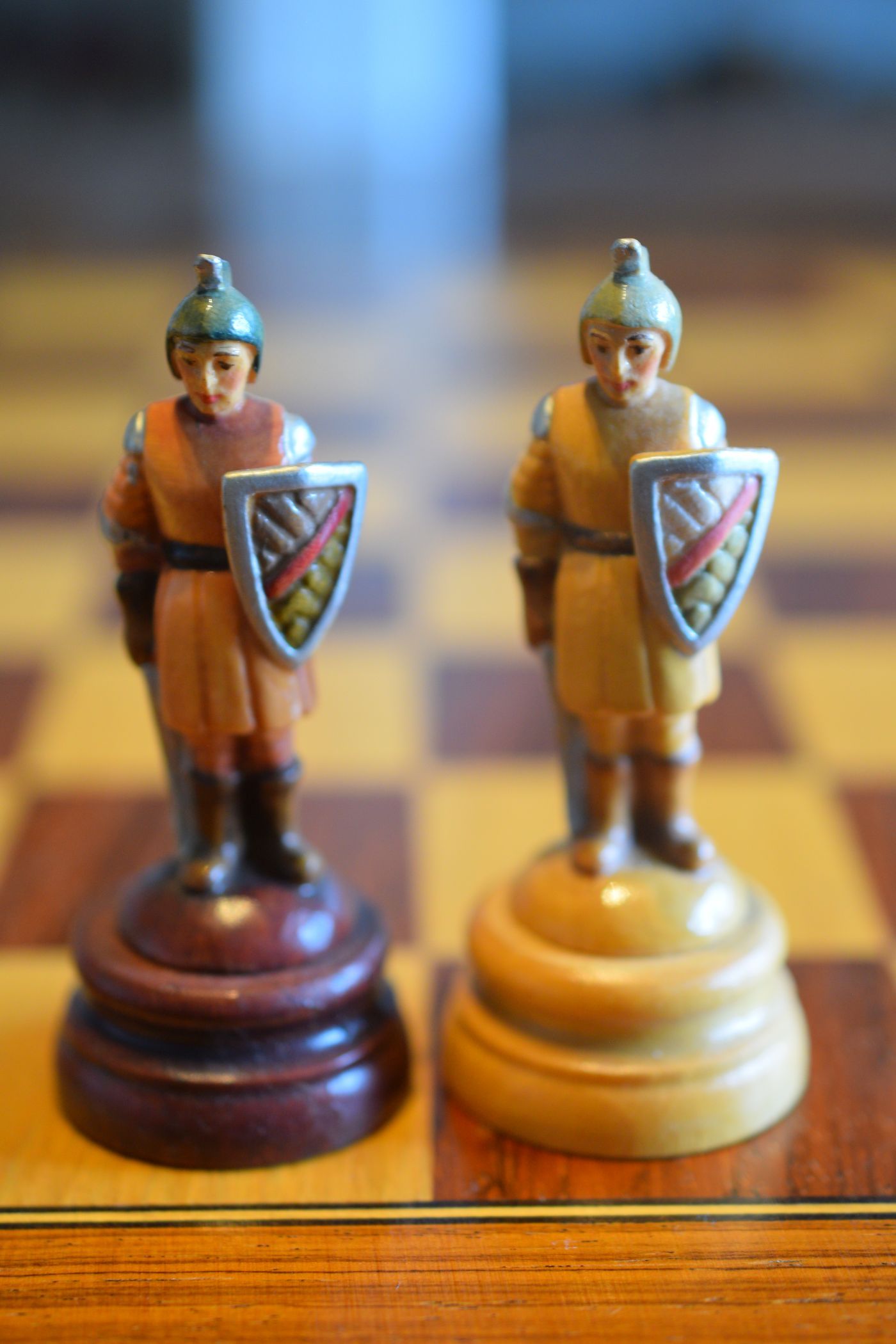 A figural chess set made in Grödnertal / Val Gardena, South Tyrol, Italy some time in the second half of the 20th century. The pieces with a king size of 10.5 cm, which came in a compartmented carton box, are carved from wood and finished with a polychrome paint. Black and white pieces are of the same design, but the black side is painted with slightly darker colours and with dark brown bases, while the white side has lighter colours and light brown bases. I am not entirely sure, which wood was used for the set, but the most common wood types used by Val Gardena carvers are maple, lime or stone pine. The pieces are depicted as a medieval court. The kings with crown, wearing a long robe and holding a sceptre. The queens with a coronet, wearing a gown and holding a fan. The bishops as courtiers with a large shield in front of them and holding a parchment (which indicates their connection to the German chess tradition in which the bishop is called "Läufer", which in this case means messenger). The knights as riders with helmet and a small shield on rearing horses. The rooks as towers erected on a rock. The pawns as foot soldiers with helmets, small shields and a sword.