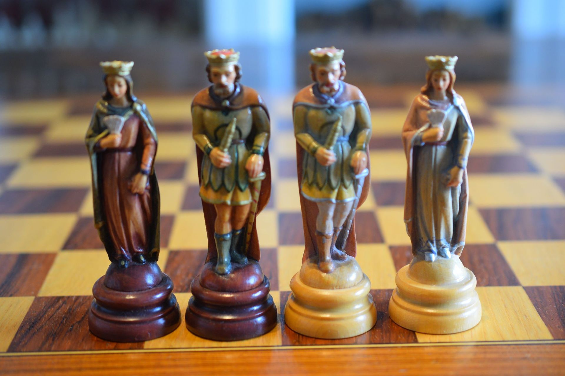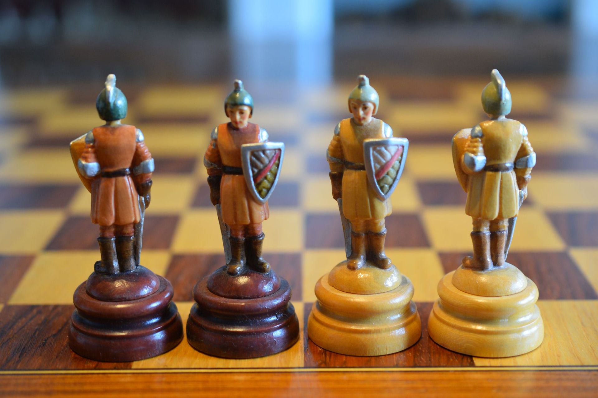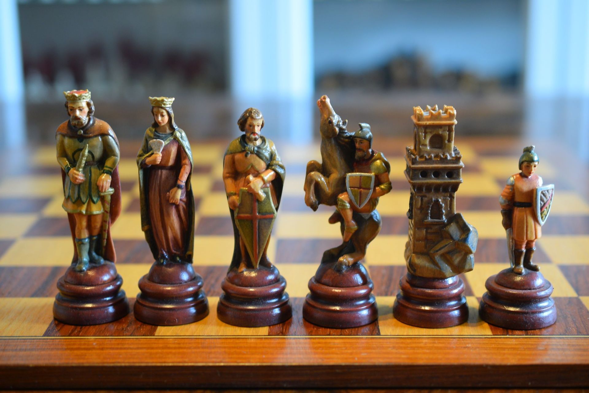 A figural chess set made in Grödnertal / Val Gardena, South Tyrol, Italy some time in the second half of the 20th century. The pieces with a king size of 10.5 cm, which came in a compartmented carton box, are carved from wood and finished with a polychrome paint. Black and white pieces are of the same design, but the black side is painted with slightly darker colours and with dark brown bases, while the white side has lighter colours and light brown bases. I am not entirely sure, which wood was used for the set, but the most common wood types used by Val Gardena carvers are maple, lime or stone pine. The pieces are depicted as a medieval court. The kings with crown, wearing a long robe and holding a sceptre. The queens with a coronet, wearing a gown and holding a fan. The bishops as courtiers with a large shield in front of them and holding a parchment (which indicates their connection to the German chess tradition in which the bishop is called "Läufer", which in this case means messenger). The knights as riders with helmet and a small shield on rearing horses. The rooks as towers erected on a rock. The pawns as foot soldiers with helmets, small shields and a sword.