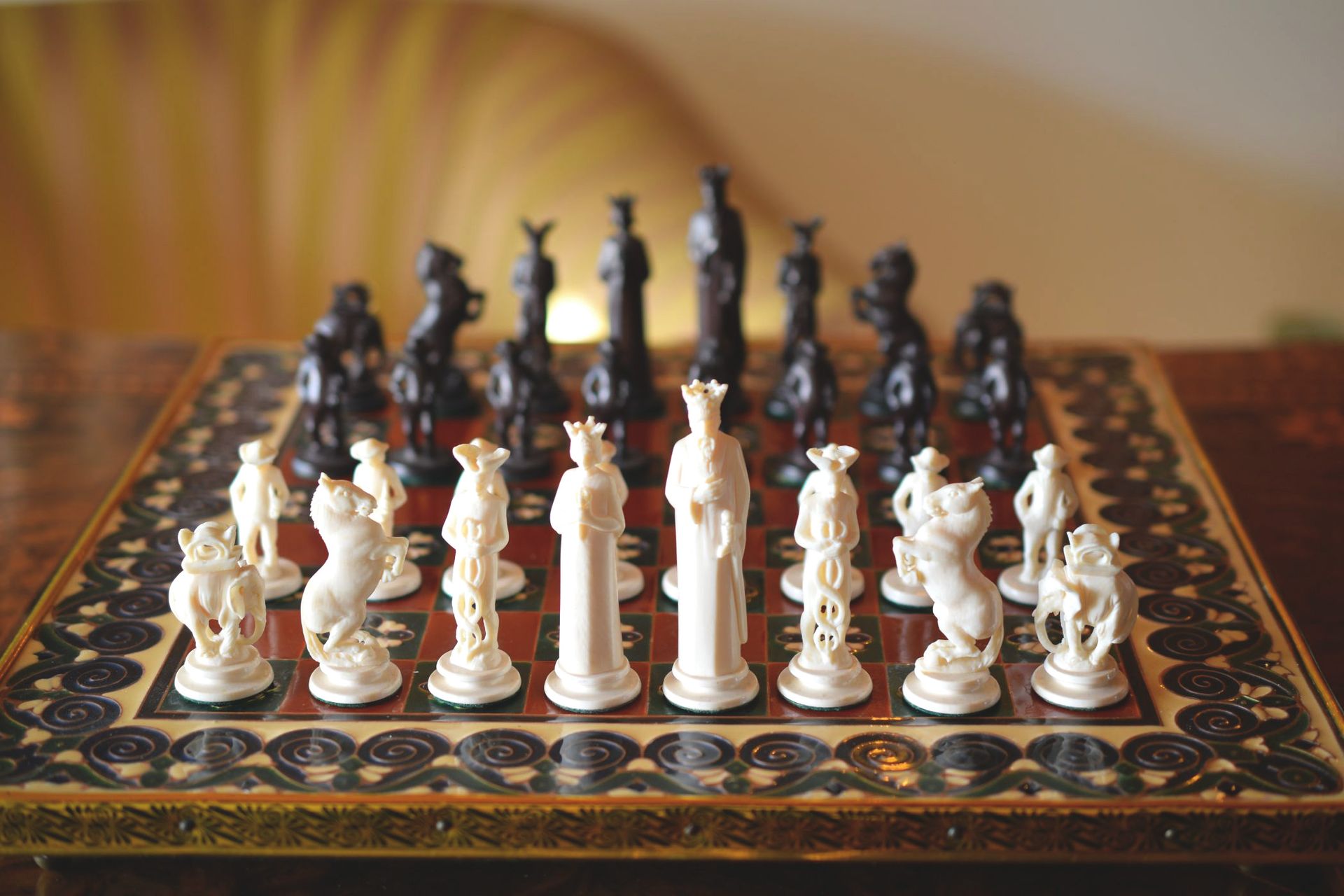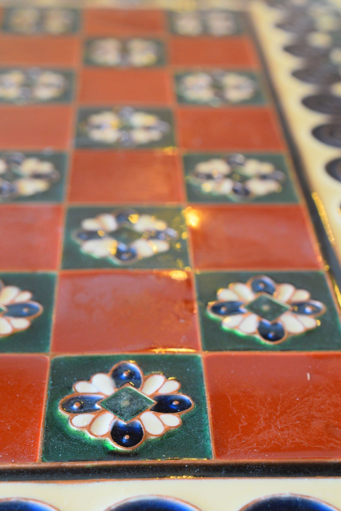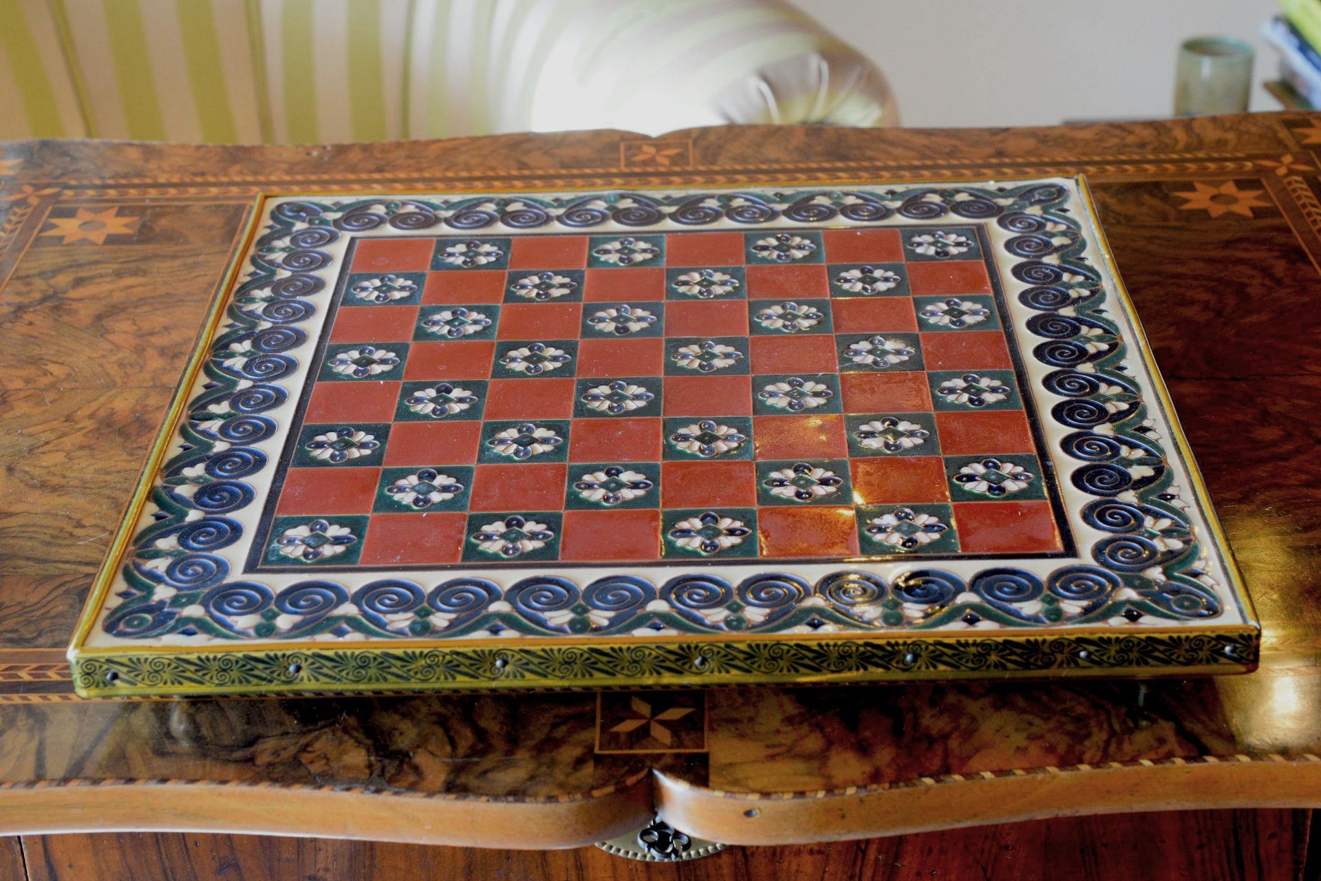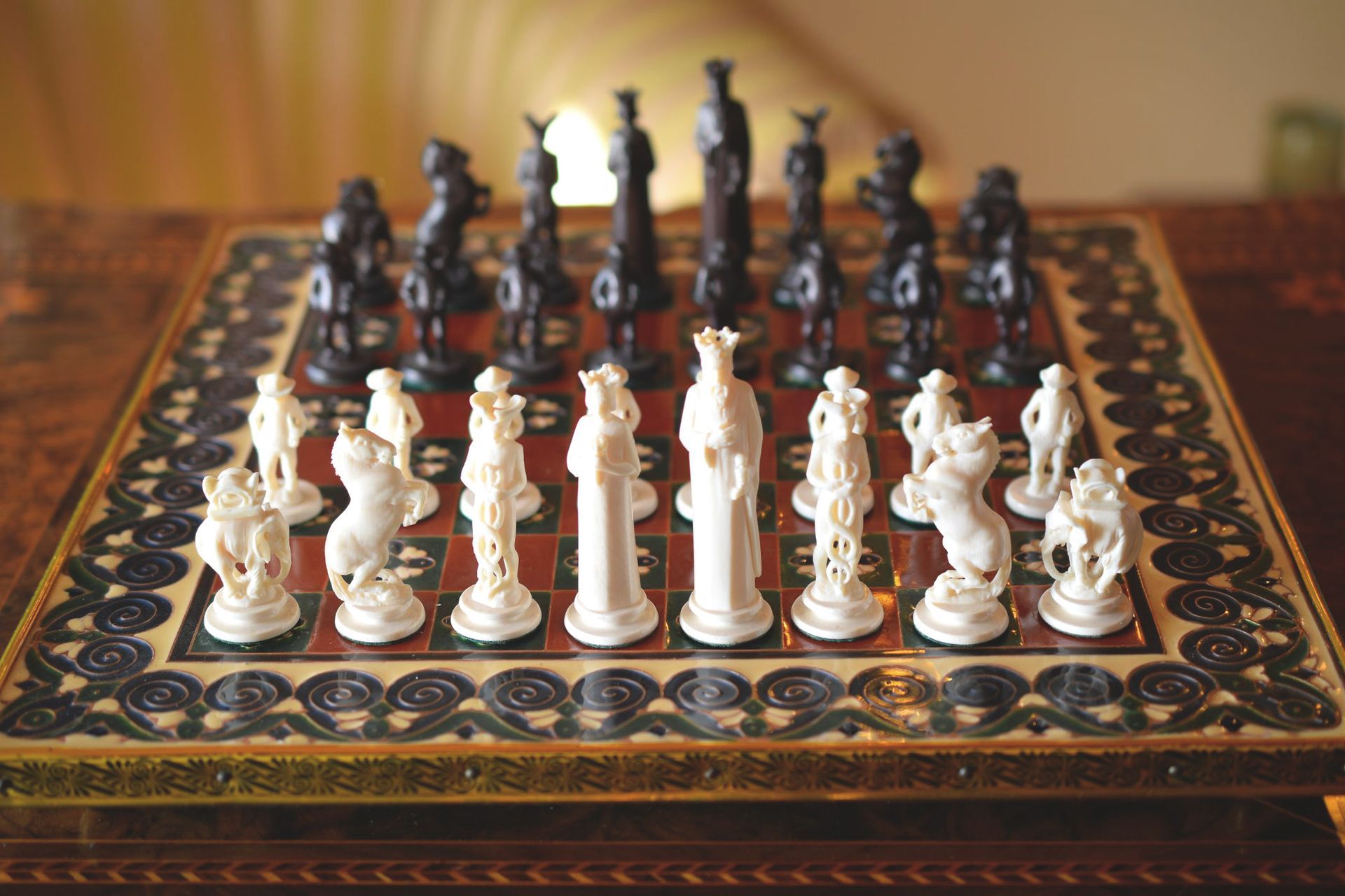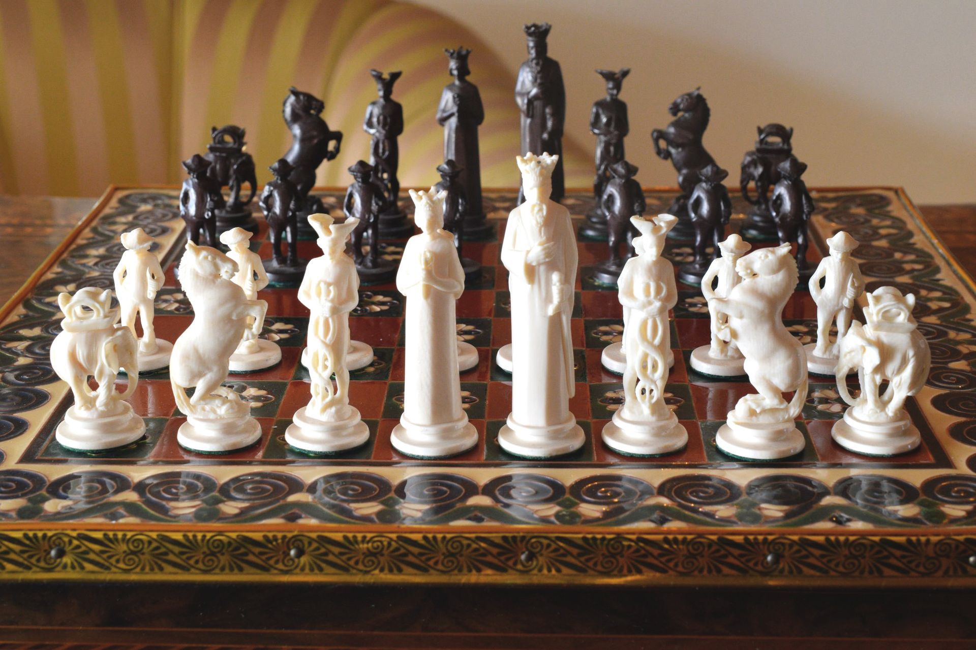 The style of the ornaments on the board is reminding of Art Nouveau or Art Déco decorations, which may indicate that the board was created around the turn of the century. For the photoshoot I paired the board with a figural ivory chess set from approximately the same period, which was made in Erbach. More pictures of the chess set can be found
