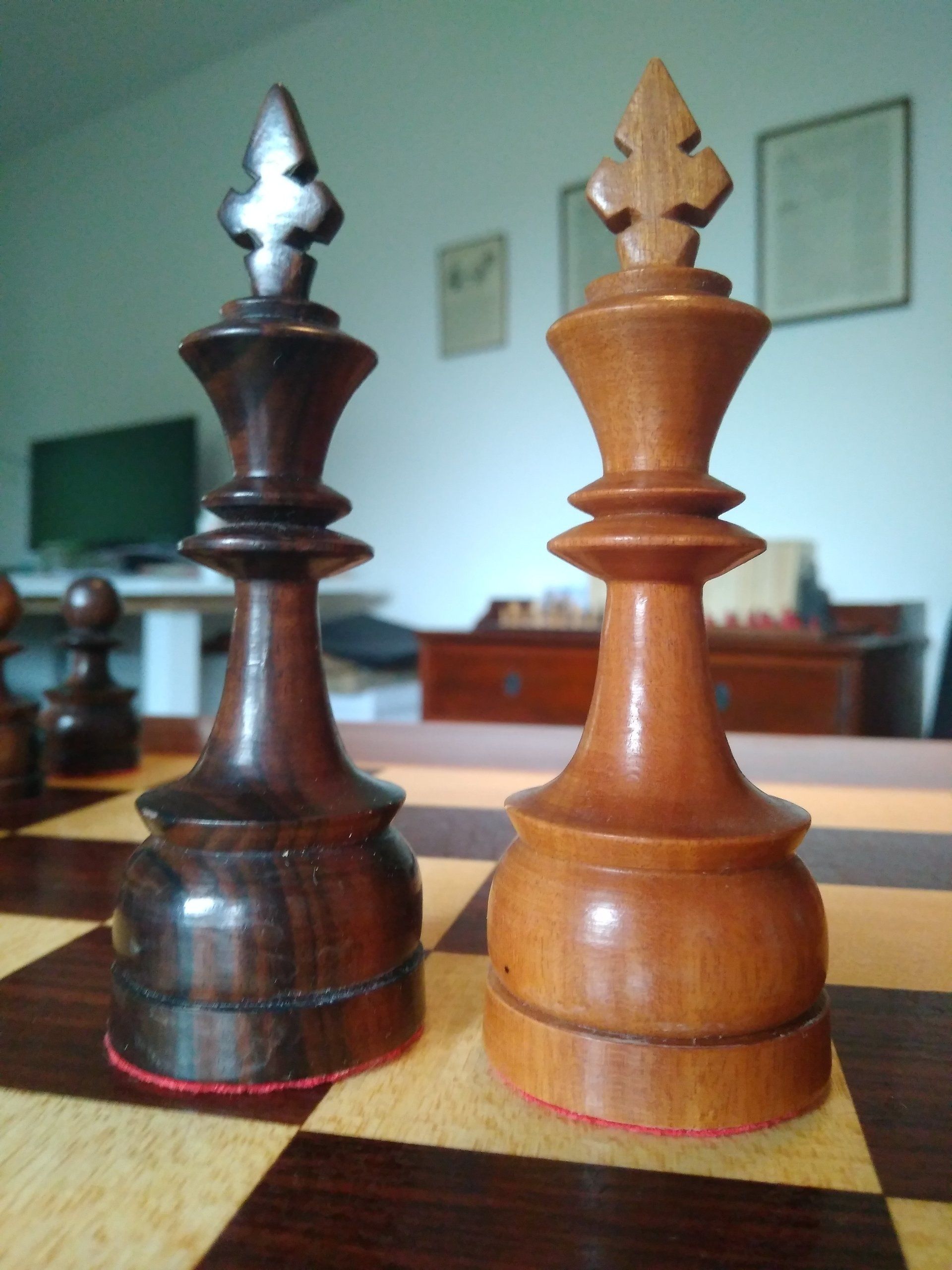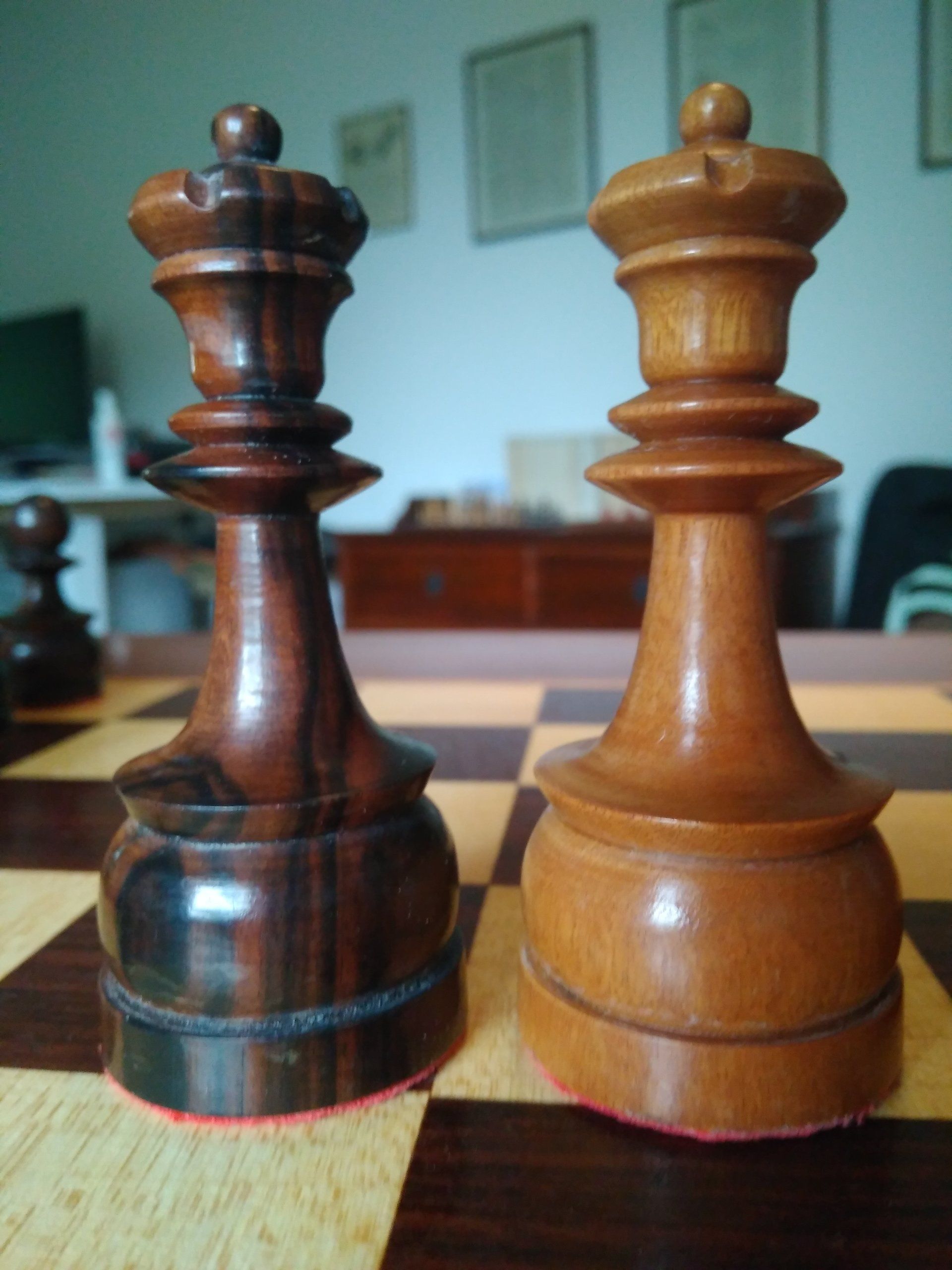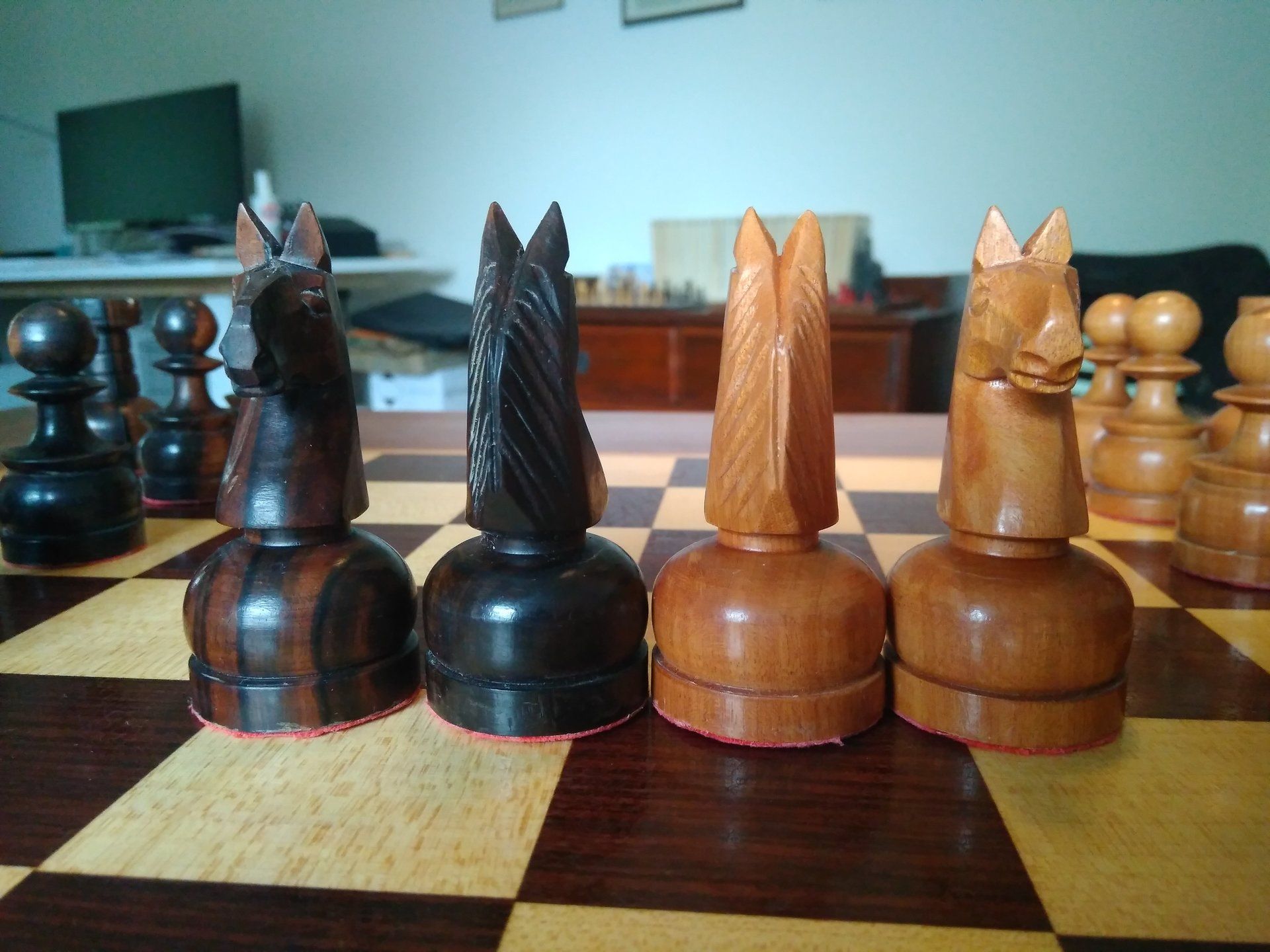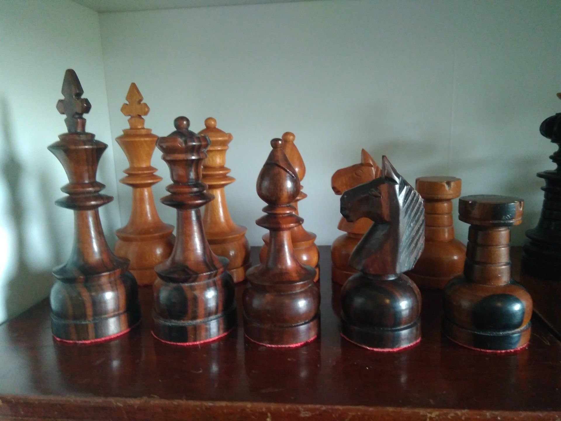 One of my Philippine Staunton Club Size sets with a particularly lively wood grain. The King size is 4.5". The set shows all characteristics typical for the Philippine Staunton pattern: