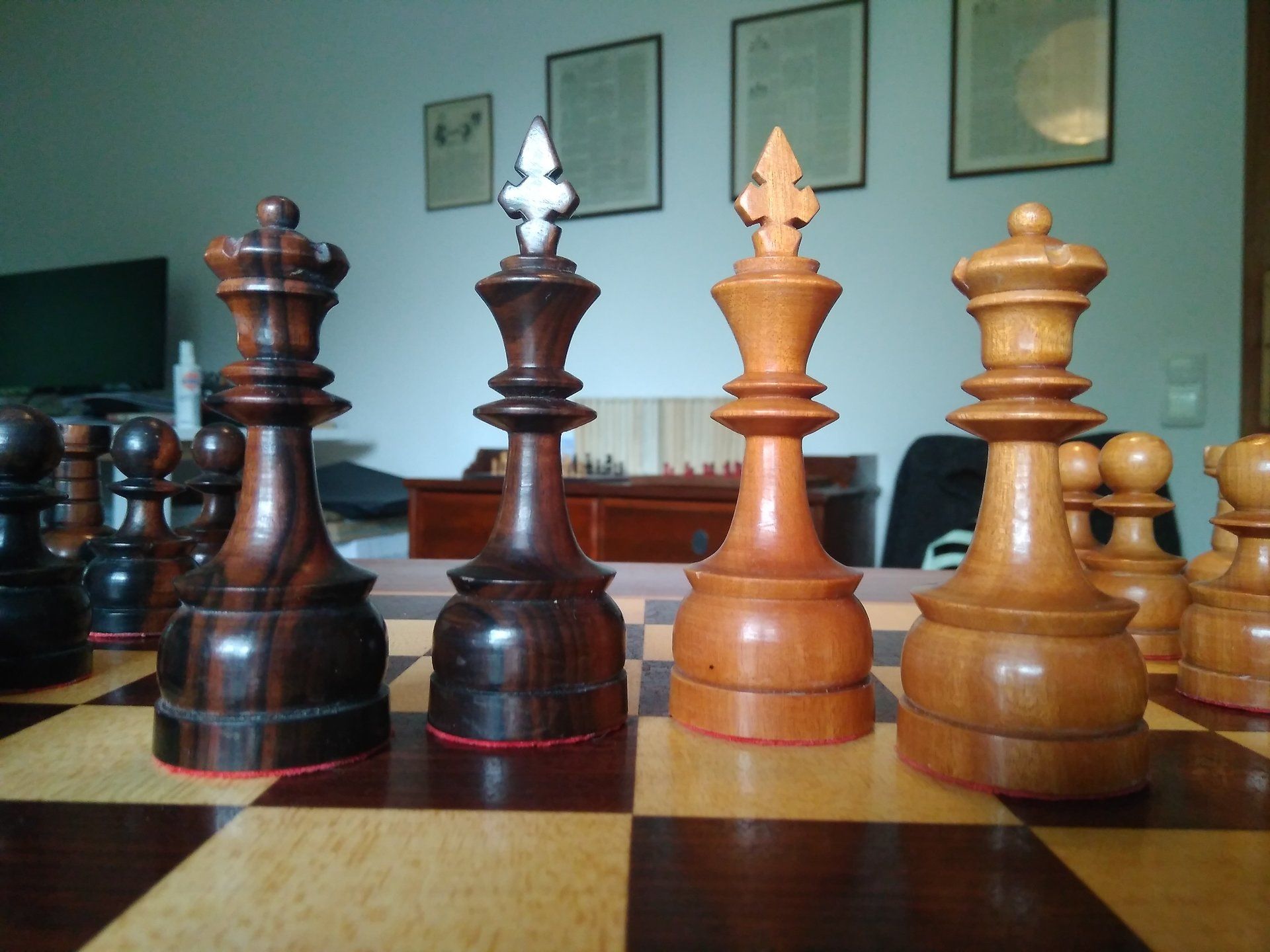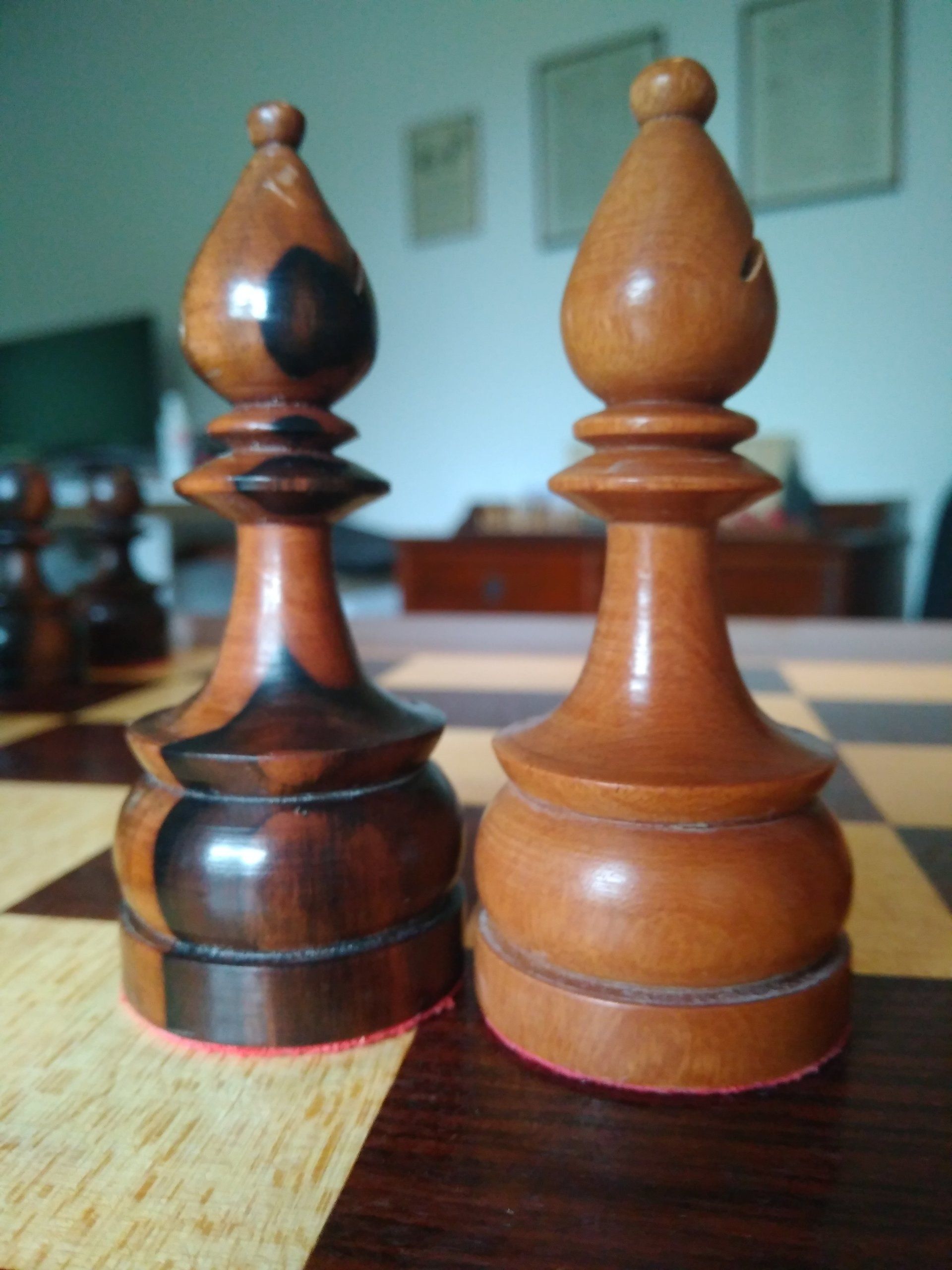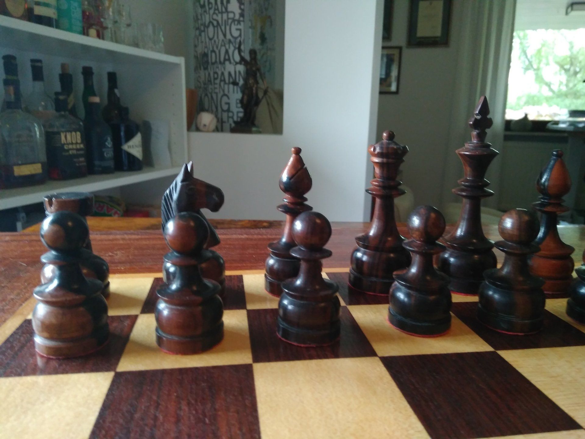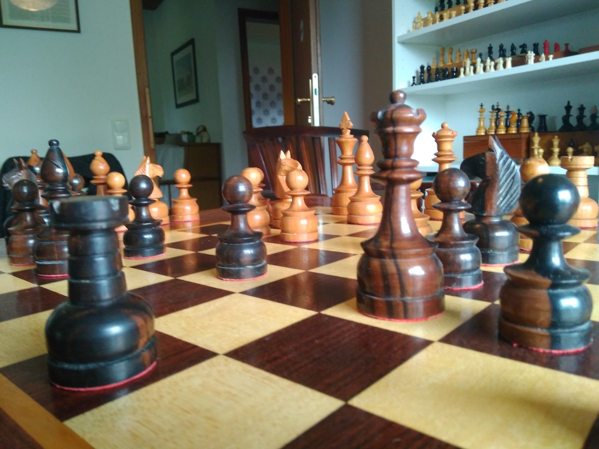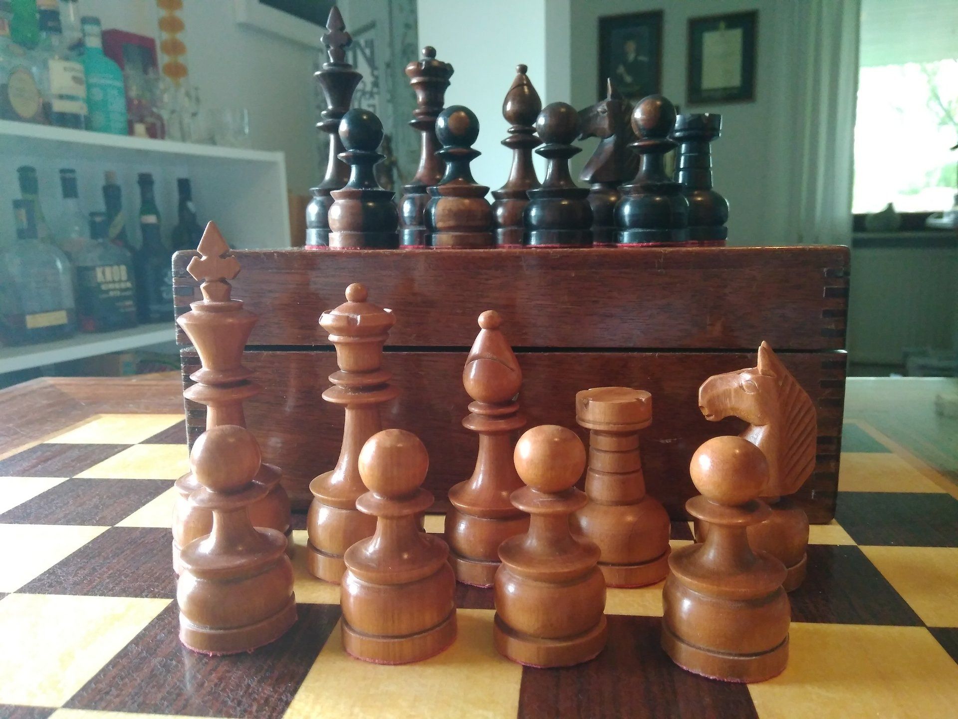 One of my Philippine Staunton Club Size sets with a particularly lively wood grain. The King size is 4.5". The set shows all characteristics typical for the Philippine Staunton pattern: