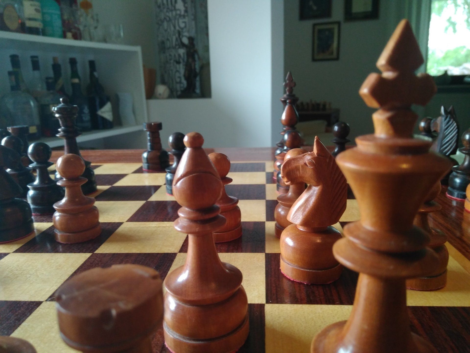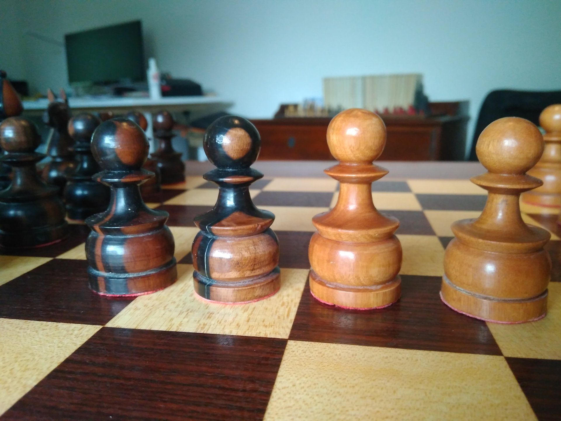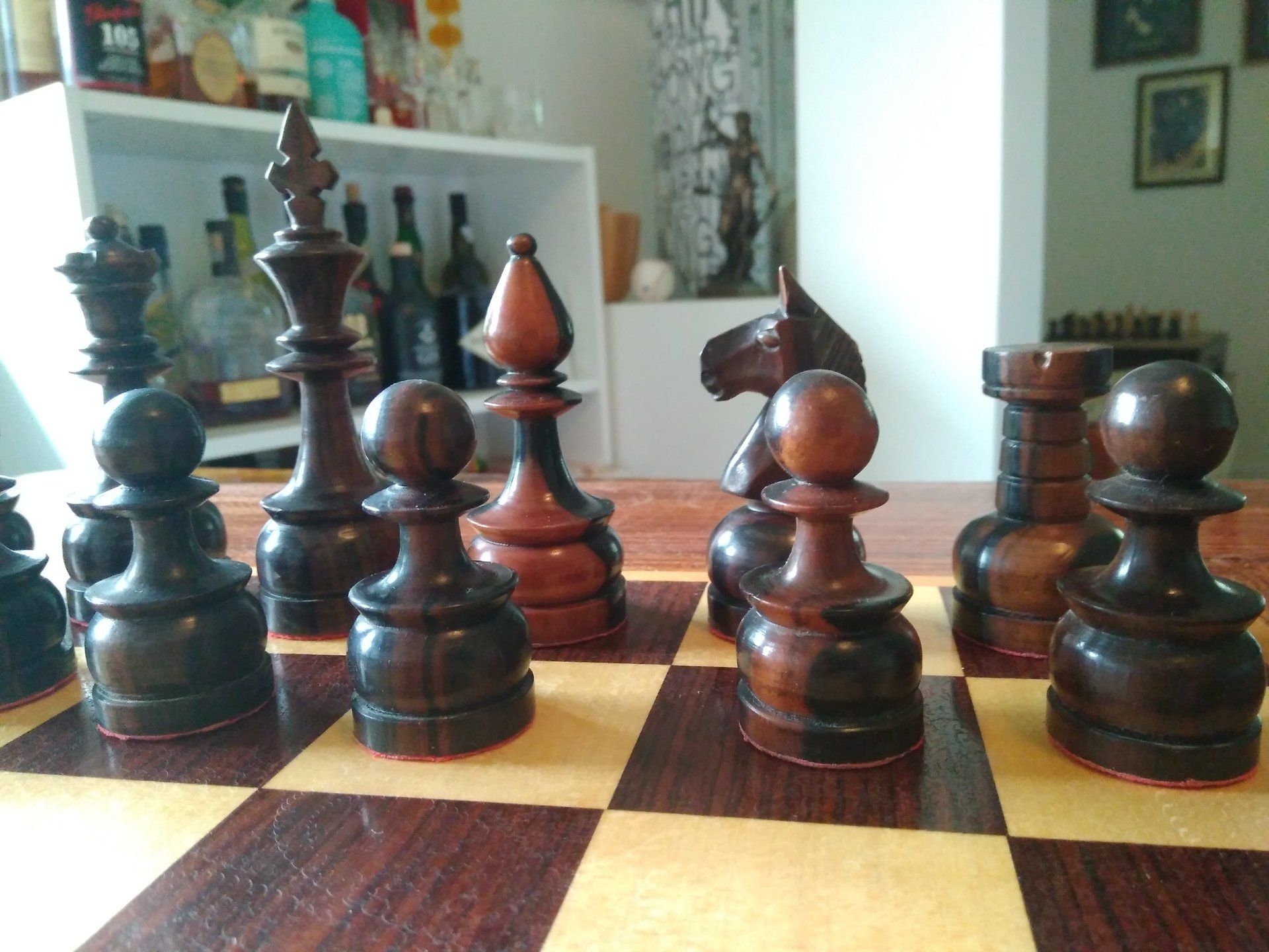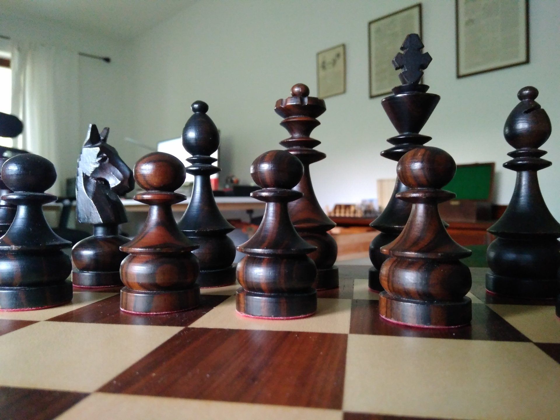 One of my Philippine Staunton Club Size sets with a particularly lively wood grain. The King size is 4.5". The set shows all characteristics typical for the Philippine Staunton pattern: