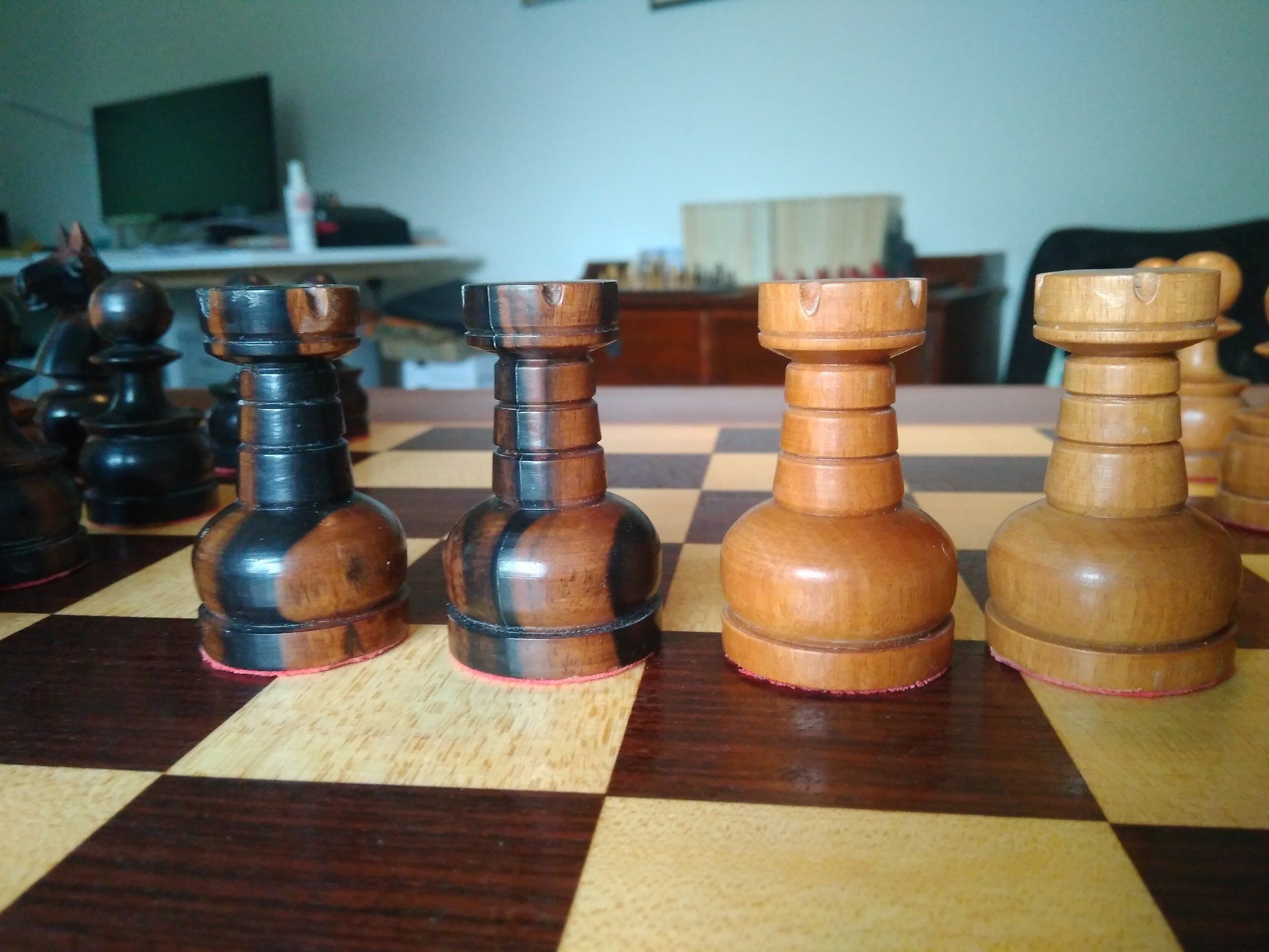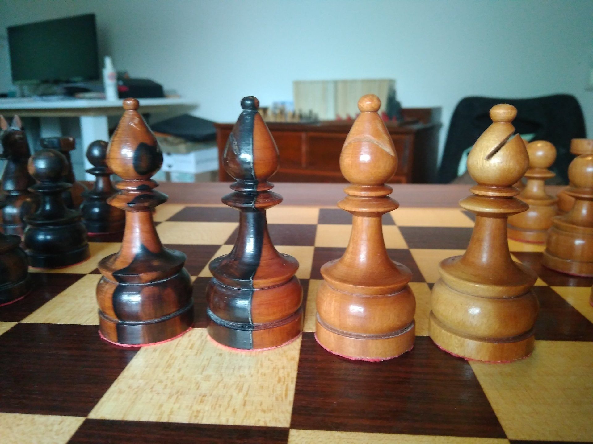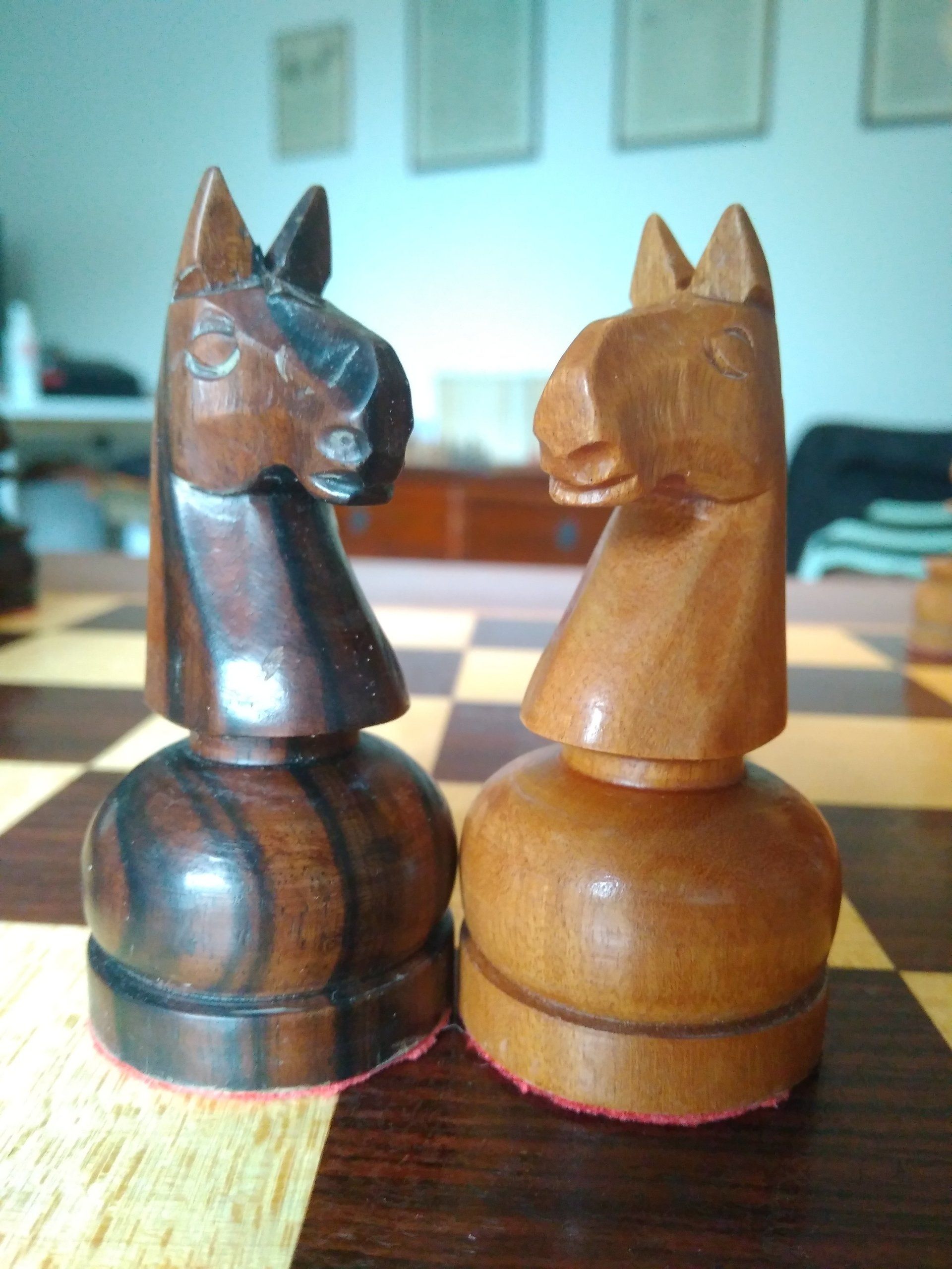 Unlike my other Philippine Staunton sets, this one is most likely a pre-WWII version. According to the seller, the set was made in the 1940's. There are two characteristics, which support this assumption. The Rooks have straight bases compared to the post-WWII design, which usually had curved bases. The Knights are more elaborately carved than later versions, which can be seen when comparing this set to my later sets, e.g.