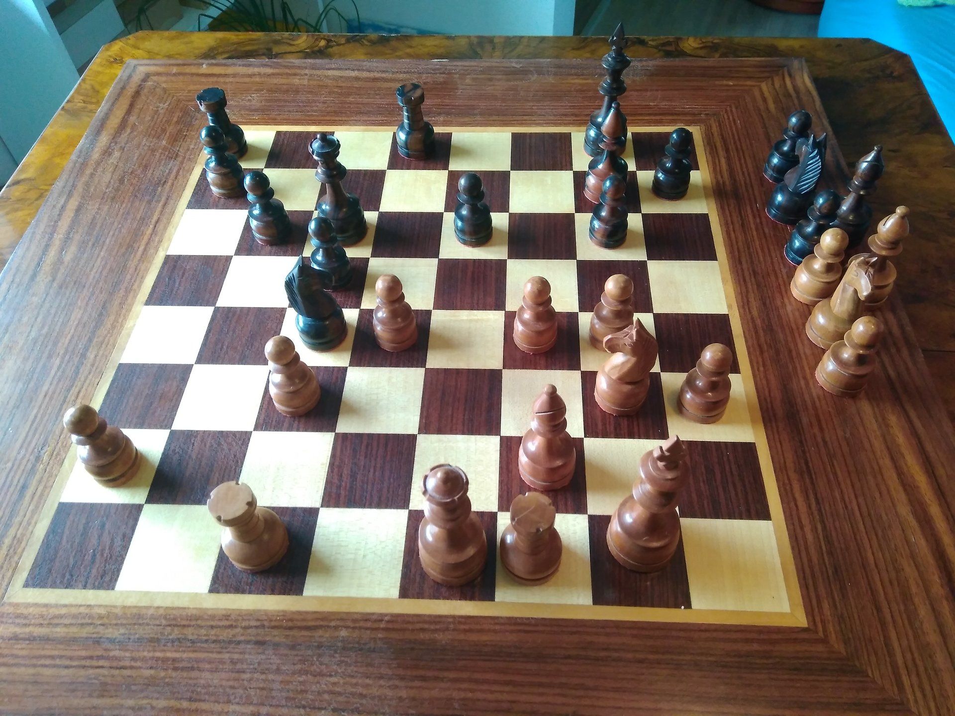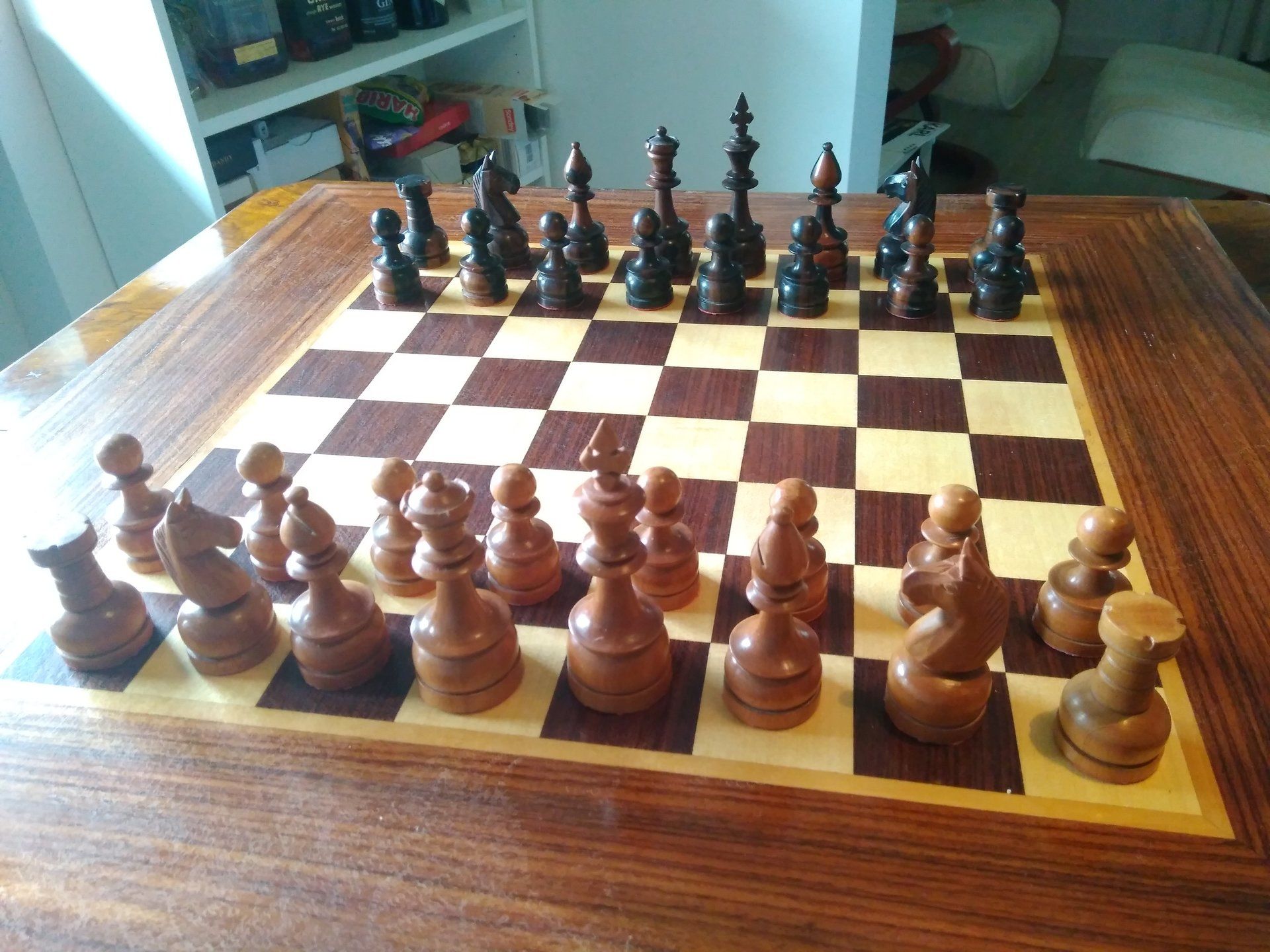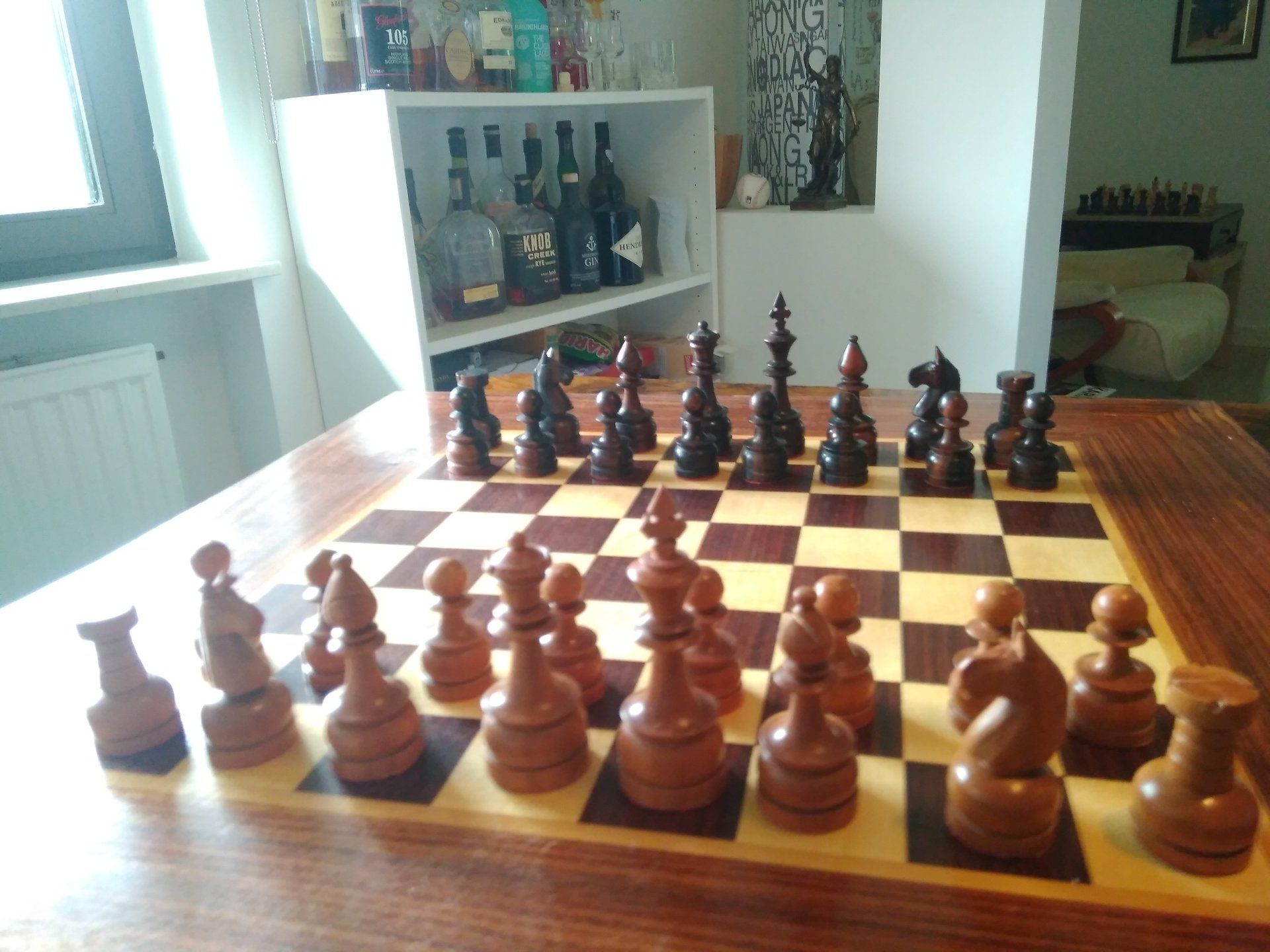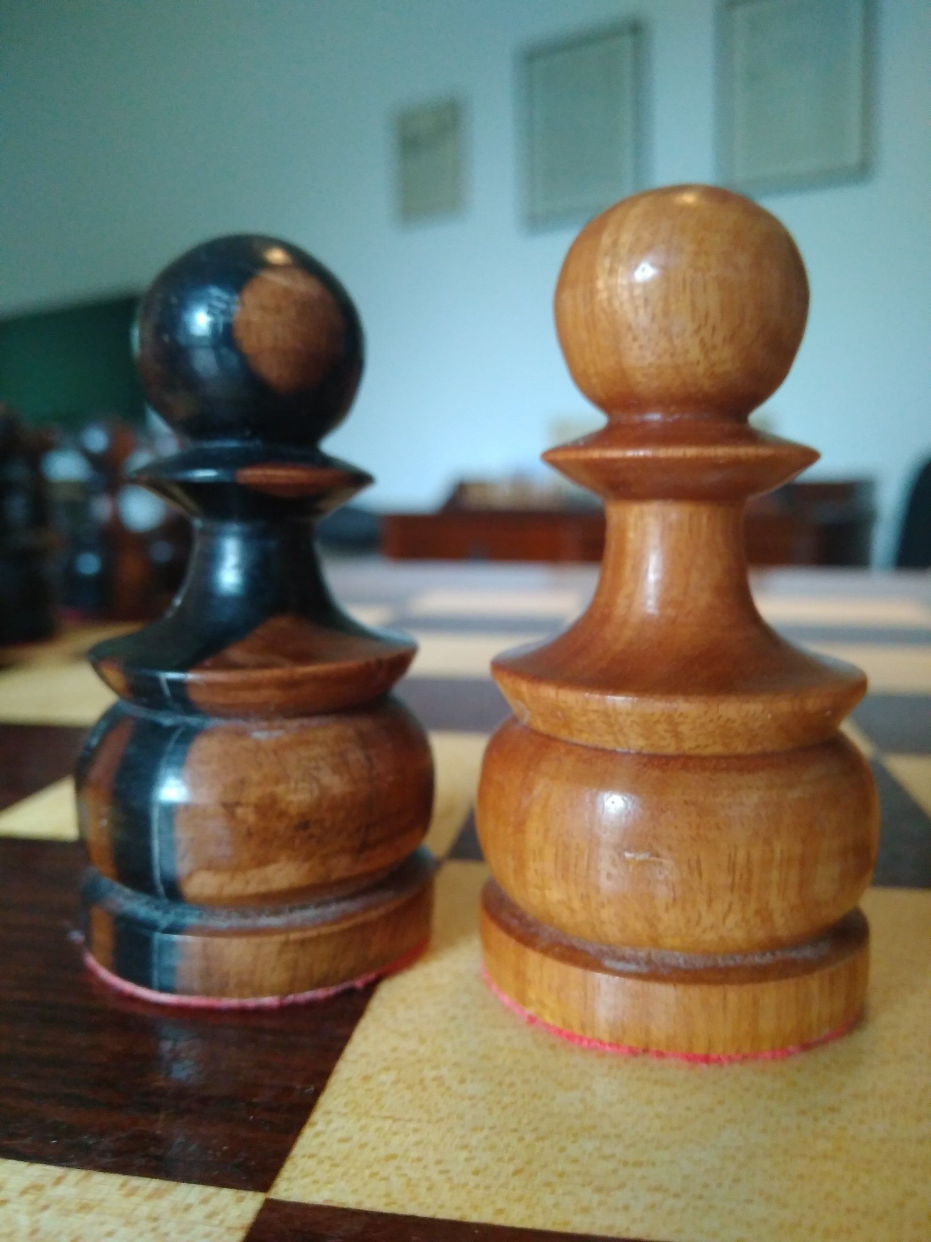 Unlike my other Philippine Staunton sets, this one is most likely a pre-WWII version. According to the seller, the set was made in the 1940's. There are two characteristics, which support this assumption. The Rooks have straight bases compared to the post-WWII design, which usually had curved bases. The Knights are more elaborately carved than later versions, which can be seen when comparing this set to my later sets, e.g.
