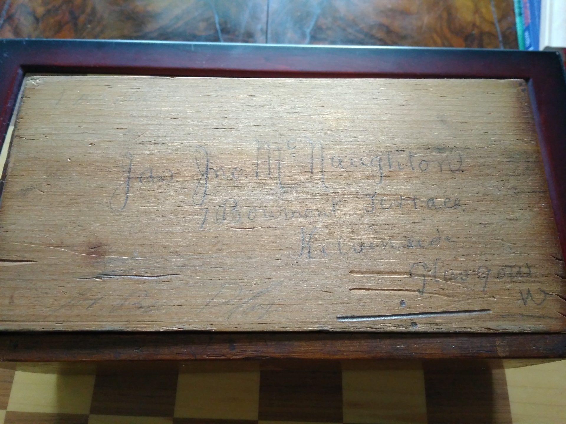 The set is not as delicate as the Jaques "Northern Upright" Ivory Chess Set in my collection and for sure not of the same quality material. Nevertheless, it comes with a different sort of history. The box, in which I acquired it, is inscribed on the inside of the lid with a name and address, i.e. "Jas. Jno. McNaughton, 7 Bowmont Terrace, Kelvinside, Glasgow". "Jas" is the common abbreviation for James, "Jno" is the abbreviation for John. I did some research and found out that indeed someone with the name James John McNaughton resided under this address from 1902 to 1907. He was a consulting and mining engineer with offices in 52 St. Enoch Square, Glasgow. There is still an engineering consultant company, MHB Consultants Ltd., registered under this address today, but unfortunately the letter "M" in their name does not go back to the mysterious Mr McNaughton.