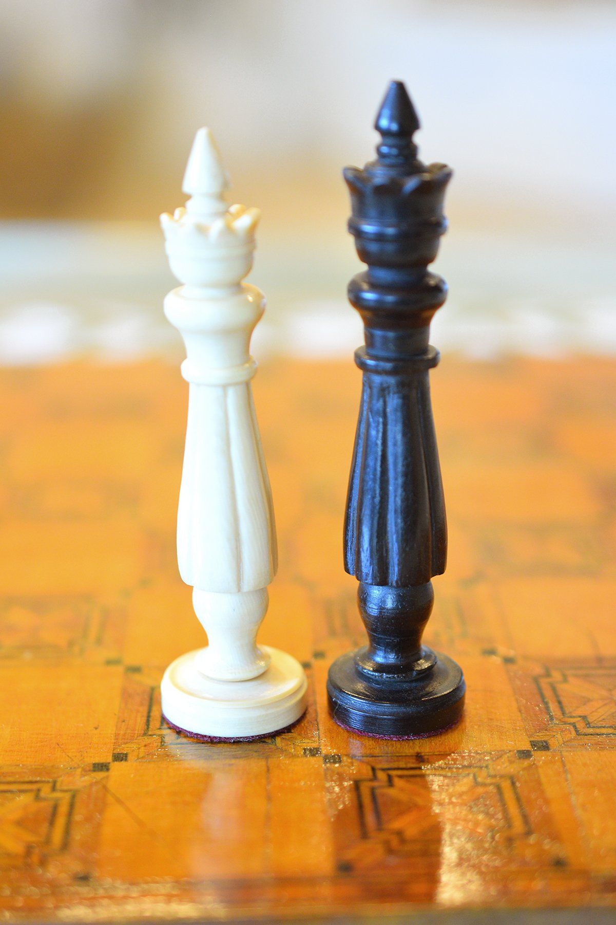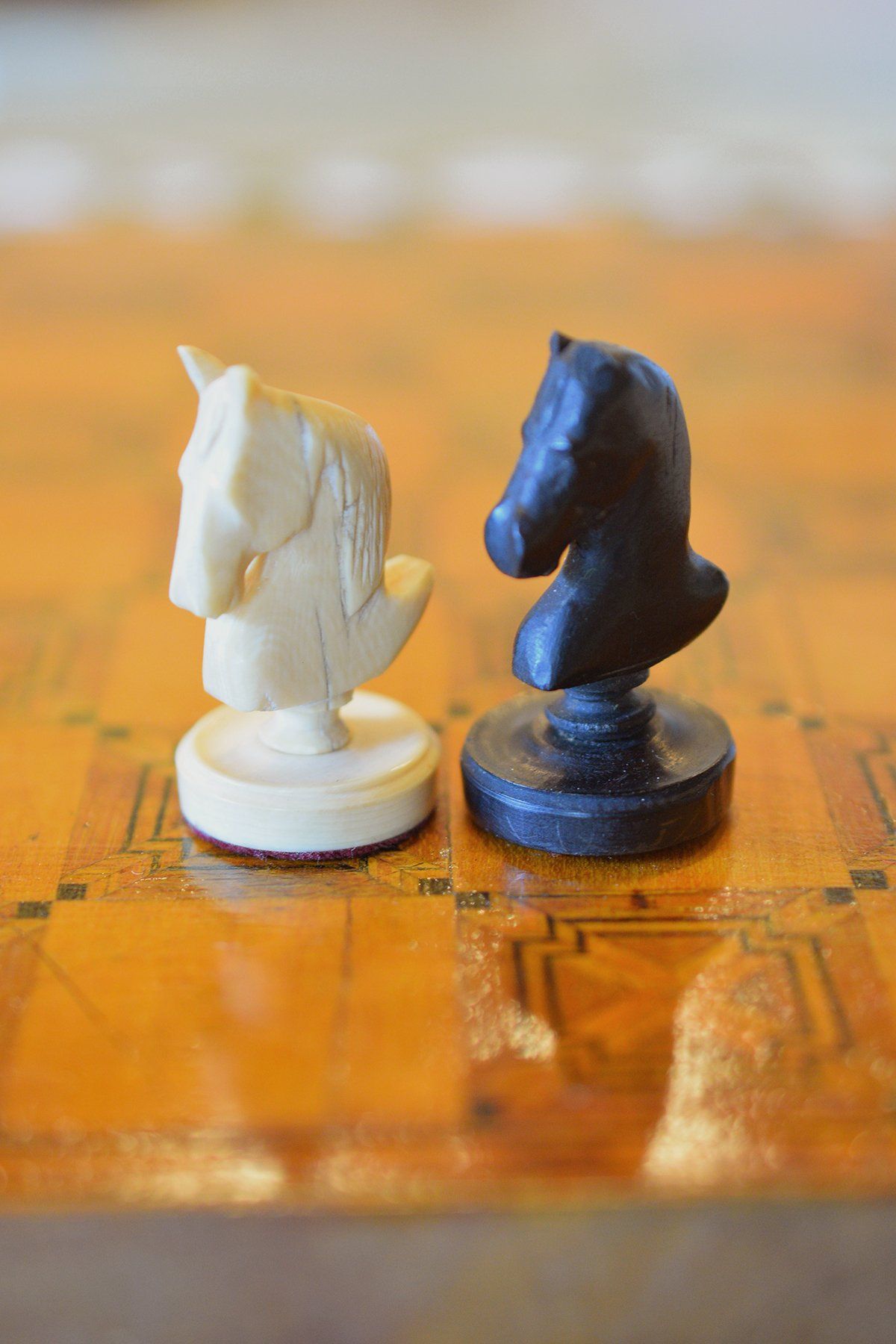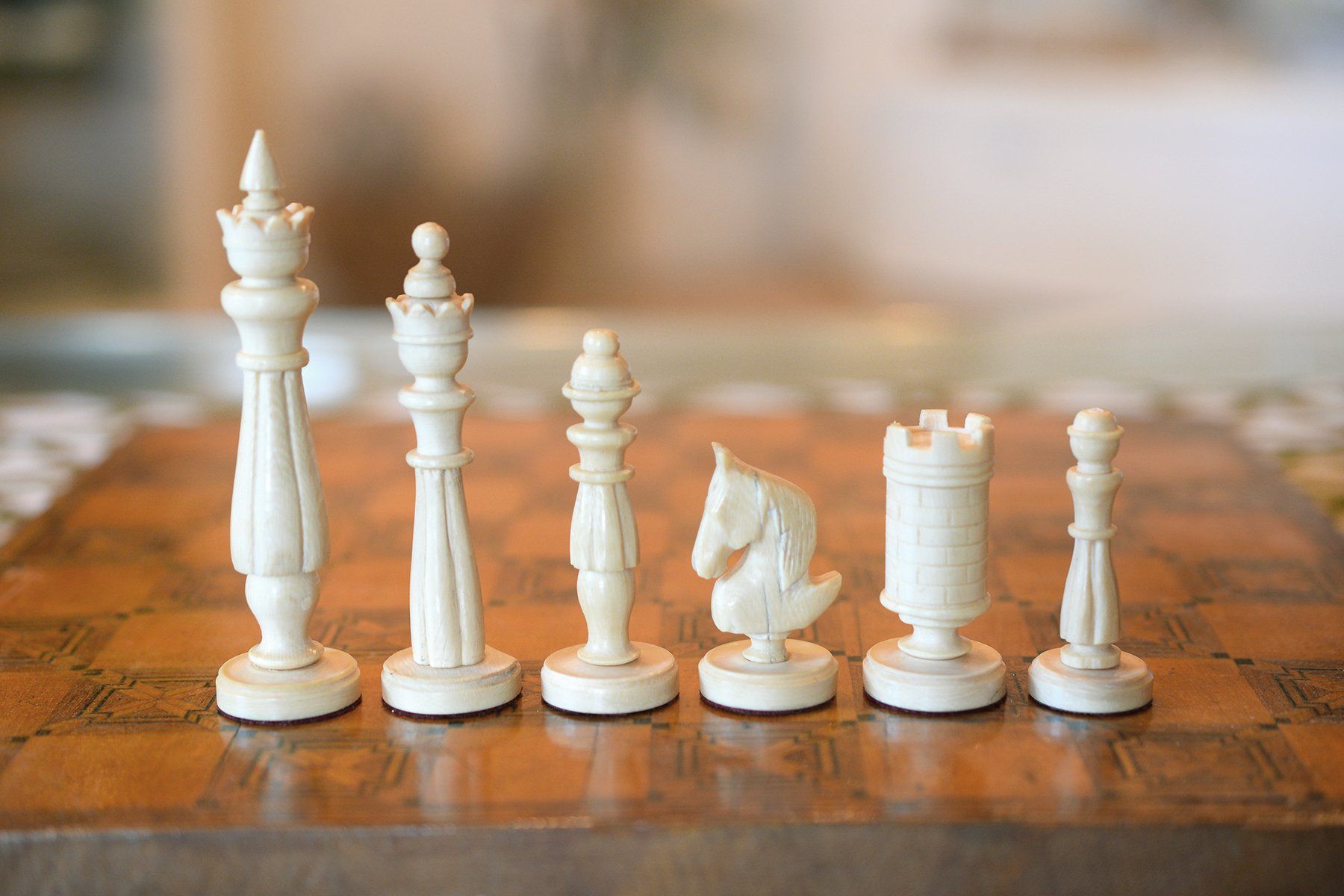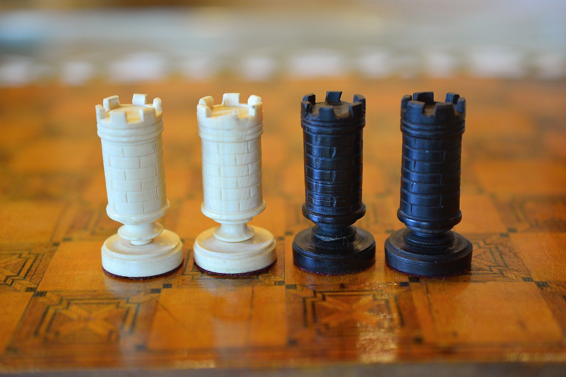 A small and unusual chess set with a king size of ca. 10 cm (there is a slight height difference between the kings, as the white king is only 9.55 cm in size). I do not know anything in particular about the set, but I assume it was made in Germany in the first half of the 20th century. The material is ivory, possibly mammoth. The kings, queens, bishops and pawns are of slender, upright shape with column like bodies. Kings and queens with crowns, the bishops with a round hat with a small ball finial. In comparison to the rest of the pieces, the knights are of relatively small size as carved horse heads. The rooks as raised towers on pedestals and with brickwork pattern and six crenellations.