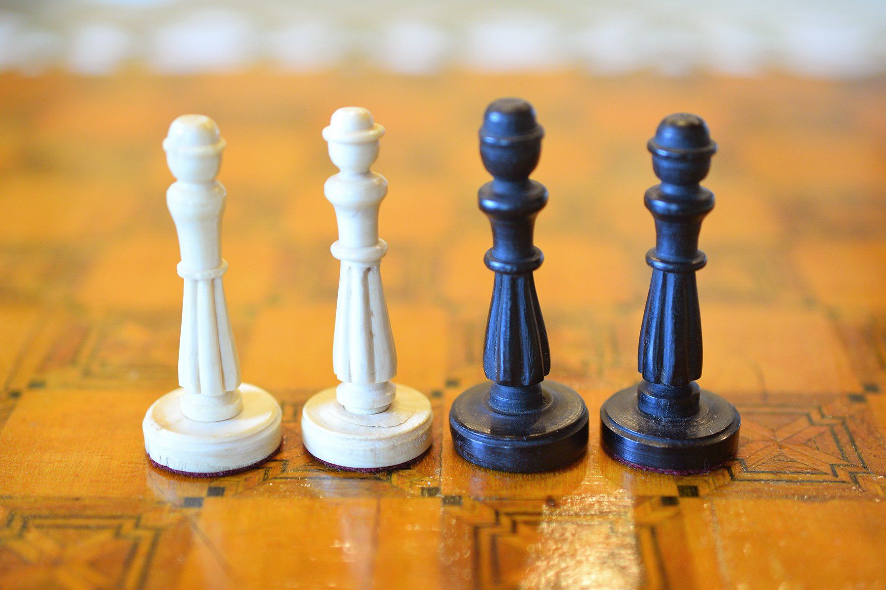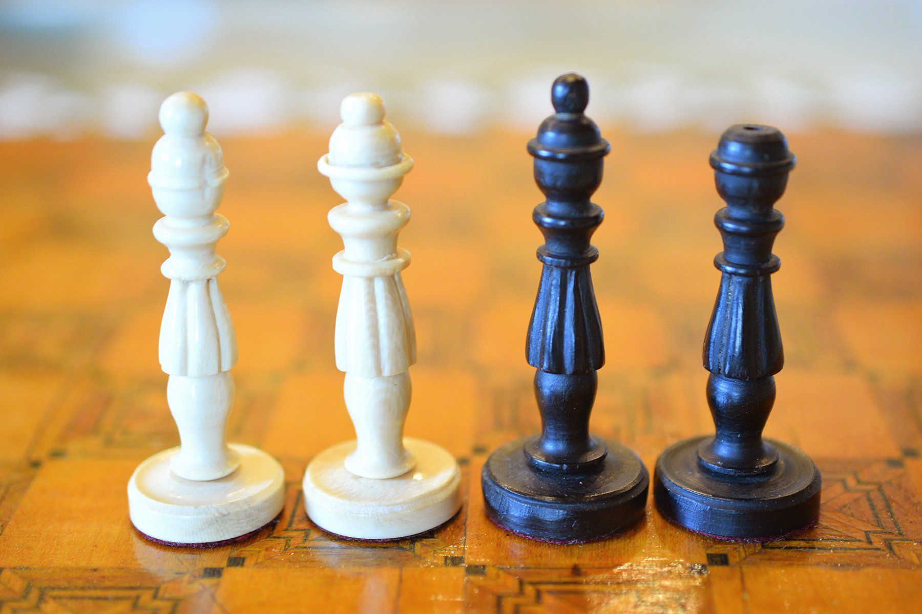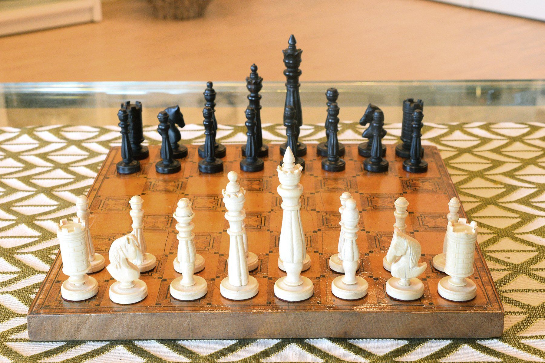 A small and unusual chess set with a king size of ca. 10 cm (there is a slight height difference between the kings, as the white king is only 9.55 cm in size). I do not know anything in particular about the set, but I assume it was made in Germany in the first half of the 20th century. The material is ivory, possibly mammoth. The kings, queens, bishops and pawns are of slender, upright shape with column like bodies. Kings and queens with crowns, the bishops with a round hat with a small ball finial. In comparison to the rest of the pieces, the knights are of relatively small size as carved horse heads. The rooks as raised towers on pedestals and with brickwork pattern and six crenellations.