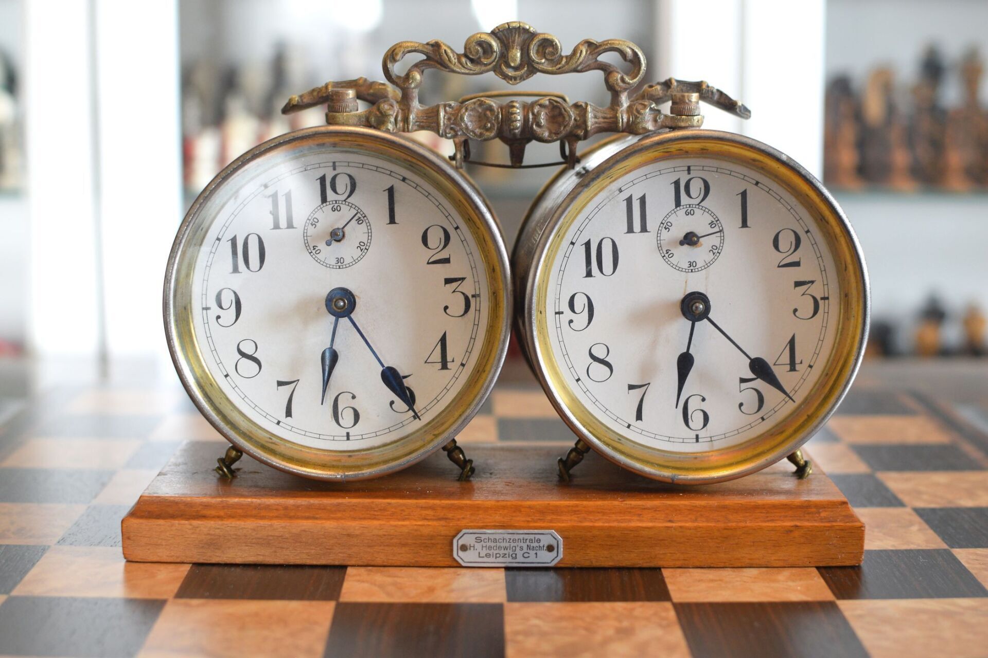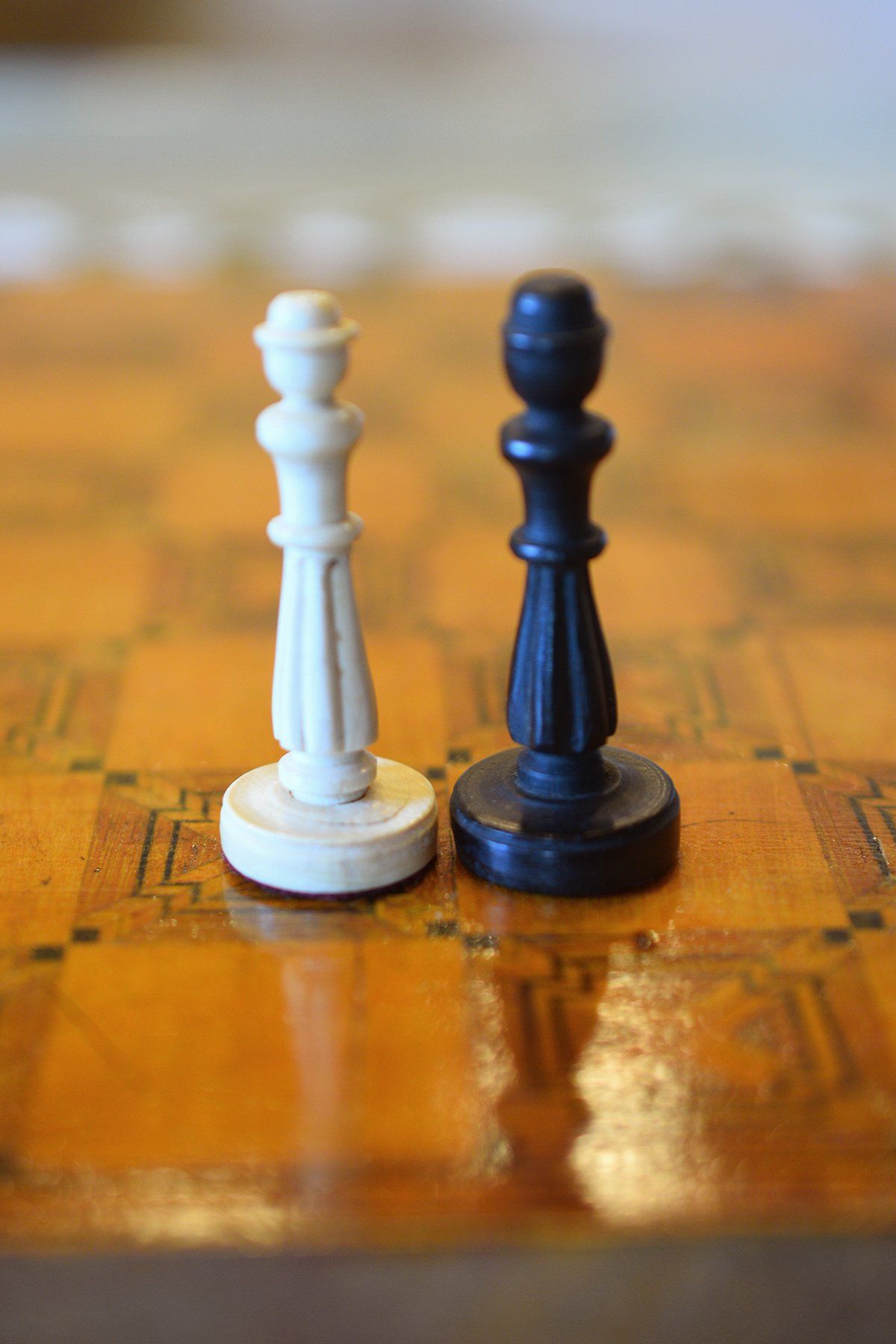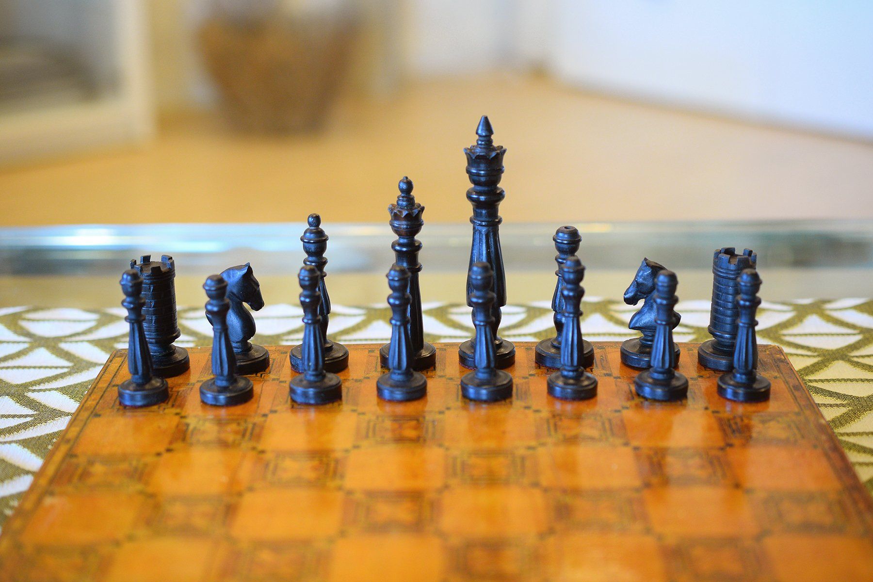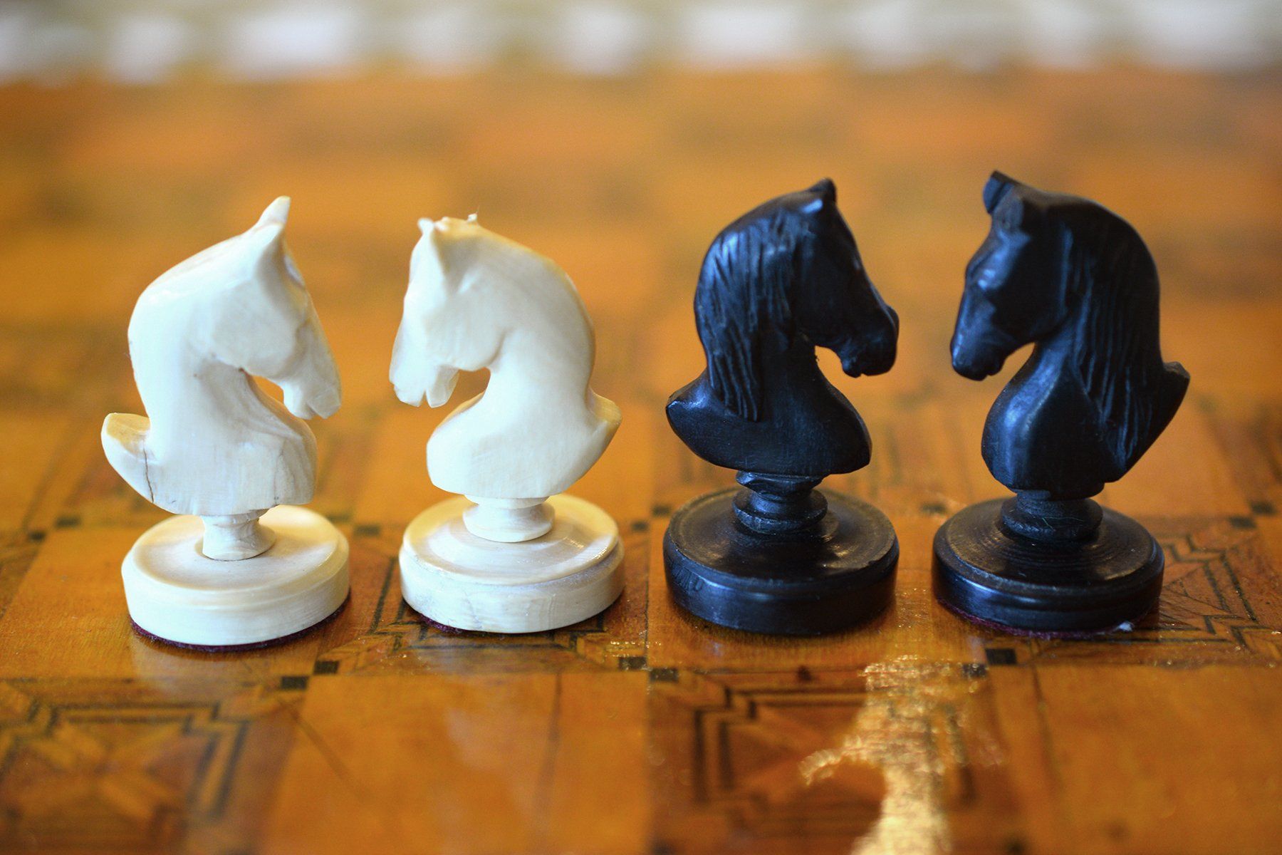 A small and unusual chess set with a king size of ca. 10 cm (there is a slight height difference between the kings, as the white king is only 9.55 cm in size). I do not know anything in particular about the set, but I assume it was made in Germany in the first half of the 20th century. The material is ivory, possibly mammoth. The kings, queens, bishops and pawns are of slender, upright shape with column like bodies. Kings and queens with crowns, the bishops with a round hat with a small ball finial. In comparison to the rest of the pieces, the knights are of relatively small size as carved horse heads. The rooks as raised towers on pedestals and with brickwork pattern and six crenellations.