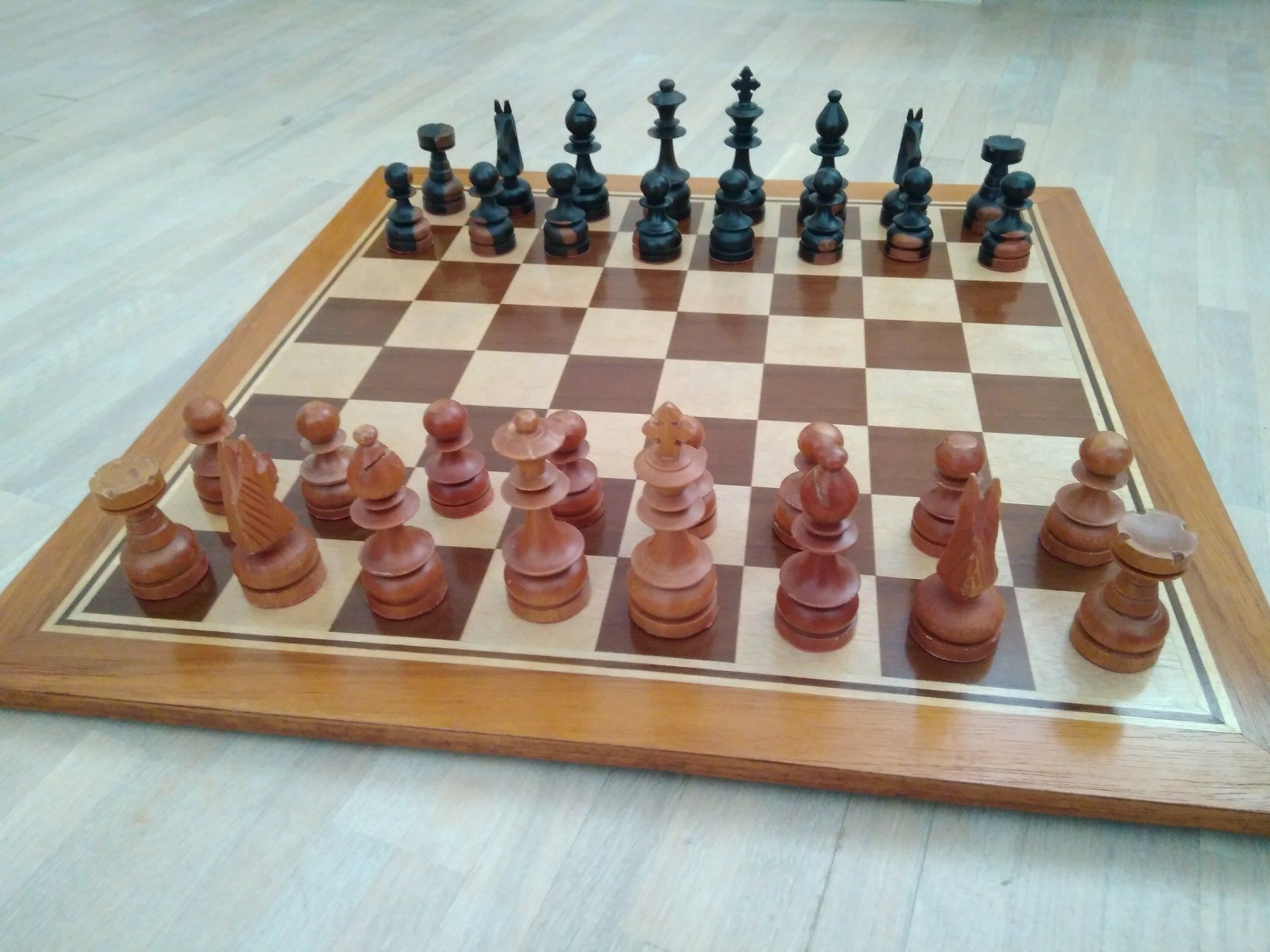 Small Philippine Staunton playing set, King size 82mm. One side made of Kamagong wood, the other side made of Narra wood, see also Philippine Staunton pattern, Club Set (4.5"), 1940-1950. The set was sold to me as a German set, which I assume was by mistake. German retailers like A.P.F. von Rolland were known to import and distribute a large quantity of sets inter alia from the Philippines in the 1960's and 1970's.