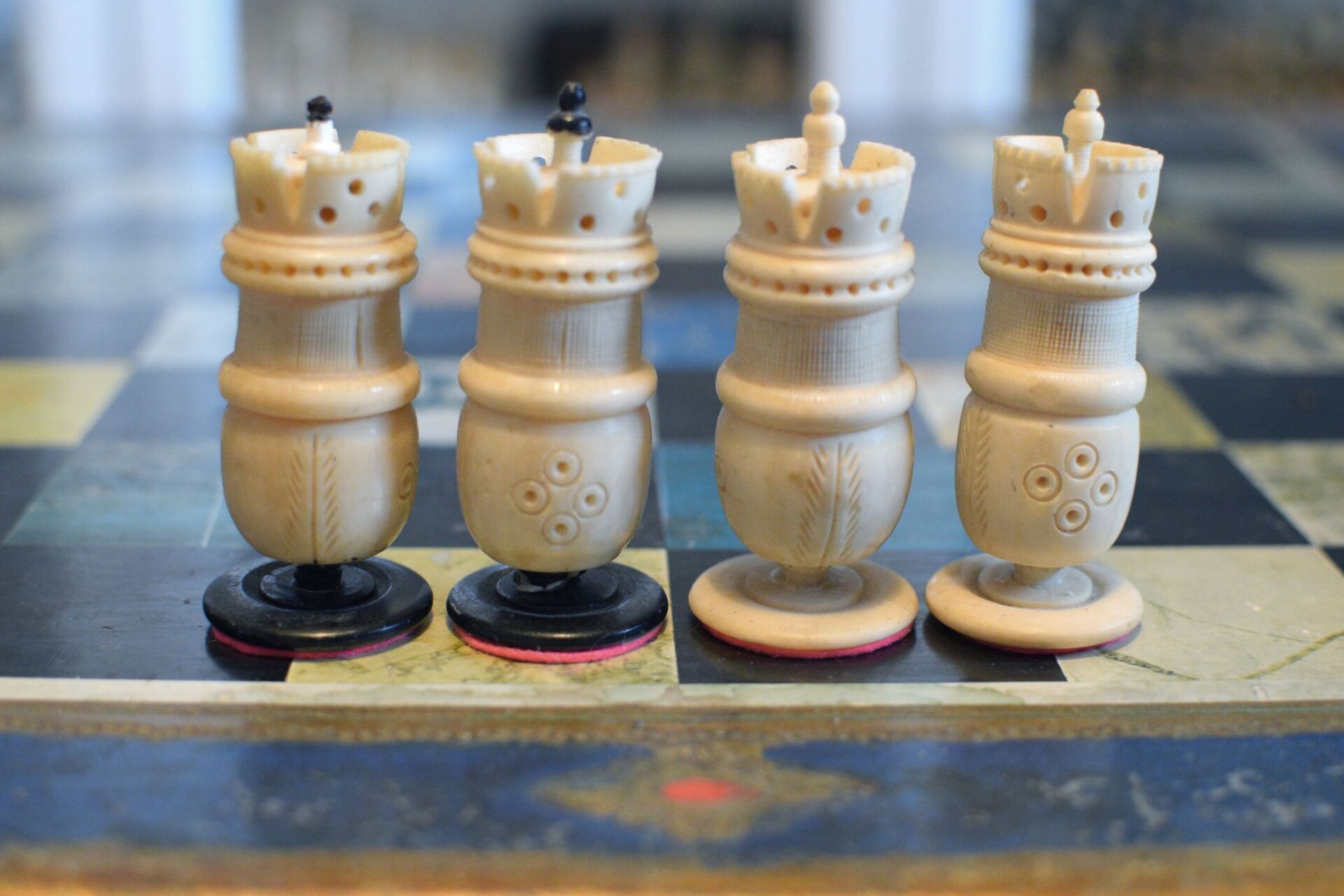 A rather unusual Mexican chess set made of bone. The set is figural in style and sometimes referred to as "Pulpit" style, due to the elongated shaped bodies consisting of pierced and serrated barrels on which the signifiers are based. They remind of the so called "Spanish Pulpit" chess pieces, hence the name, even though there is no evidence of any direct connection between the two.