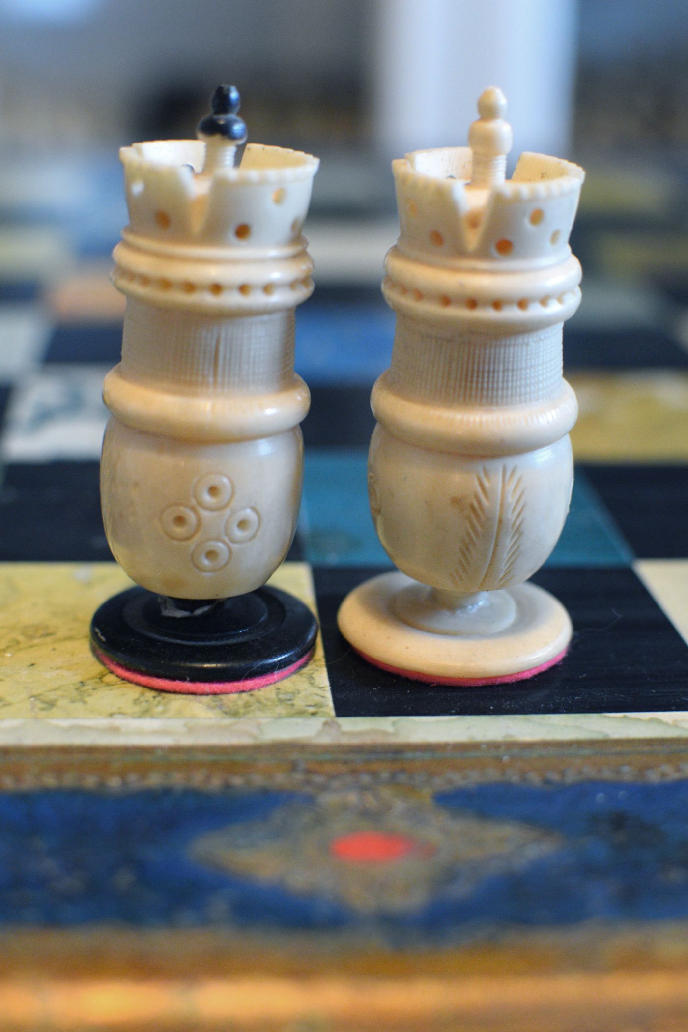 The white side and the left side are mainly distinguished by white and black hair and white and black round bases. Another very distinguishing feature, which makes the set rather special, are the colours of the pawns' coats, which are bright pink for the white pawns and light blue for the black pawns. Sets of similar style are often found with pawns in the form of a hand holding a dagger. More abstract forms of this set (i.e. without painted faces) were produced well into the 20th century, but Keats also shows a sets with painted faces and "dagger" pawns in his book "Chessmen for Collectors" on page 224, picture 270, which he dates to the 19th century. However, I personally think it is probably safer to date this to early 20th century. The version shown here with figural pawns in bright colours is rare nonetheless. I have only found one reference to a comparable set, which was sold in an auction by Freeman's in 2002.