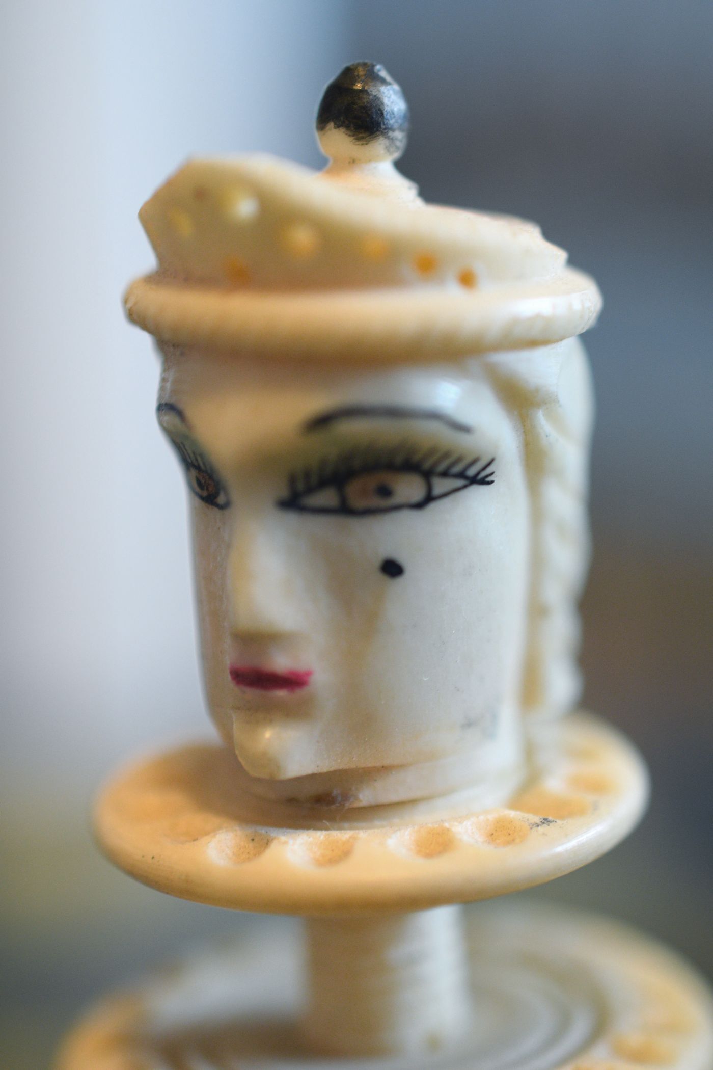 The kings, queens, bishops and pawns are shown with painted faces and very emphasized large eyes with painted brows and lashes and a blue eyeshadow. The kings with pointed beards and a round crown. The queens with a small black "mouche" on the left cheek. Mouches are small, black beauty patches, which were - mainly by fashion avid females - applied to the powdered face to emphasize the pale skin. They were extremely popular in 17th and 18th century French fashion.
