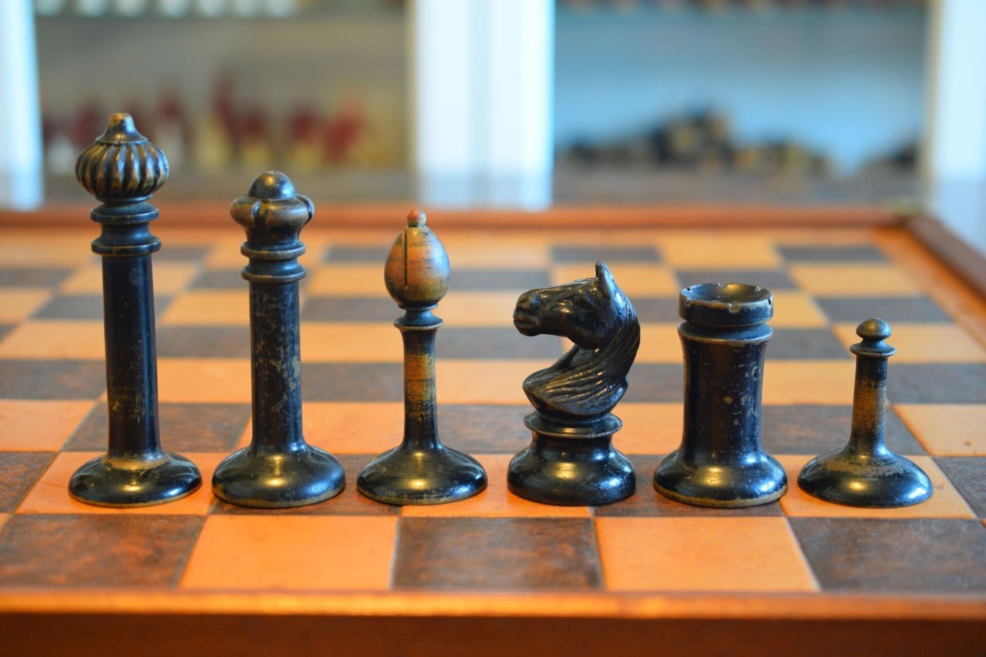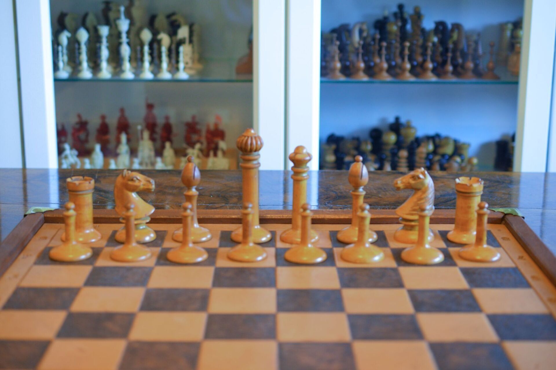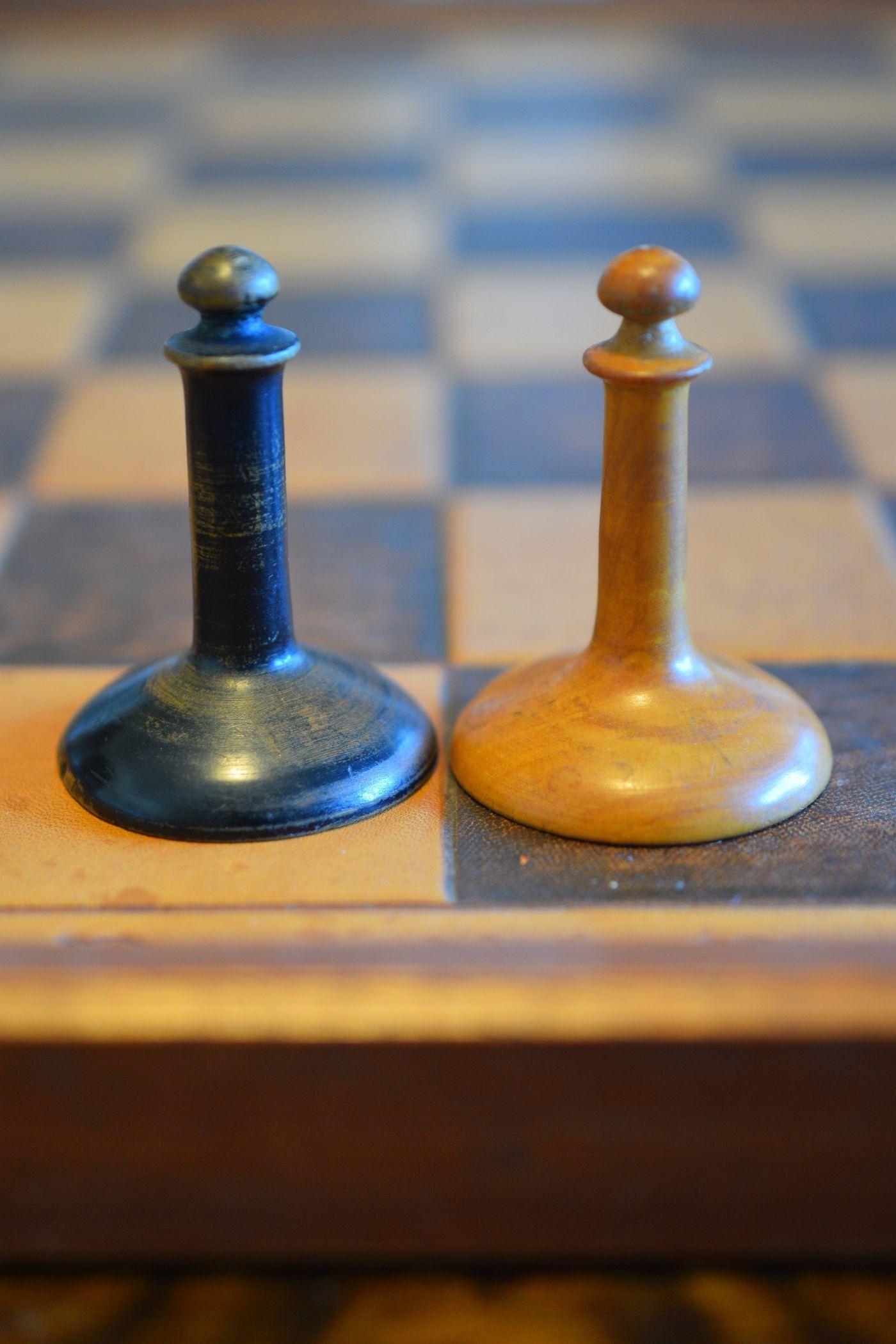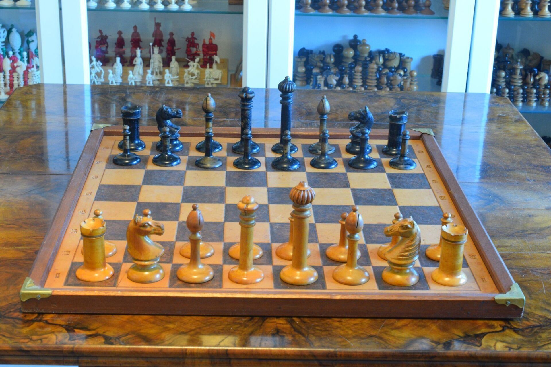 The chess set shown here can be assigned to the Austrian Upright type. It is almost identical to the pieces used in the 1910 World Championship, in which Emanuel Lasker defended his title against his challenger Carl Schlechter. The original set of the world championship match is now kept by the Lasker Society in Berlin. It differs from the set shown here essentially in the shape of the knights. The 1910 knights were of a somewhat higher and slimmer, stylised form, while the knights used here are more massive and more reminiscent of the knights used in Viennese coffee house games. Many assume that Lasker-Schlechter type sets all match the 1910 pieces, but this assumption is wrong. There were several versions of this set with different knights. According to Michael Ehn, sets such as the one shown here were mainly produced in the period between the outbreak of the First World War and the early 1920s.