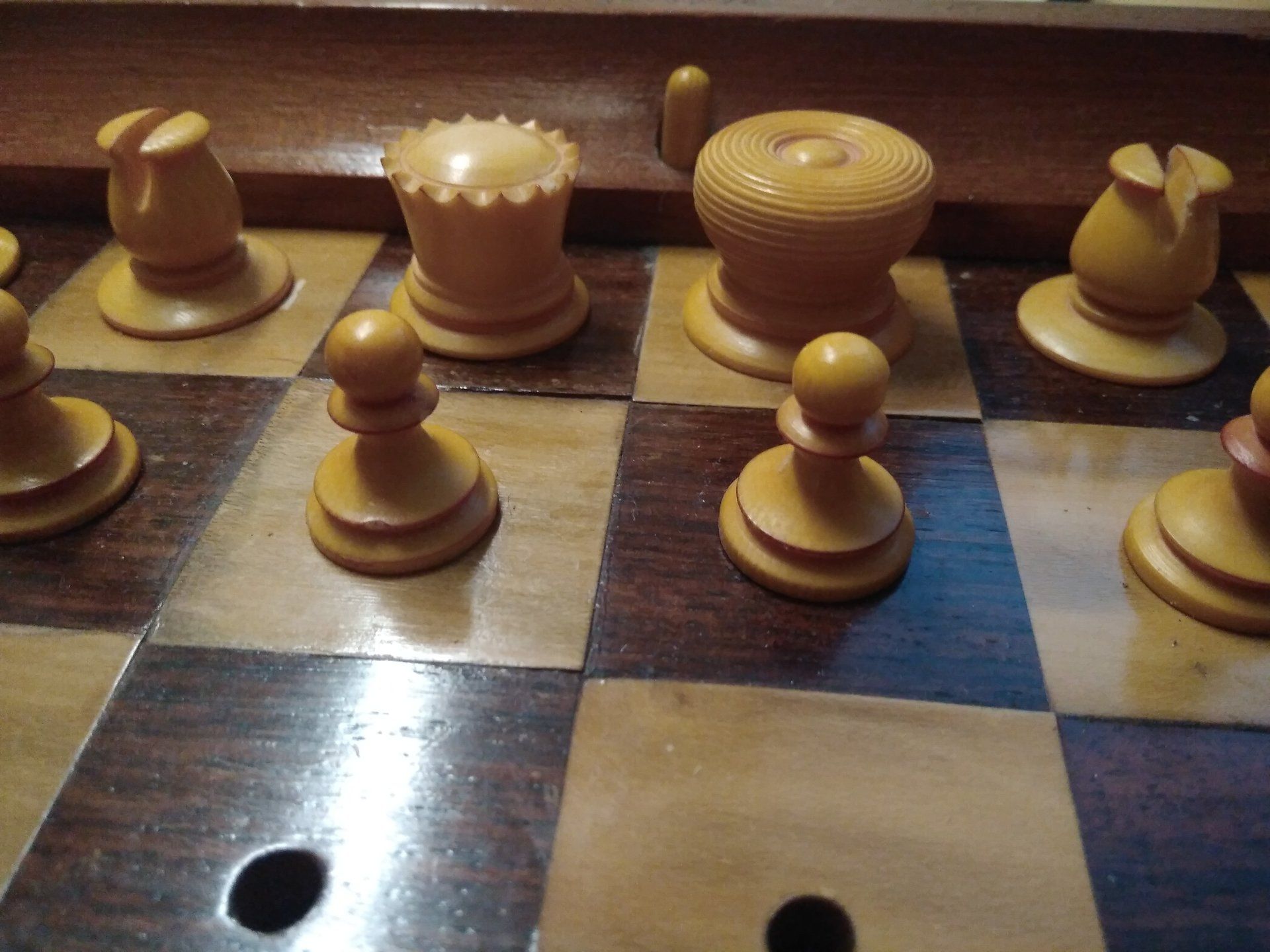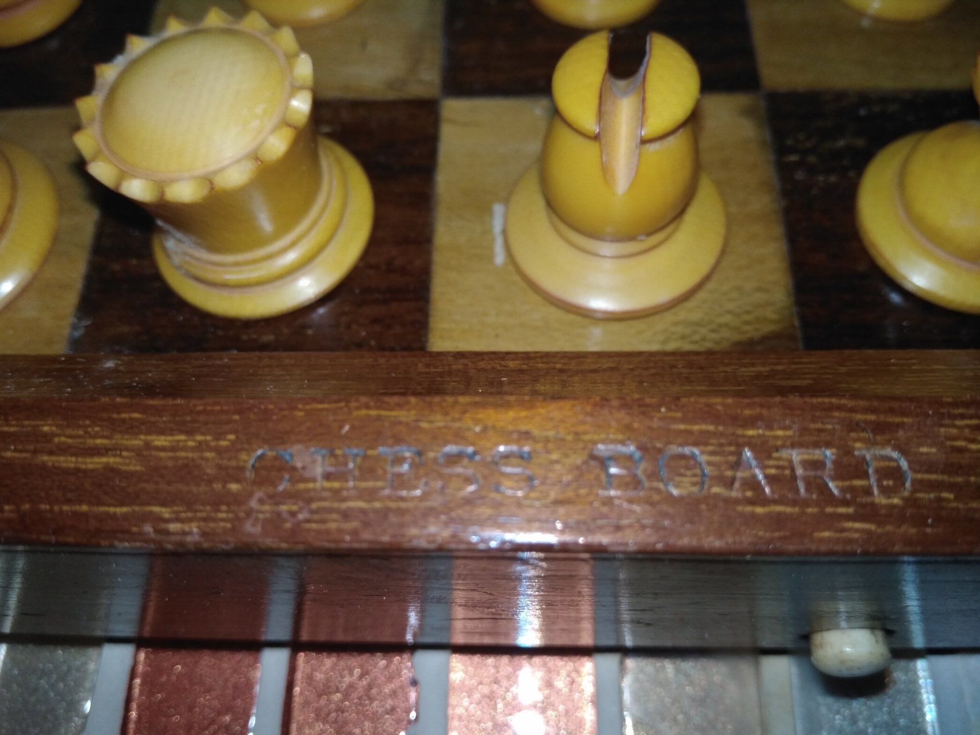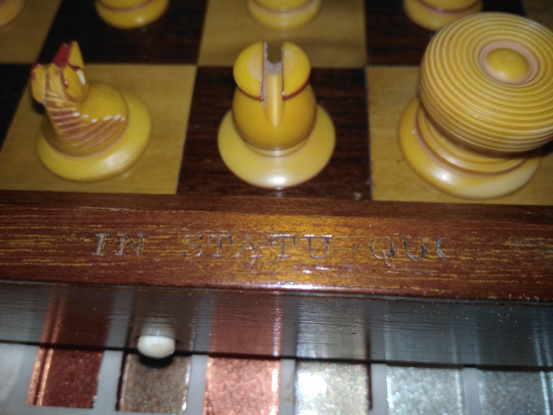 Ivory pegged pieces stained light red and left natural, in a mahogany board, the alternate chess squares in rosewood and boxwood, with a locking mechanism operated by bone push-buttons, brass lever locks to the side and a brass plaque inscribed: J. JAQUES & SON Makers London...IN STATU QUO...PATENT...CHESS BOARD stamped on the rim.