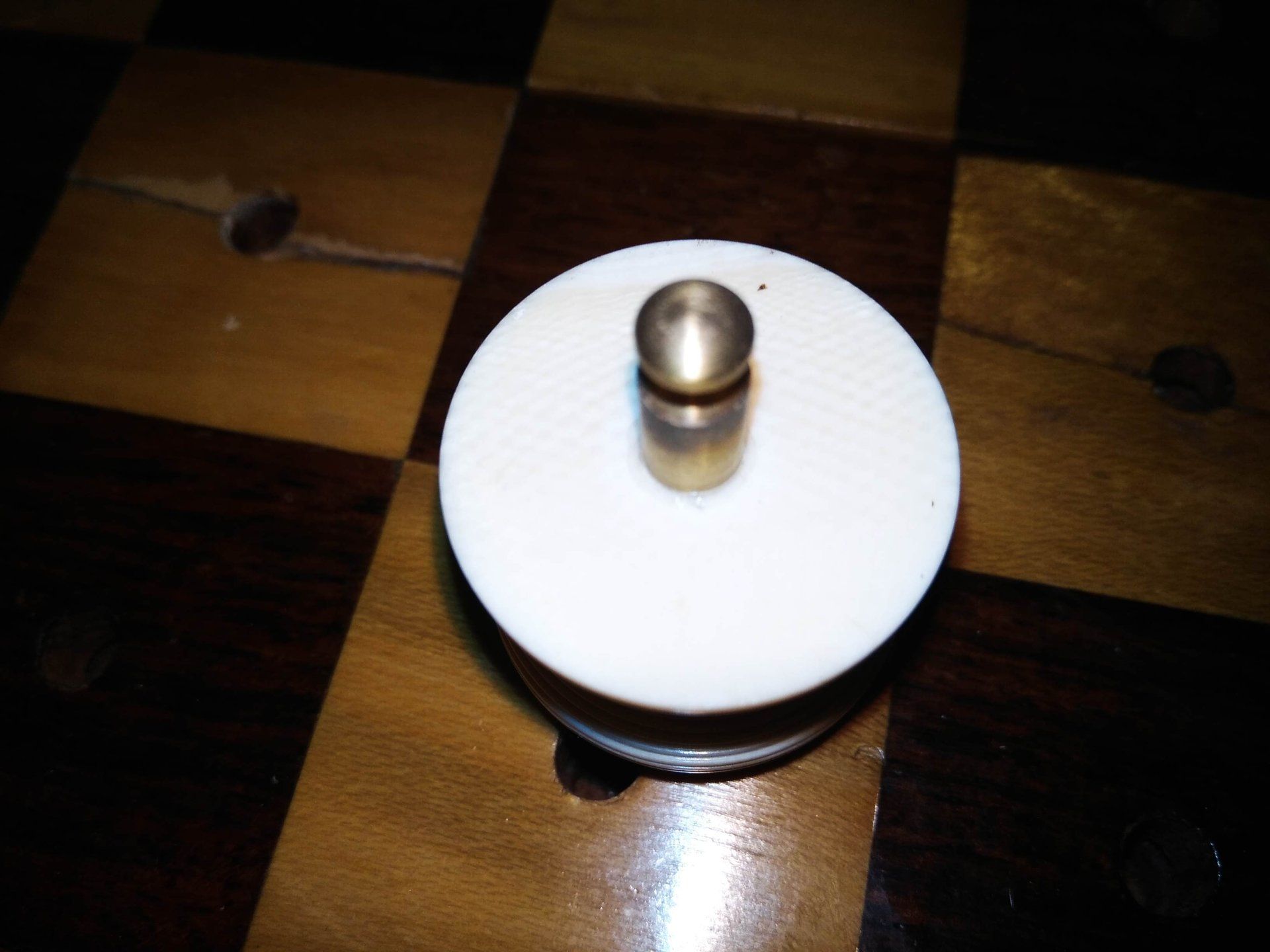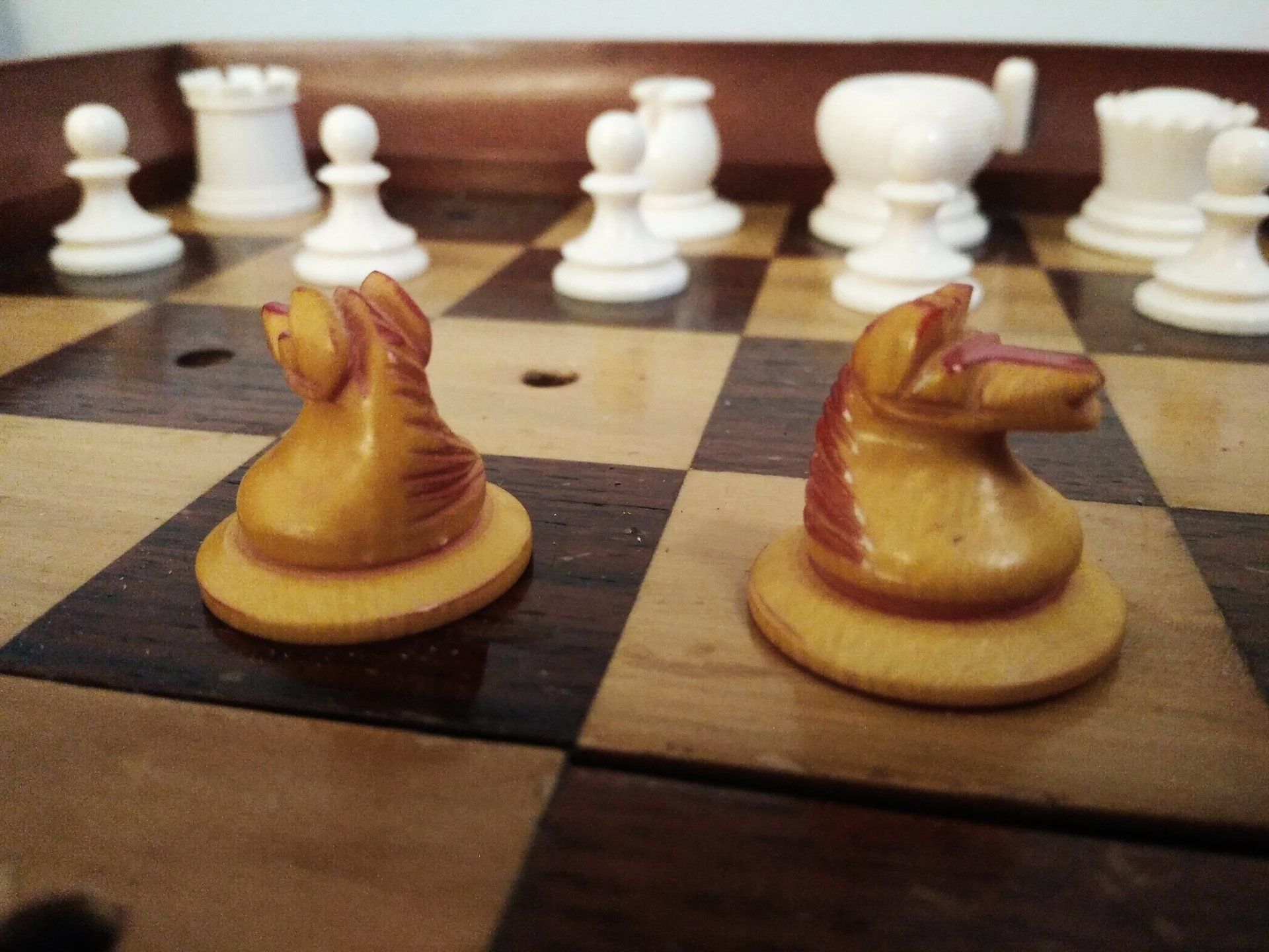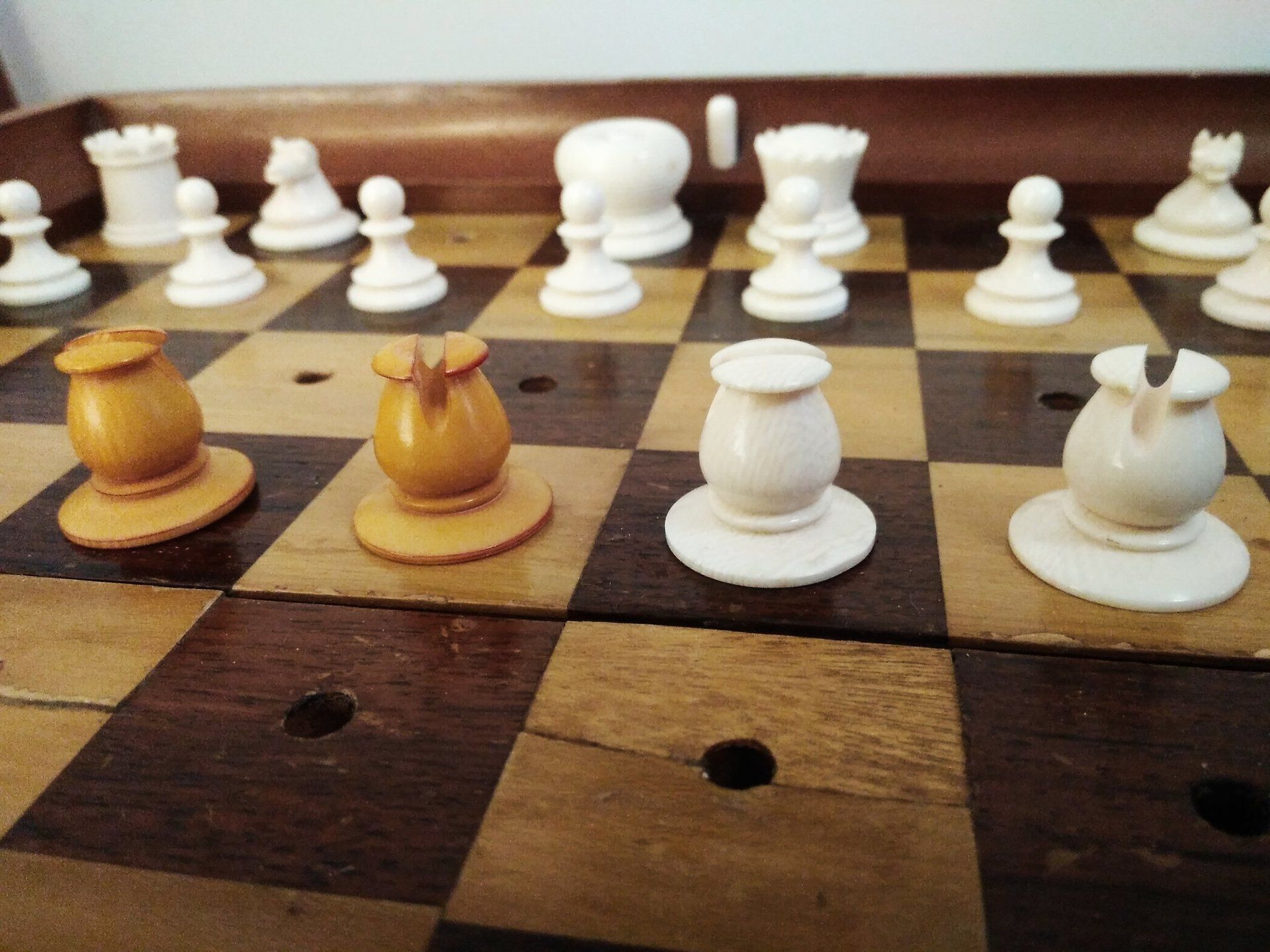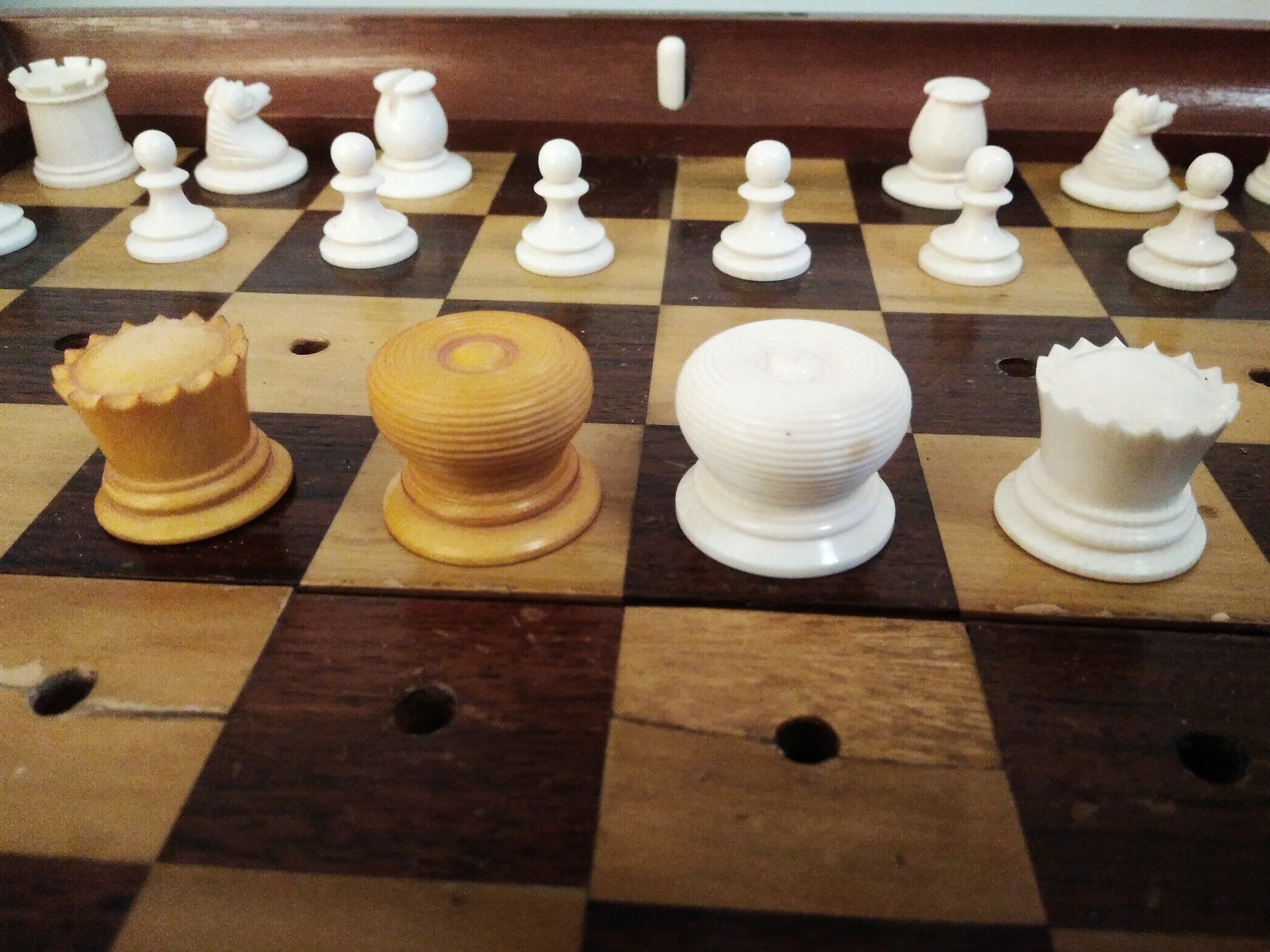 Ivory pegged pieces stained light red and left natural, in a mahogany board, the alternate chess squares in rosewood and boxwood, with a locking mechanism operated by bone push-buttons, brass lever locks to the side and a brass plaque inscribed: J. JAQUES & SON Makers London...IN STATU QUO...PATENT...CHESS BOARD stamped on the rim.