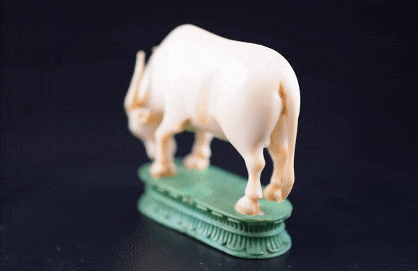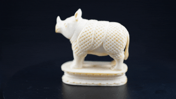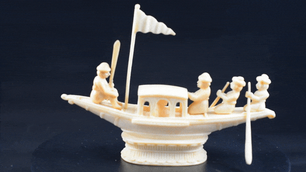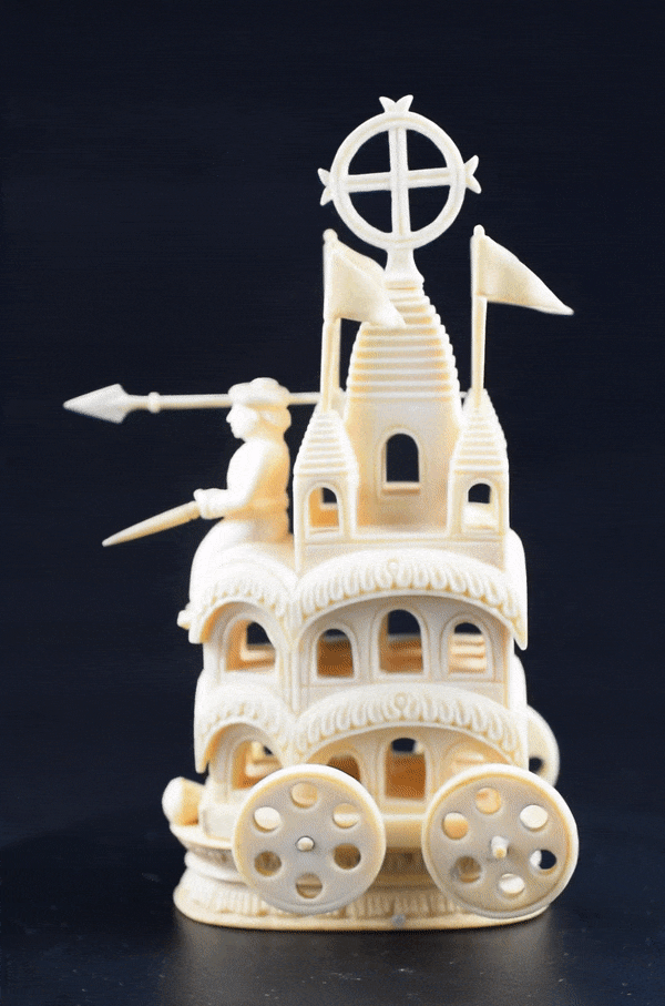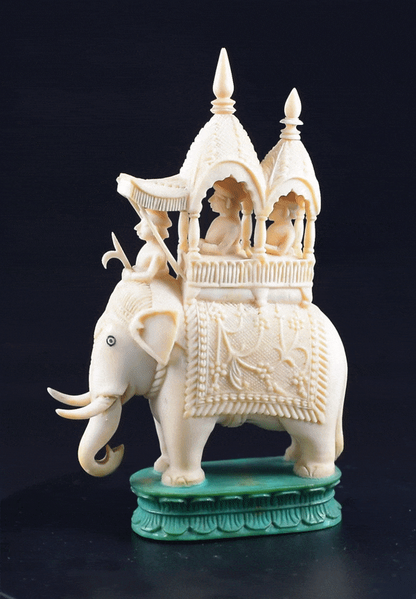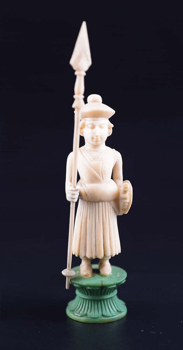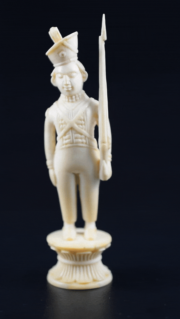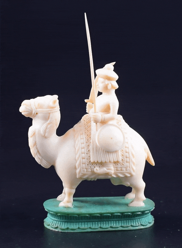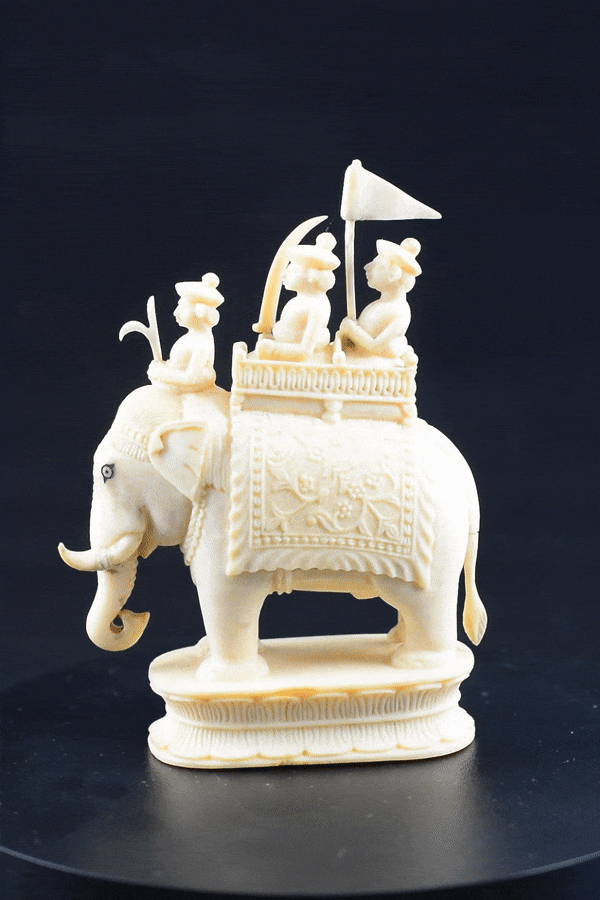 This particular set is much different from other sets of this type, as it includes a multitude of different pieces. Save for the kings and queens the pieces on each side are different from the respective other side. The style of carving is identical which indicates that the pieces all come from the same workshop. It seems, however, that the set was assembled individually from all sorts of pieces manufactured by this workshop. This makes it somewhat difficult to determine, which piece was meant for which position. There are, for example, mounted pieces, i.e. horses with riders and camels with riders. In other John Company sets of the time, the horses would have been the knights and the camels would have been the bishops. However, here we also have Rhinos and Buffalos. There is a discussion among collectors, whether animals served as bishops or knights. At the same time, the set includes extremely rare Juggernaut carts, which usually were bishops, and boats, which were usually rooks. In light of this uncertainty, I decided to show individual pieces and the incredible craftsmanship which was required for making them rather than the complete set.
