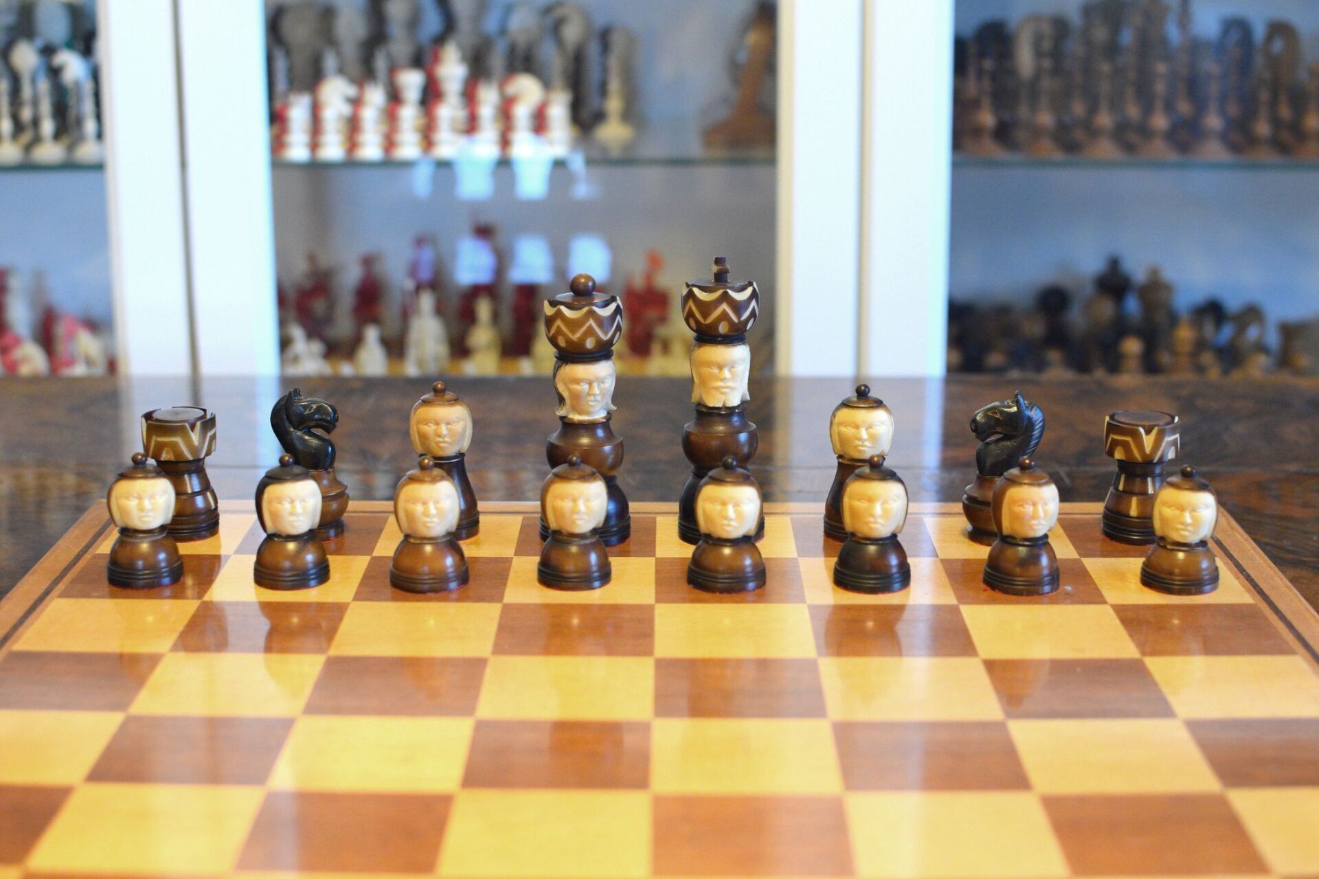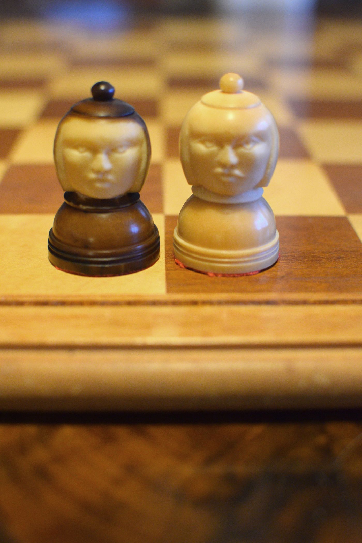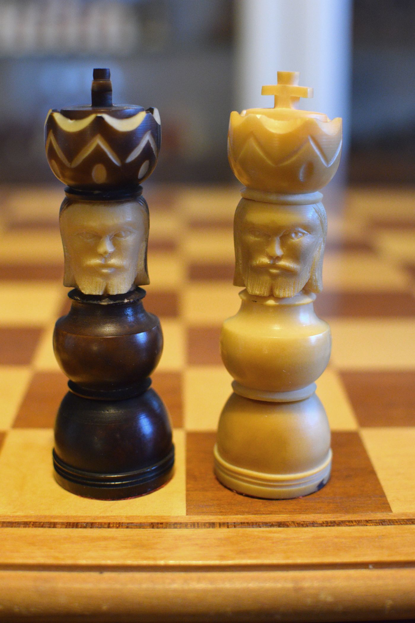 A figural chess set made in Ecuador in the 1970's. The pieces are carved from tagua nut, which is the endosperm of certain palm trees, which are found in Central and South America and are particularly widespread in Ecuador in the area of the Upper Amazon. When dried, the tagua nut's have a medium size of 5-6 cm and an average density of around 1,200 kg /m³ , which corresponds roughly to the density of bones or elephant tusks (which again is the reason why these nuts are also referred to as "vegetable ivory"). In this state the nuts can be worked mechanically in every conceivable way, be it by sawing, milling or turning. In the 19th and early 20th centuries the material was popular for the production of buttons, but also for playing dice, knobs for knives and walking sticks, pipe bowls and, last but not least, chess pieces. Japanese netsuke were also often made from tagua nut. However, the popularity of tagua nut declined rapidly after the Second World War, when it was increasingly replaced by newly developed plastics. However, in view of the ethical problems surrounding the use of animal ivory, there has been an increasing demand for this wonderful material again in recent years.