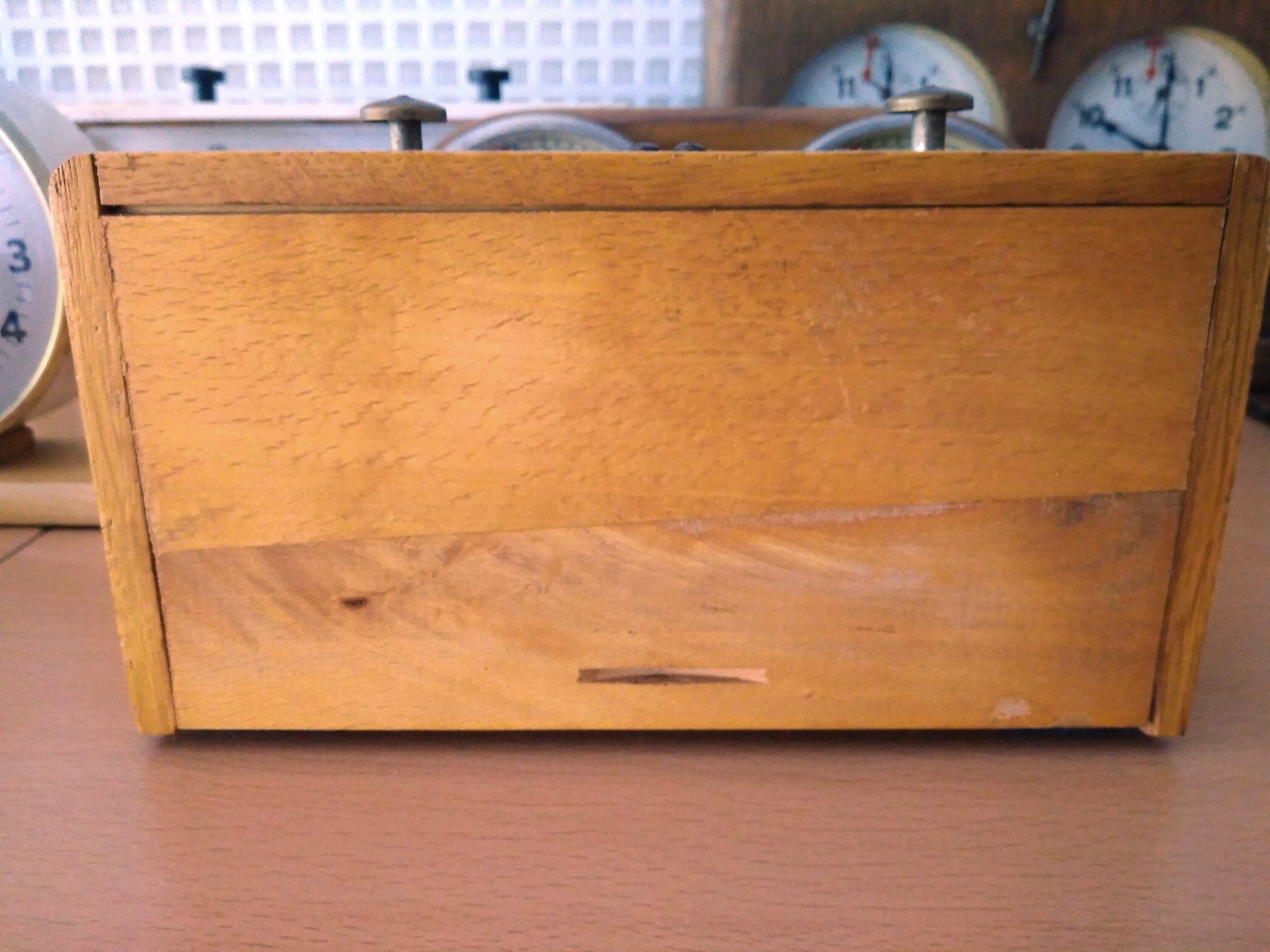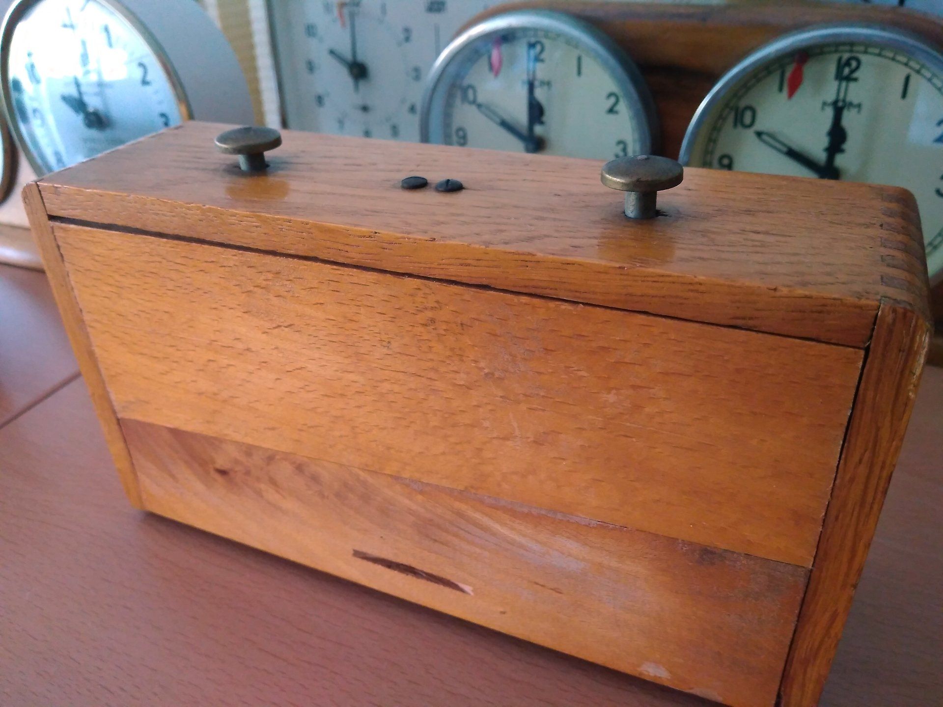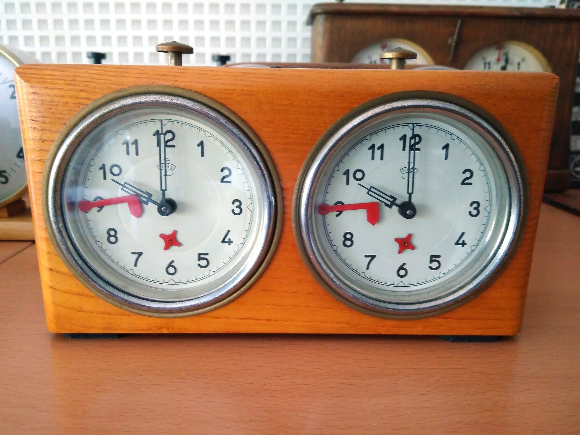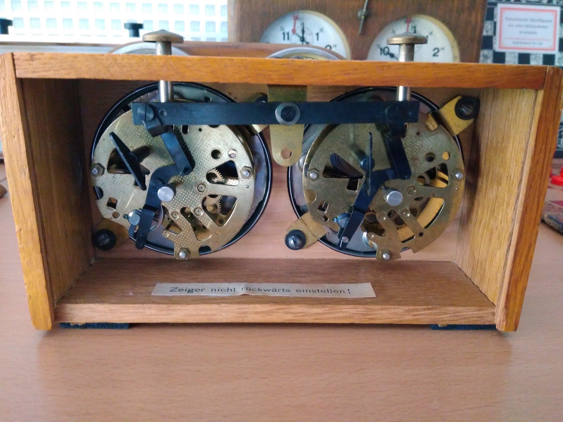 Here is a very nice chess clock manufactured by the renowned producer Thiel / Ruhla. The company itself was founded in 1862 by two brothers, Georg and Christian Thiel, who rented out workshop space in Ruhla for the production of metal fittings for shoes and pipes. Despite being succesful, Georg Thiel left the company already in 1867 and was replaced by his brothers Reinhold and Ernst. The production of clocks started in 1890, when 70 clockmakers from Switzerland were employed for the production of pocket watches. These pocket watches, produced under the name "Fearless", were made with a case which was not screwed but tightened with bent metal sheets, which made it impossible to repair the watch. Since the retail price of the watches was only half of the usual costs for pocket watches, they triggered a large demand anyhow. Around 1897, Thiel produced around 4,000 pocket watches per day! A few years later, Thiel was the first watchmaker with a serial production of wristwatches for women (1906) and men (1908).
