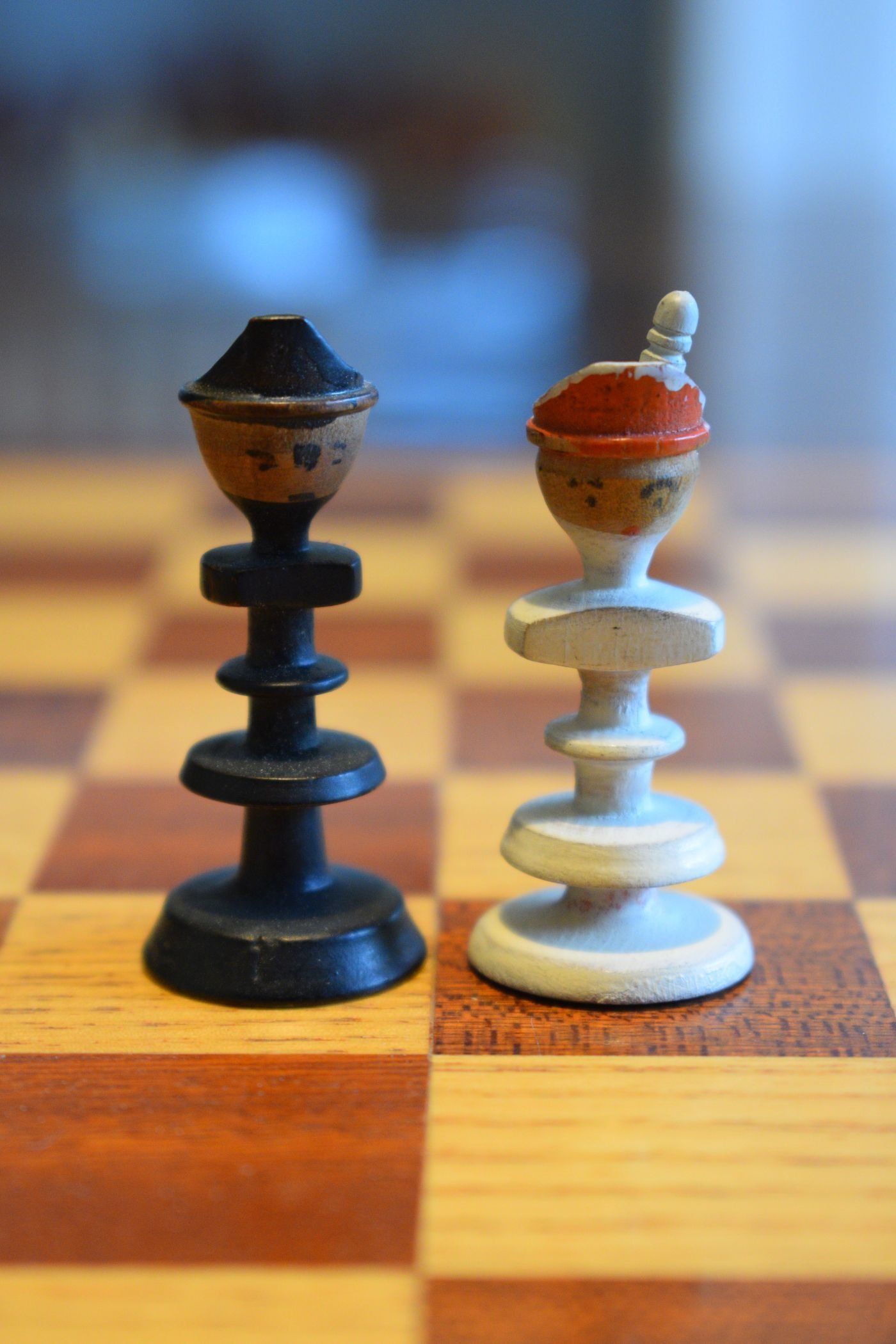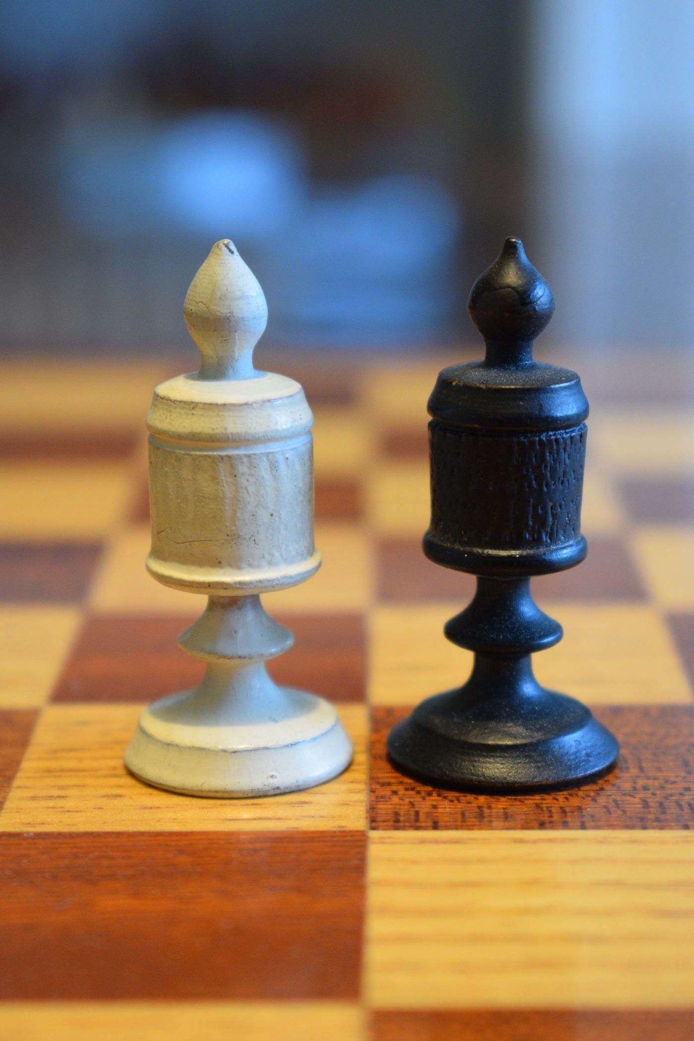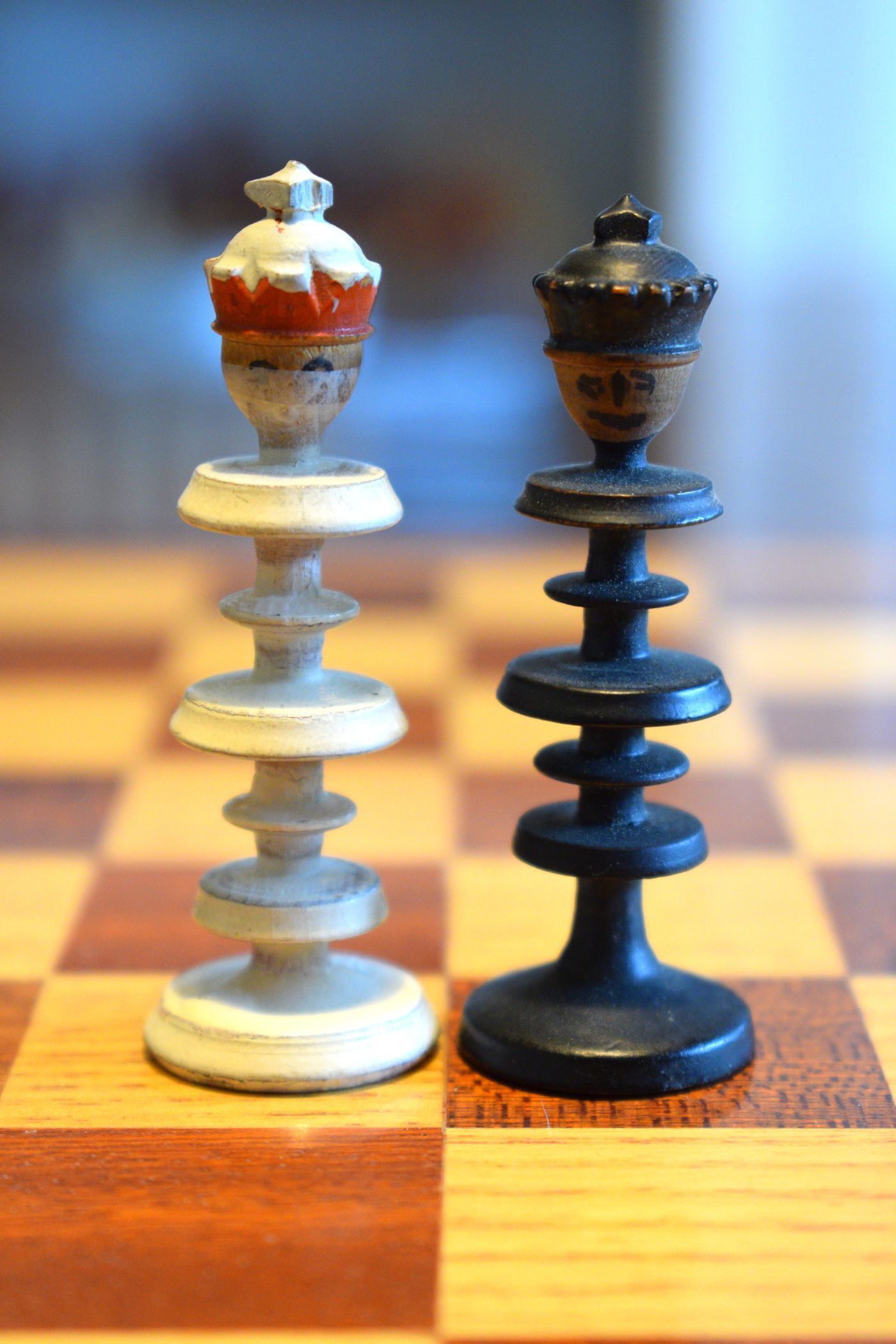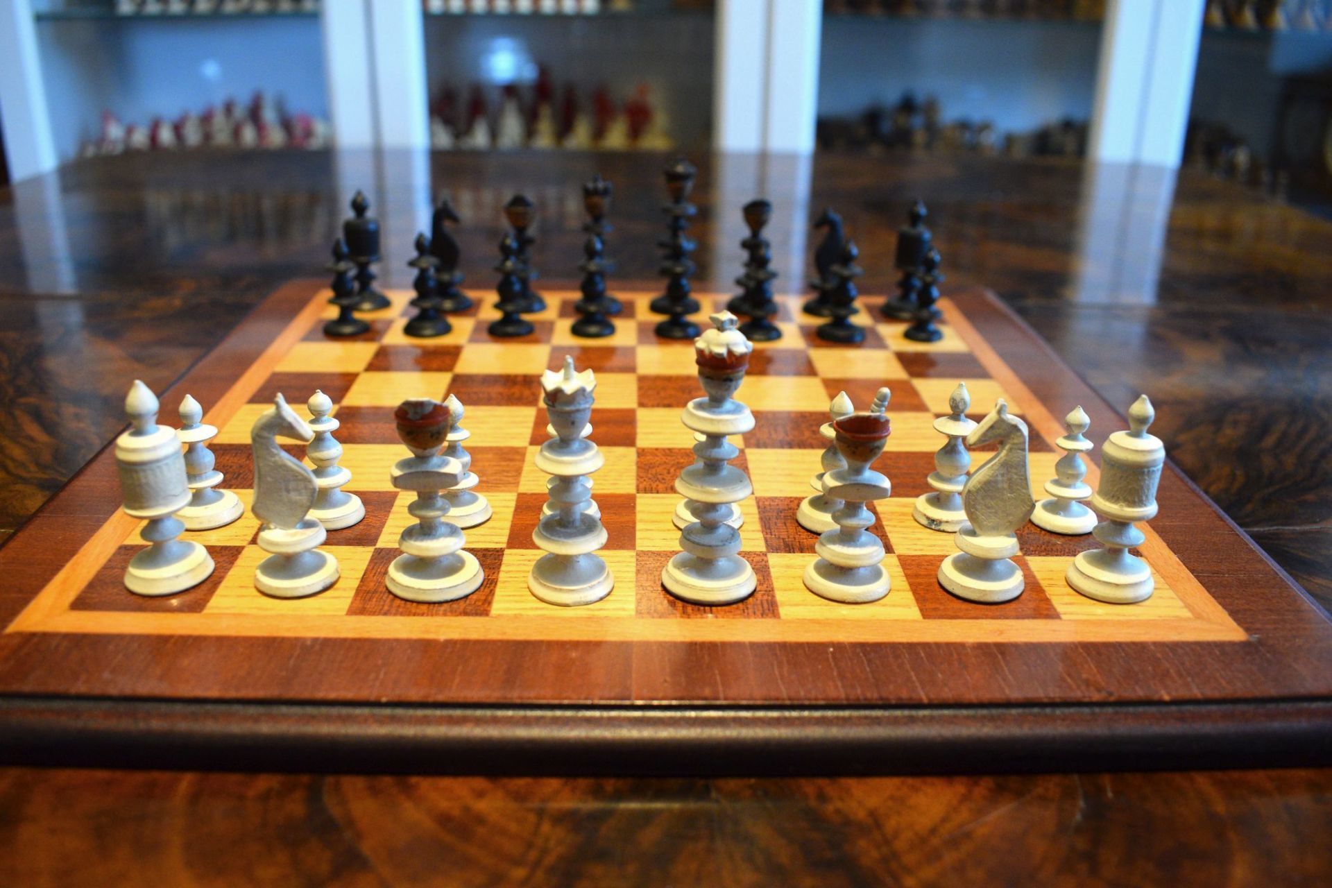 Small German "Toy" Chess Set in the tradition of the Nuremberg and Ore Mountain toy makers, probably dating to mid 19th century. Pieces made from limewood or fruitwood, the two sides distinguished by white and black colouring. Kings and Queens with painted details to the faces and tiered galleries, Rooks as simple turrets, Knights as carved horses' heads on raised galleries, Bishops with painted details to the faces and caps, one white bishop bearing a feather finial, while the other feathers are lost. Pawns of baluster outline. King 6,2 cm.
