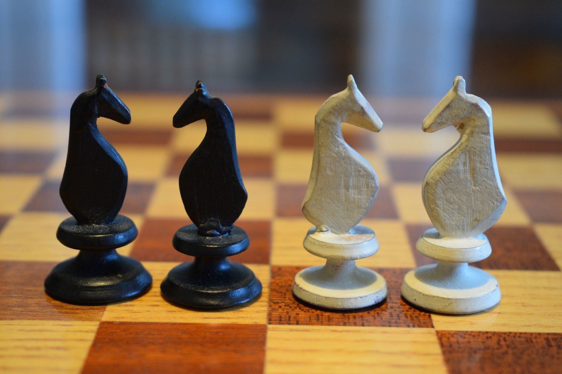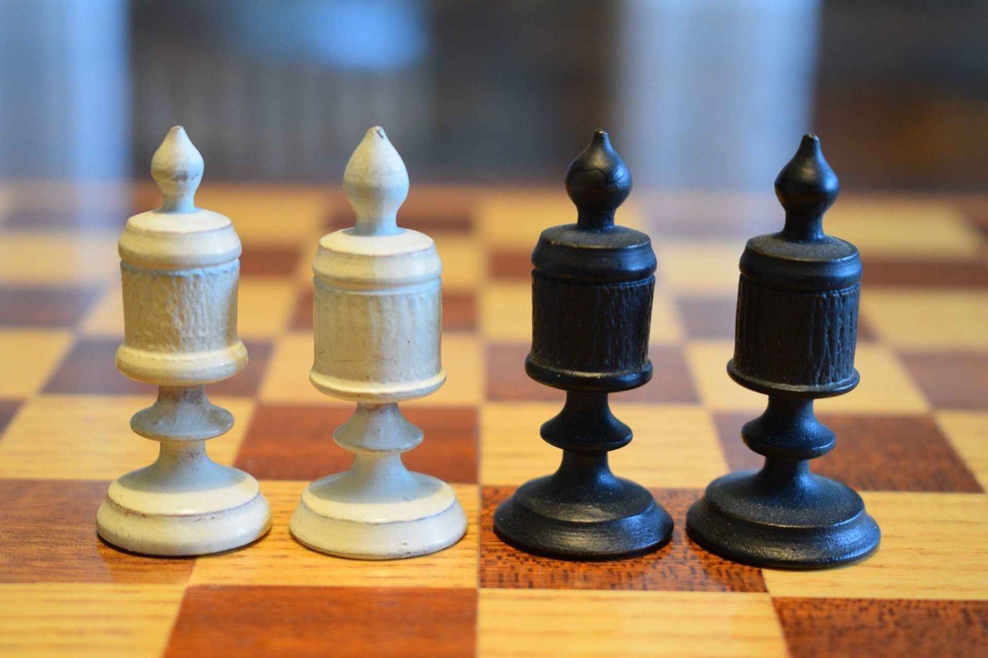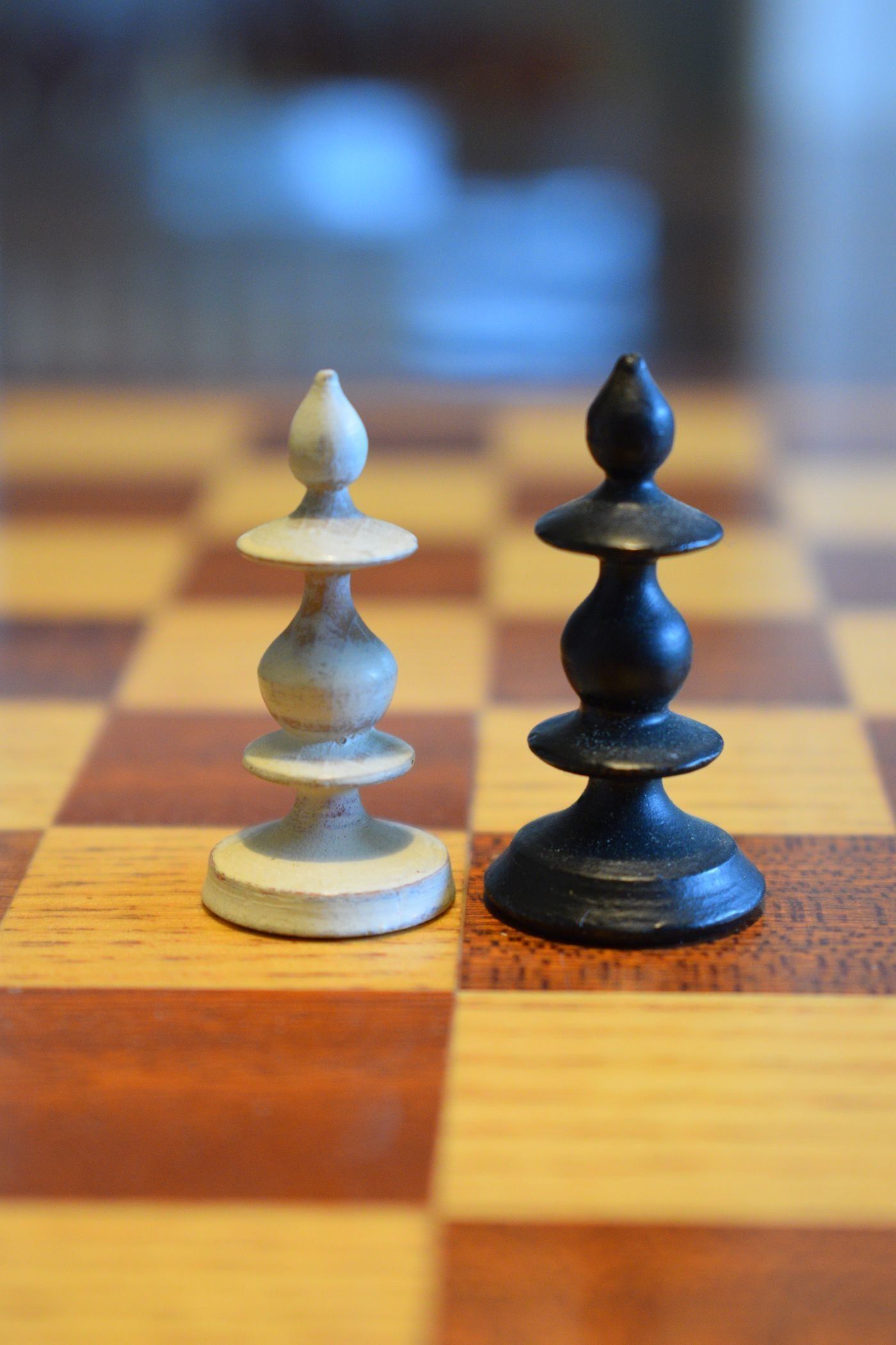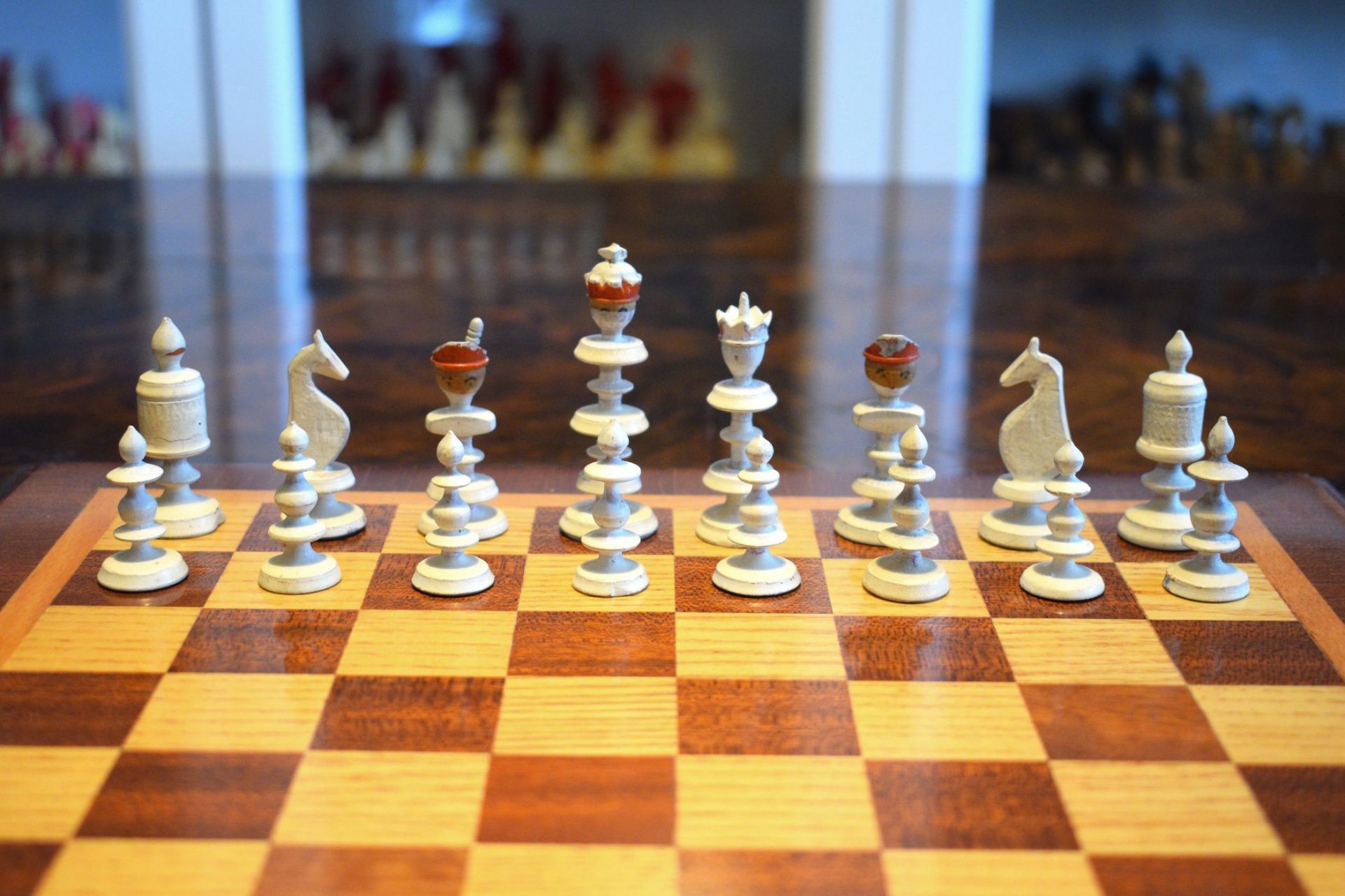 Small German "Toy" Chess Set in the tradition of the Nuremberg and Ore Mountain toy makers, probably dating to mid 19th century. Pieces made from limewood or fruitwood, the two sides distinguished by white and black colouring. Kings and Queens with painted details to the faces and tiered galleries, Rooks as simple turrets, Knights as carved horses' heads on raised galleries, Bishops with painted details to the faces and caps, one white bishop bearing a feather finial, while the other feathers are lost. Pawns of baluster outline. King 6,2 cm.