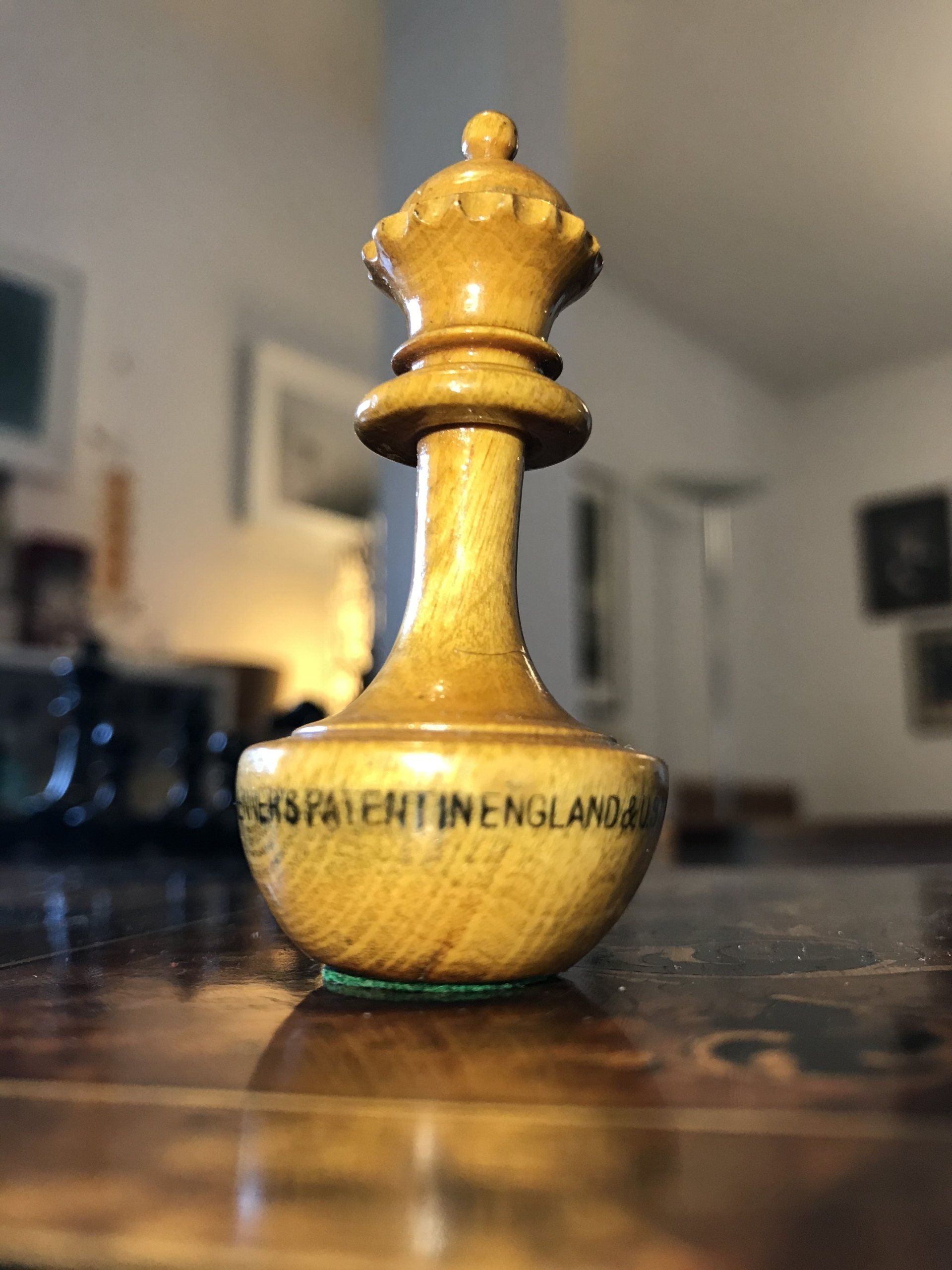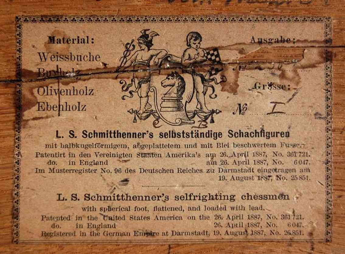 The Queen bears the inscription "L.S.Schmitthenner's Patent in England & U.St. America in Deutschland Mustersch.". This is referring to the patents granted for this particular design. A copy of the original US patent including several drawings and a written specification is shown in the pictures. The application for the US patent was filed on 9 December 1886 and the patent was licensed under no. 361,721 on 26 April 1887 and on the same day in England under no. 6047. The particulars of the German patent ("Musterschutz") are a bit unclear. According to a photo of an original label which I found on the internet, the patent was licensed on 6 August 1887 and registered under no. 25851 in the German Empire's patent register no. 36 in Darmstadt. According to a second label, which must be of a lter date, as it already refers to a prolongation of the German patent for an additional 12 years licensed on 4 August 1890, a photo of which was provided to me courtesy of Frank Camaratta, the original patent was granted already on 6 August 1887.