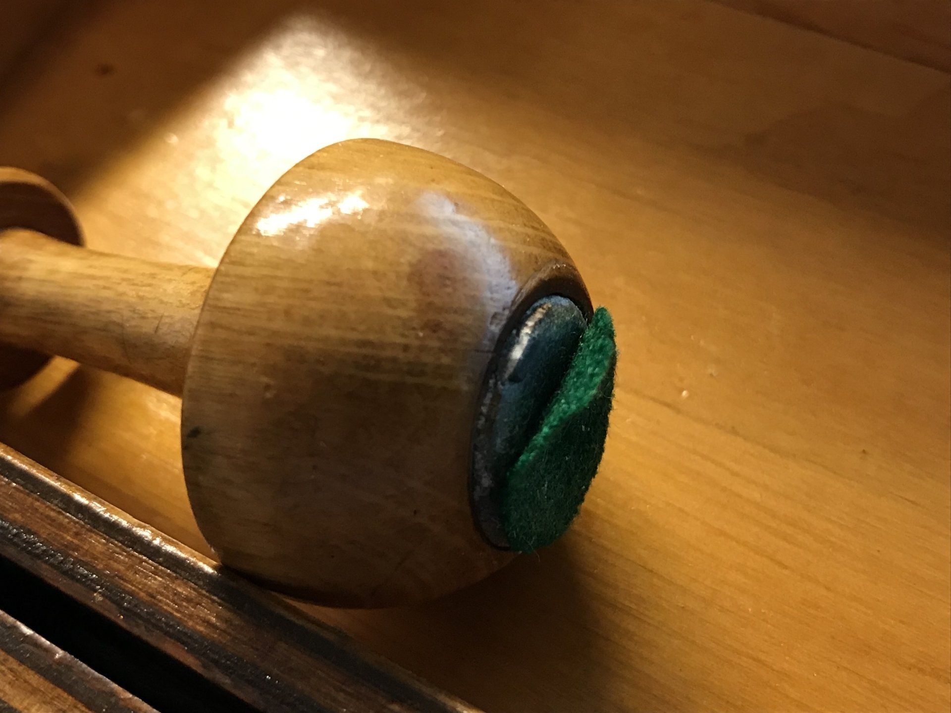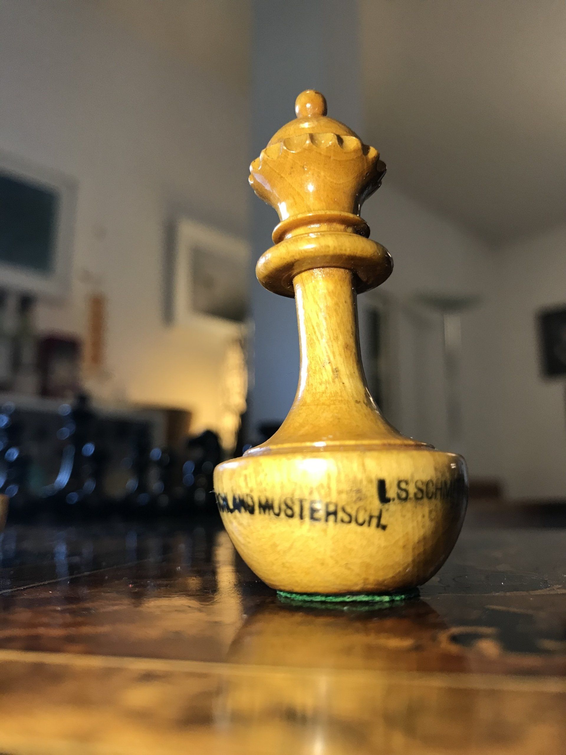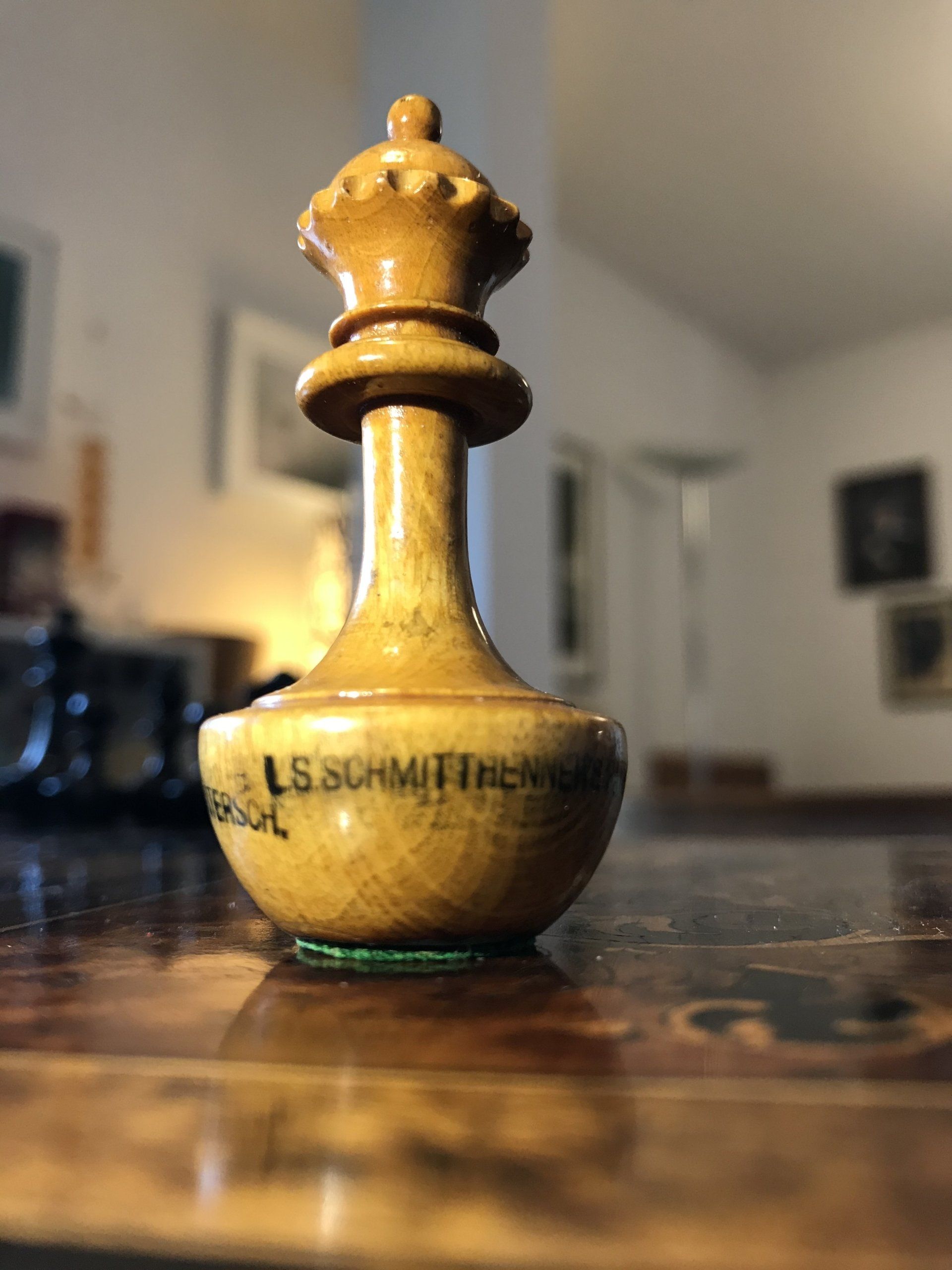 A rather special German set by Schmitthenner with a King size of approximately 75 mm (i.e. a tad short of 3"). They are made of boxwood, one side natural, the other side stained black. The chess pieces are designed in the Staunton pattern. The Knights have eyes in the form of a small inlaid ring of some unknown material, probably a small metal ring. The bases of the pieces are ovoid shaped but with a flat bottom covered by felt. The bases are filled with lead, which provides for the pieces to retain an upright position, even if moved or accidentally knocked over, hence their description as "self-righting" chessmen. They were particularly popular in the UK and the US, where they were referred to as "roly-poly-sets". Sets like this have also been sold under the description "ship's chess sets", as it is assumed that they were, inter alia, used on ships as they provided some basic stability even when waves rolled the ships.