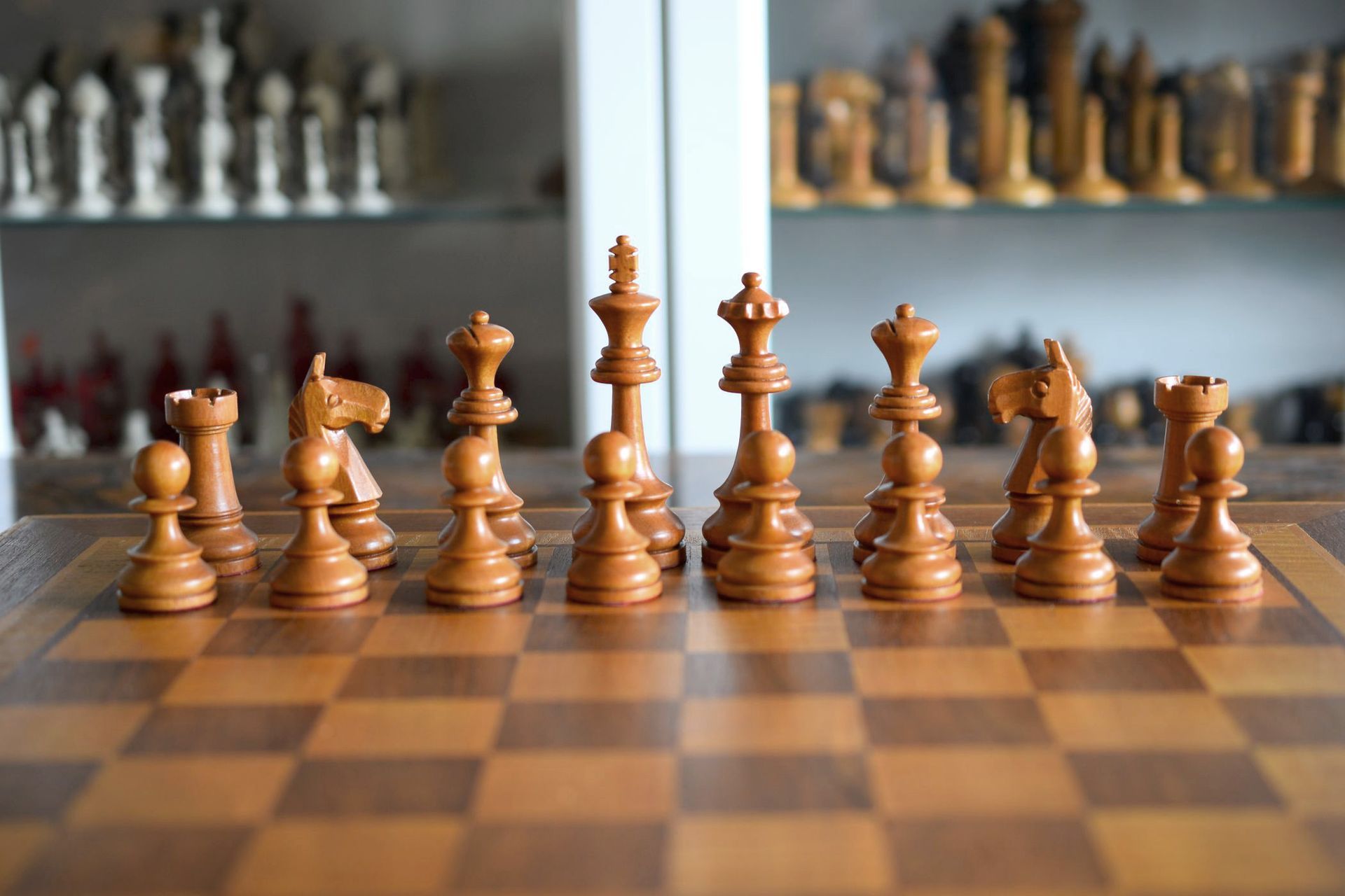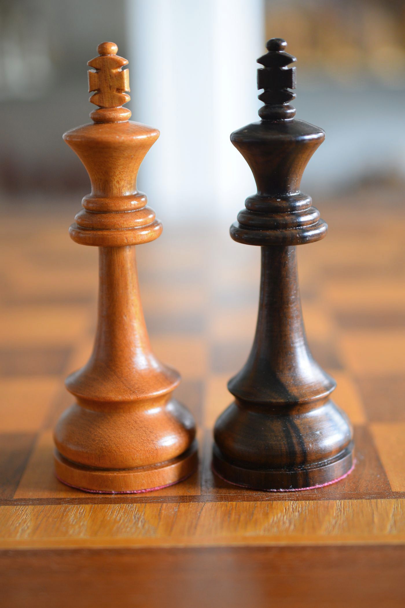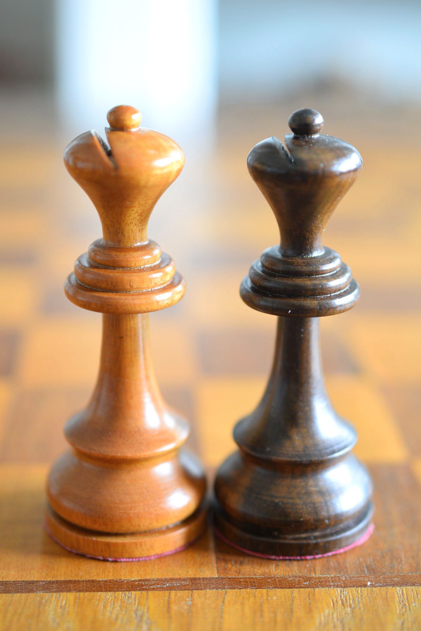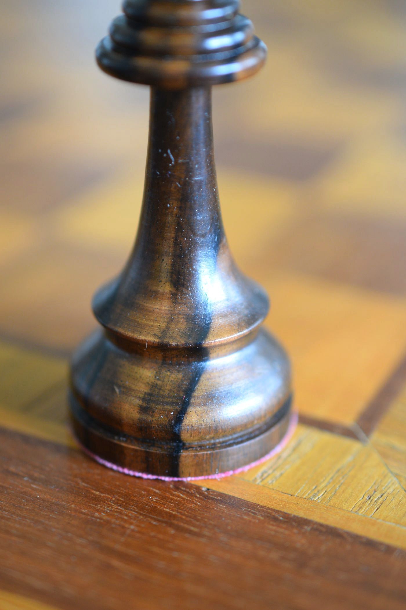 Here is probably my most elegant Philippine Staunton chess set in pristine condition with a king size of approximately 10 cm. In contrast to the usual Philippine Staunton sets, the pieces in this one are very slender with rather slim stems and triple collars on the kings, queens and bishops. Also, the crosses on the kings differ from the so called "rosary cross" usually seen on Filipino sets. The most outstanding pieces are the bishops, which have extremely unusual heads. Despite being quite modern, sets of this type are somewhat rare. I have only seen this type about 4-5 times so far and only know very few collectors who have a set like this in their collection. The last picture shows the beautiful kamagong grain on the black side pieces.