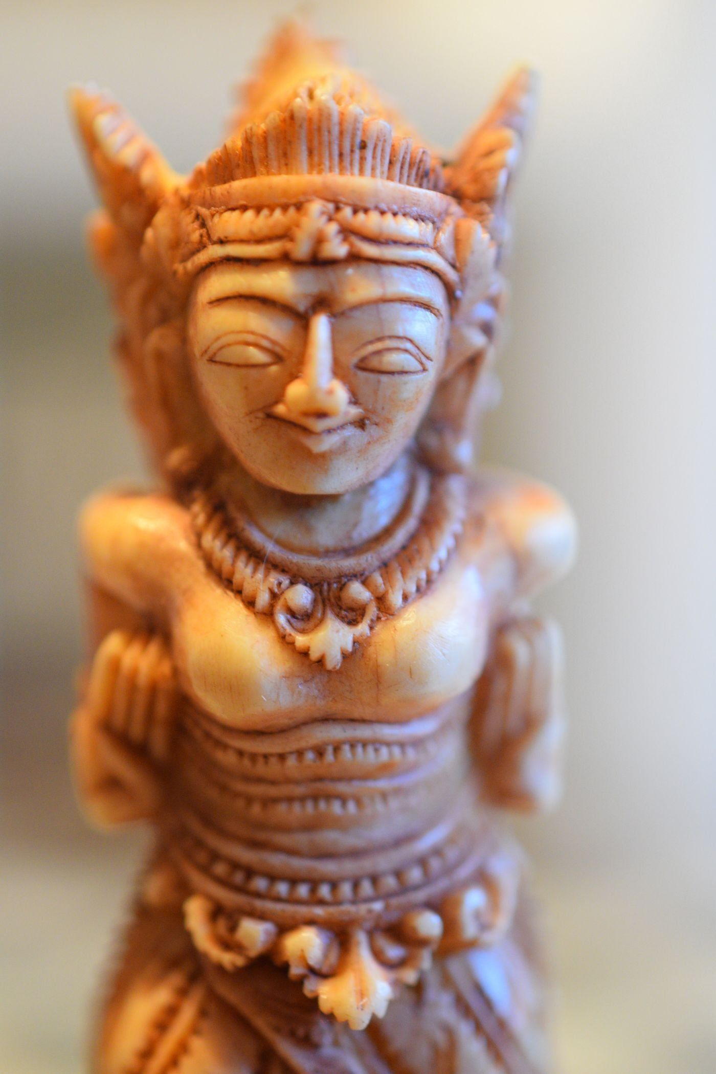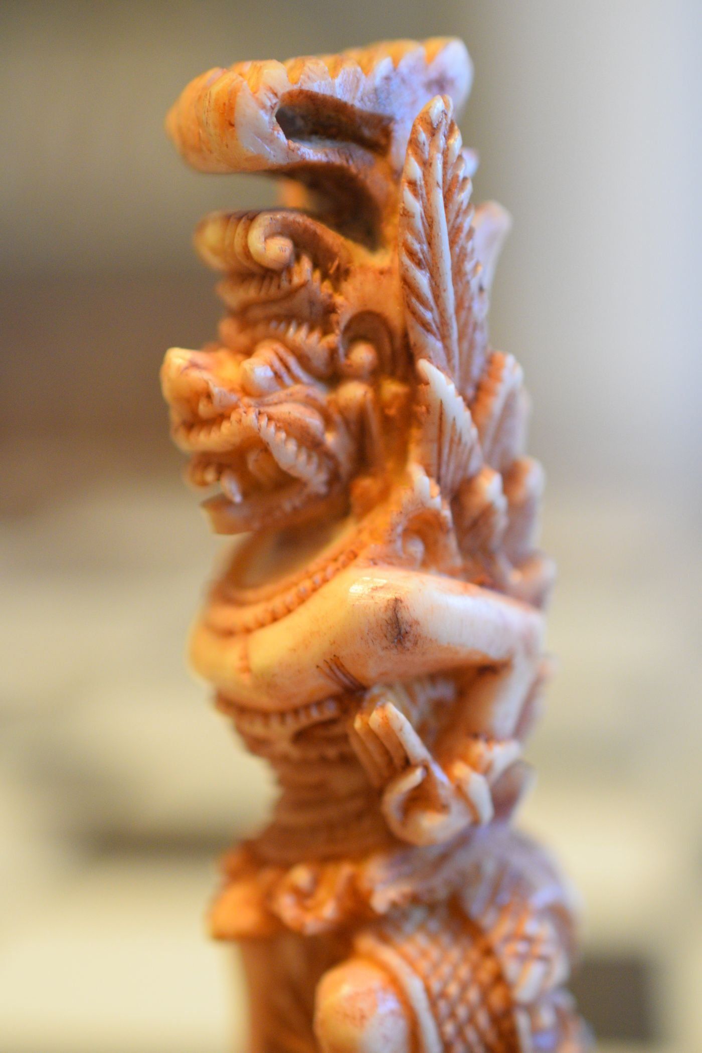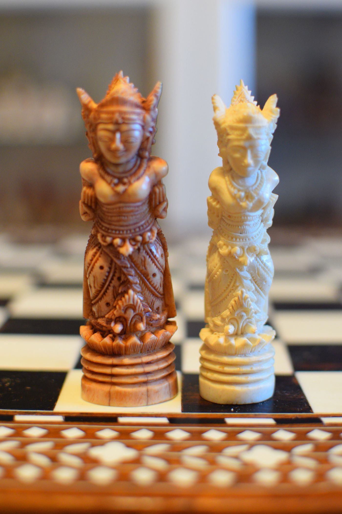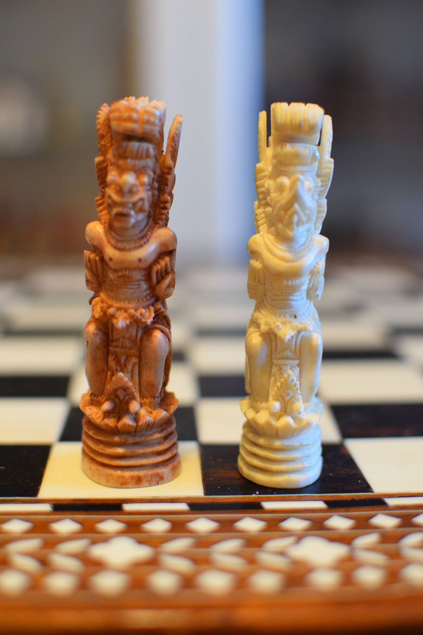 An ornamental chess set made in Bali inspired by the Mahabharata and the Ramayana, the two ancient Hindu epics. According to the former owner the set was made in Bali / Indonesia in the 1920's or 1930's, but it could in my view also date to the mid-20th century. Ned Munger shows a similar set in "Cultures, Chess & Art", Vol. 3 (Pacific Islands & Asia), figure 68, which he describes as "Regal Rama" chess set. The set has a king size of 4.3" (11 cm) and is made of Sambar deer antler, one side natural, one side tea stained. The white king and queen as Rama and Sita. the white rooks as Hanuman, the monkey king, and the white knight as the epic eagle Garuda. The white pawns as Hanuman's army of monkeys eagerly waiting to fight the black king Rwana's demon army.