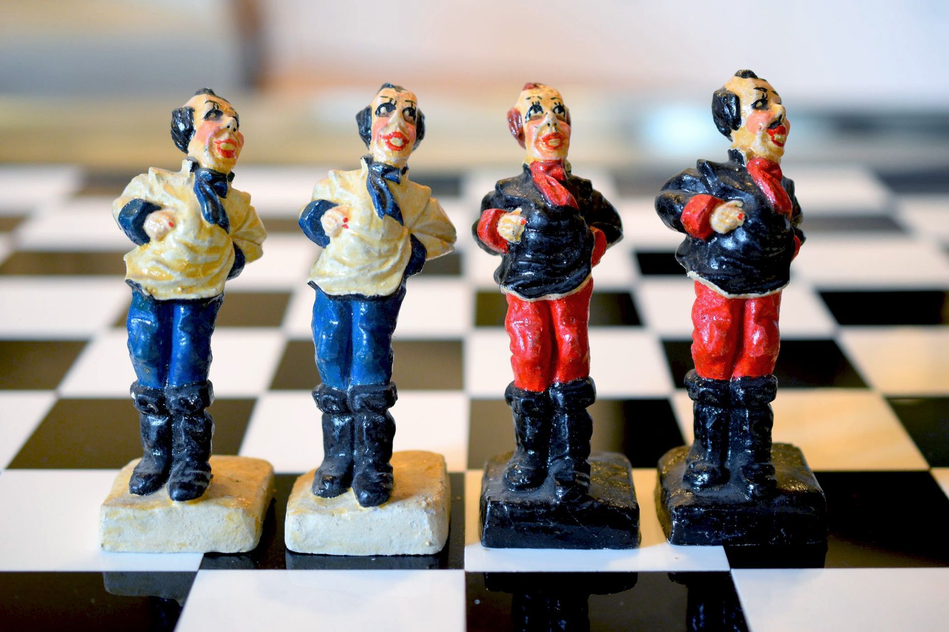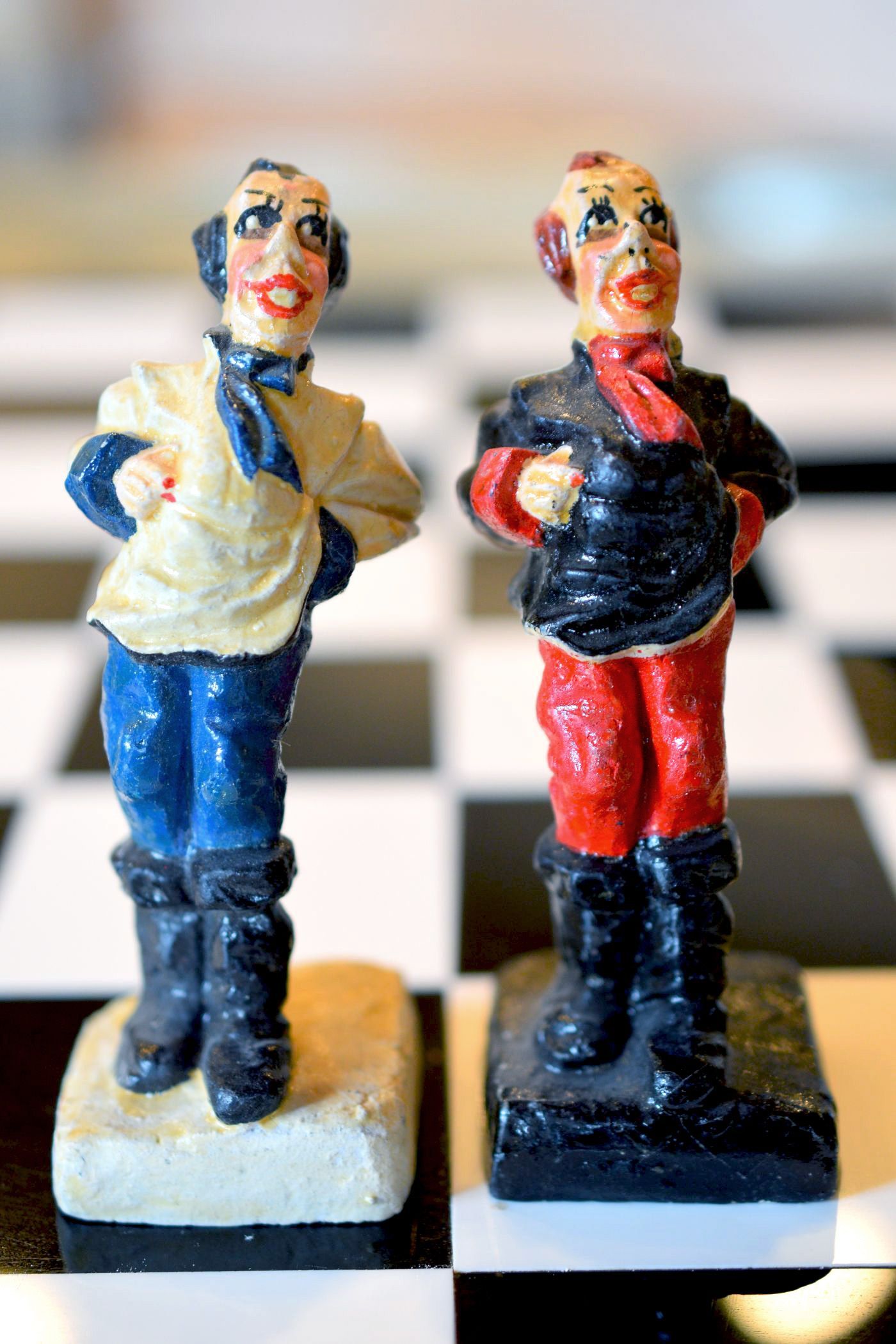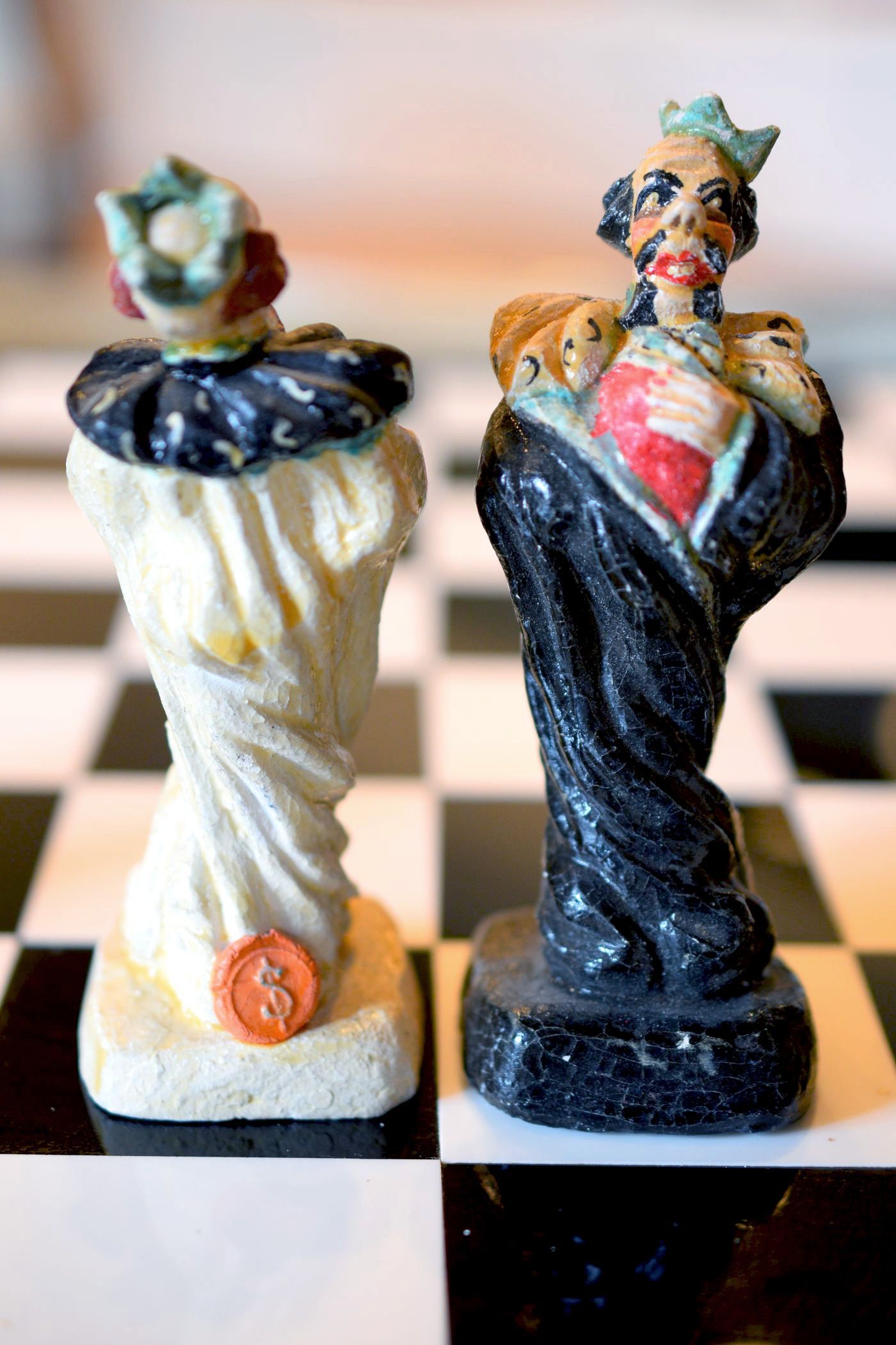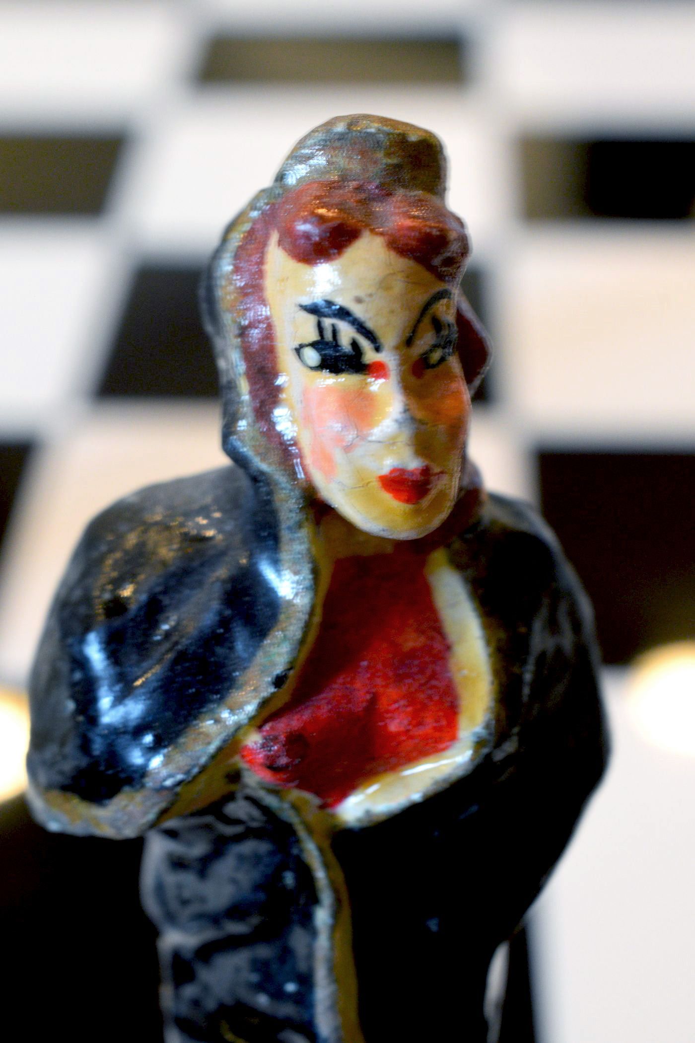 This chess set might not appeal to everyone. And I don't know whether it can be considered antique. But it is definitely vintage and rare. I don't know anything about the background of the pieces. The material from which the pieces are made is a kind of compound. It looks similar to plaster, but lighter. It reminds me a little of salt dough, which means it could be a chess set made of an organic composite material. The figures were not produced in a mould, because there are too many differences in the details between the individual pieces for that. This can be seen, for example, in the bishops, which all look different. It indicates that each individual sculpture was handmade. The pieces themselves resemble comic or cartoon characters from the 1930s or 1940s. However, I have not yet been able to find a specific template after which they were modelled. The kings are about 12.8 cm or 5" tall. The faces of the characters and their postures are heavily exaggerated, as can be seen from some of the detail shots, e.g. red cheeks, red lips, black outlined eyes etc. On the back, the kings have a large coin with a dollar sign at their feet. All in all, an extremely unusual collector's item.