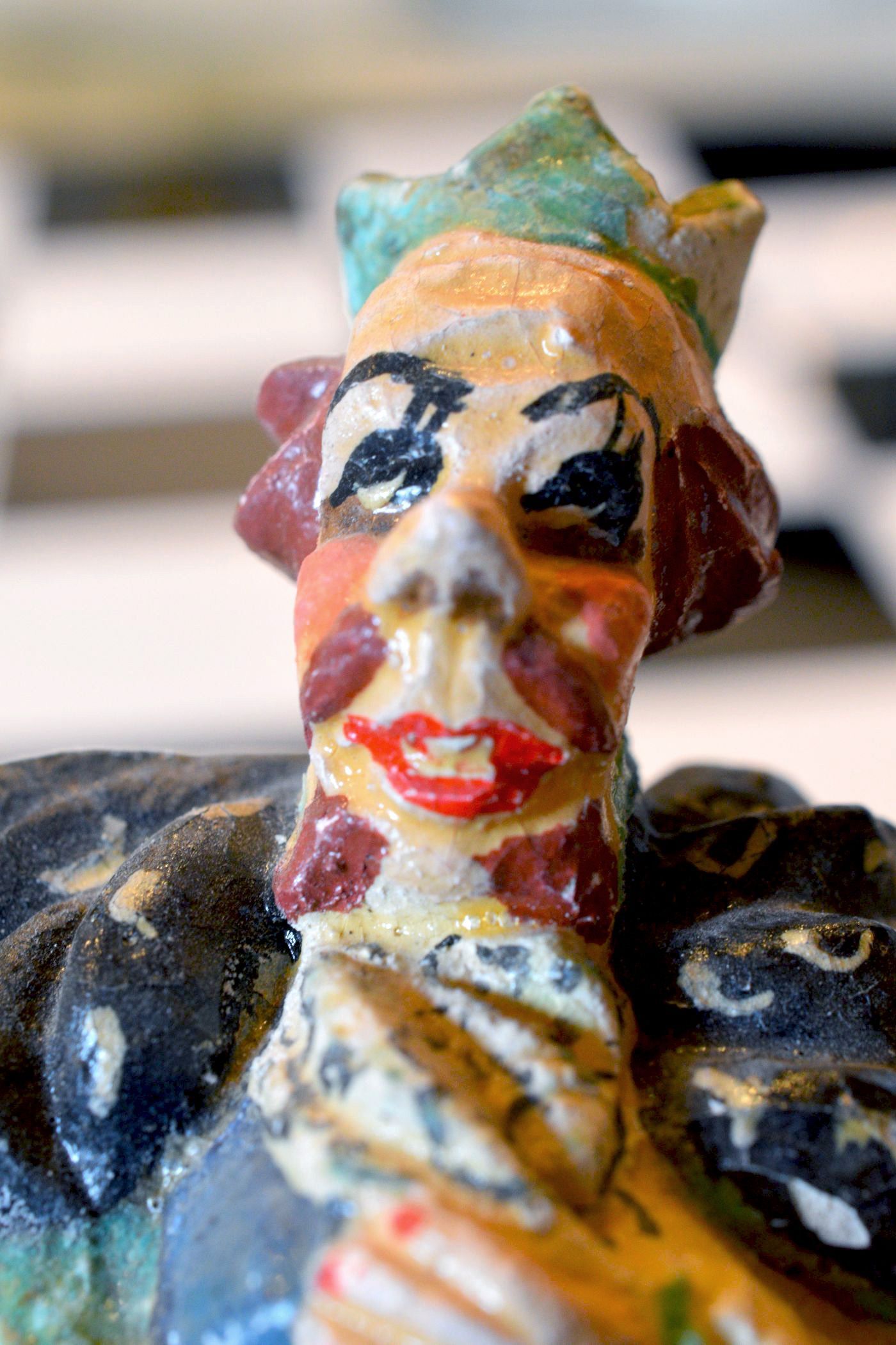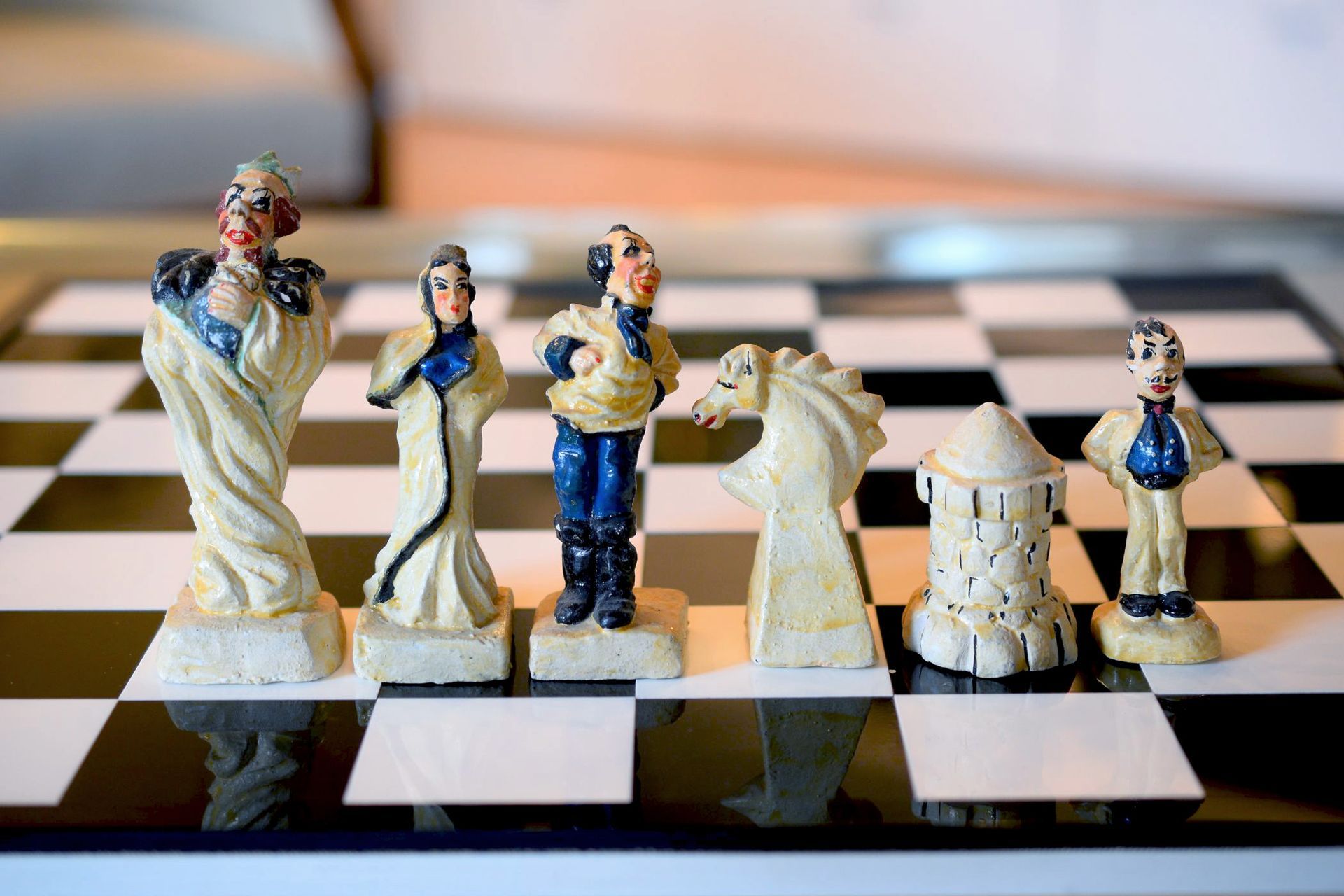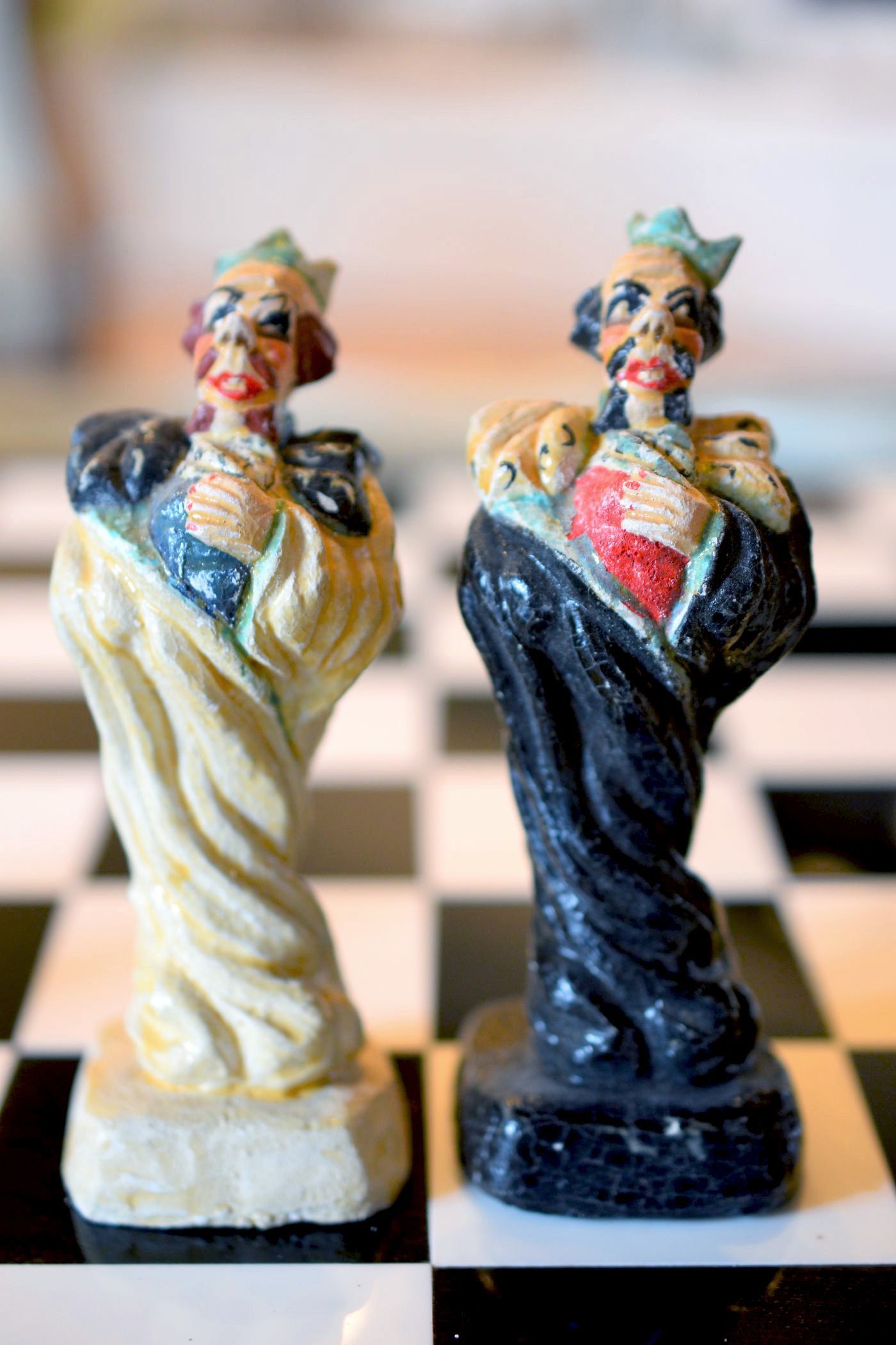 This chess set might not appeal to everyone. And I don't know whether it can be considered antique. But it is definitely vintage and rare. I don't know anything about the background of the pieces. The material from which the pieces are made is a kind of compound. It looks similar to plaster, but lighter. It reminds me a little of salt dough, which means it could be a chess set made of an organic composite material. The figures were not produced in a mould, because there are too many differences in the details between the individual pieces for that. This can be seen, for example, in the bishops, which all look different. It indicates that each individual sculpture was handmade. The pieces themselves resemble comic or cartoon characters from the 1930s or 1940s. However, I have not yet been able to find a specific template after which they were modelled. The kings are about 12.8 cm or 5" tall. The faces of the characters and their postures are heavily exaggerated, as can be seen from some of the detail shots, e.g. red cheeks, red lips, black outlined eyes etc. On the back, the kings have a large coin with a dollar sign at their feet. All in all, an extremely unusual collector's item.