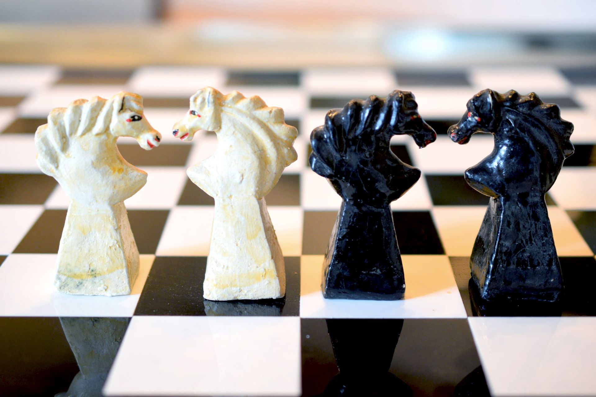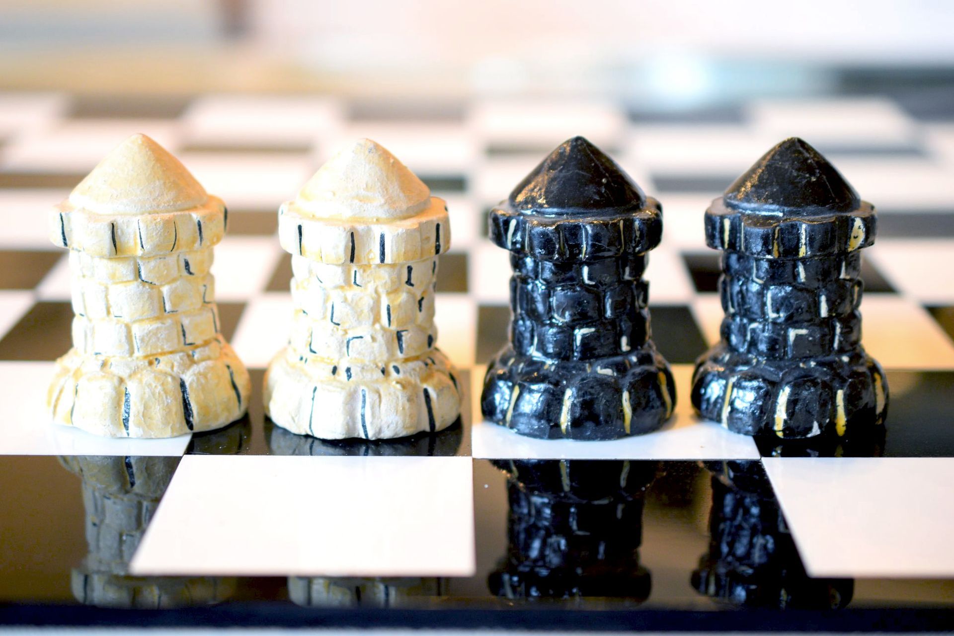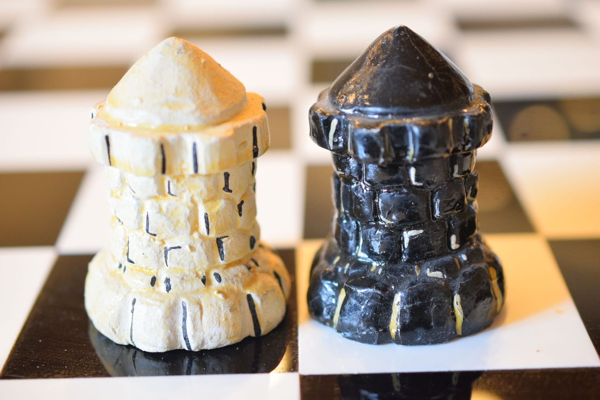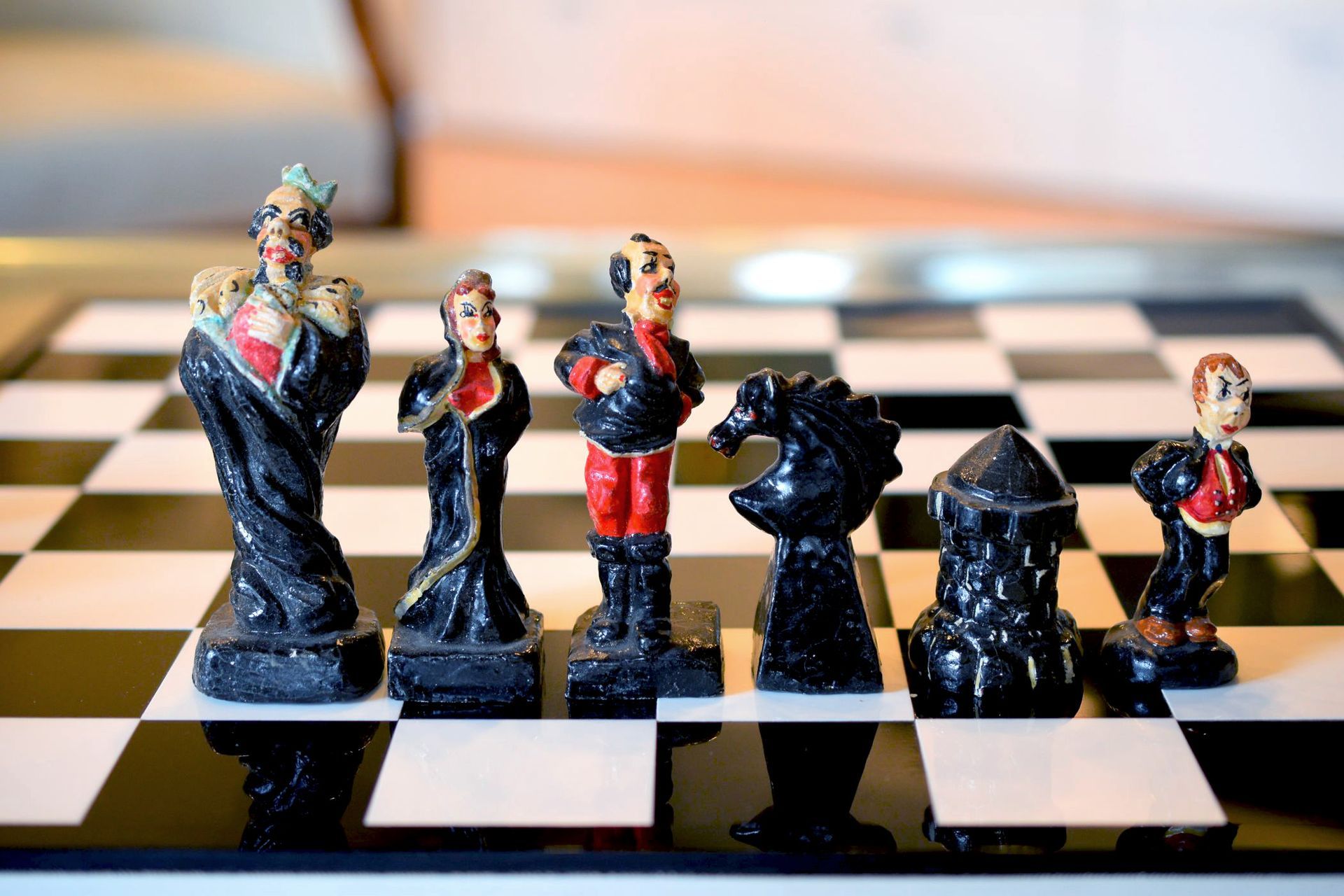 This chess set might not appeal to everyone. And I don't know whether it can be considered antique. But it is definitely vintage and rare. I don't know anything about the background of the pieces. The material from which the pieces are made is a kind of compound. It looks similar to plaster, but lighter. It reminds me a little of salt dough, which means it could be a chess set made of an organic composite material. The figures were not produced in a mould, because there are too many differences in the details between the individual pieces for that. This can be seen, for example, in the bishops, which all look different. It indicates that each individual sculpture was handmade. The pieces themselves resemble comic or cartoon characters from the 1930s or 1940s. However, I have not yet been able to find a specific template after which they were modelled. The kings are about 12.8 cm or 5" tall. The faces of the characters and their postures are heavily exaggerated, as can be seen from some of the detail shots, e.g. red cheeks, red lips, black outlined eyes etc. On the back, the kings have a large coin with a dollar sign at their feet. All in all, an extremely unusual collector's item.