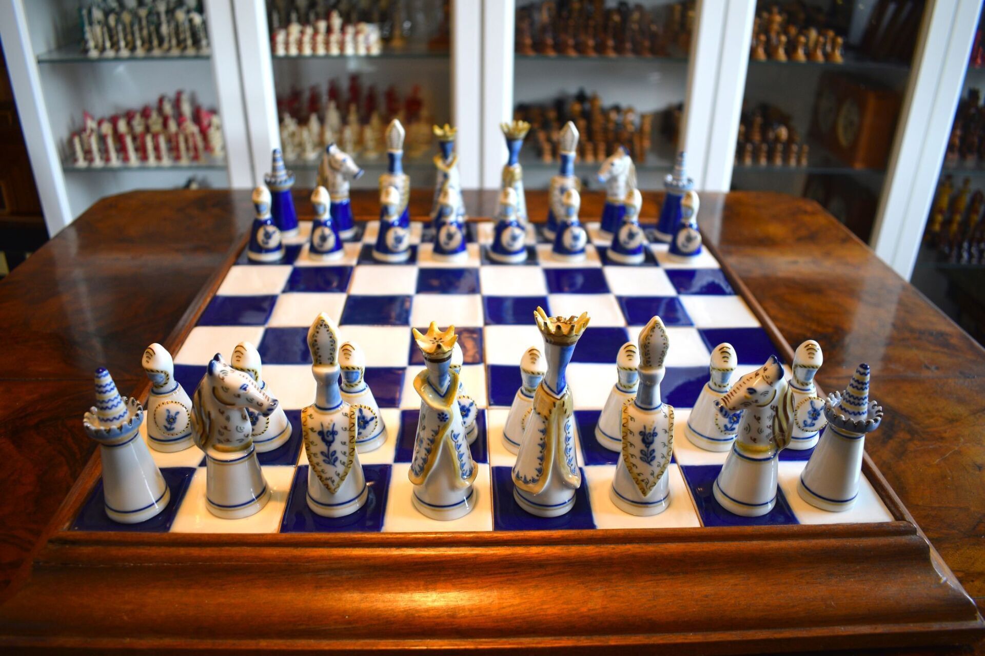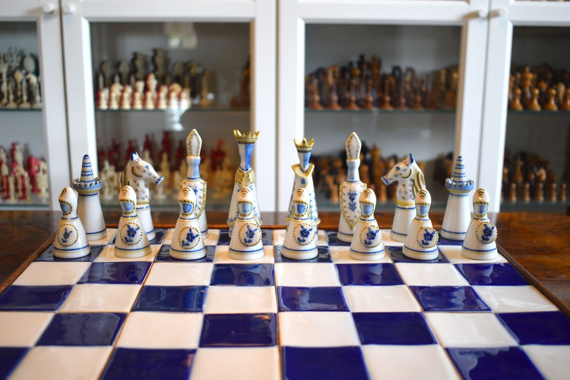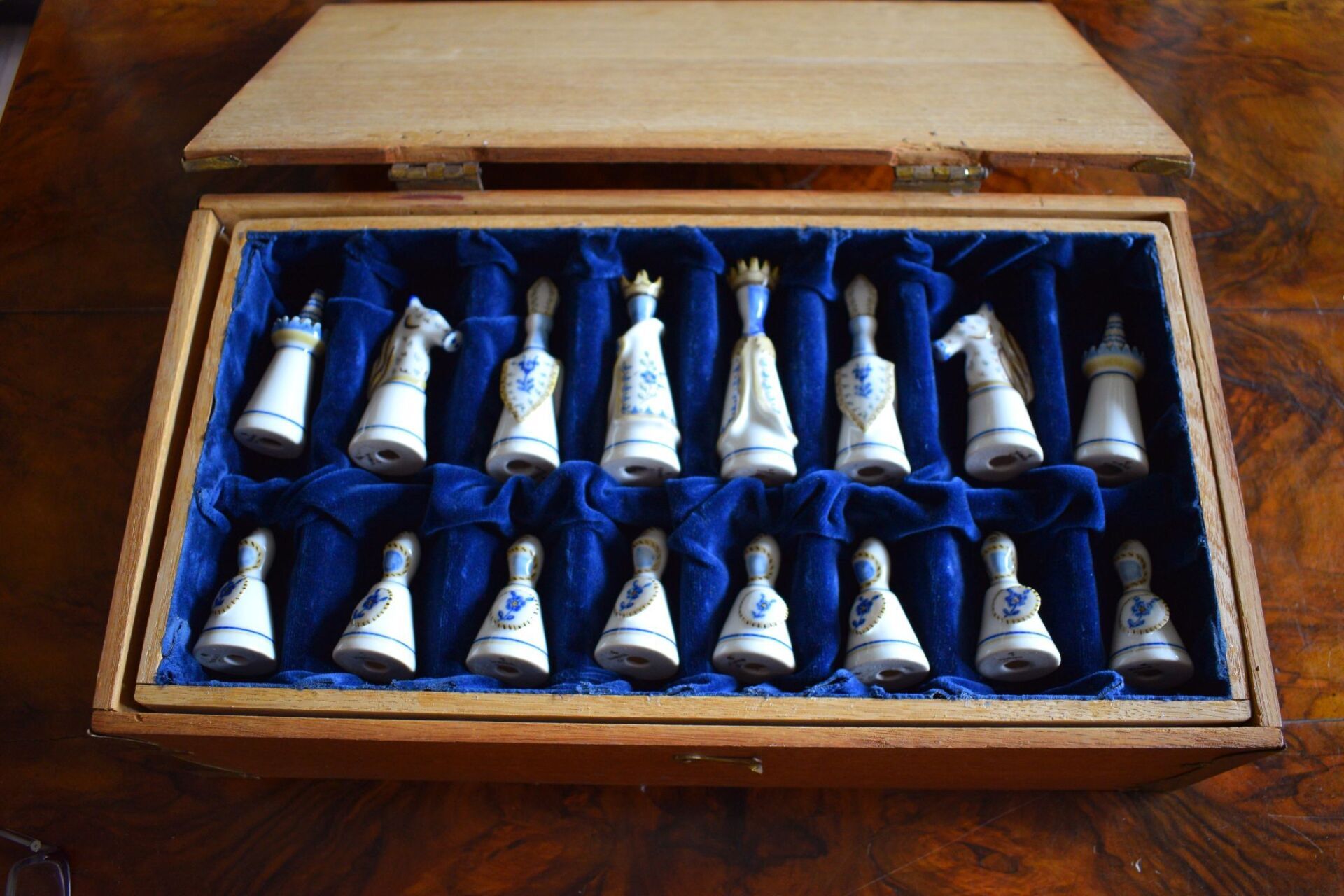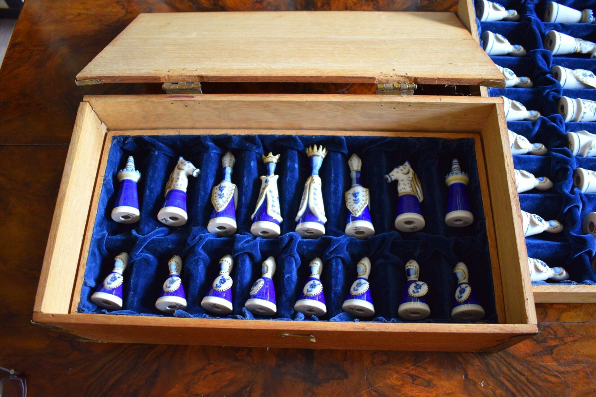 The set came in the original wooden box in which the chessmen are stored on separate trays covered in blue velvet. It also came with a 50 cm square blue and white ceramic tile chess board with a solid wooden frame.