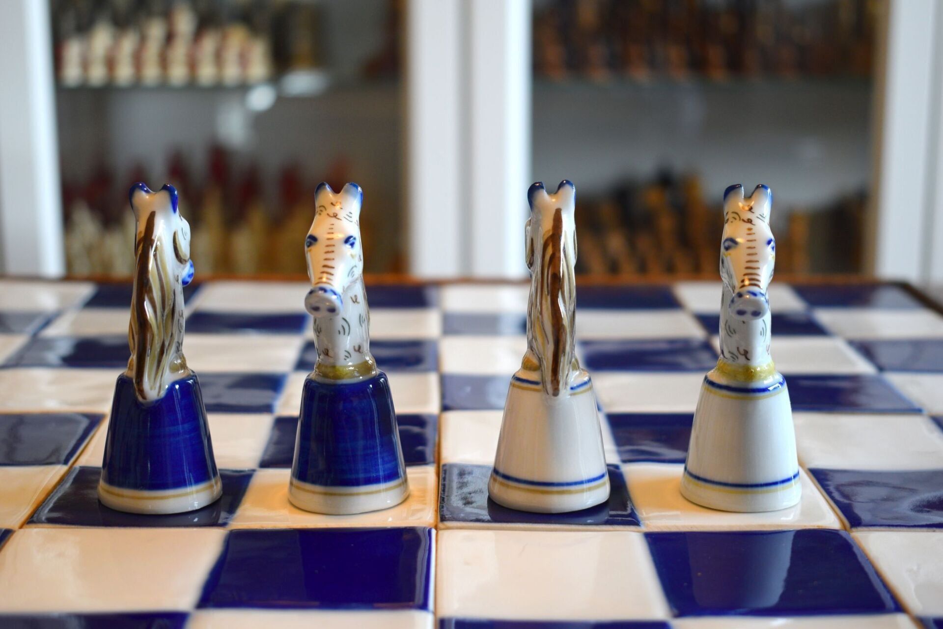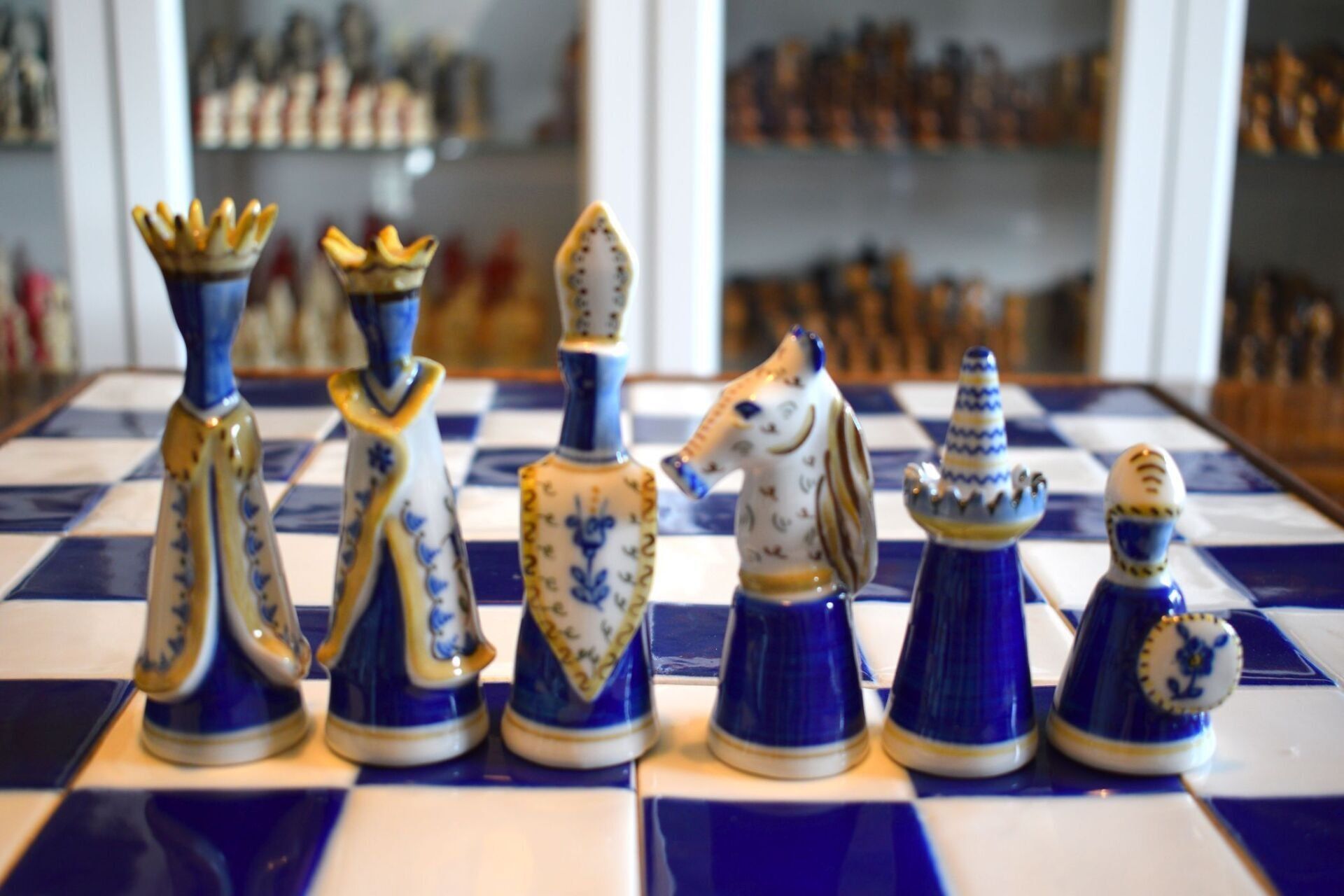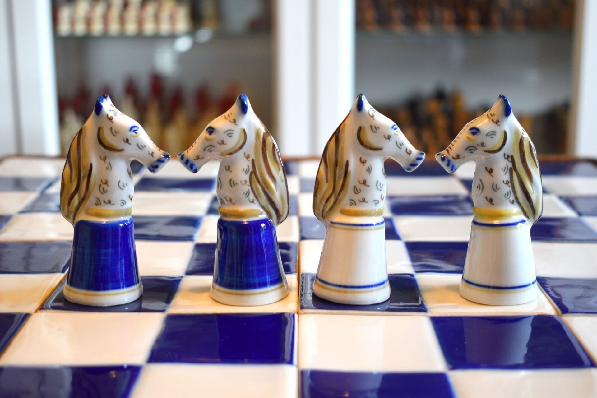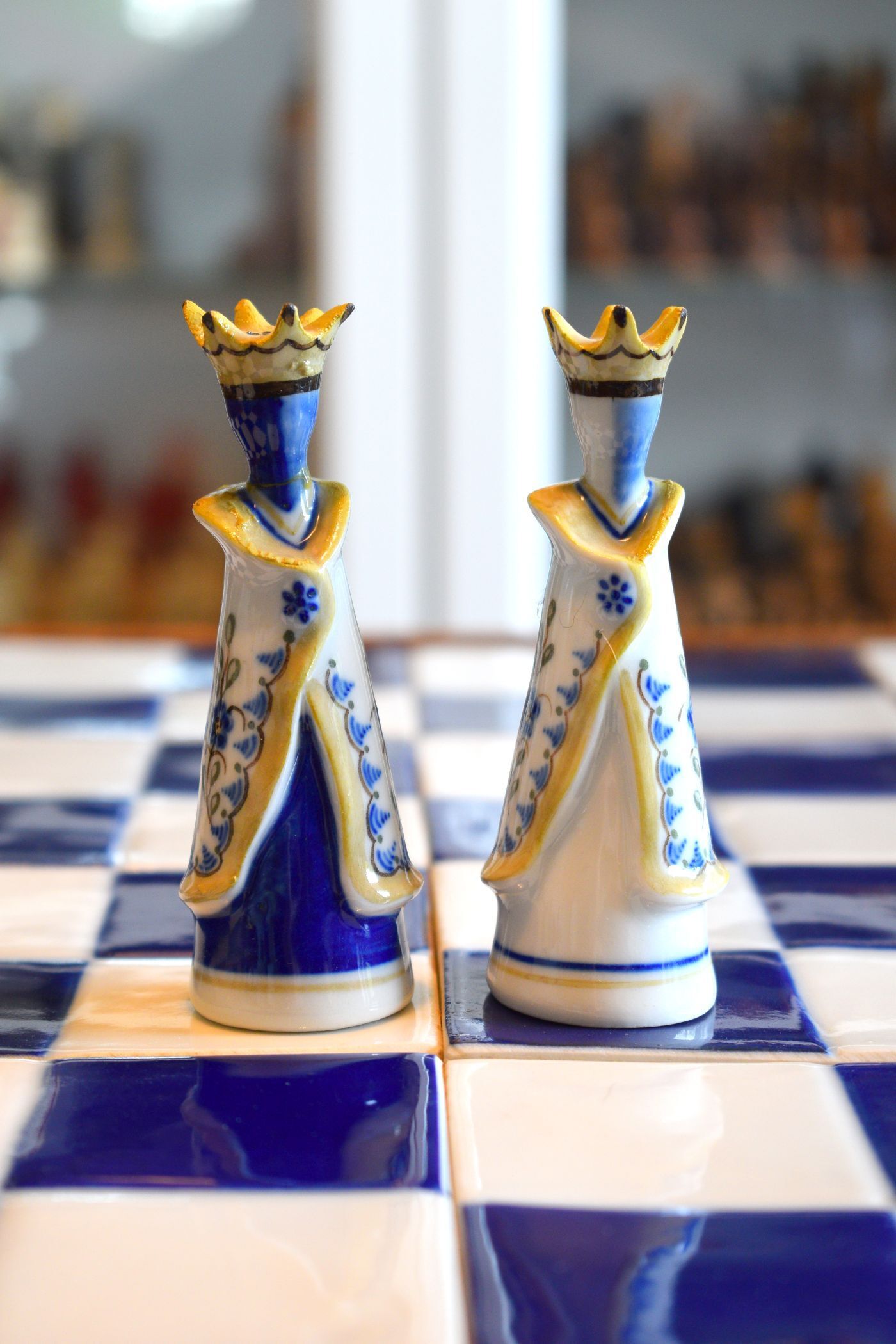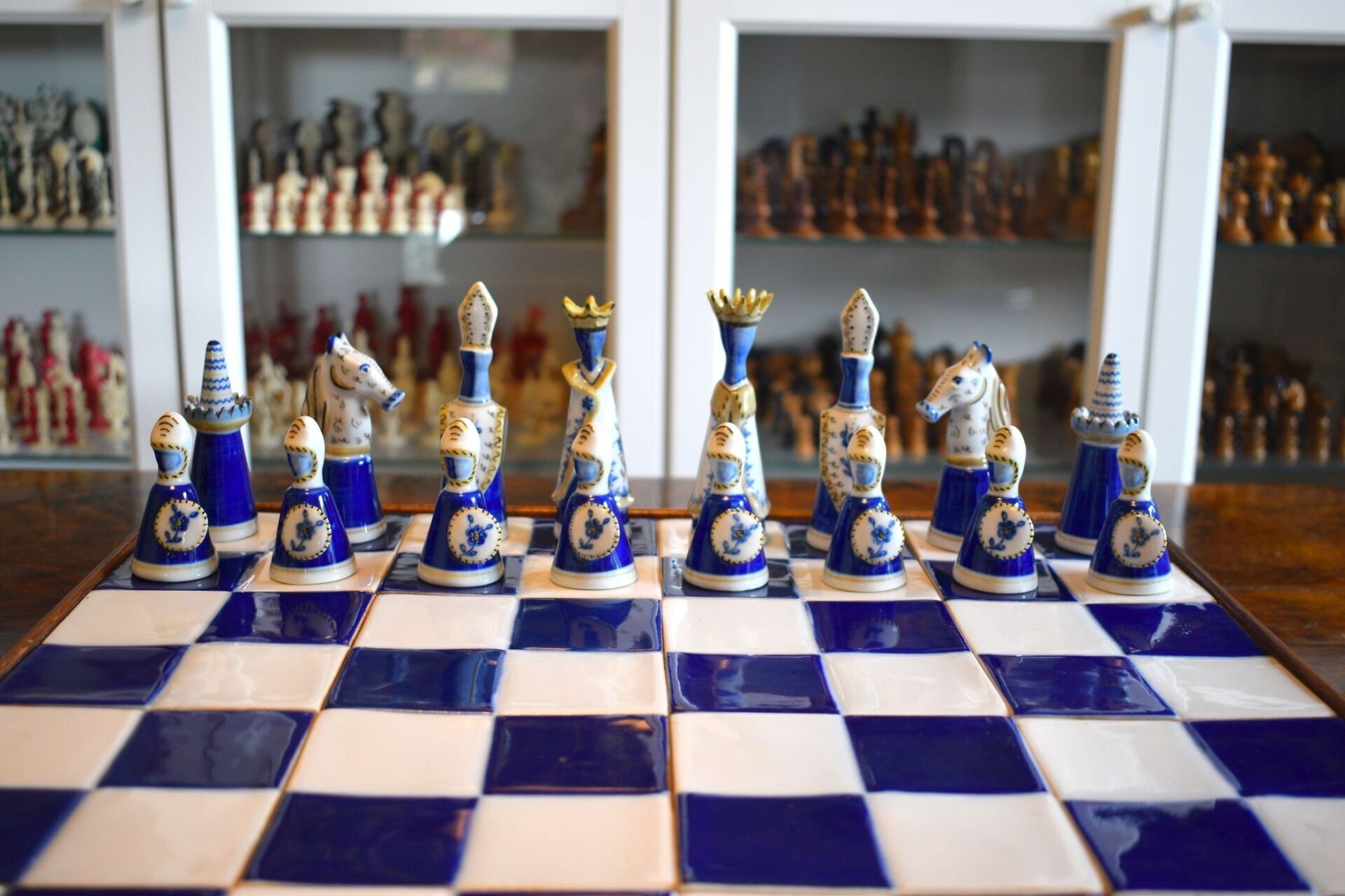 The set came in the original wooden box in which the chessmen are stored on separate trays covered in blue velvet. It also came with a 50 cm square blue and white ceramic tile chess board with a solid wooden frame.